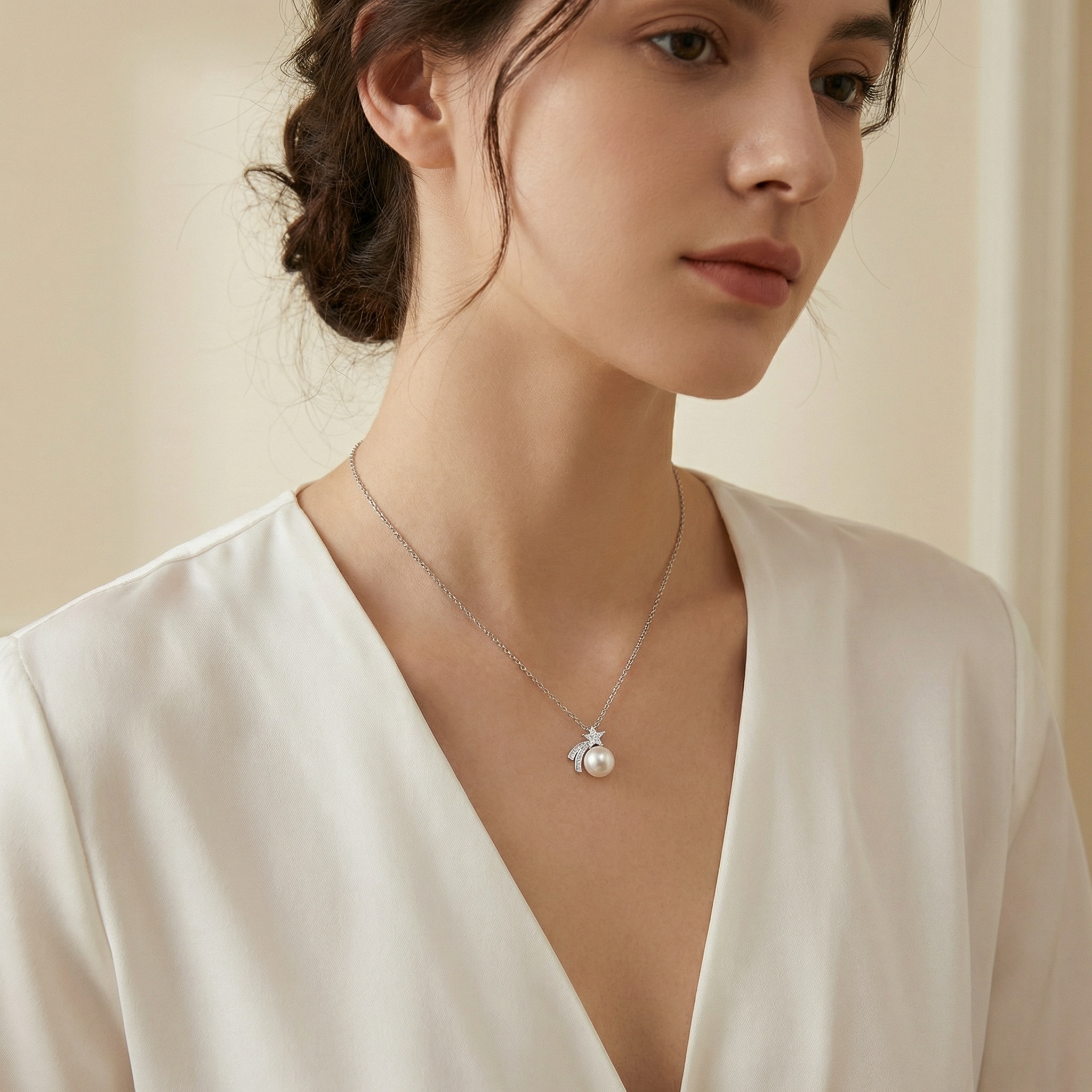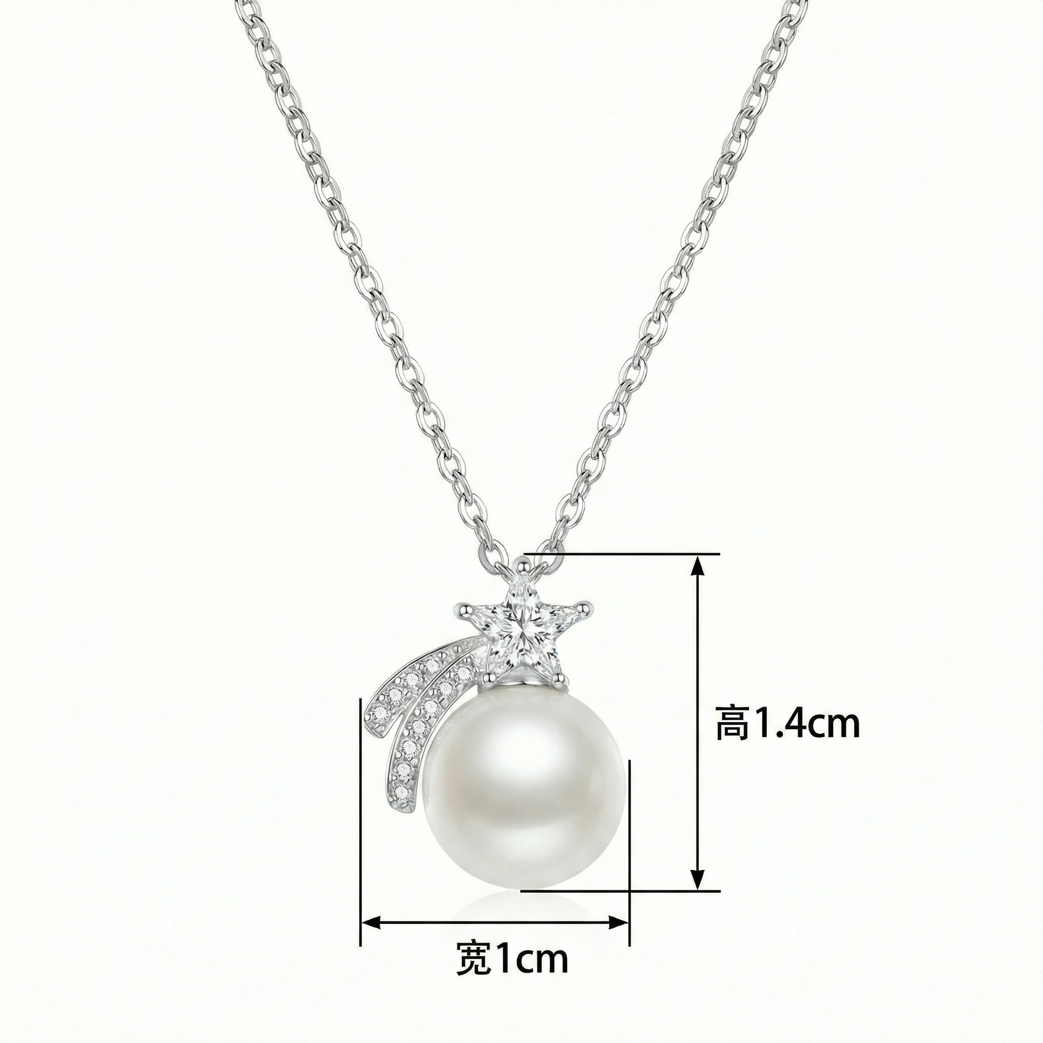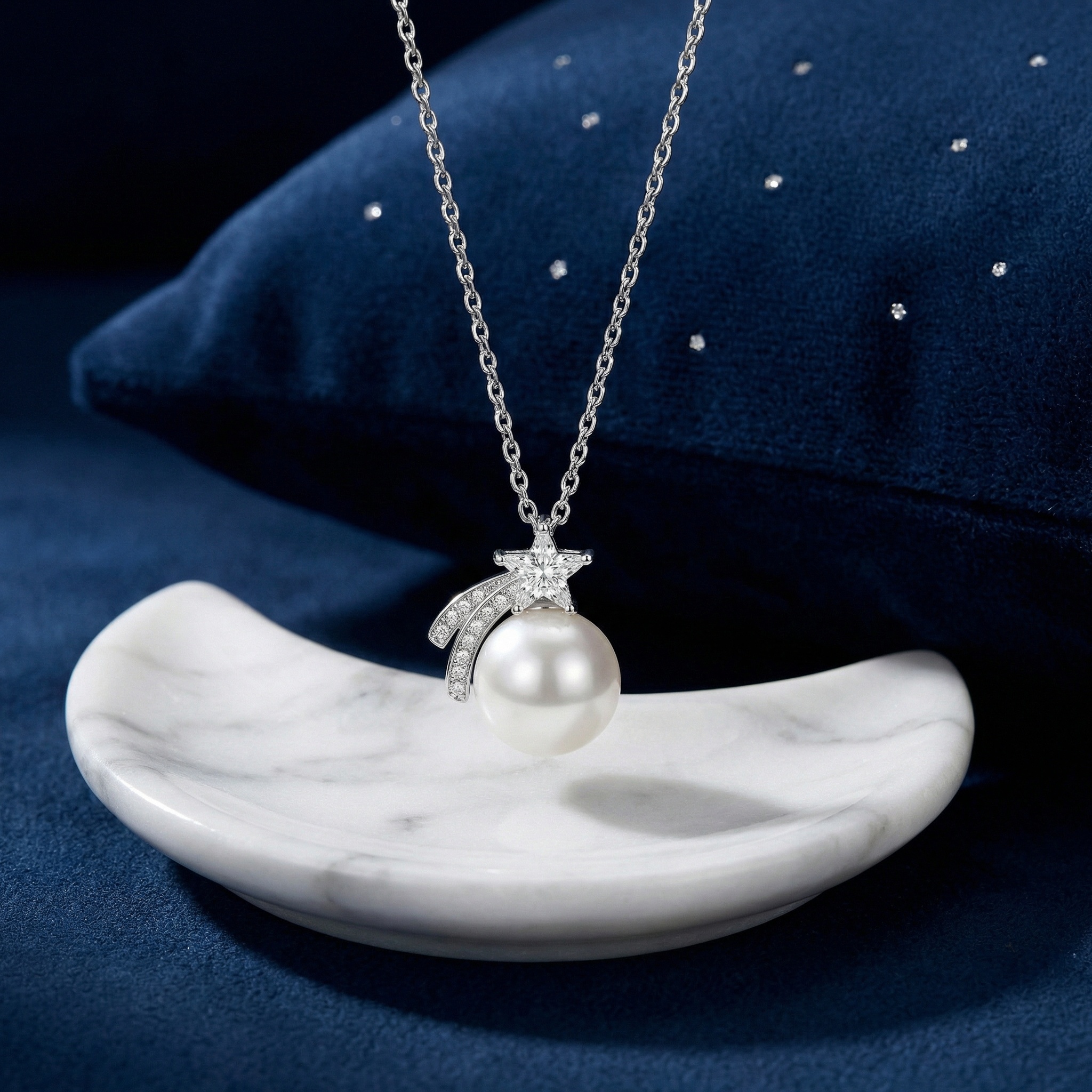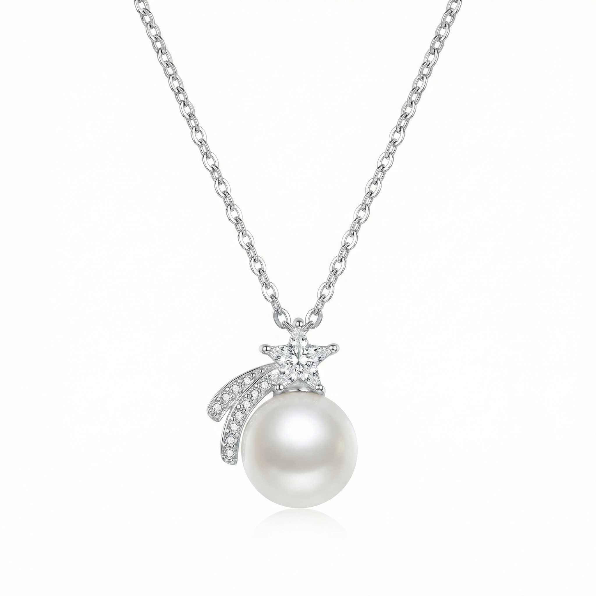 This exquisite necklace captures the magic of a celestial night, featuring a high-quality, lustrous white pearl as its centerpiece. Above the pearl sits a finely crafted shooting star, embellished with shimmering brilliant-cut stones that catch the light from every angle. The star is trailed by two elegant, curved paths set with delicate pavé-set accents, mimicking the ethereal motion of a falling star across the sky. The pendant hangs from a graceful silver-toned link chain, adding a touch of sophisticated charm to any outfit. Whether chosen as a meaningful gift for a loved one or a special treat for yourself, this necklace symbolizes hope, dreams, and timeless beauty. Its elegant celestial design makes it perfect for both daily wear and formal occasions, ensuring you shine as bright as the stars. | Brand: jewelryodm