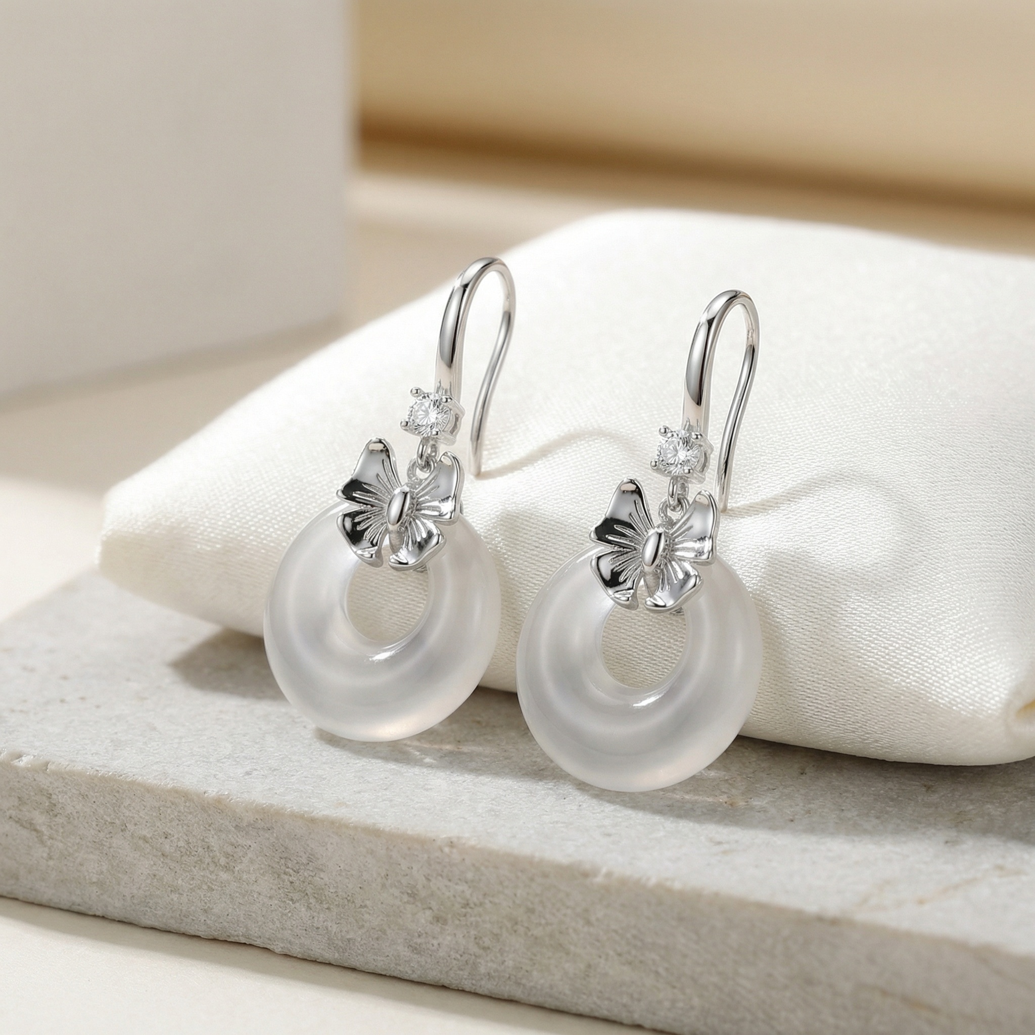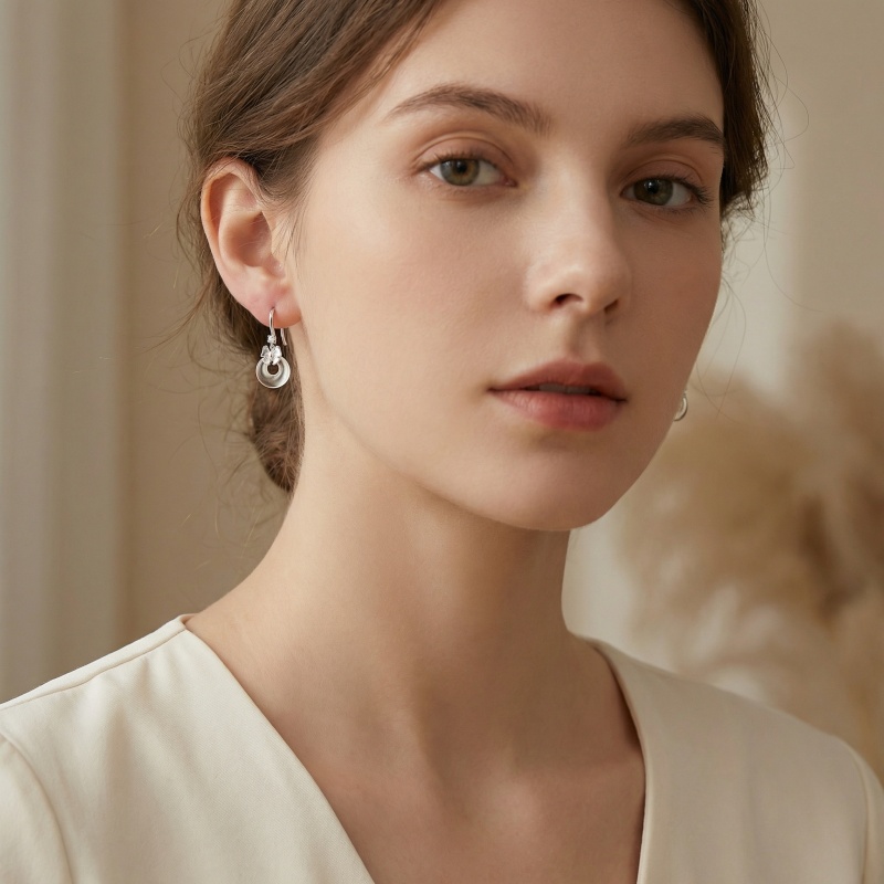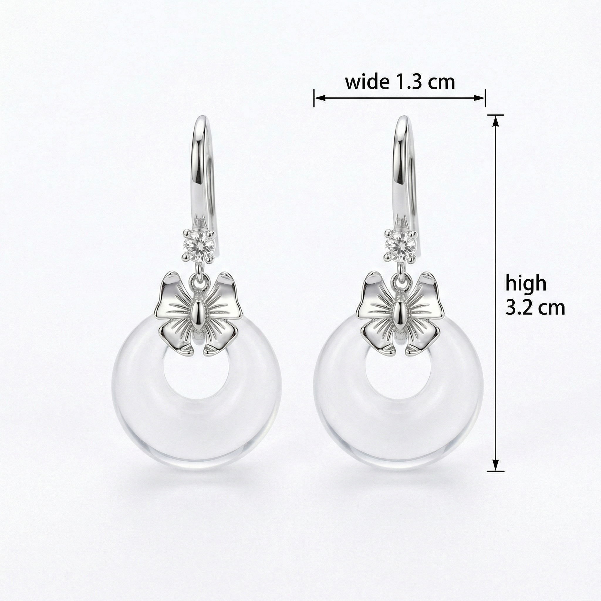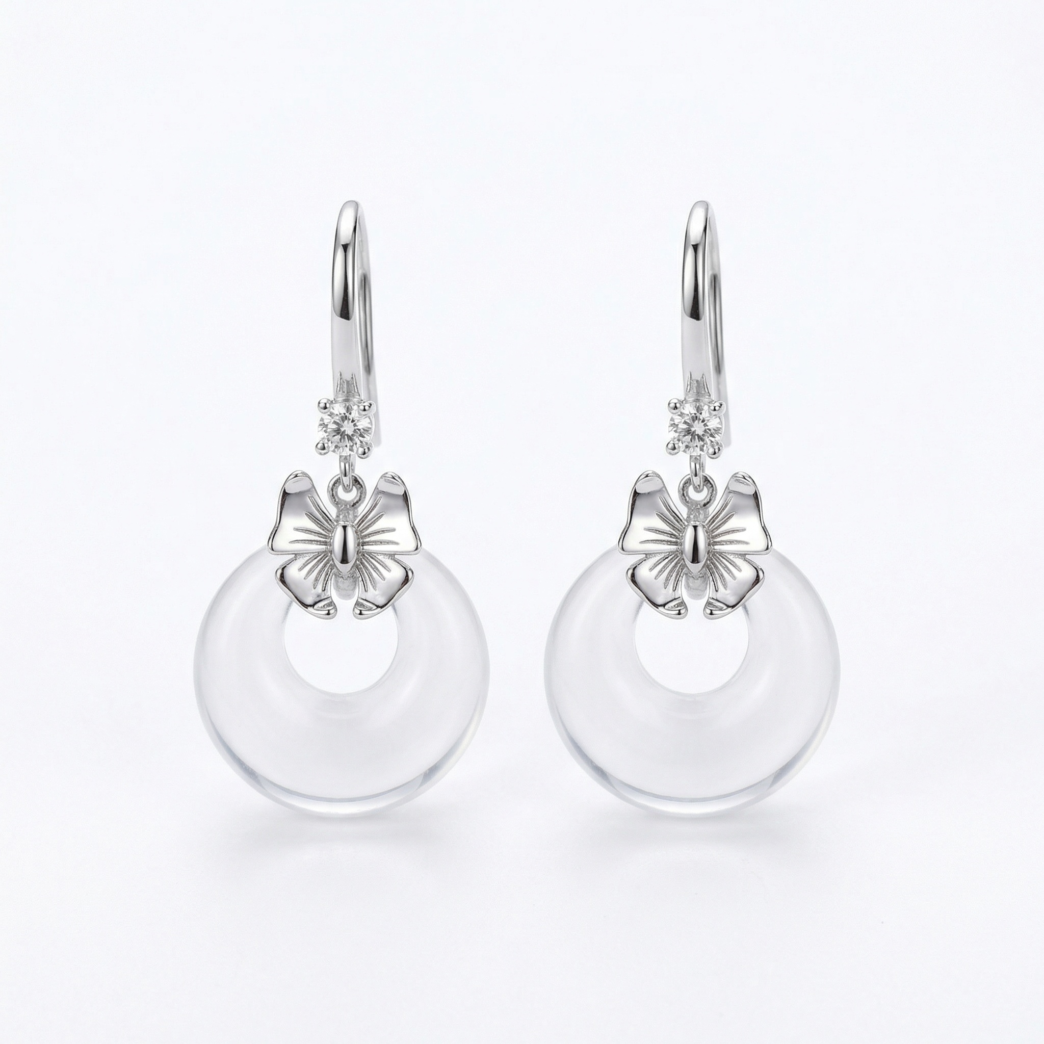 These exquisite drop earrings combine classic charm with modern minimalism. Crafted in high-quality silver-toned metal, each earring features a sleek French hook adorned with a brilliant, sparkling round-cut gemstone. Suspended below is a delicately sculpted silver bow knot, symbolizing elegance and grace. The centerpiece of the design is a beautifully polished, transparent doughnut-shaped pendant. The clear crystal-like material catches the light, creating a subtle yet sophisticated glow. Perfect for both everyday wear and special occasions, these earrings offer a lightweight feel and a timeless aesthetic. Their versatile design makes them an ideal gift for birthdays, anniversaries, or as a chic addition to any jewelry collection. The combination of the feminine bow and the clean lines of the circular drop creates a balanced, stylish look that complements any outfit. | Brand: jewelryodm