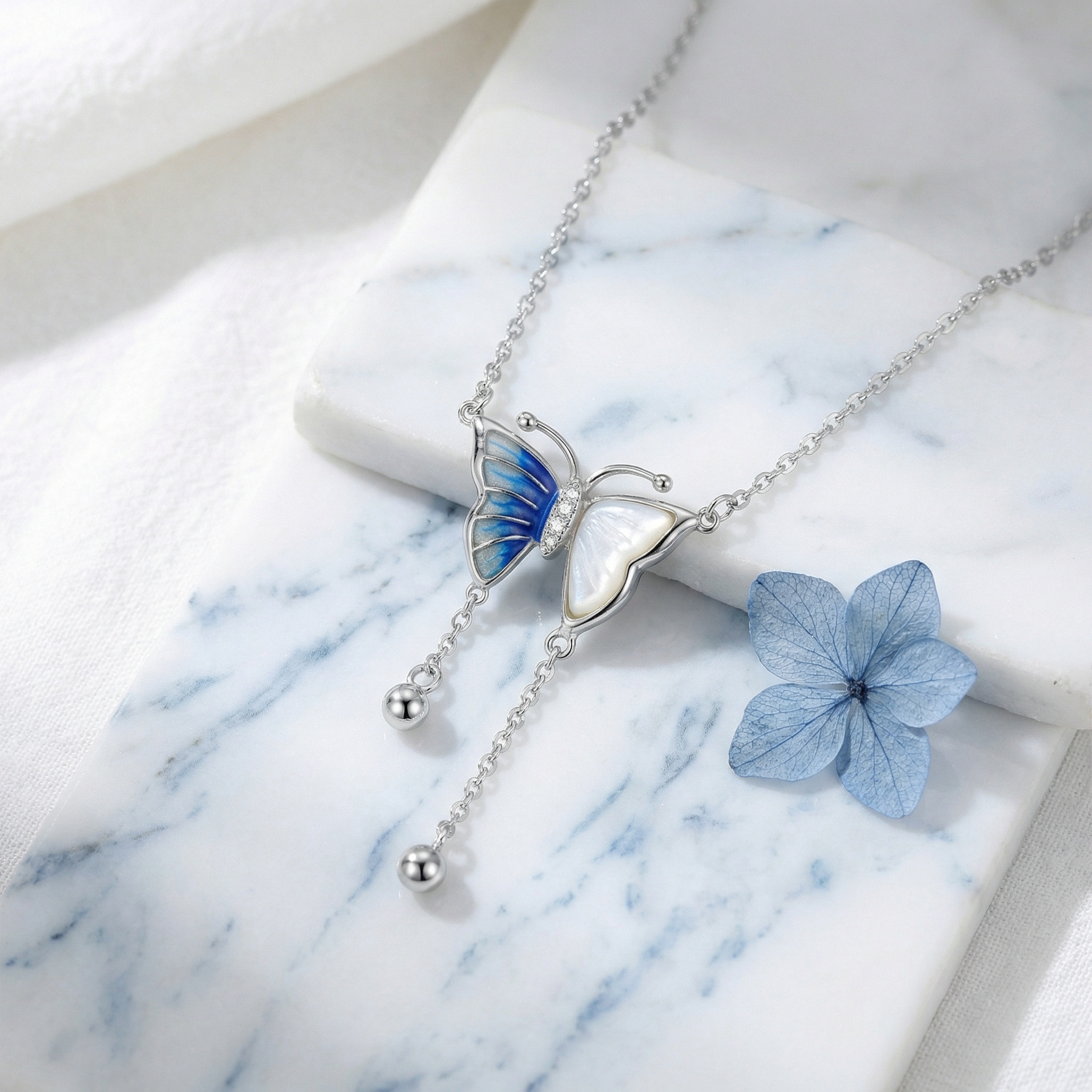 This sophisticated necklace features a delicate butterfly pendant crafted from sterling silver. Its unique design highlights an asymmetrical aesthetic, with one wing finished in a vibrant blue gradient enamel and the other inlaid with luminous white mother-of-pearl. The center of the butterfly is embellished with sparkling clear stones for added radiance. Two slender chains of differing lengths gracefully dangle from the pendant, each tipped with a polished silver bead that creates a sense of movement. Suspended from a classic link chain, this piece combines nature-inspired charm with modern elegance, making it an exquisite accessory for any occasion. | Brand: jewelryodm