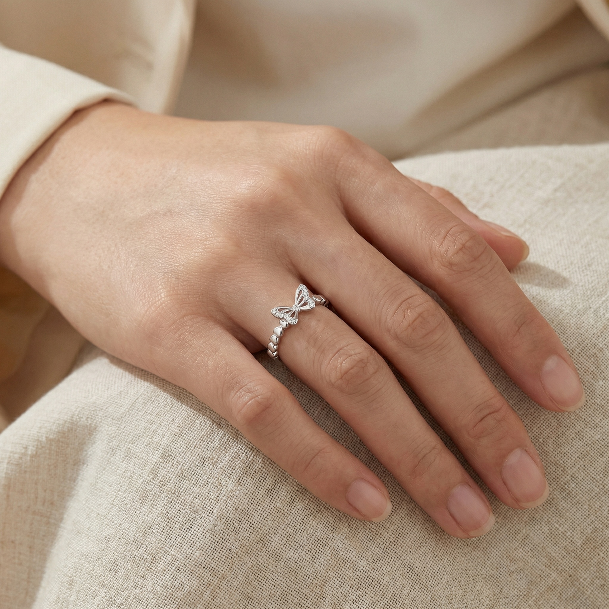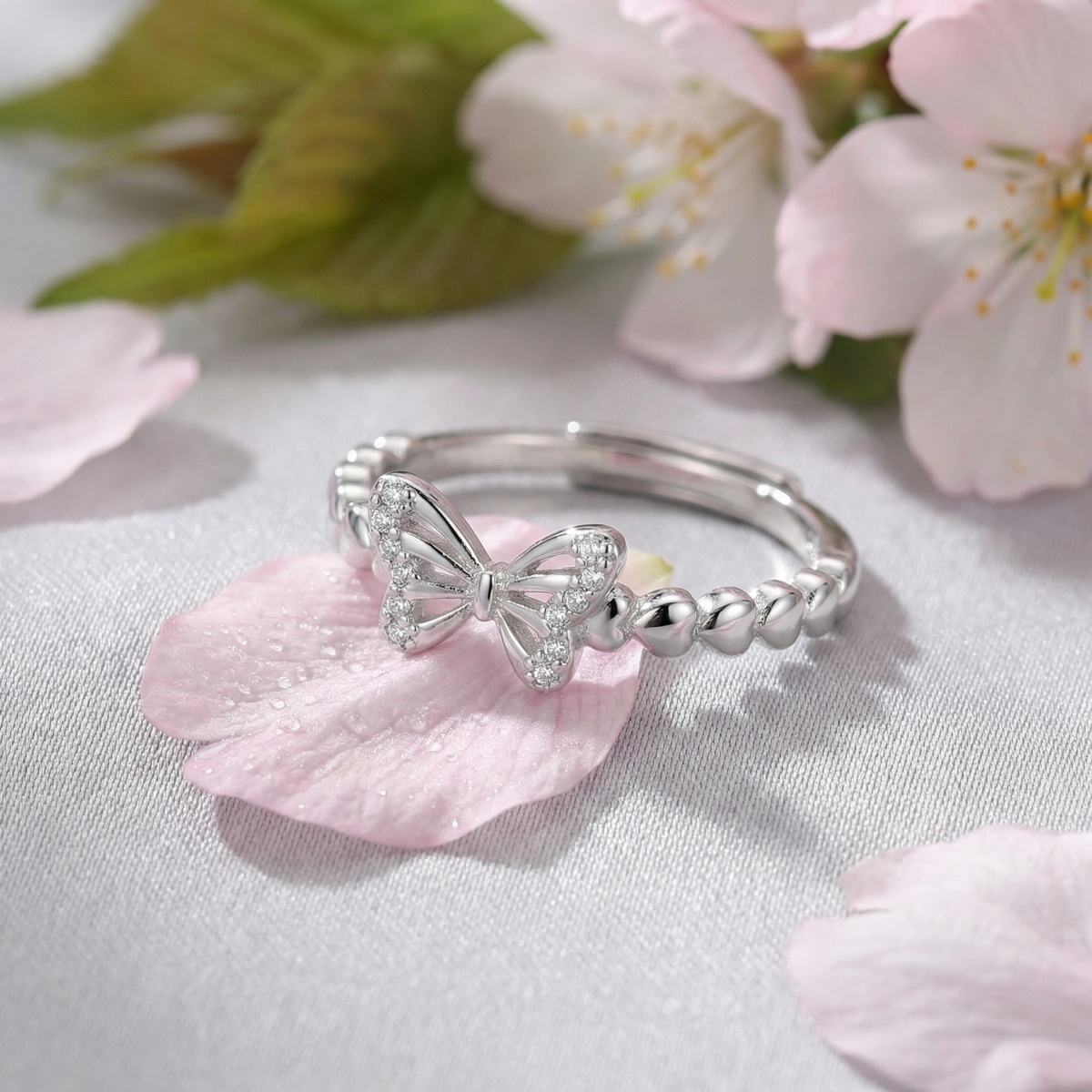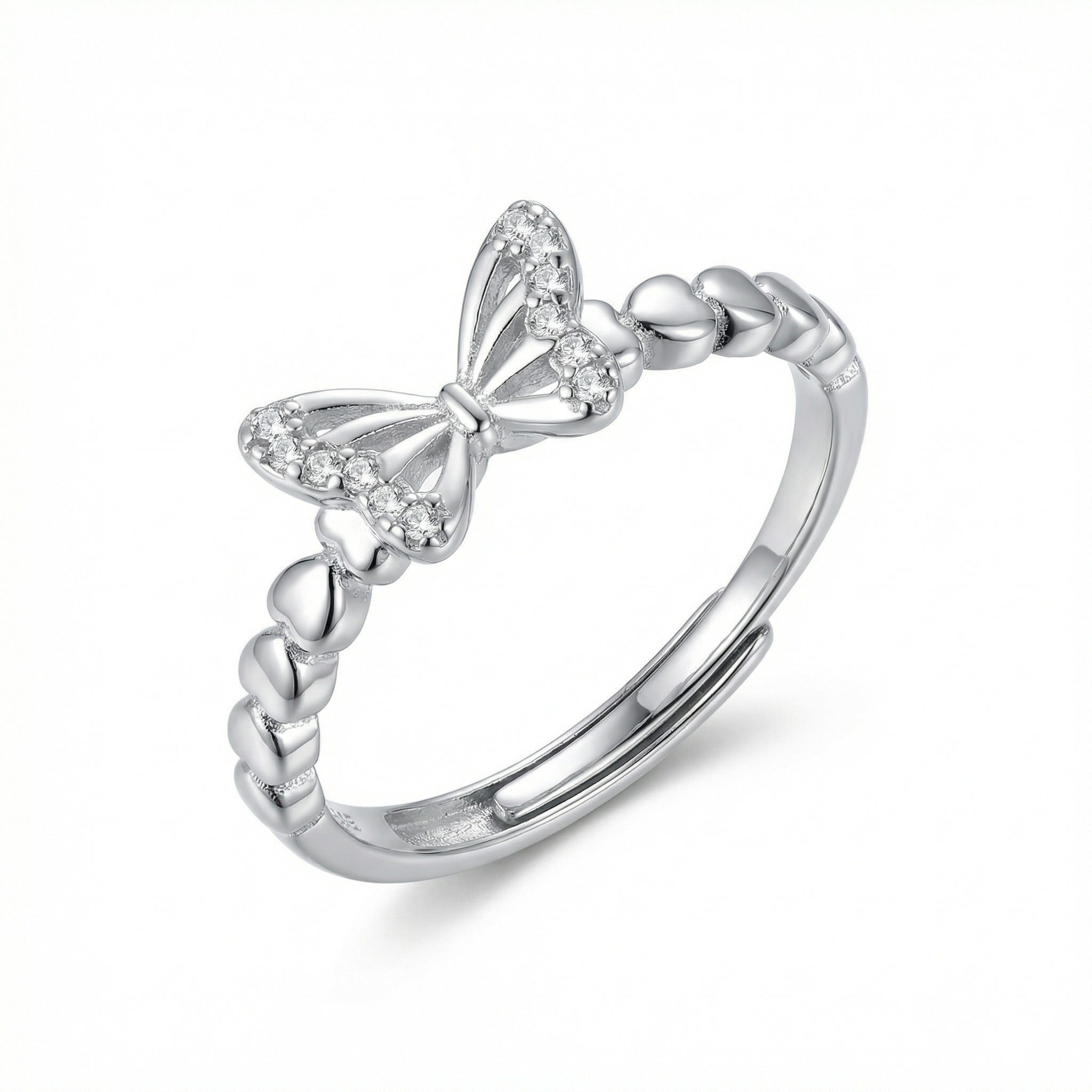 This exquisite ring features a delicate butterfly motif as its centerpiece, symbolizing transformation and grace. The wings are intricately detailed and adorned with shimmering pave-set clear stones that catch the light from every angle. Complementing the central design is a unique band composed of polished heart-shaped links, adding a touch of romance to the piece. Crafted with a high-shine silver finish, this ring offers a whimsical yet sophisticated aesthetic suitable for both daily wear and special occasions. The adjustable open-back design ensures a comfortable fit for various finger sizes, making it a versatile addition to any jewelry collection or a thoughtful gift for someone special. Its blend of nature-inspired beauty and modern craftsmanship makes it a timeless accessory that radiates feminine charm. | Brand: jewelryodm