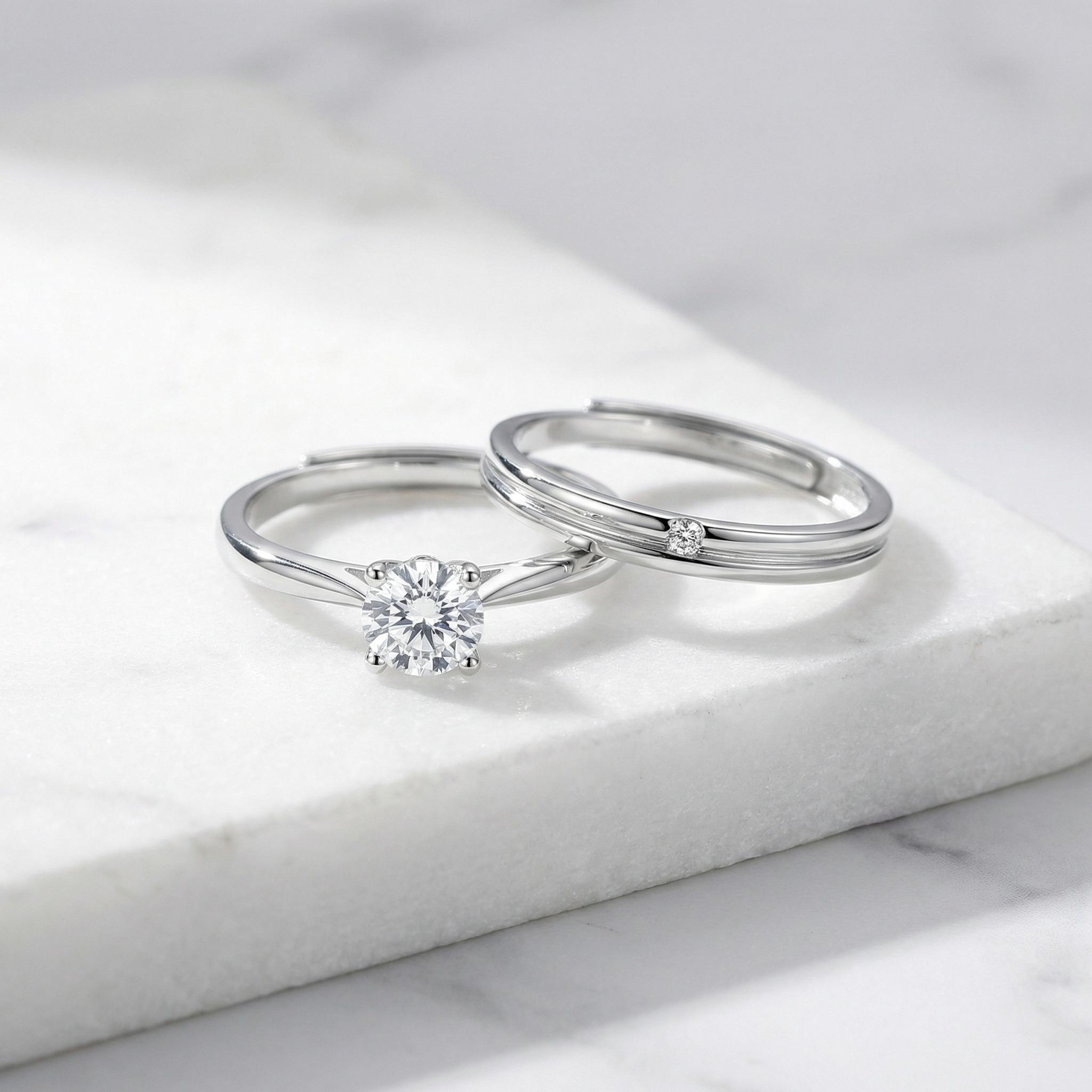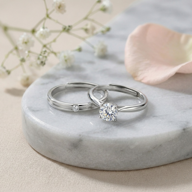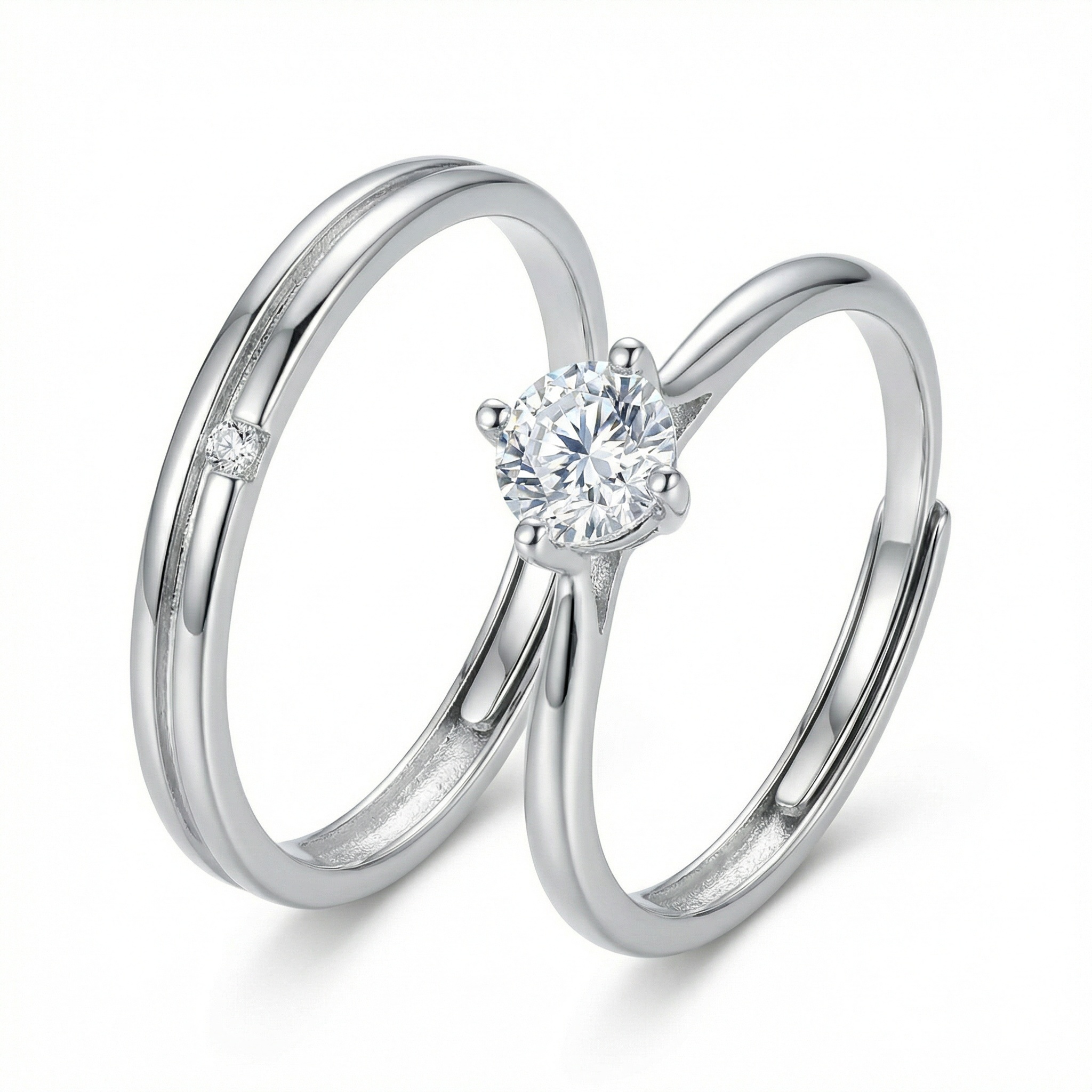 This exquisite couple ring set is crafted from high-quality, polished silver-toned metal, offering a timeless and sophisticated look. The centerpiece is a stunning round-cut solitaire stone securely held by a classic four-prong setting, designed to maximize brilliance. Its matching companion is a minimalist band featuring a sleek central groove and a delicate inset accent stone. Both rings are designed with an adjustable open-back, ensuring a comfortable and perfect fit for any wearer. Symbolizing love and commitment, these rings are an ideal choice for engagements, weddings, or promise gifts. Their clean lines and radiant finish blend modern style with traditional elegance, making them a beautiful testament to a shared journey. | Brand: jewelryodm