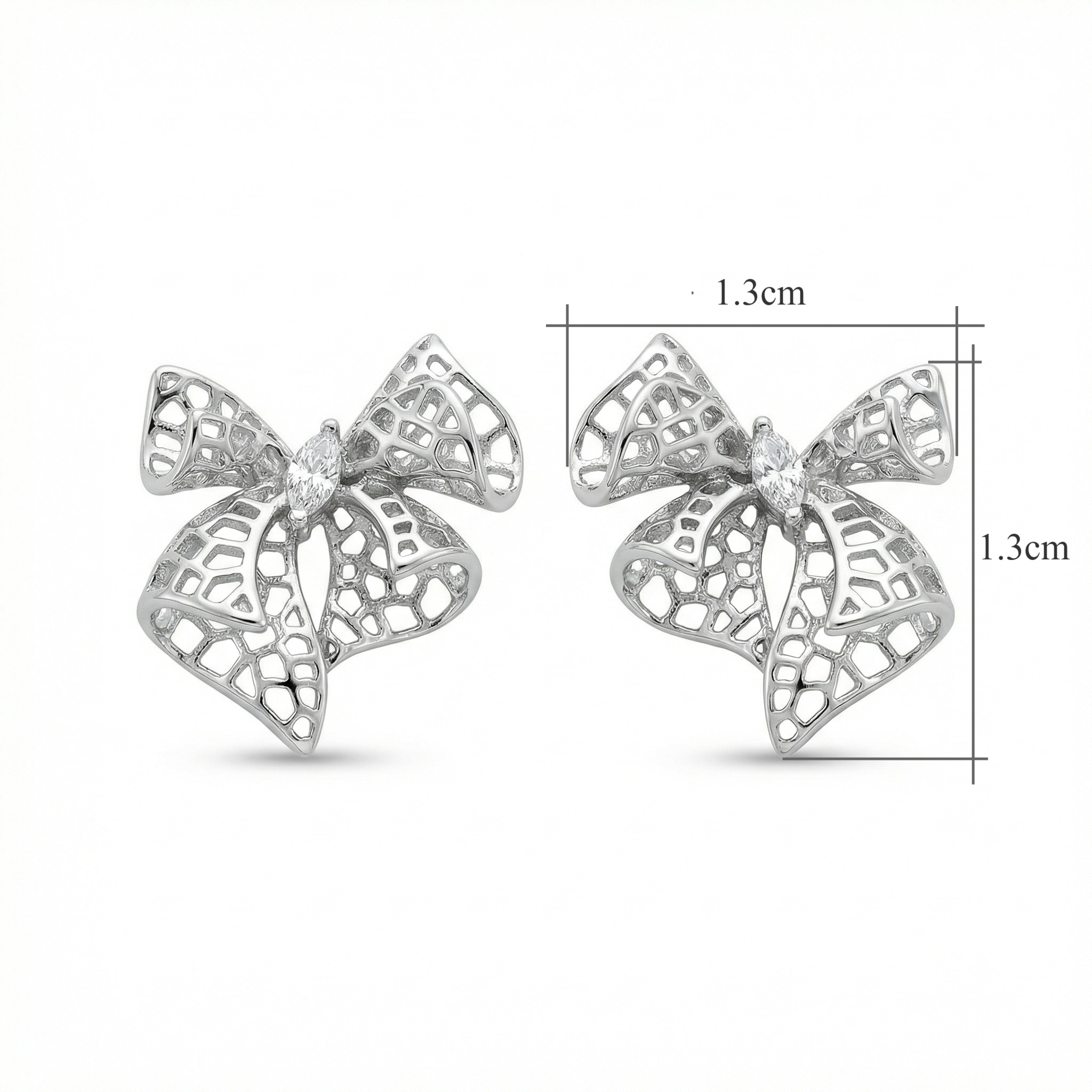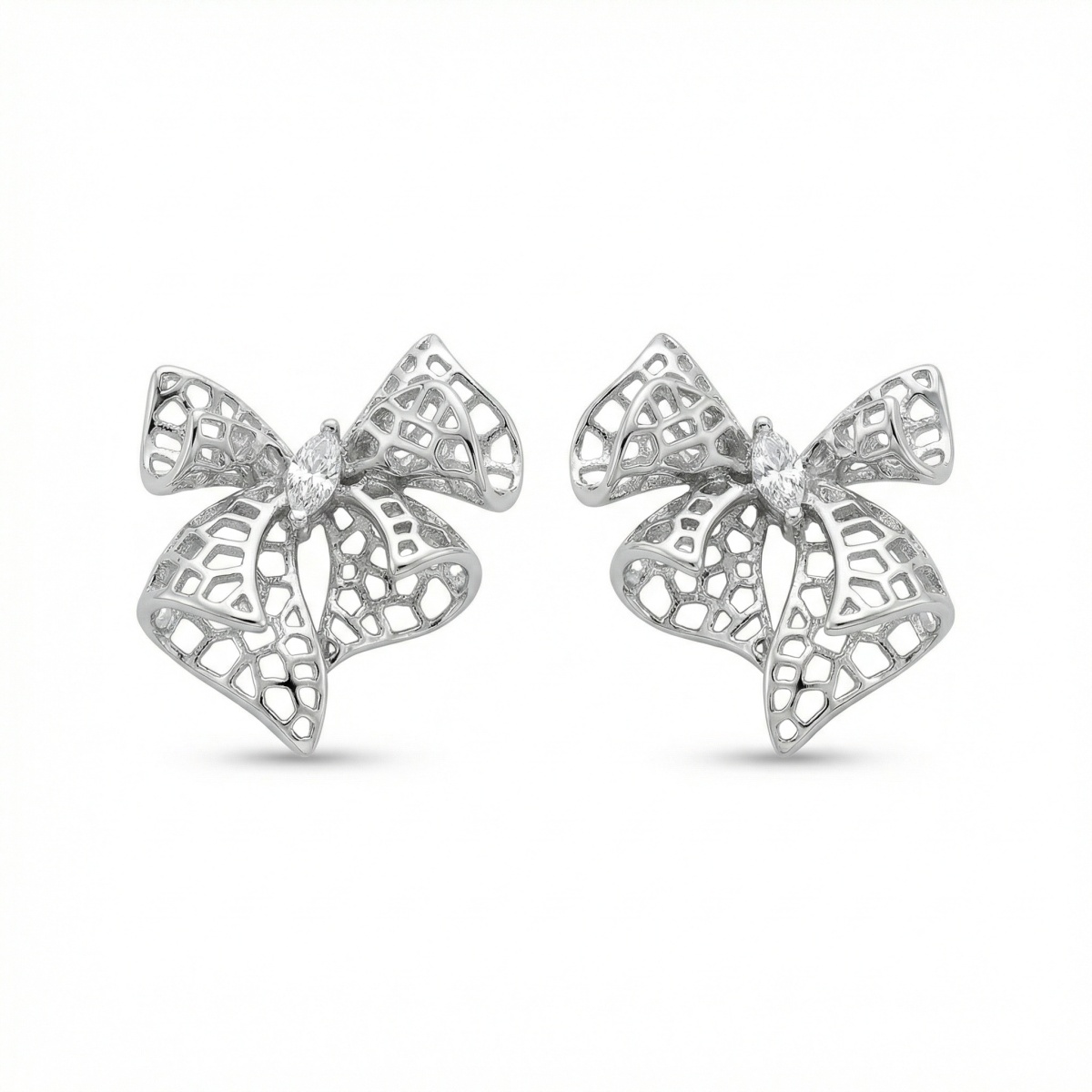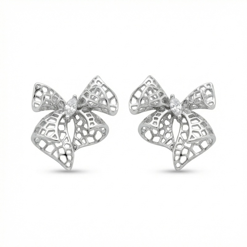 These exquisite stud earrings feature a charming bow knot design crafted with an intricate filigree lattice pattern. The hollow-out metalwork gives the earrings a delicate, airy appearance, while the silver-tone finish offers a classic and polished look. At the heart of each bow lies a brilliant marquise-cut clear gemstone, adding a subtle yet sophisticated sparkle. These feminine earrings are lightweight and versatile, making them perfect for both daily wear and special occasions. Whether you are dressing up for a formal event or looking for a stylish everyday accessory, these bow studs add a touch of timeless elegance to any outfit. They also make a wonderful gift for those who appreciate romantic and detailed jewelry designs. | Brand: jewelryodm