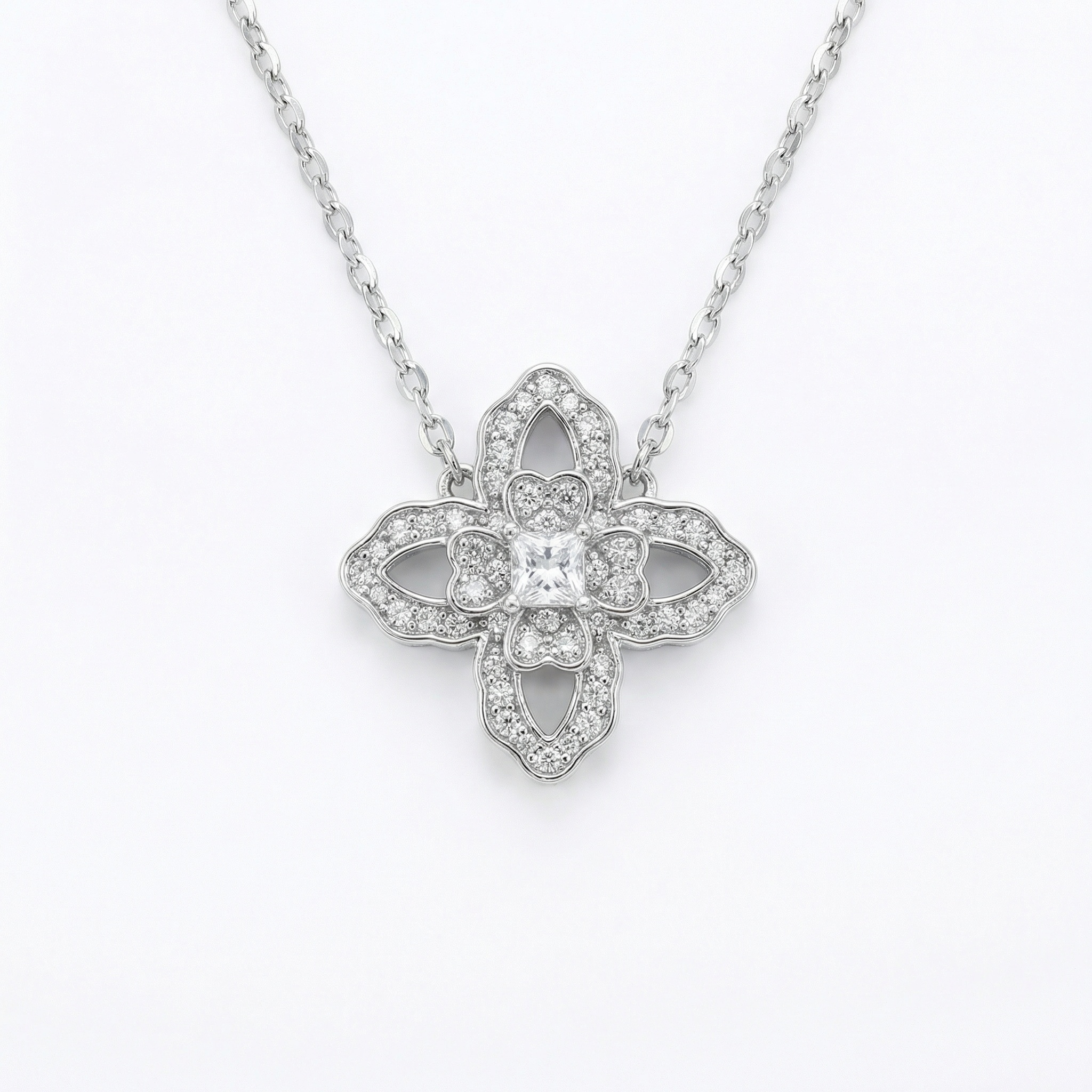 This stunning necklace features a sophisticated four-leaf clover pendant crafted in high-quality silver-toned metal. At its heart lies a brilliant square-cut clear stone, serving as a focal point for the intricate design. Each petal is meticulously adorned with shimmering round-cut pavé stones, creating a dazzling effect from every angle. The delicate open-work filigree adds a touch of vintage elegance and airy grace. Suspended from a classic silver cable chain, this piece offers a timeless appeal that complements both casual and formal attire. Whether as a symbol of good luck or a statement of refined style, this exquisite pendant is a perfect accessory for any jewelry collection or a thoughtful gift for a loved one. | Brand: jewelryodm
