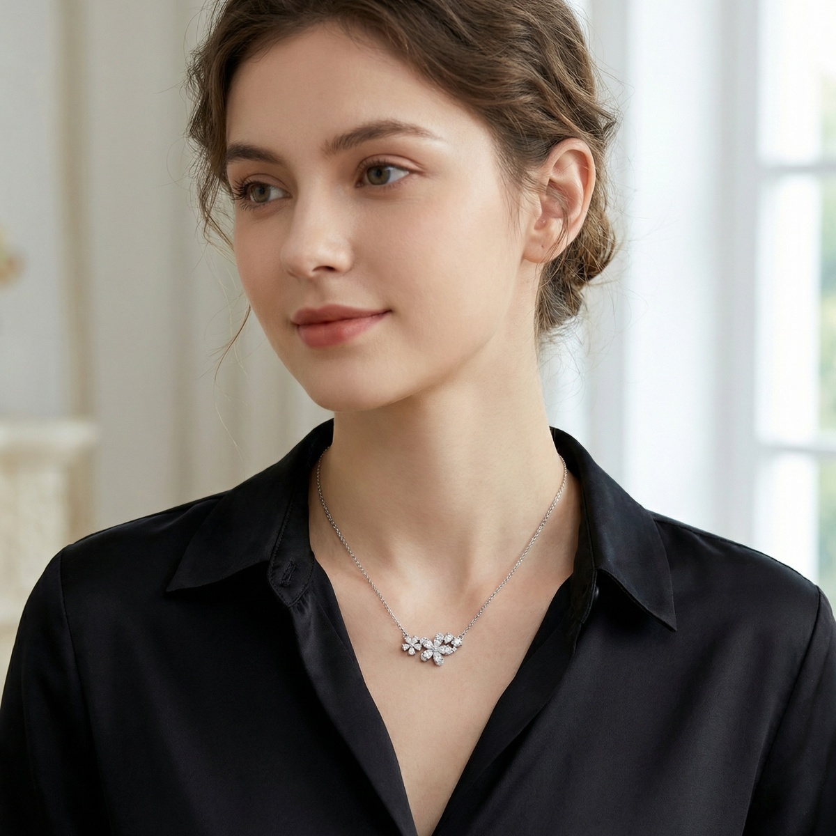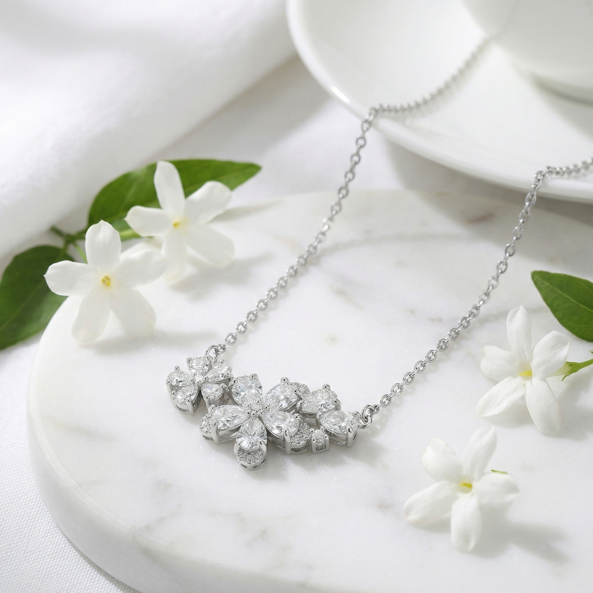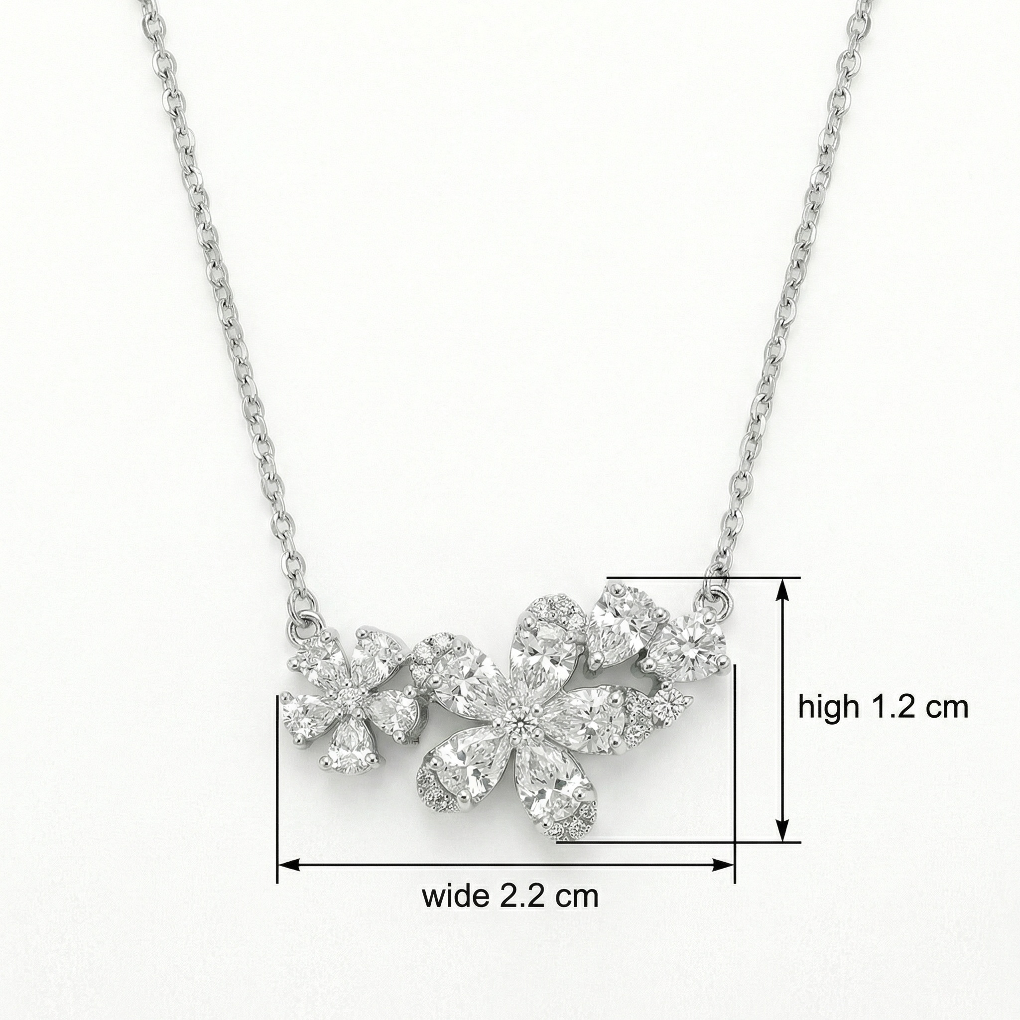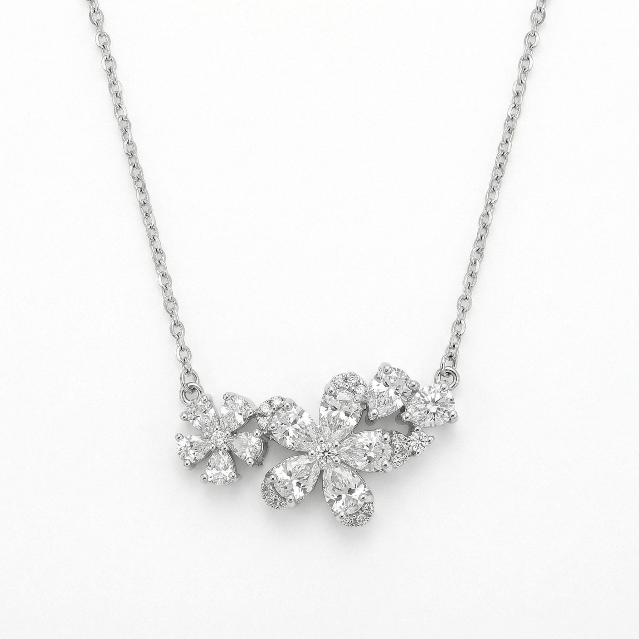 This exquisite silver-toned necklace features a stunning floral-inspired pendant, meticulously crafted to capture the essence of nature's beauty. The central design showcases two delicate flowers, artfully arranged with a combination of brilliant pear-cut and round-cut stones that shimmer with every movement. Each petal is set with precision, creating a radiant sparkle that draws the eye. The cluster of clear gemstones is elegantly suspended from a fine, high-quality cable chain, making it a versatile piece for both formal events and everyday elegance. Perfect as a romantic gift or a timeless addition to any jewelry collection, this necklace embodies grace and sophistication. The bright white finish of the metal perfectly complements the icy brilliance of the stones, offering a classic look that never goes out of style. | Brand: jewelryodm