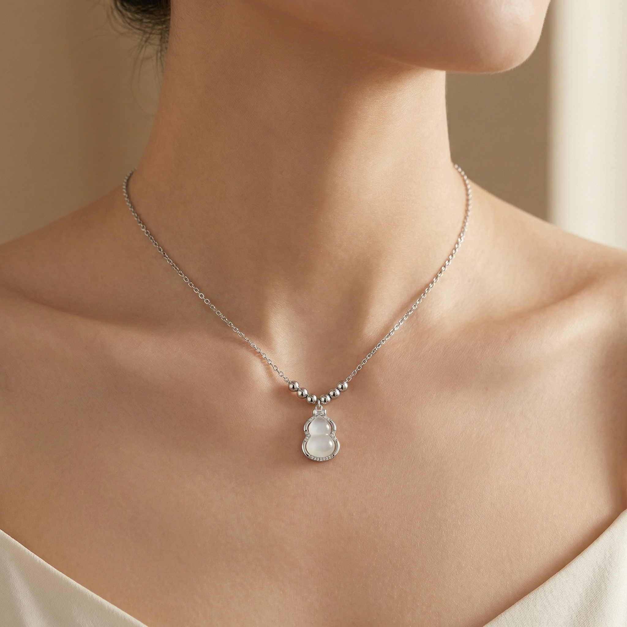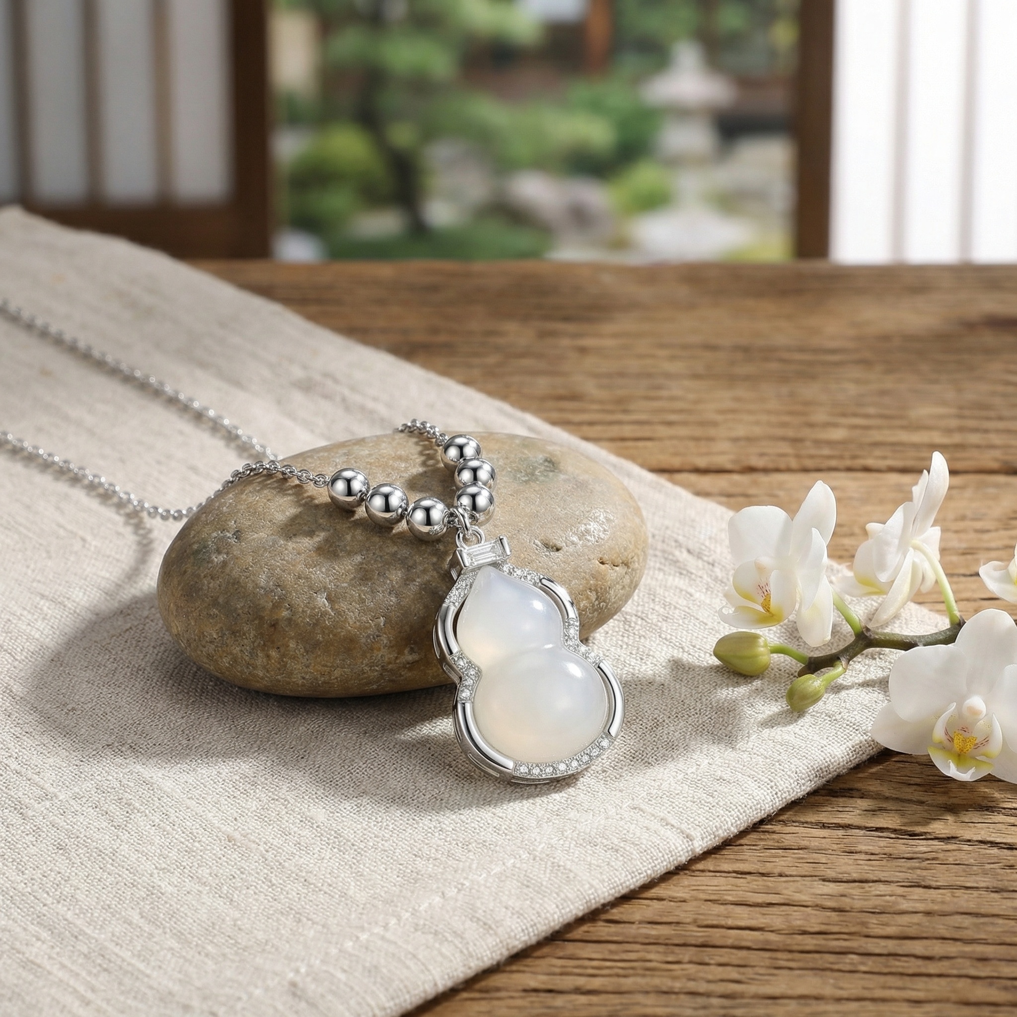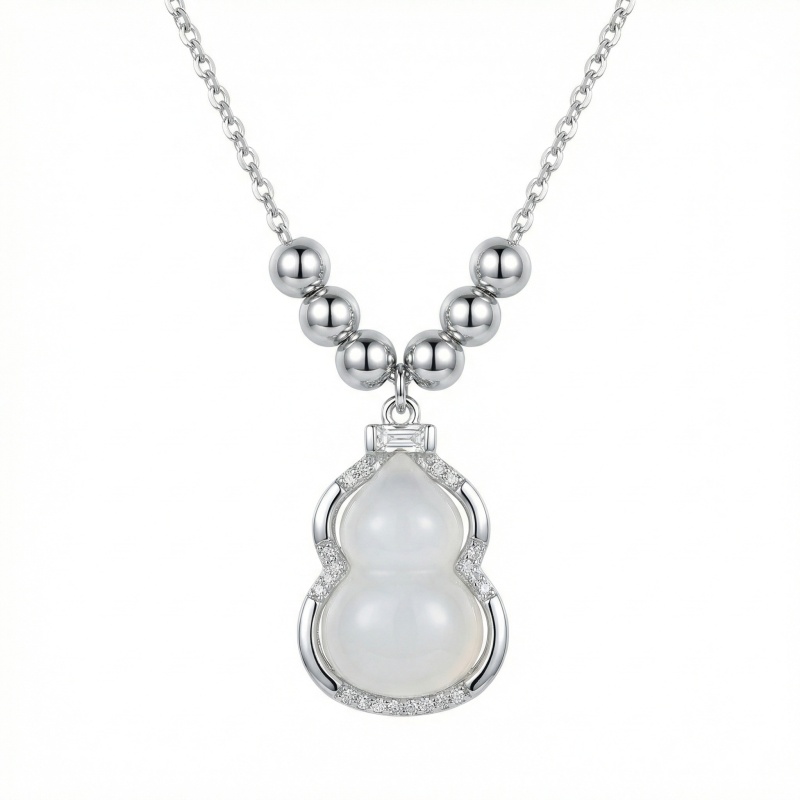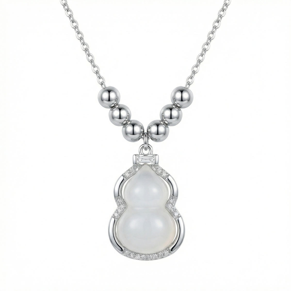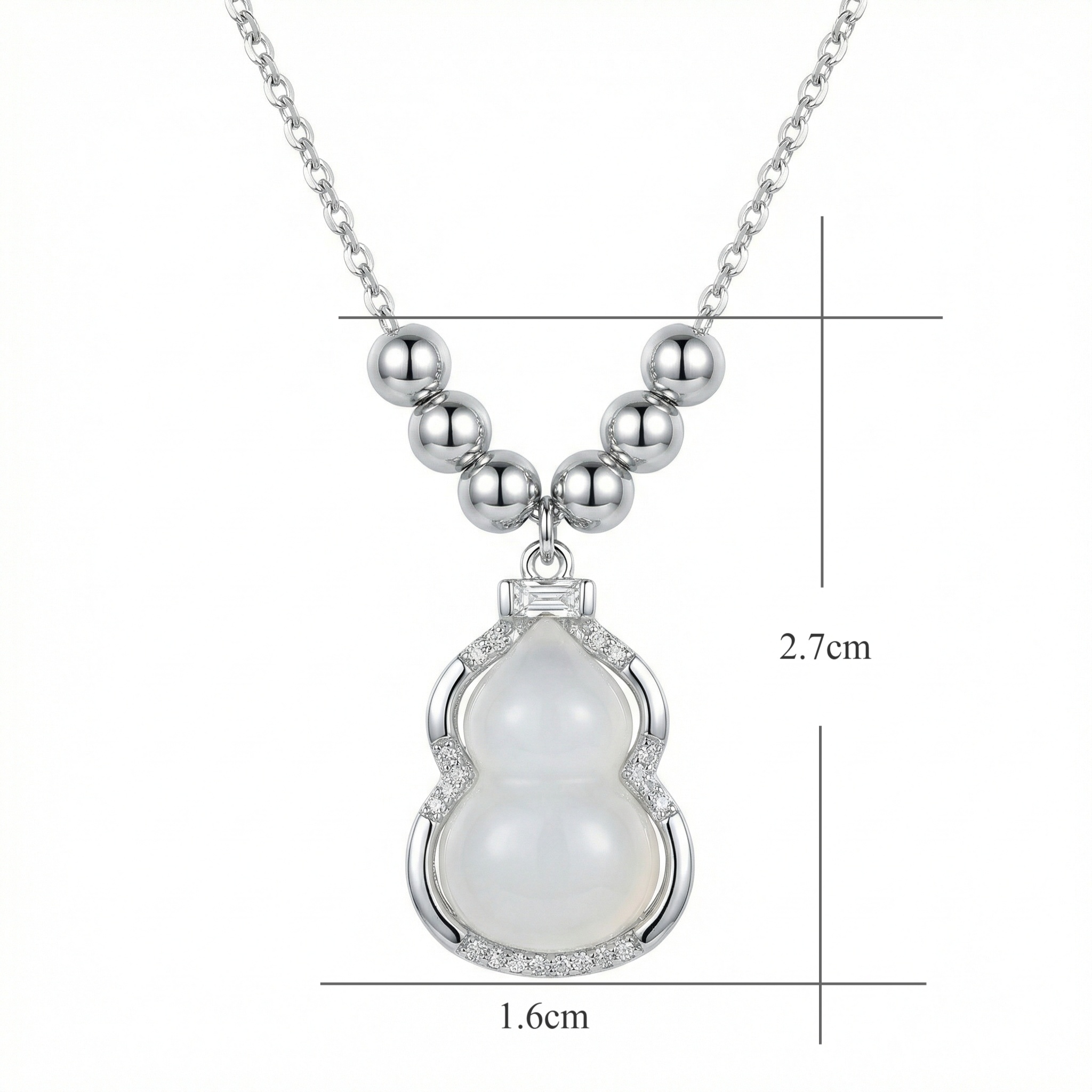 925 Sterling Silver Elegant Silver Gourd Pendant Necklace with White Jade and Sparkling Crystals
