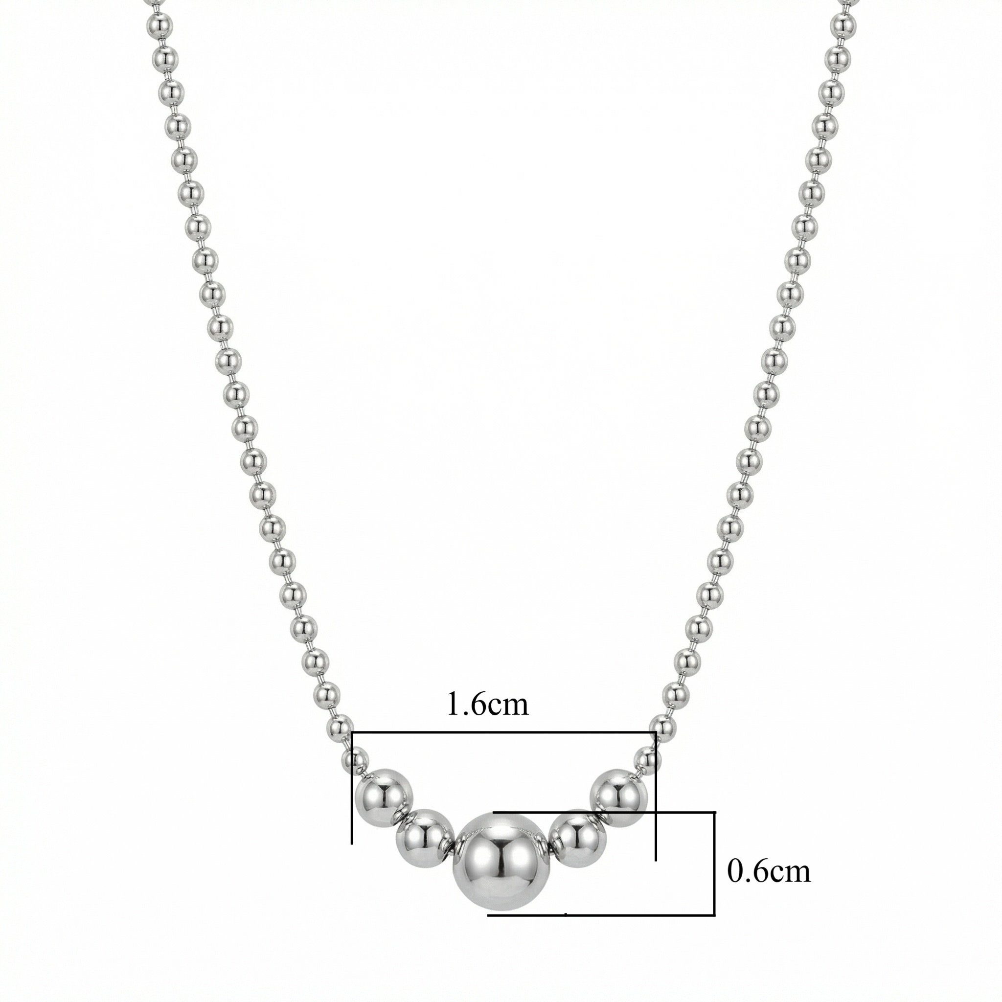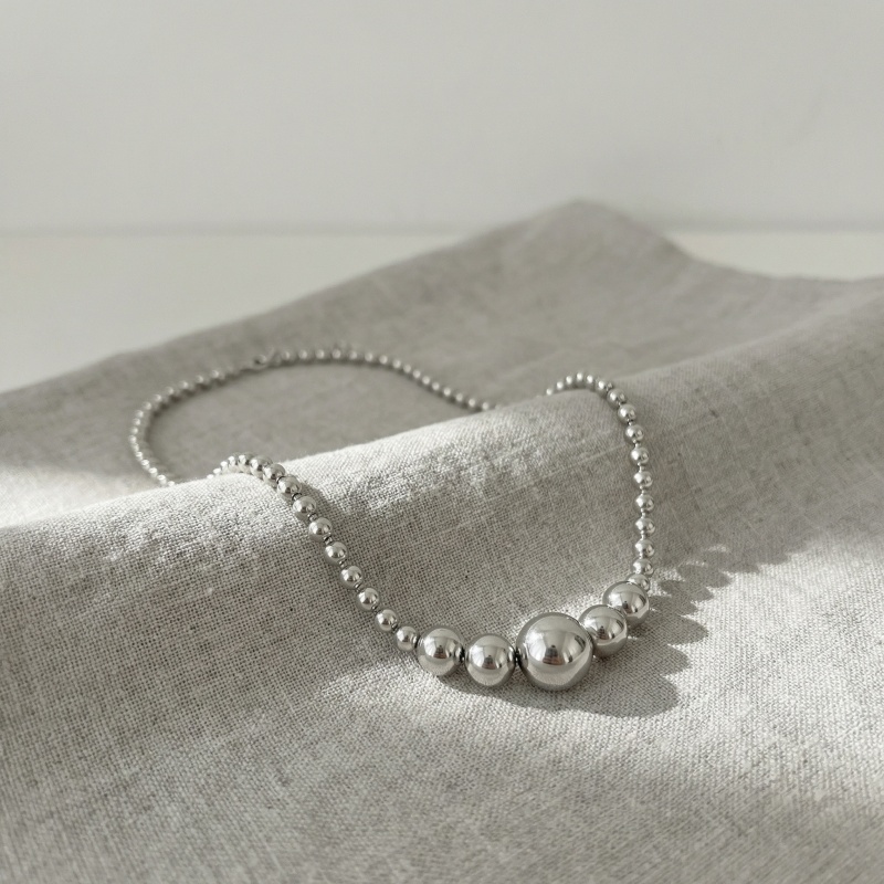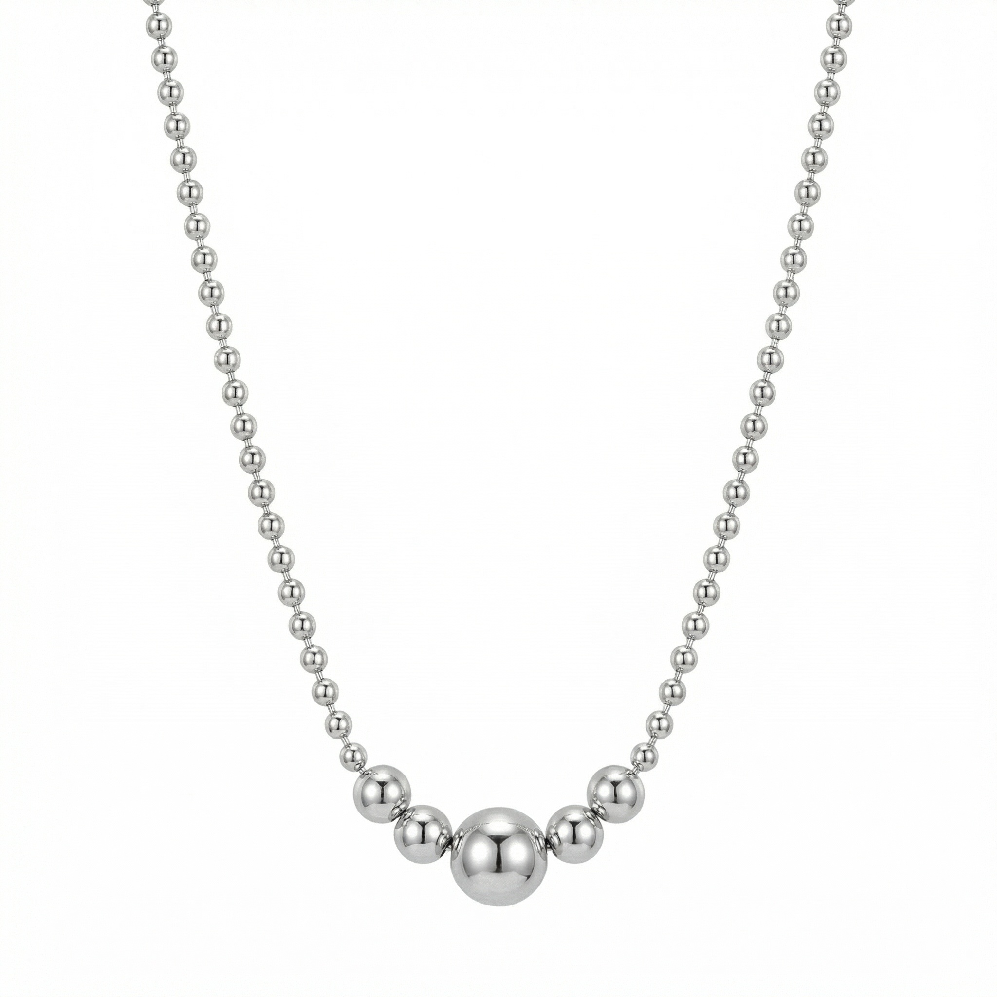 This sophisticated necklace features a series of polished silver-toned beads in a graduated arrangement. A large central sphere serves as the focal point, flanked by smaller beads that taper in size towards a uniform strand. The high-shine finish provides a modern, reflective aesthetic that complements both casual and formal attire. Crafted for elegance and simplicity, this minimalist piece offers a timeless look, making it a versatile addition to any jewelry collection. Its sleek design ensures it sits gracefully on the neckline, adding a touch of refined glamour to your style. | Brand: jewelryodm
