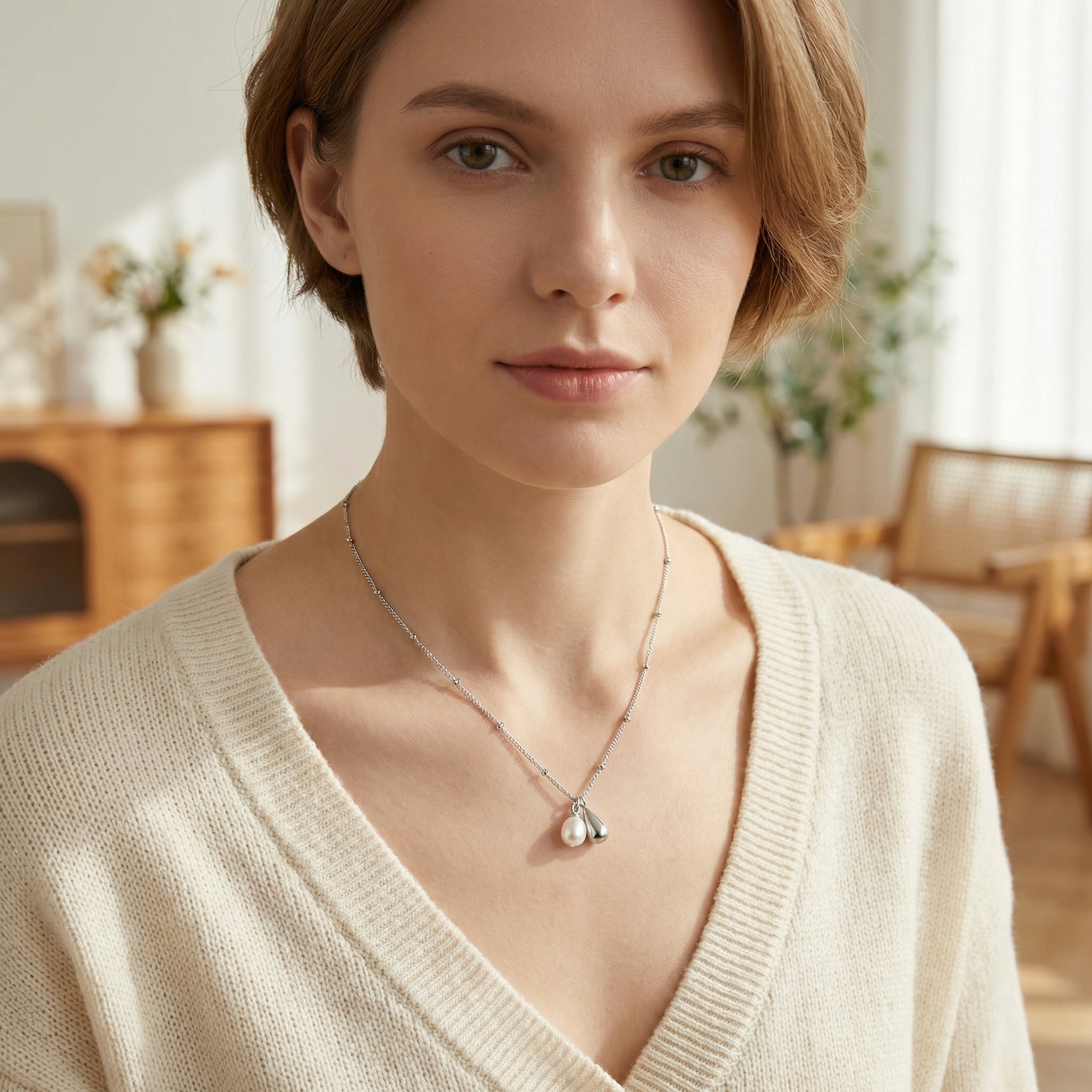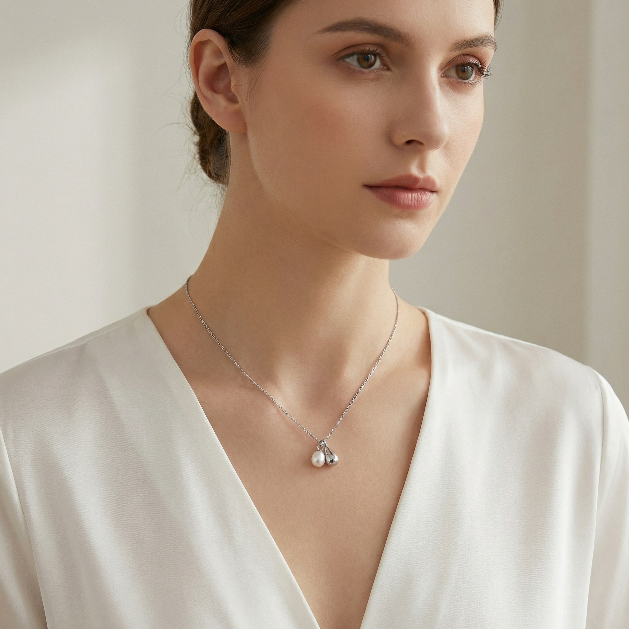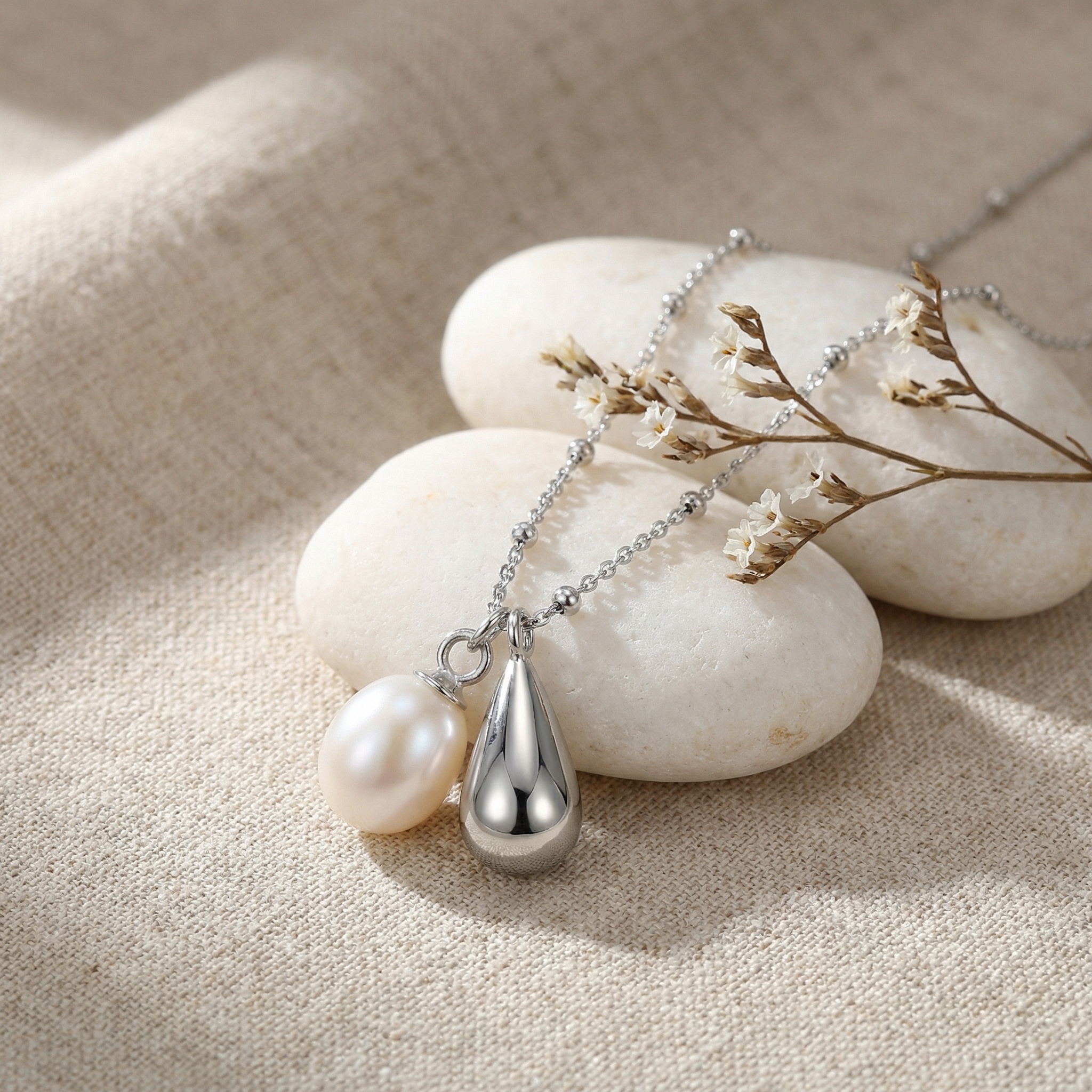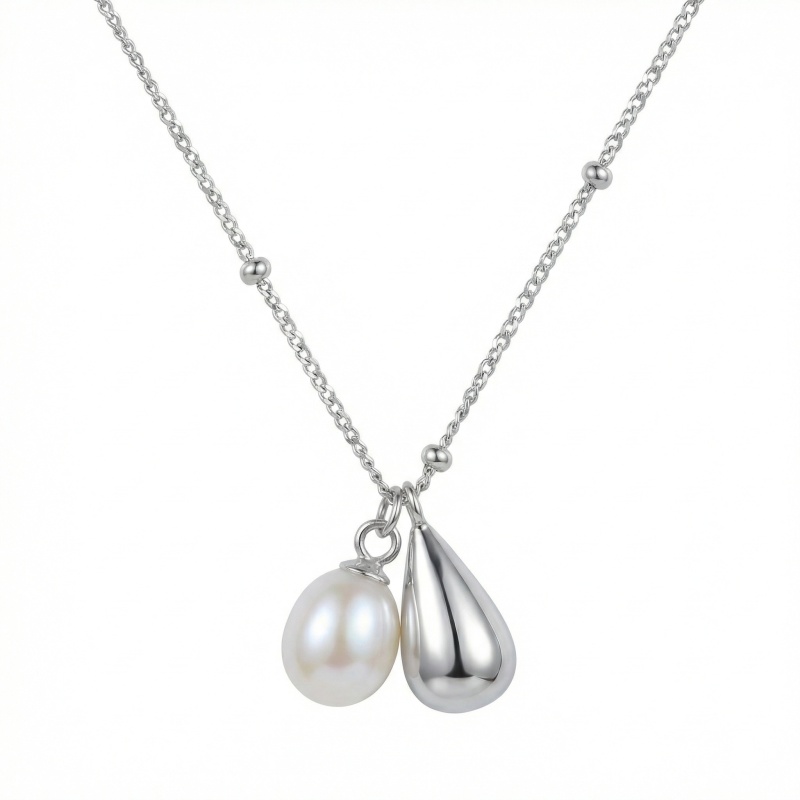 This sophisticated necklace features a delicate silver-tone chain accented with small, polished station beads for a refined touch. At its center, two teardrop-shaped charms hang gracefully. One pendant is a luminous, creamy white pearl with a natural sheen, while the other is a smooth, high-polish silver teardrop. The combination of the organic pearl and the modern metallic finish creates a stylish contrast that is both timeless and contemporary. This versatile piece is perfect for adding a touch of understated elegance to any ensemble, whether for casual daily wear or a formal evening event. Its lightweight design ensures comfort, making it a beautiful and effortless addition to any jewelry collection. | Brand: jewelryodm