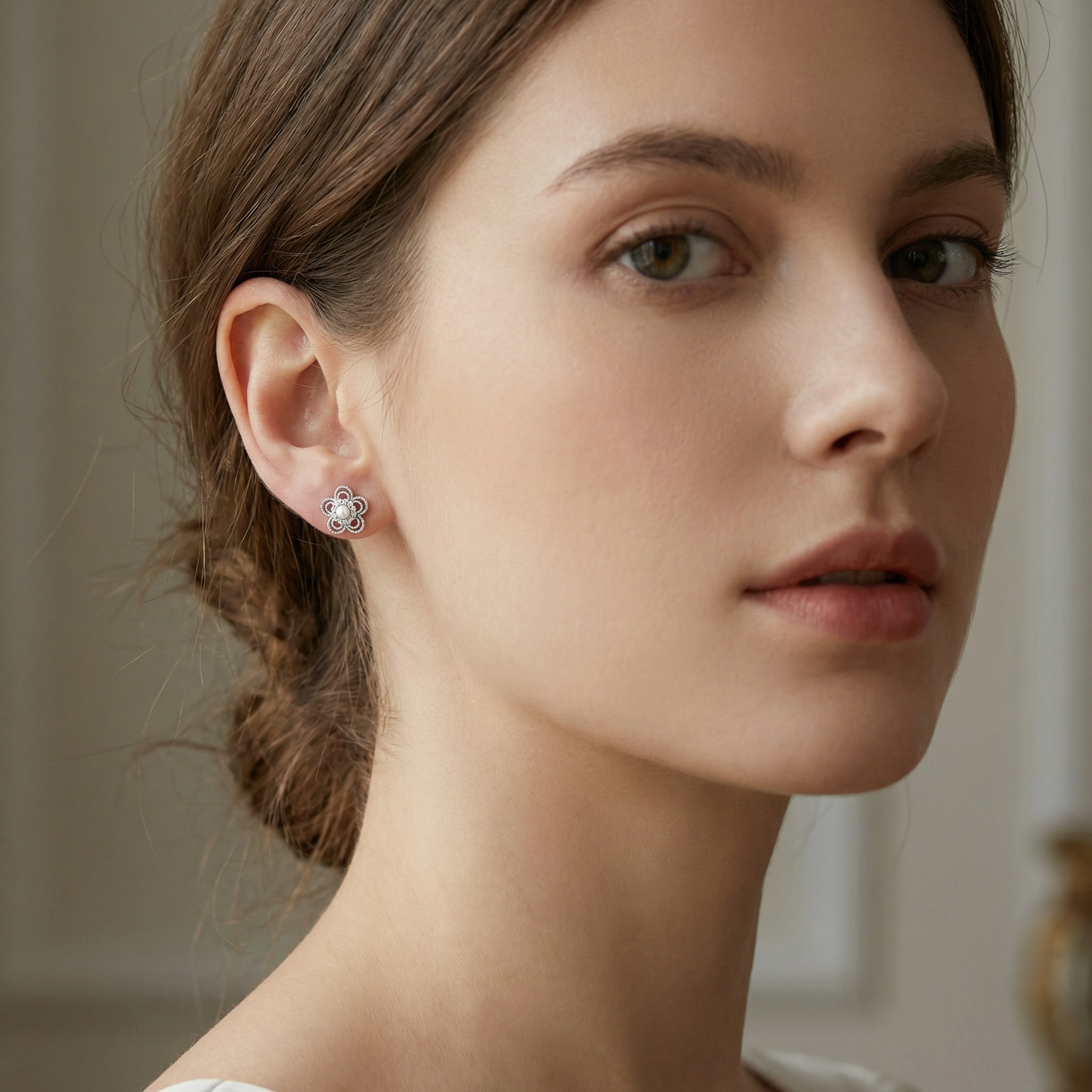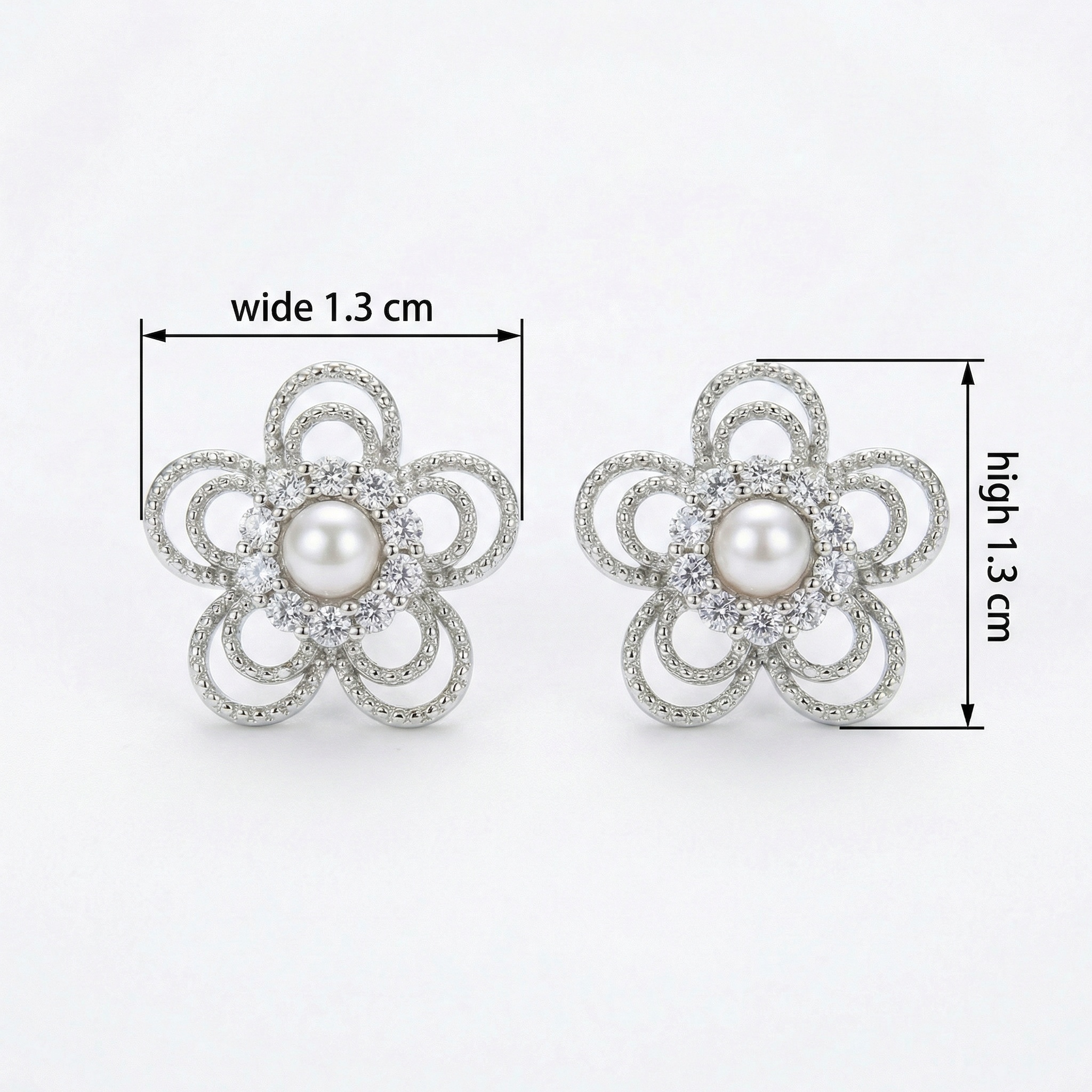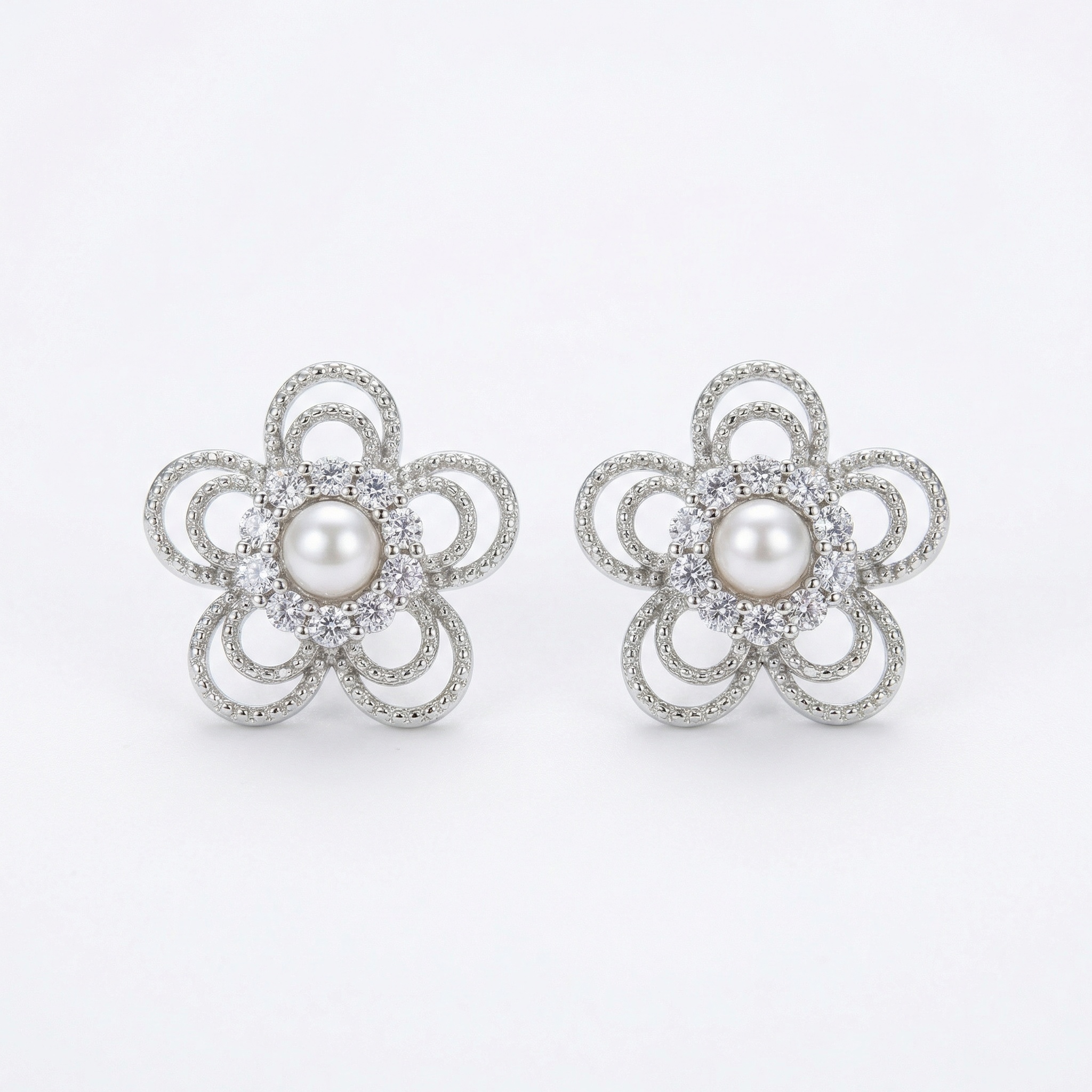 These exquisite silver-toned stud earrings feature a sophisticated floral design, blending timeless beauty with intricate detail. At the center of each flower sits a lustrous white pearl, framed by a sparkling halo of brilliant clear stones. The five petals are crafted with delicate, overlapping open-work loops, lending an airy and feminine feel to the piece. The combination of the high-shine metallic finish, the soft glow of the pearls, and the dazzling shimmer of the accents creates a captivating accessory. Ideal for weddings, formal events, or elevating everyday attire, these earrings offer a versatile touch of elegance. Their classic yet unique aesthetic makes them a perfect gift for those who appreciate fine craftsmanship and romantic jewelry styles. Designed for comfort and security, they are a beautiful and reliable addition to any jewelry collection. | Brand: jewelryodm
