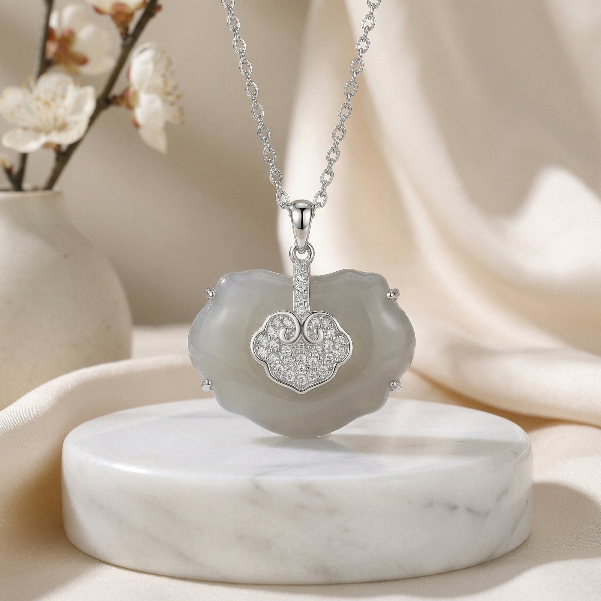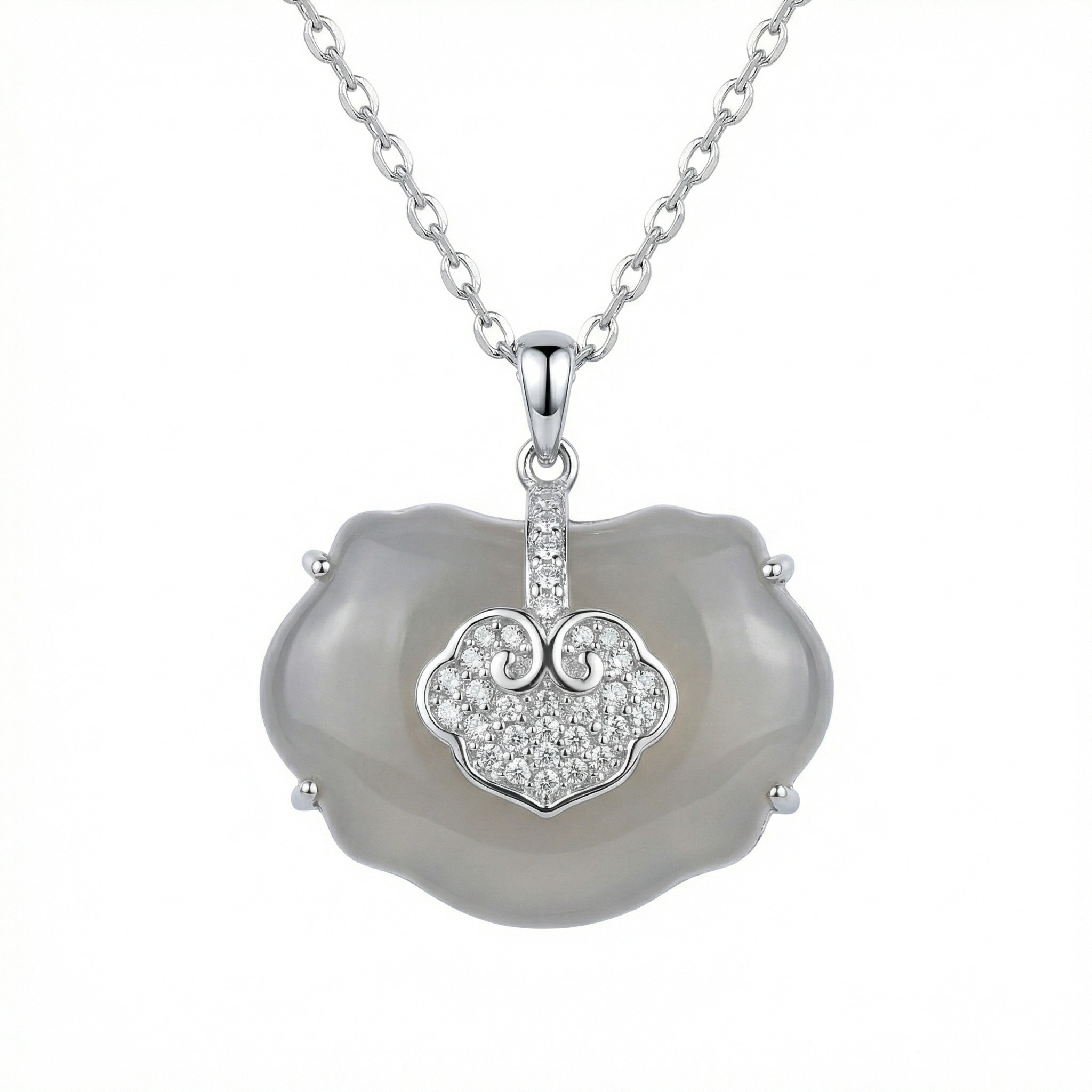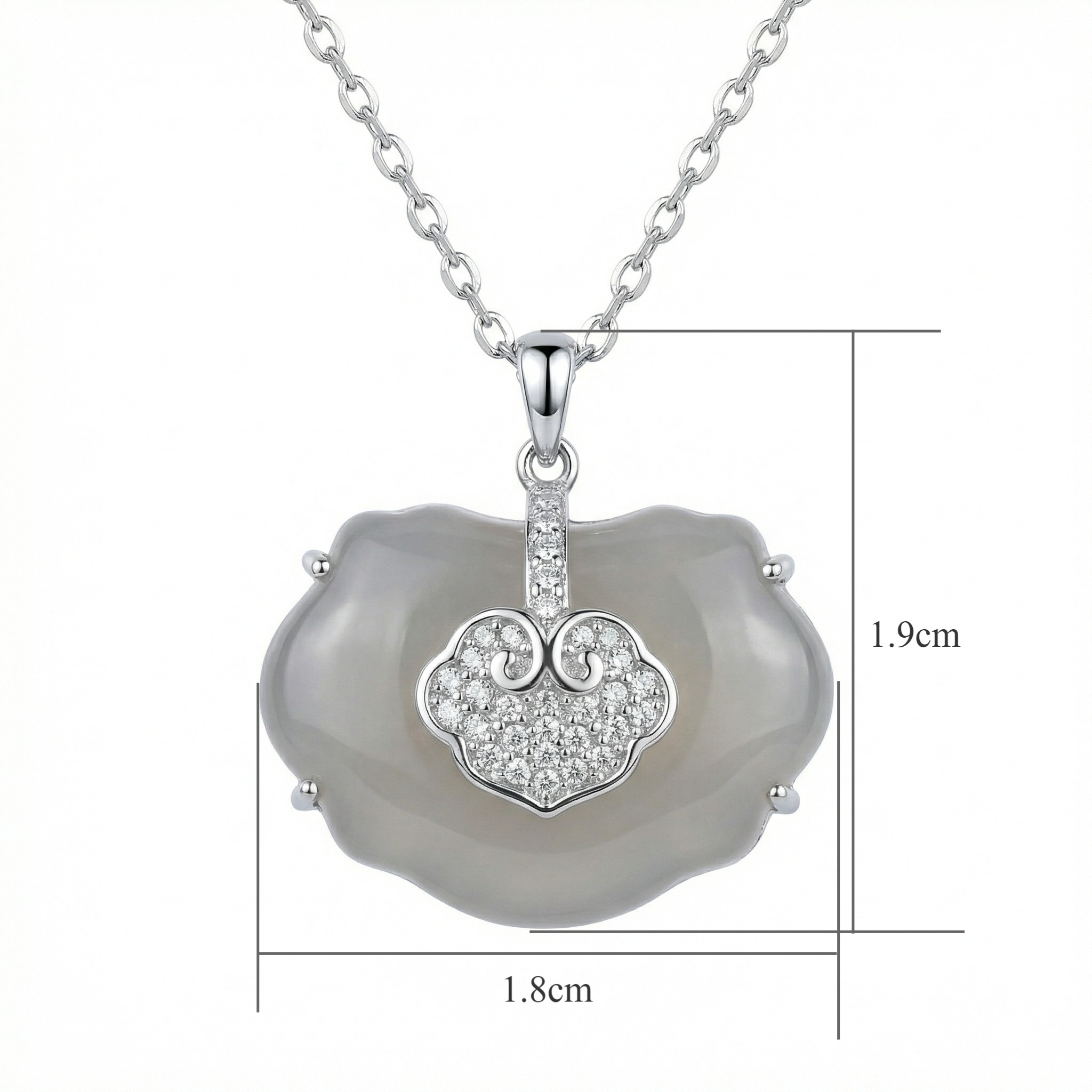 925 Sterling Silver Elegant Silver Ruyi Longevity Lock Pendant Necklace with Gray Chalcedony and Sparkling Pavé Accents
