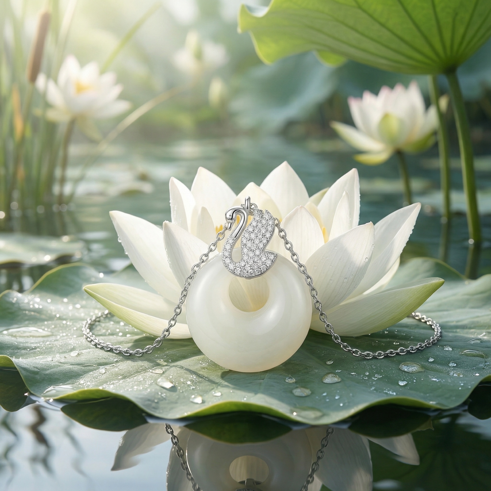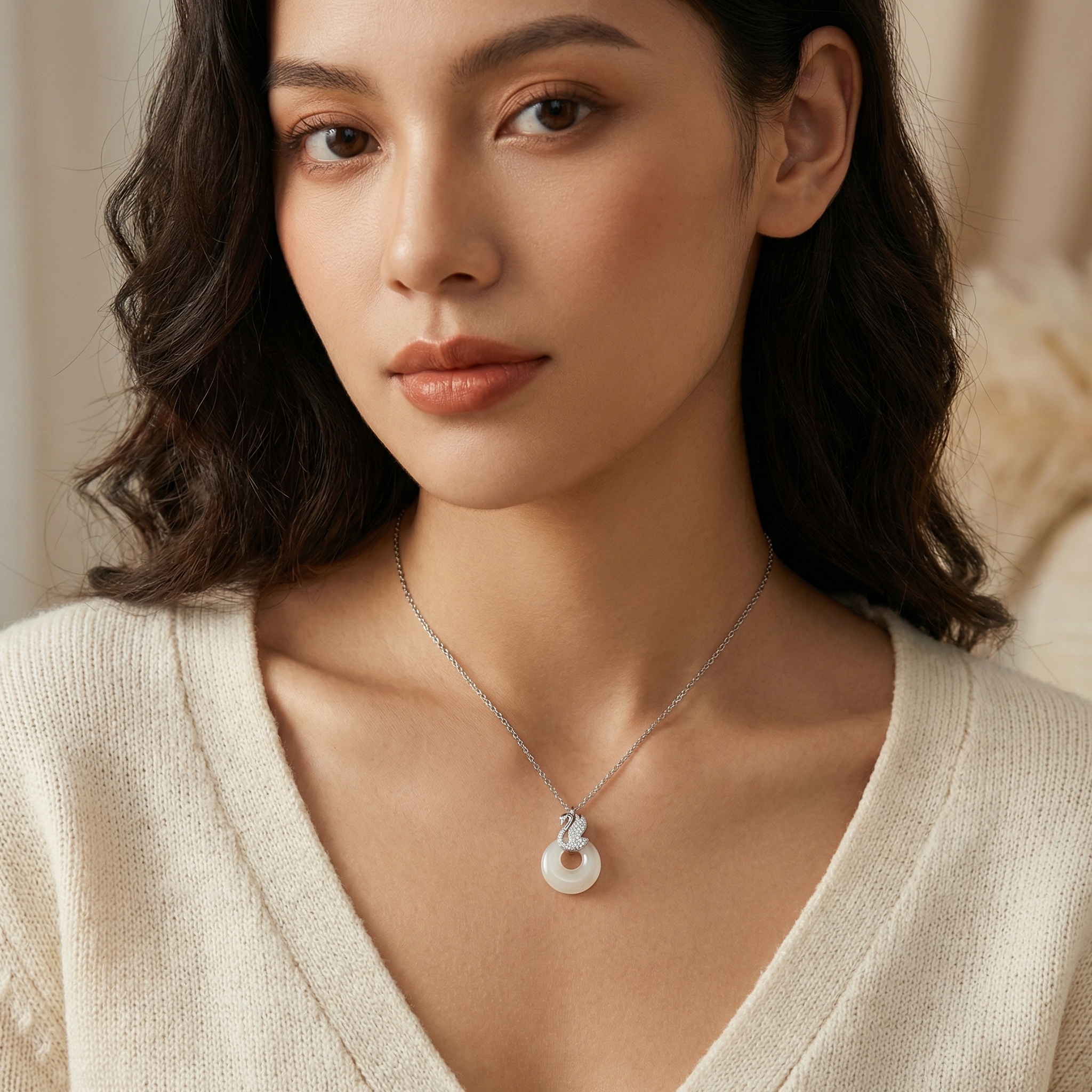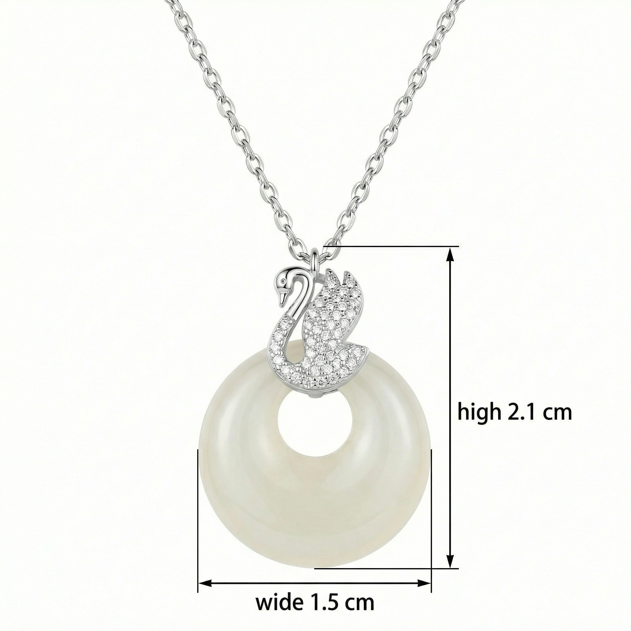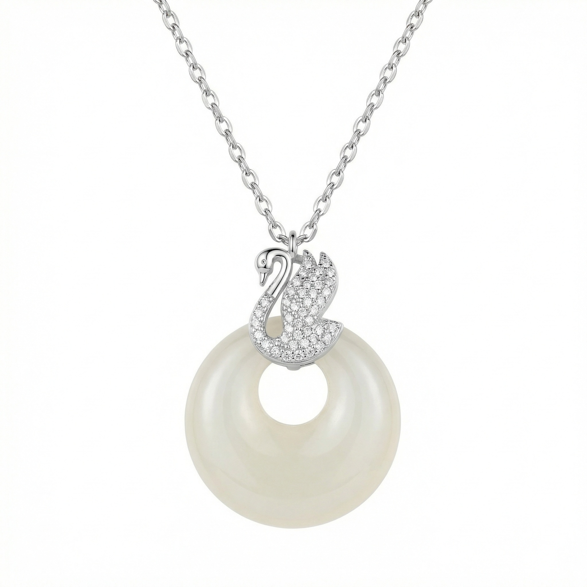 This exquisite necklace features a graceful silver swan pendant, intricately pavé-set with shimmering clear crystals that capture the light with every movement. The swan rests atop a large, polished circular stone in a soft, milky white hue, reminiscent of fine white jade. Its smooth, donut-shaped design adds a modern touch to the classic swan motif, symbolizing elegance and purity. The pendant is suspended from a delicate silver-toned link chain, ensuring a sophisticated and timeless aesthetic. Perfect for both formal occasions and adding a touch of luxury to everyday wear, this piece combines brilliant sparkle with the serene beauty of the circular stone. It serves as a stunning accessory that effortlessly elevates any ensemble. | Brand: jewelryodm