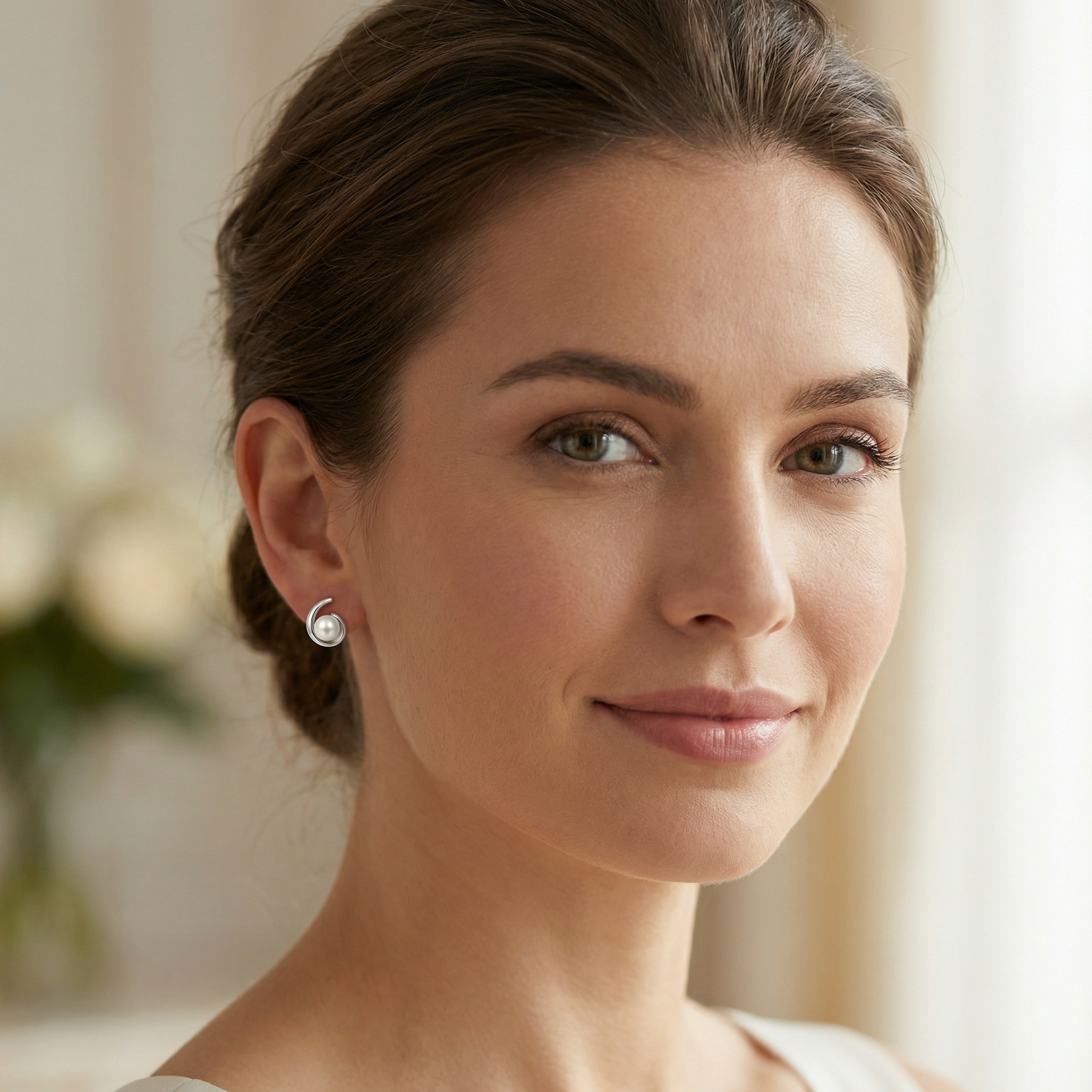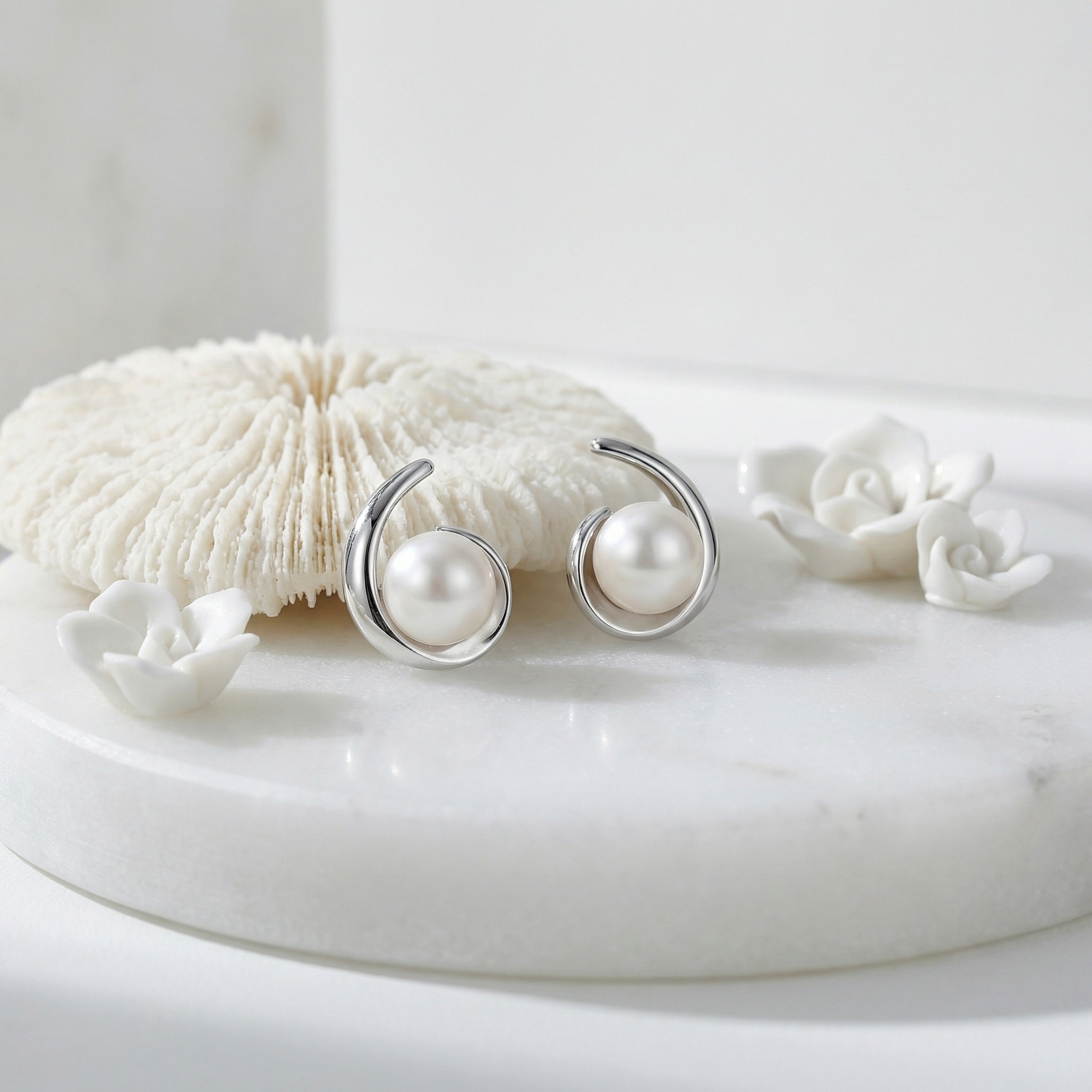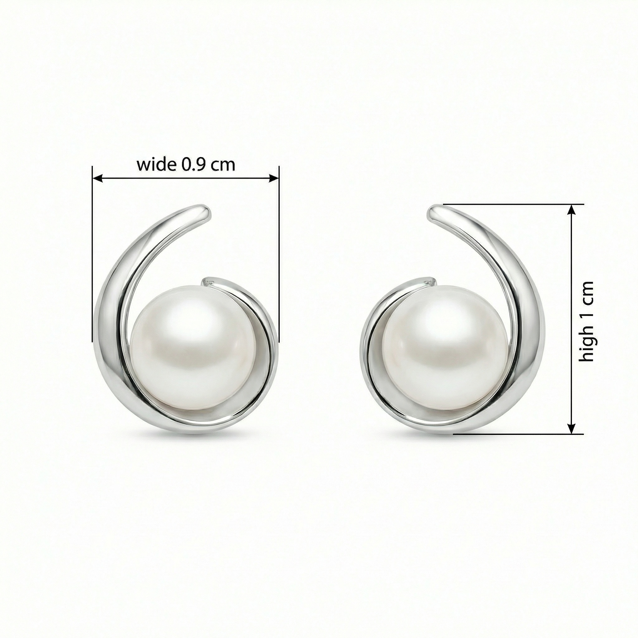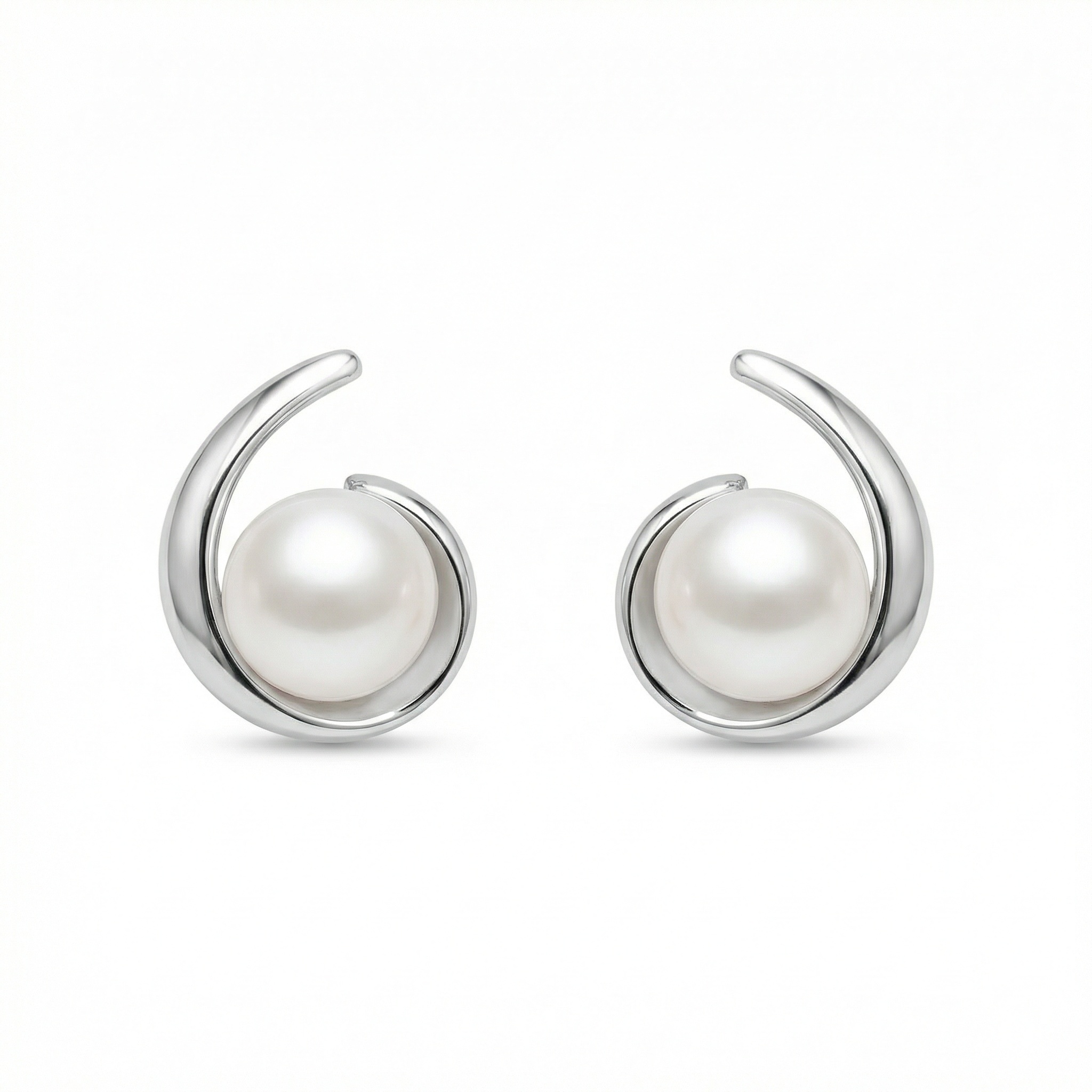 These stunning stud earrings feature a pair of lustrous white pearls nestled within a graceful, polished silver-toned swirl. The minimalist ribbon design creates a modern yet timeless aesthetic, beautifully framing each pearl to enhance its natural radiance. Crafted with a high-shine finish, the sleek metal curves elegantly around the sphere, offering a contemporary twist on the classic pearl stud. These earrings are perfect for adding a touch of sophisticated charm to any outfit, whether for a formal evening event or everyday office wear. Their lightweight and secure design ensures comfort throughout the day, making them an ideal gift for a loved one or a refined addition to your own jewelry collection. | Brand: jewelryodm