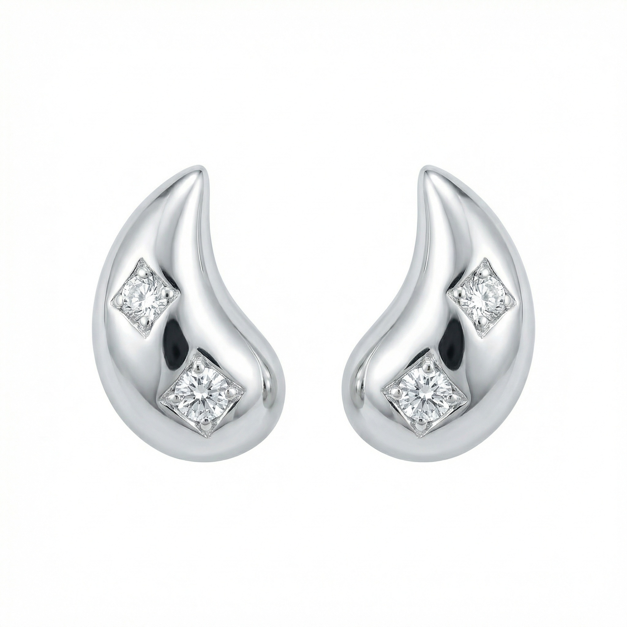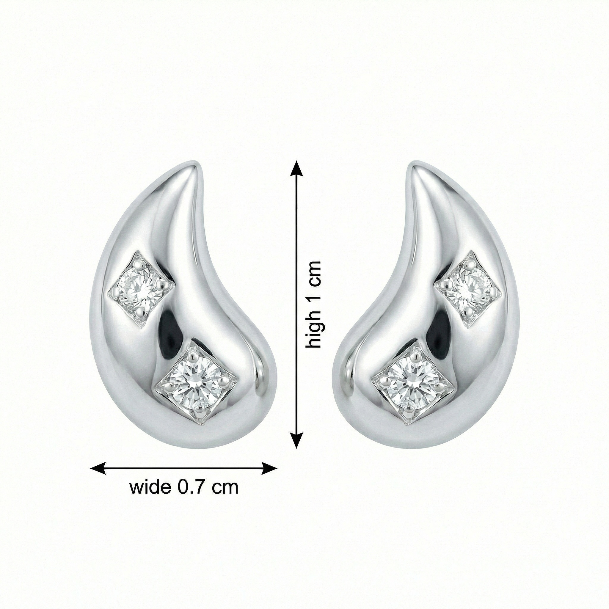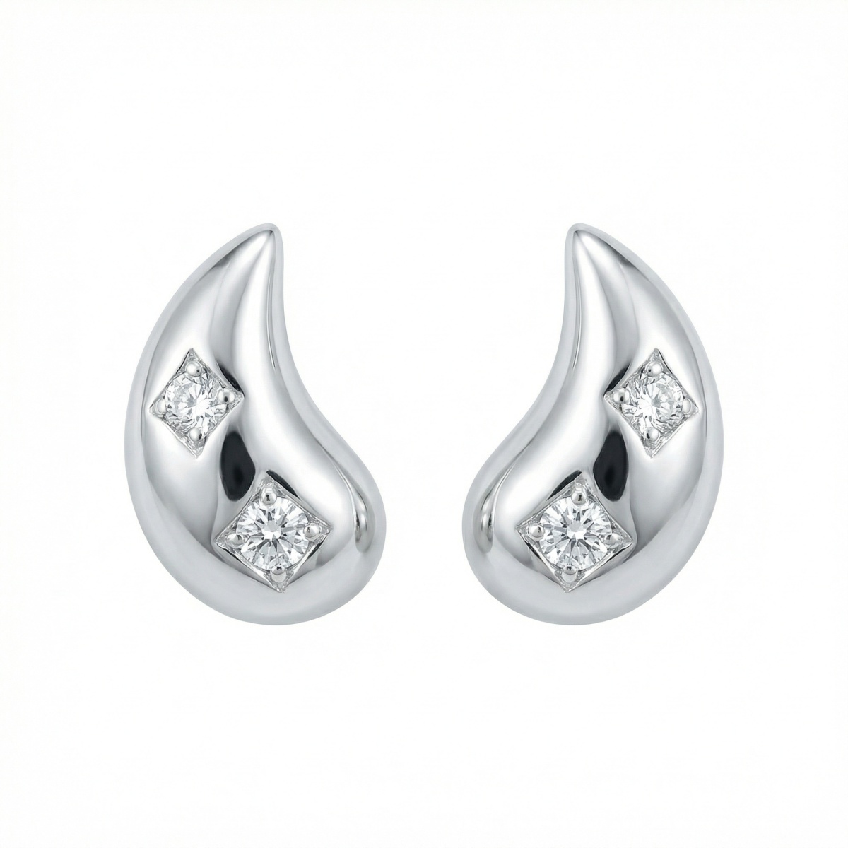 These stunning teardrop-shaped stud earrings are crafted from high-quality polished silver, offering a sleek and contemporary look. Each earring features a graceful, curved design that tapers to a gentle point. Nestled within the smooth surface are two brilliant-cut diamonds, securely set in diamond-shaped frames that enhance their sparkle. The minimalist aesthetic makes them perfect for adding a touch of understated luxury to any outfit, whether for daily wear or a special occasion. Their elegant, mirrored silhouette provides a balanced and sophisticated appearance, making them an ideal gift for a loved one or a timeless addition to your own jewelry collection. | Brand: jewelryodm