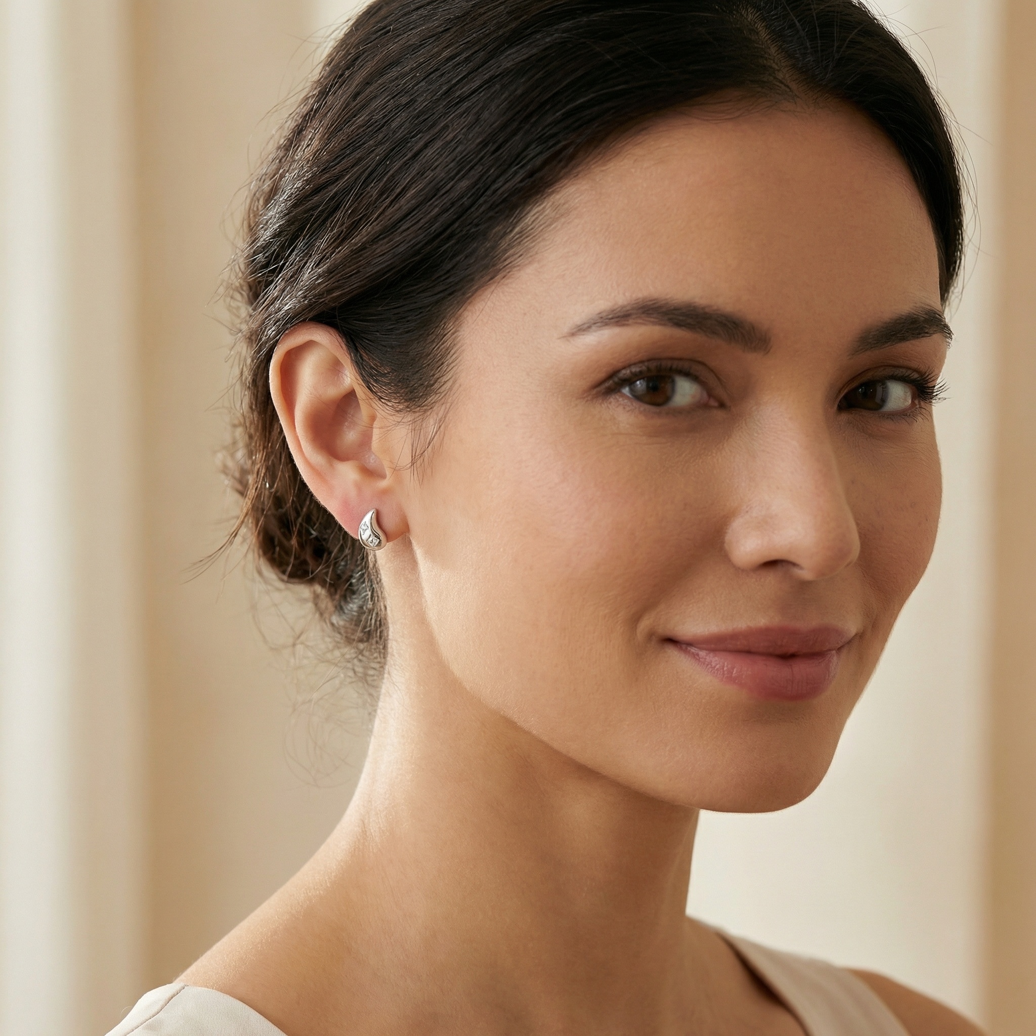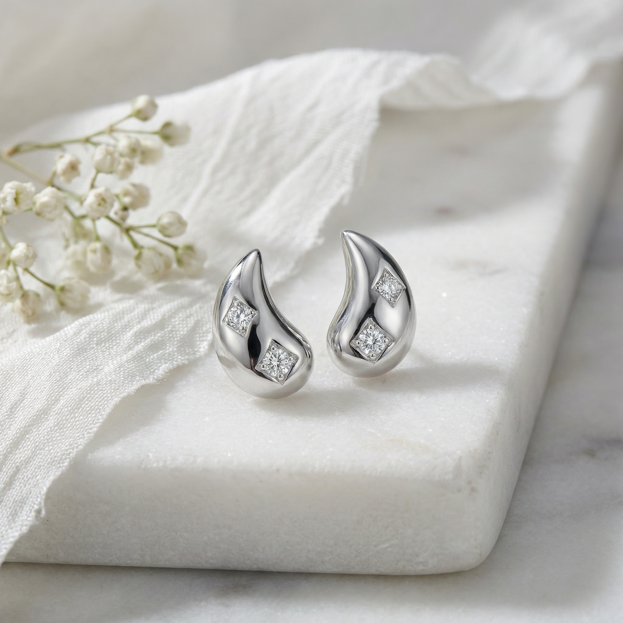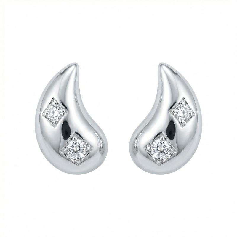 These stunning teardrop-shaped stud earrings are crafted from high-quality polished silver, offering a sleek and contemporary look. Each earring features a graceful, curved design that tapers to a gentle point. Nestled within the smooth surface are two brilliant-cut diamonds, securely set in diamond-shaped frames that enhance their sparkle. The minimalist aesthetic makes them perfect for adding a touch of understated luxury to any outfit, whether for daily wear or a special occasion. Their elegant, mirrored silhouette provides a balanced and sophisticated appearance, making them an ideal gift for a loved one or a timeless addition to your own jewelry collection. | Brand: jewelryodm