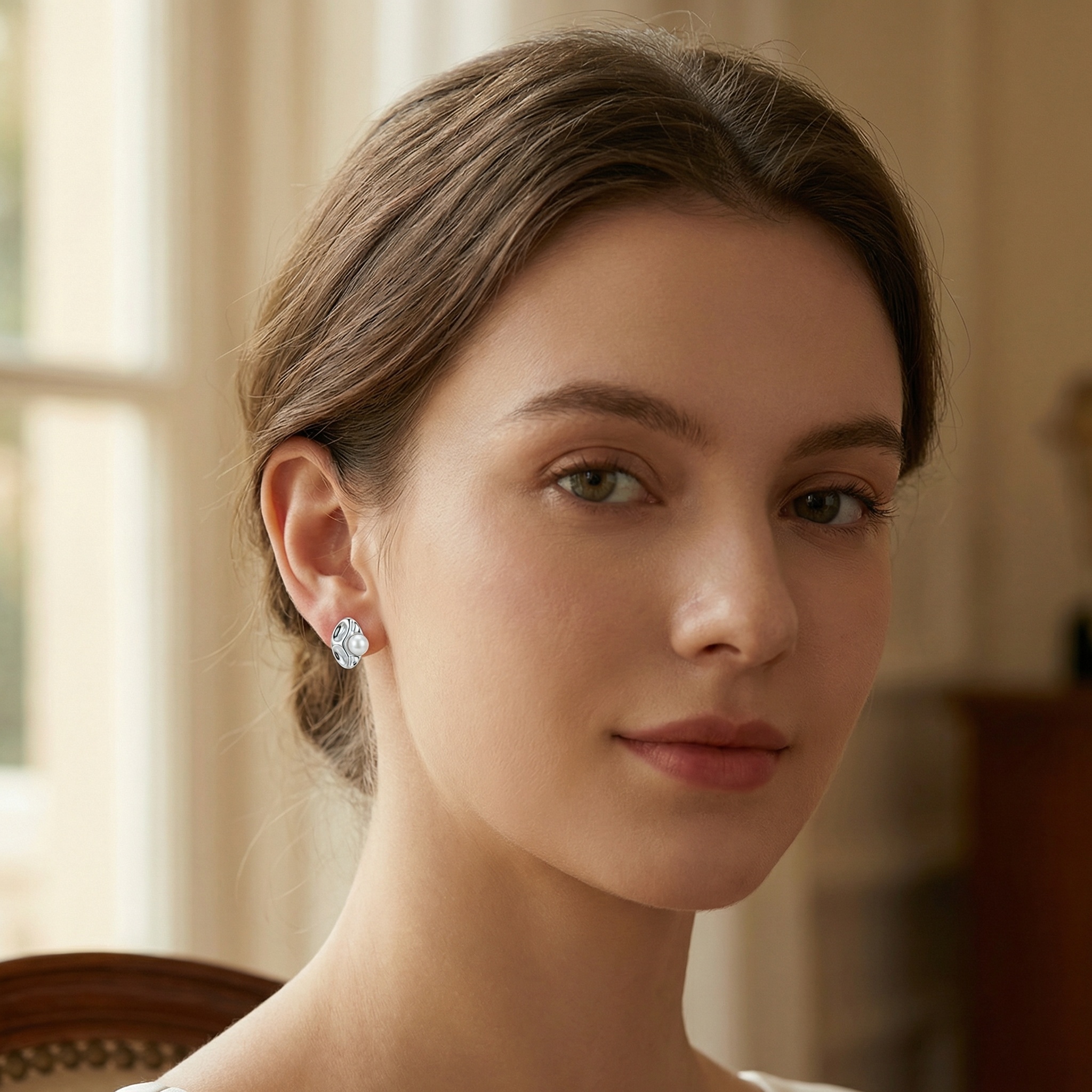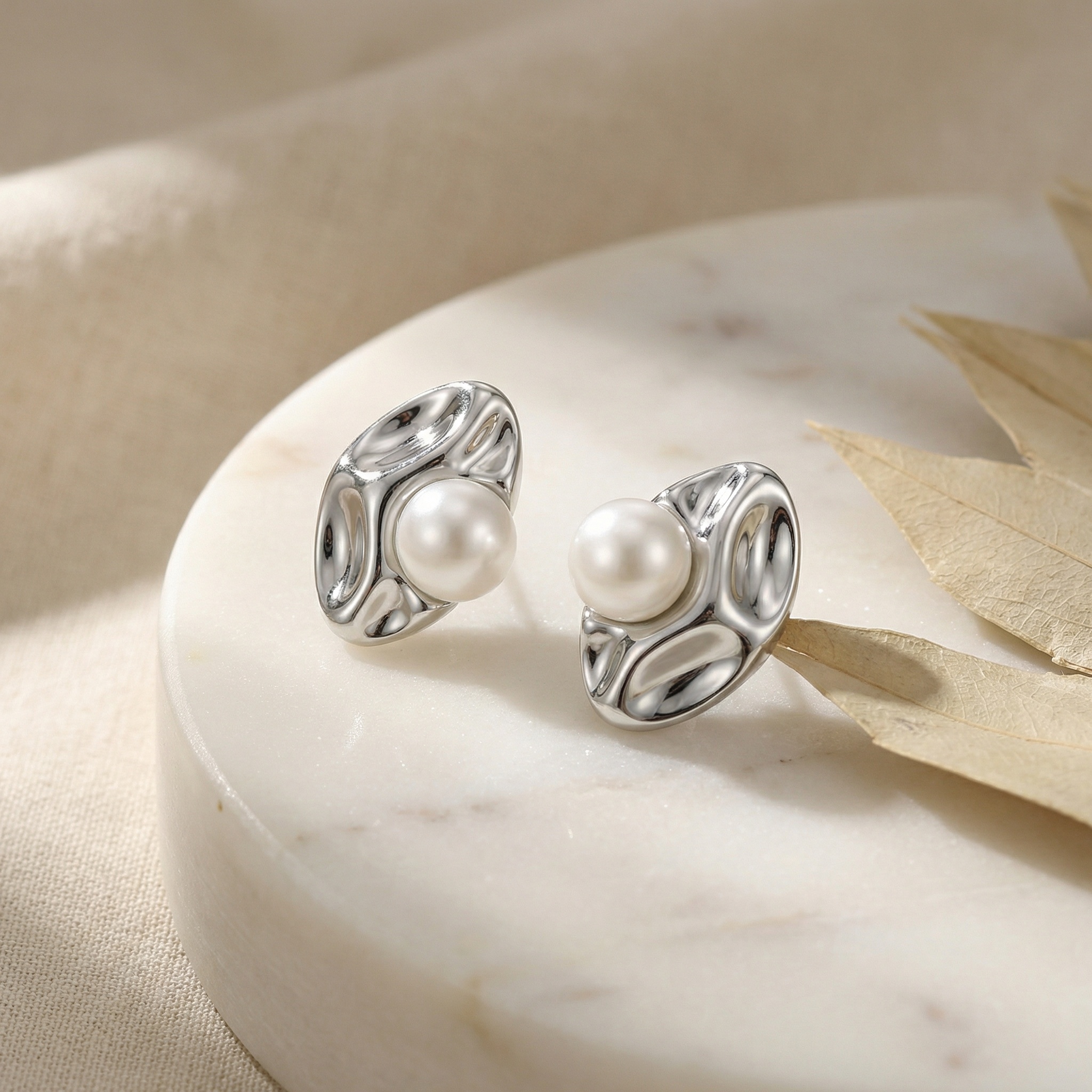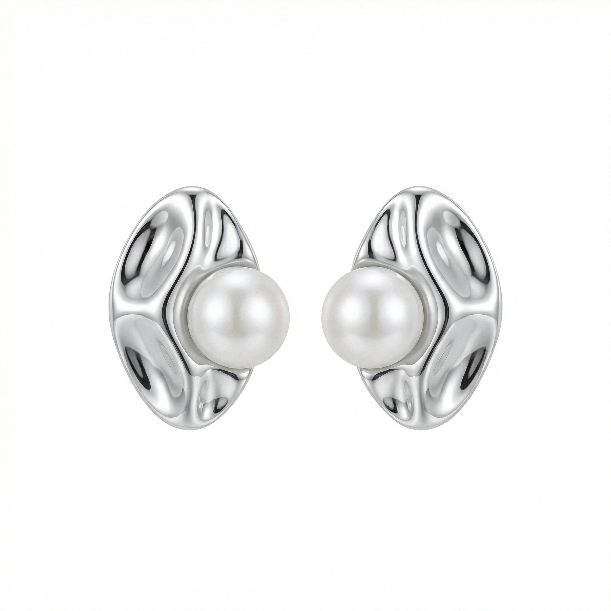 This pair of earrings showcases a sophisticated fusion of modern design and classic elegance. Each earring features a polished silver-tone base with a unique, organic, and wavy texture that beautifully catches the light. The sculptural metal frame cradles a perfectly round, lustrous white pearl at its center, creating a striking contrast between the fluid, hammered-style metalwork and the soft, iridescent glow of the gemstone. These studs are designed with a contemporary aesthetic, making them a versatile accessory for both formal occasions and elevated everyday wear. Their minimalist yet artistic form adds a touch of refined luxury to any look. The high-quality finish and meticulous craftsmanship ensure a timeless appeal, making these earrings an exquisite gift or a stylish addition to a modern jewelry collection. | Brand: jewelryodm
