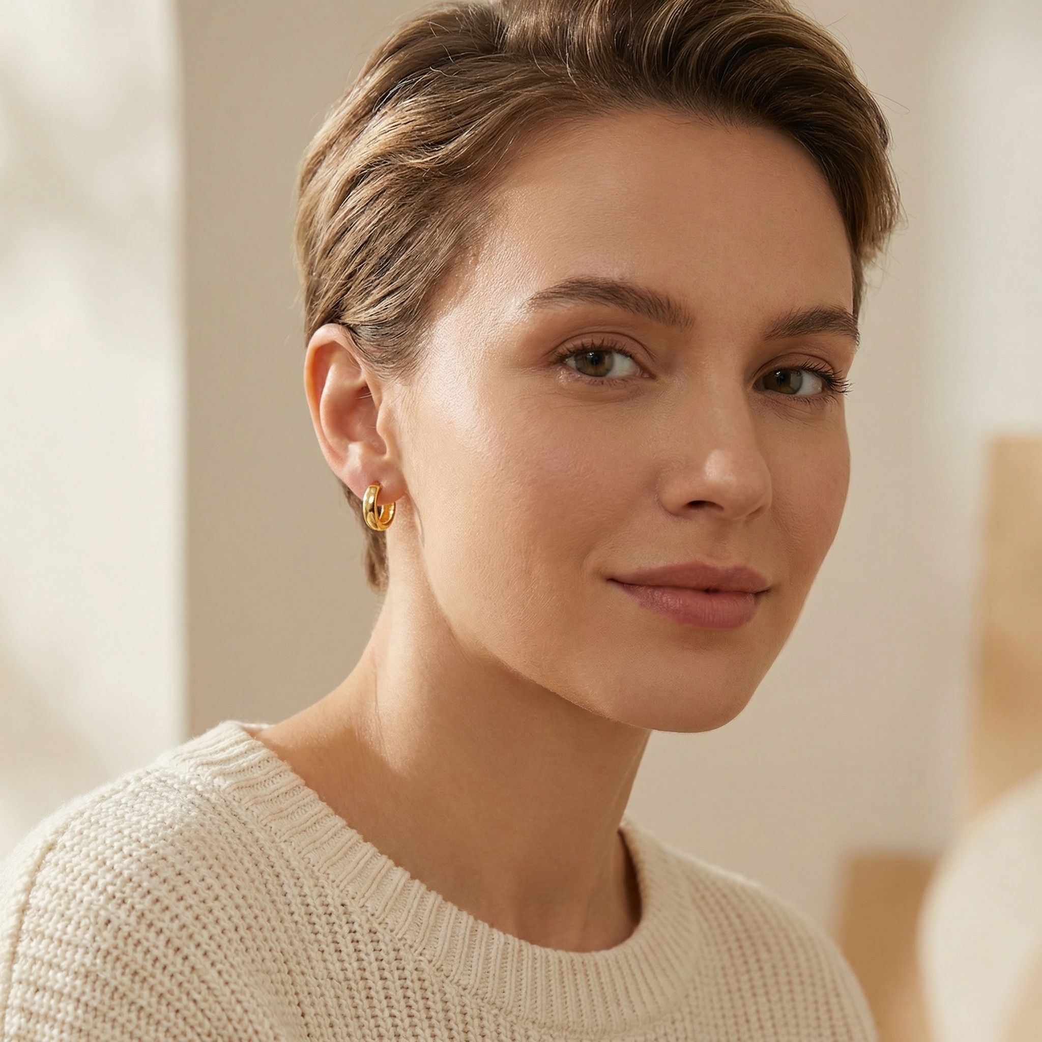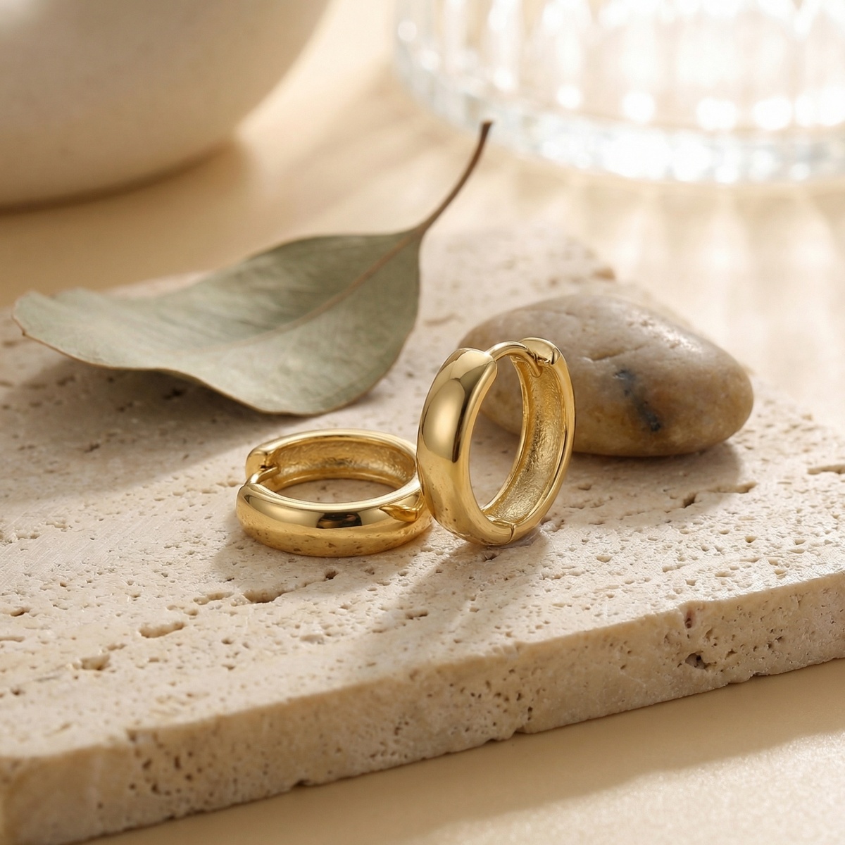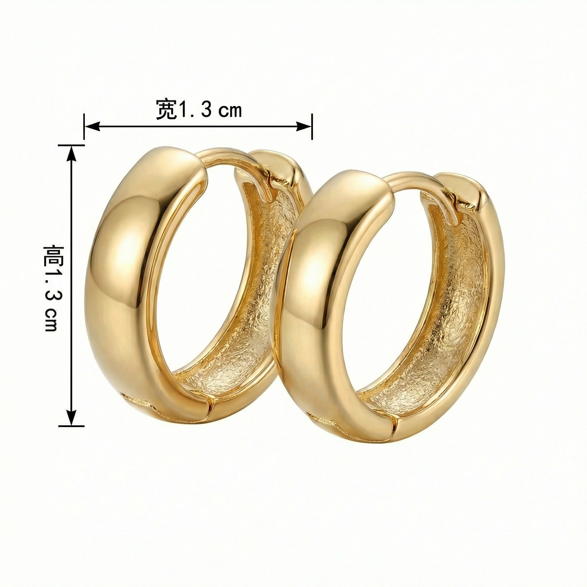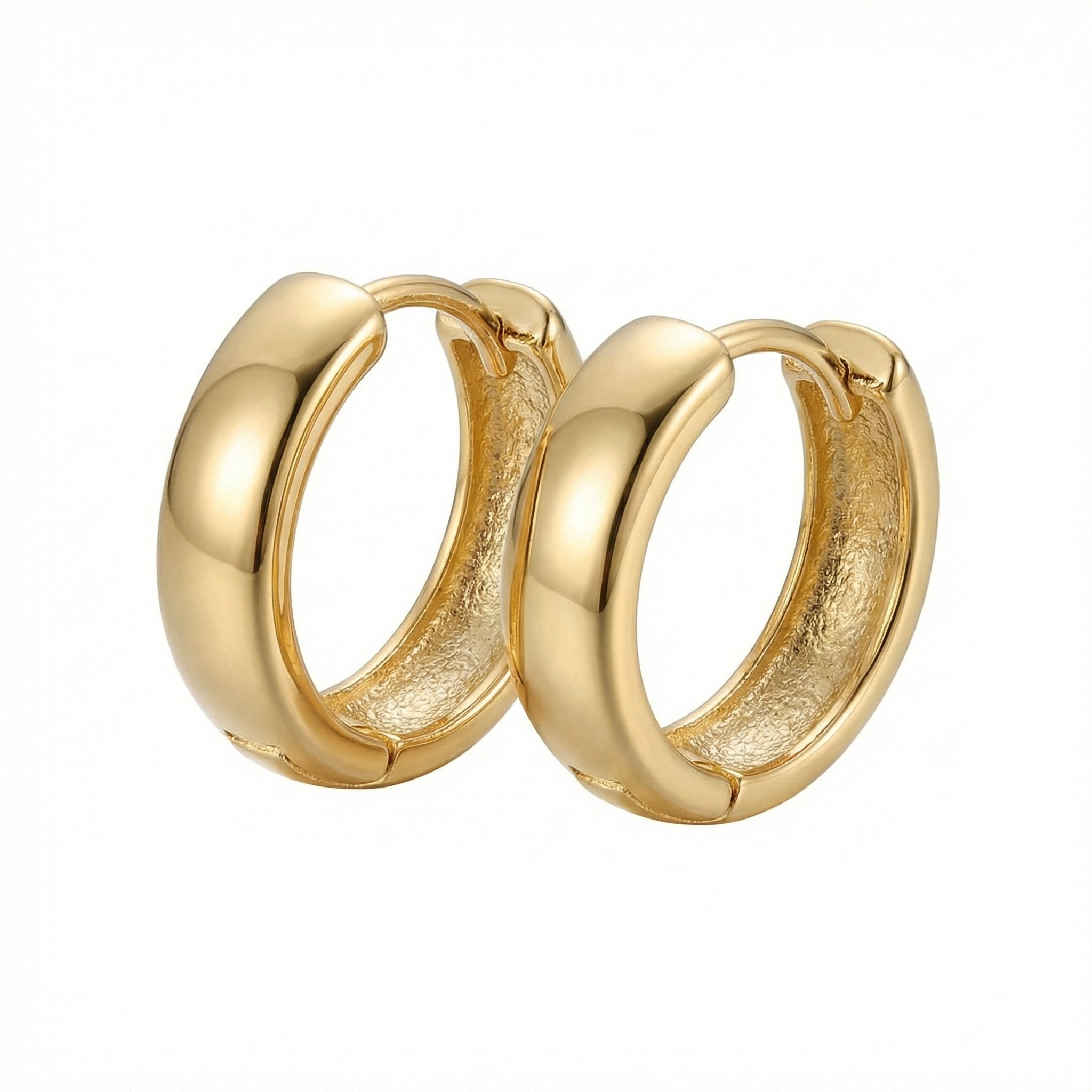 These elegant chunky hoop earrings feature a timeless design with a smooth, high-polished surface that catches the light beautifully. Crafted for comfort, these lightweight huggies are perfect for everyday wear or special occasions. The minimalist round silhouette offers a sophisticated touch to any outfit, making them a versatile addition to your jewelry collection. They feature a secure snap-back closure for easy wear and a snug fit. With their warm metallic hue and classic thick profile, these earrings provide a modern yet classic aesthetic. Ideal as a gift for yourself or a loved one, these durable hoops are designed to maintain their brilliant luster over time. Pair them with other studs for a layered look or wear them alone for a clean, understated statement. | Brand: jewelryodm