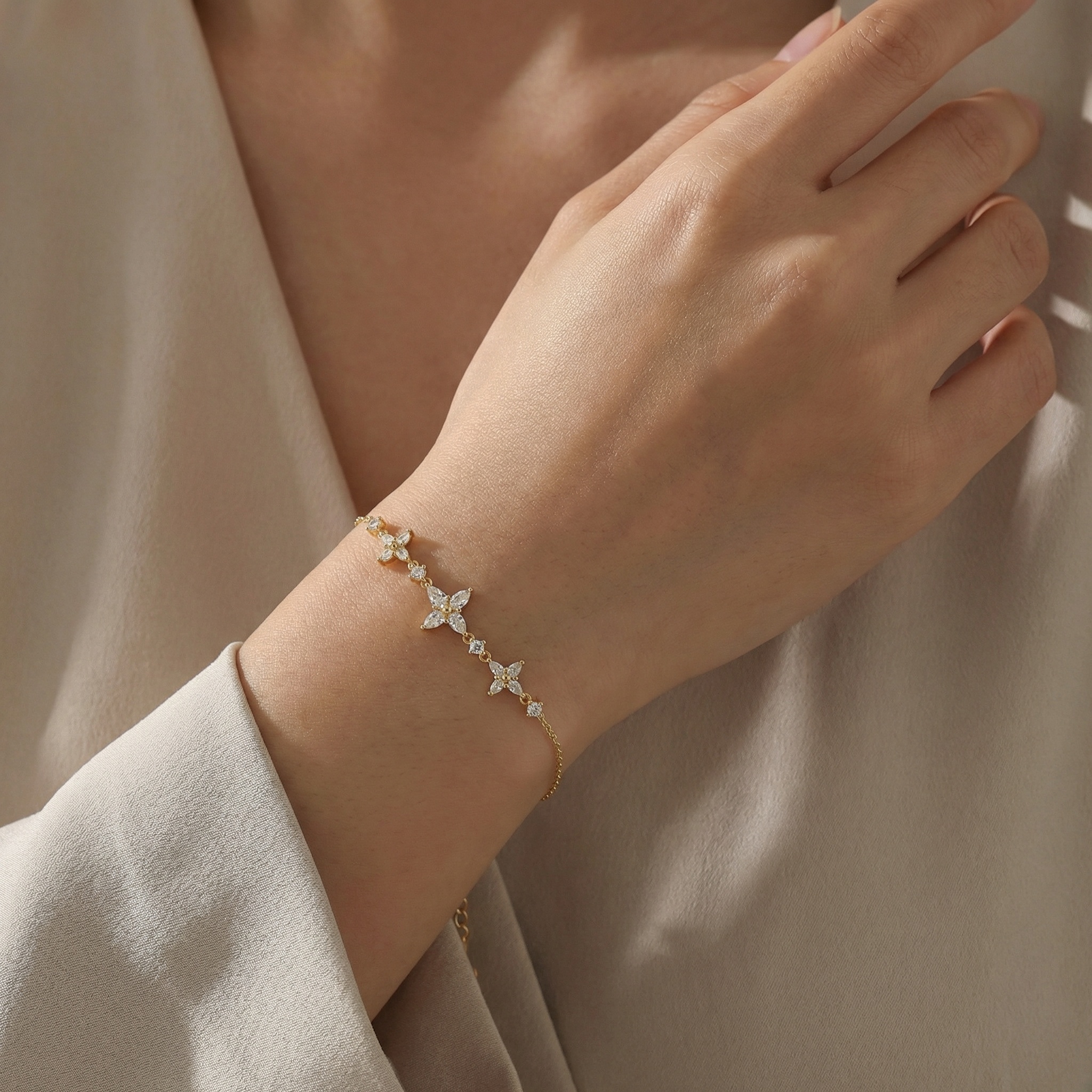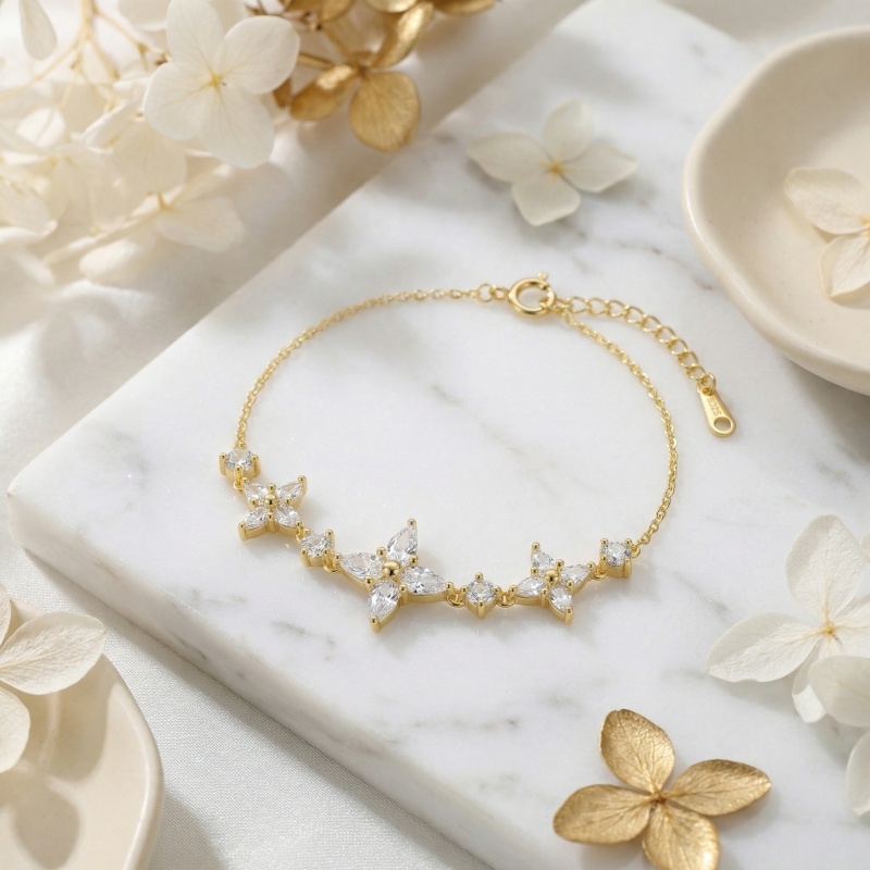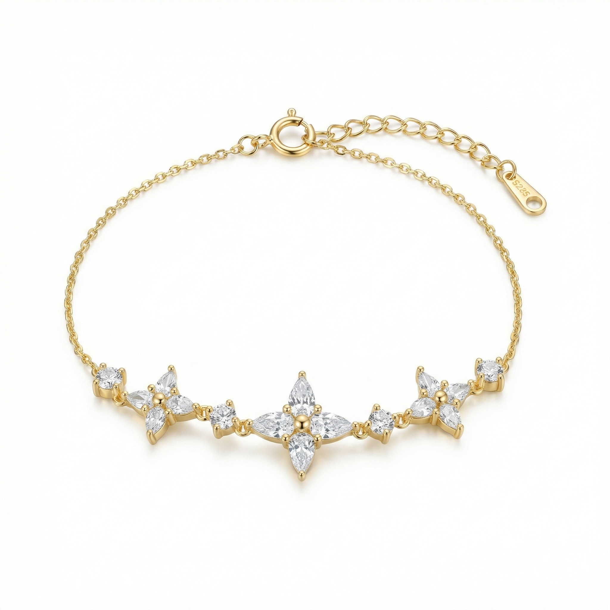 This exquisite piece features a delicate gilded chain adorned with three stunning floral motifs. Each flower is intricately crafted from brilliant marquise-cut white crystals, radiating light from every angle. Polished metallic accents at the center of each bloom and small round-cut stones between the charms add layers of sophisticated detail and shimmer. Designed with a feminine and timeless aesthetic, the piece includes an adjustable extender chain and a secure spring-ring clasp for a customized fit. This radiant accessory is perfect for special occasions, bridesmaids, or as a thoughtful gift for a loved one. Its refined silhouette and brilliant sparkle make it a versatile addition to any jewelry box, offering a touch of luxury and grace to both casual and formal ensembles. | Brand: jewelryodm
