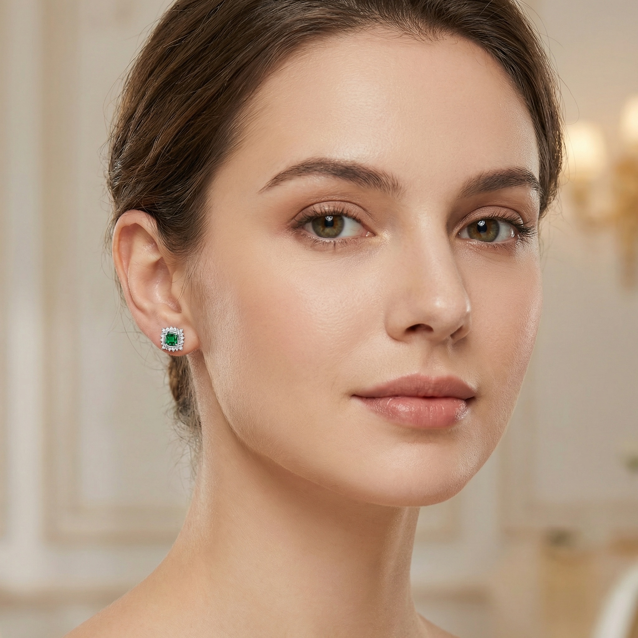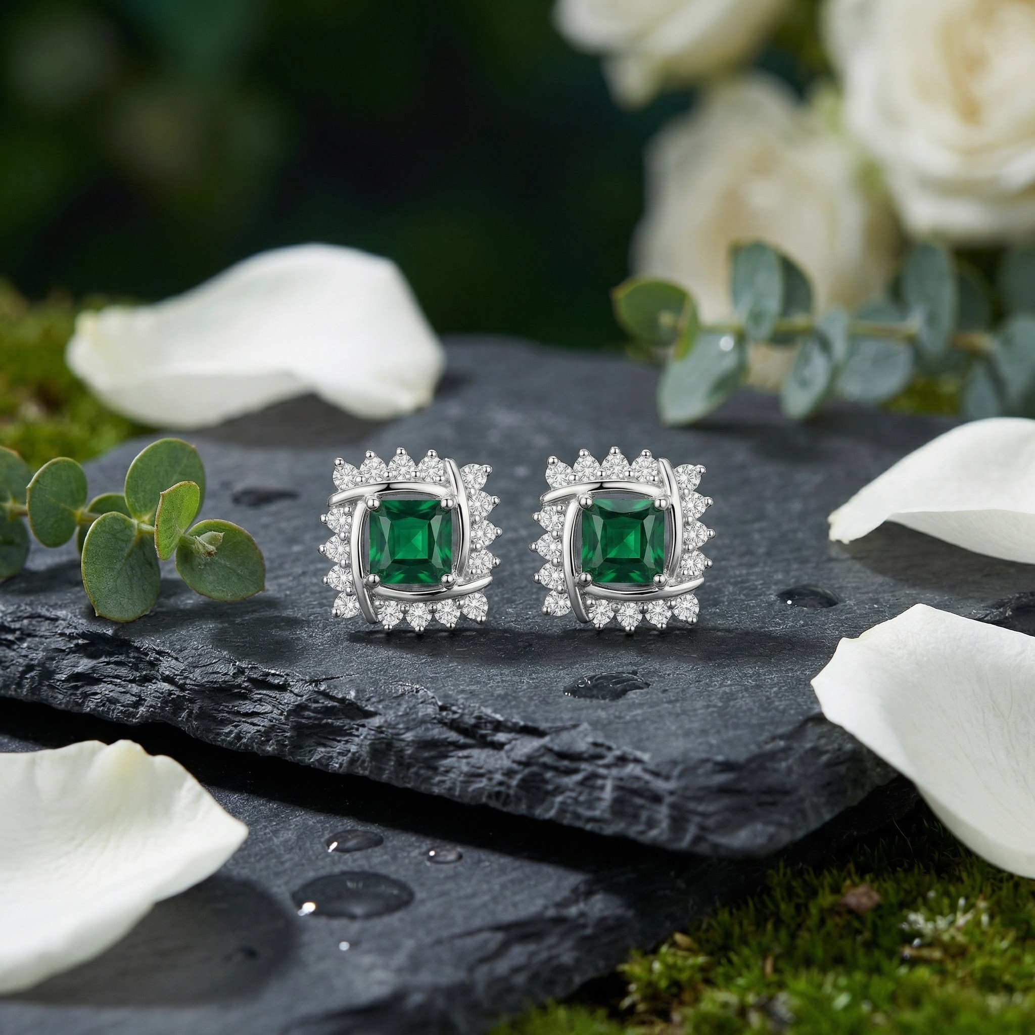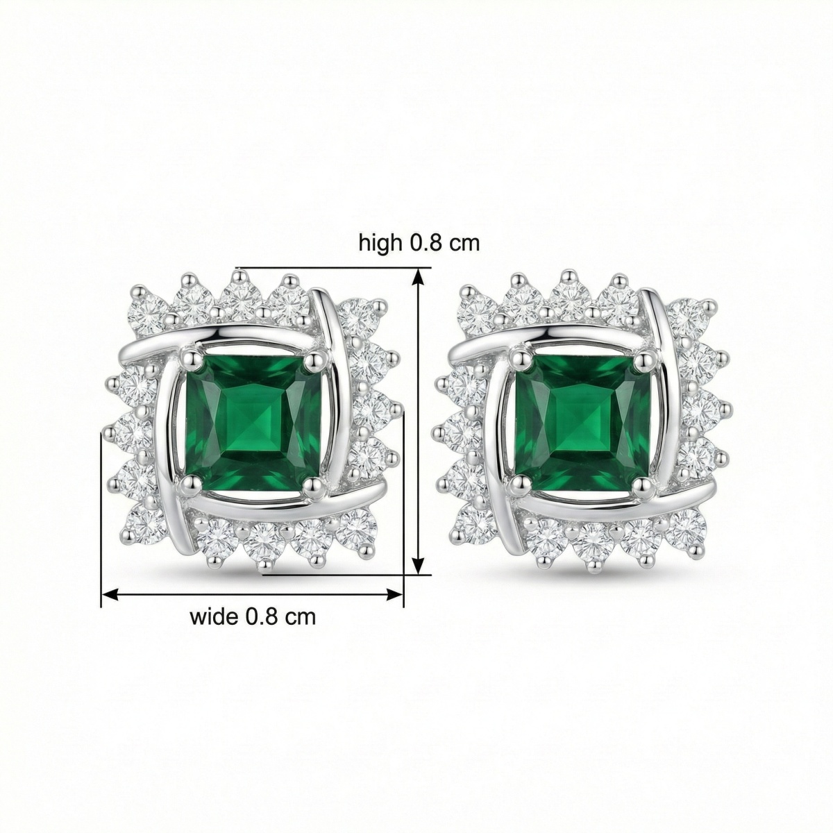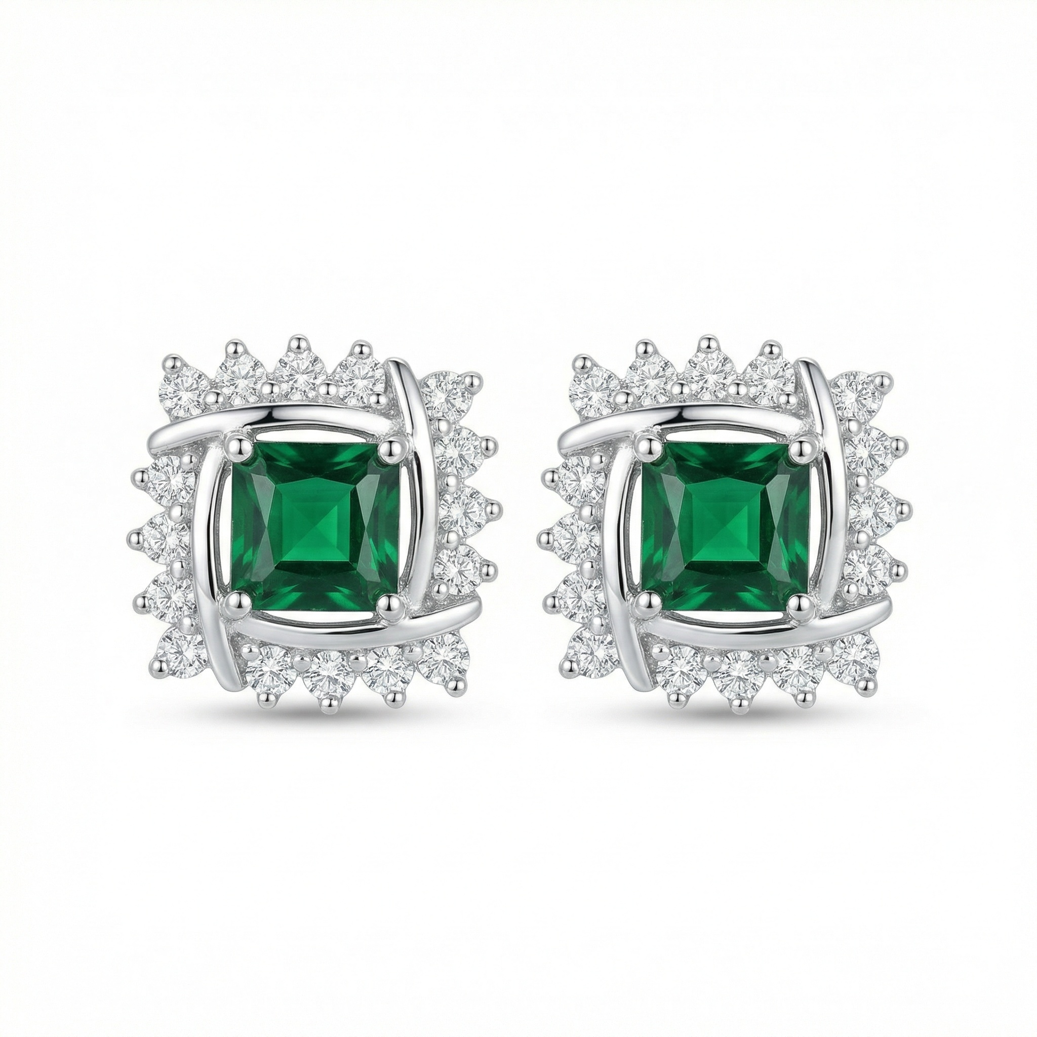 These stunning stud earrings feature a vibrant square-cut emerald-green gemstone at the center, radiating a deep and rich color. Each center stone is beautifully framed by an intricate, interlocking silver-toned metal design that adds a modern twist to a classic style. Surrounding the frame is a halo of sparkling round-cut white stones that enhance the overall brilliance and fire of the piece. Crafted with high-quality materials, these earrings offer a sophisticated and luxurious appeal, making them perfect for both formal events and everyday elegance. The secure backings ensure a comfortable and reliable fit for all-day wear. These earrings serve as an exquisite gift for birthdays, anniversaries, or special celebrations, adding a touch of timeless glamour and sophisticated charm to any jewelry collection. | Brand: jewelryodm