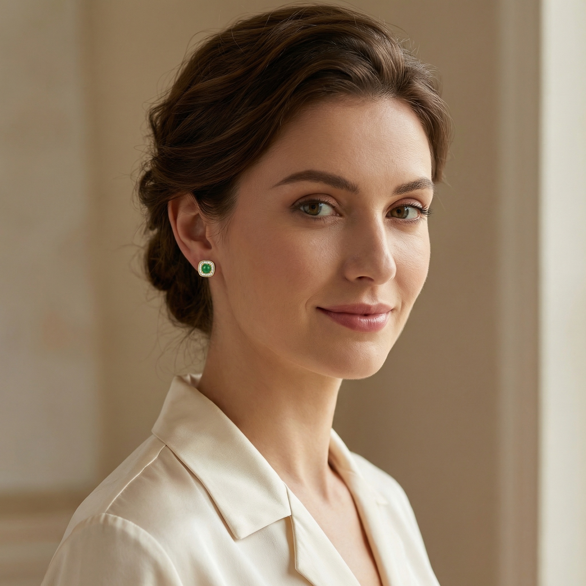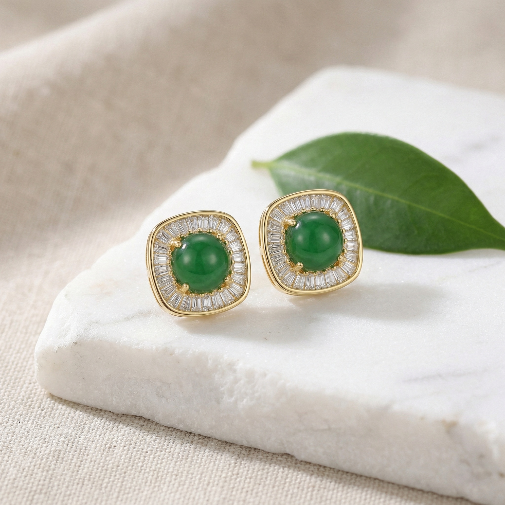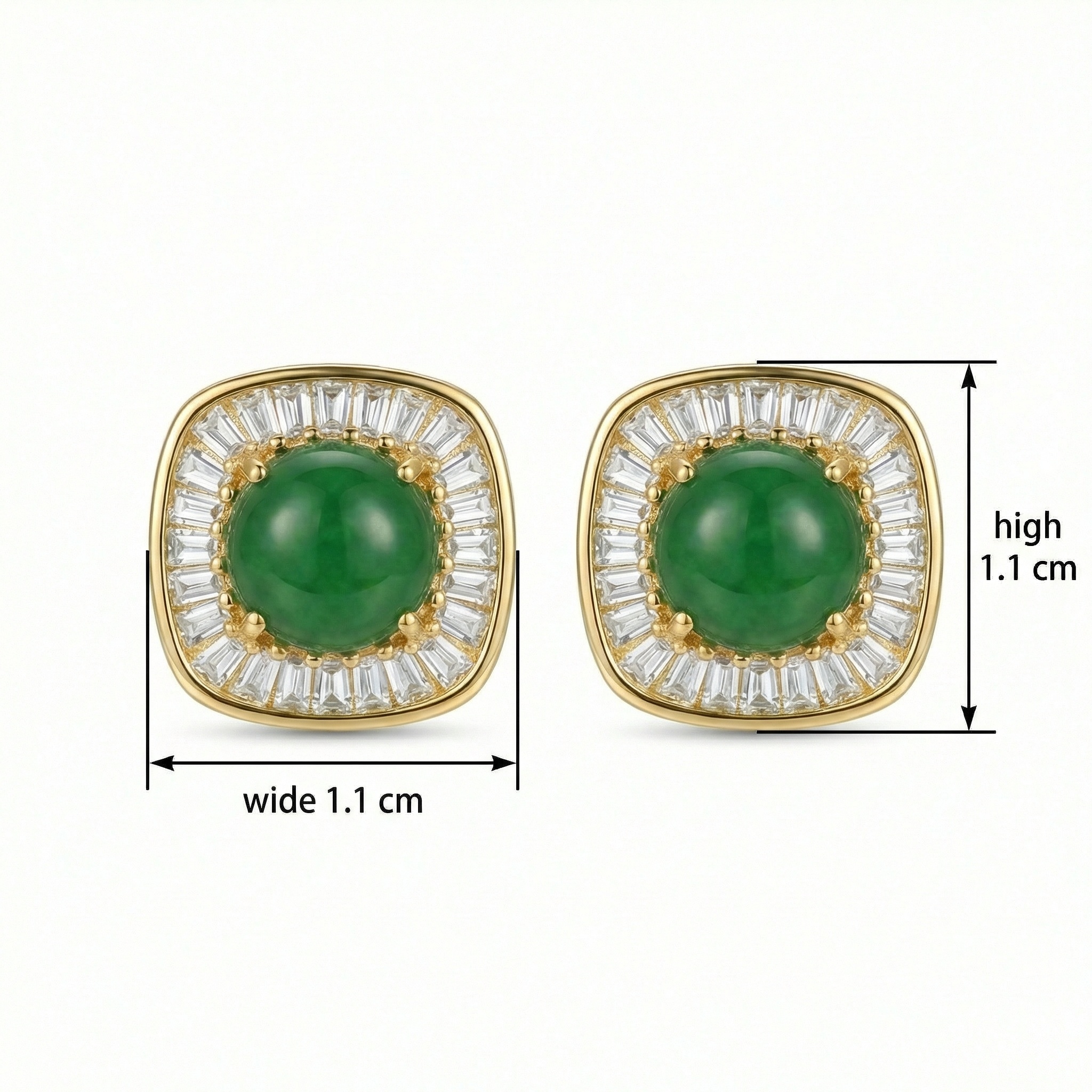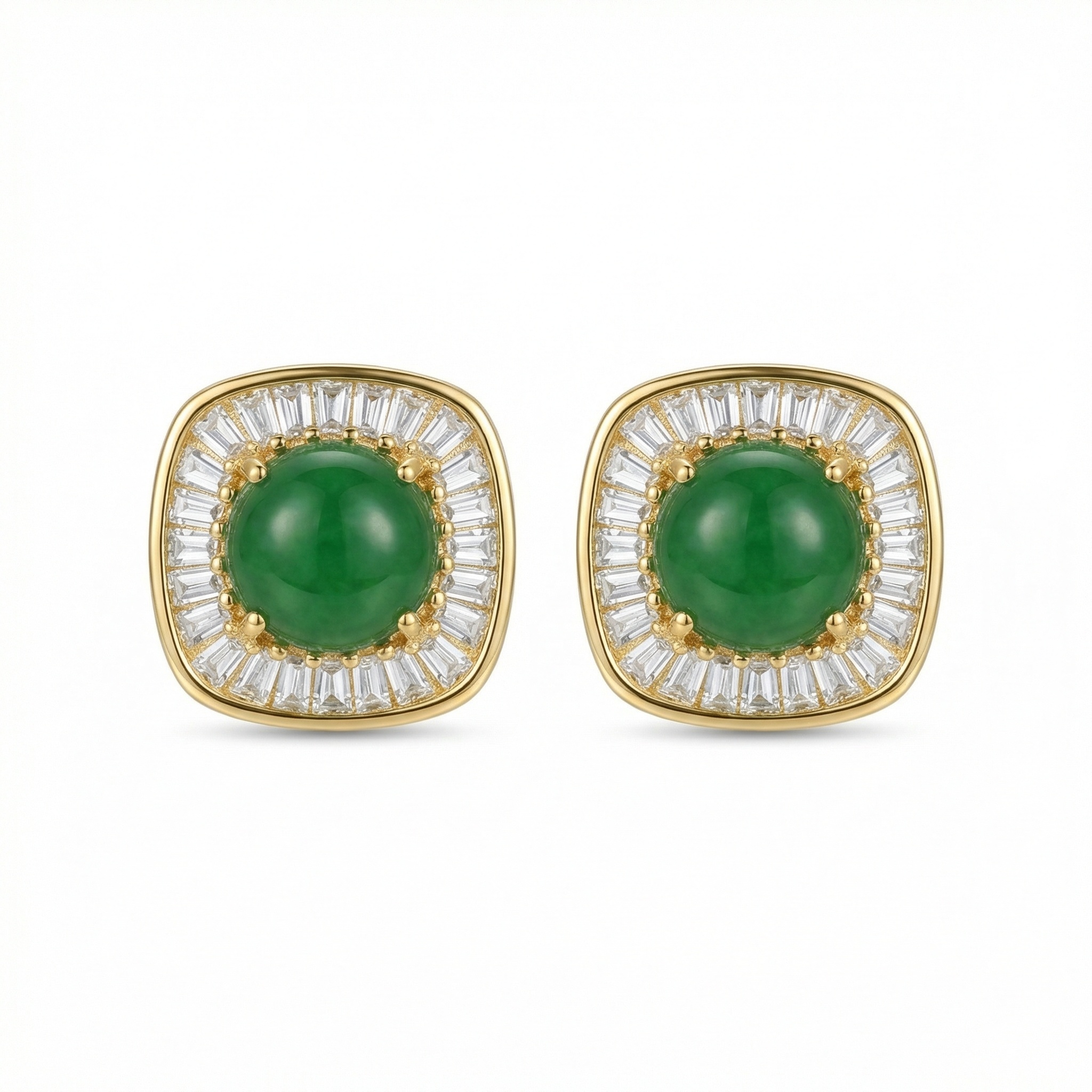 These exquisite stud earrings feature a captivating green cabochon at the center, radiating deep emerald hues. Encased in a polished square frame, the central gemstone is encircled by a brilliant halo of tapered baguette-cut white stones that create a stunning sunburst effect. The sharp contrast between the rich green center and the sparkling outer rim offers a sophisticated aesthetic suitable for both formal occasions and everyday luxury. Crafted with meticulous attention to detail, the warm-toned setting beautifully enhances the vibrant color of the gemstones, providing a timeless look that exudes elegance. Designed for those who appreciate classic jewelry with a modern twist, these earrings offer a refined and luxurious presence. Their secure backing ensures comfort and stability, making them a perfect addition to any fine jewelry collection. | Brand: jewelryodm