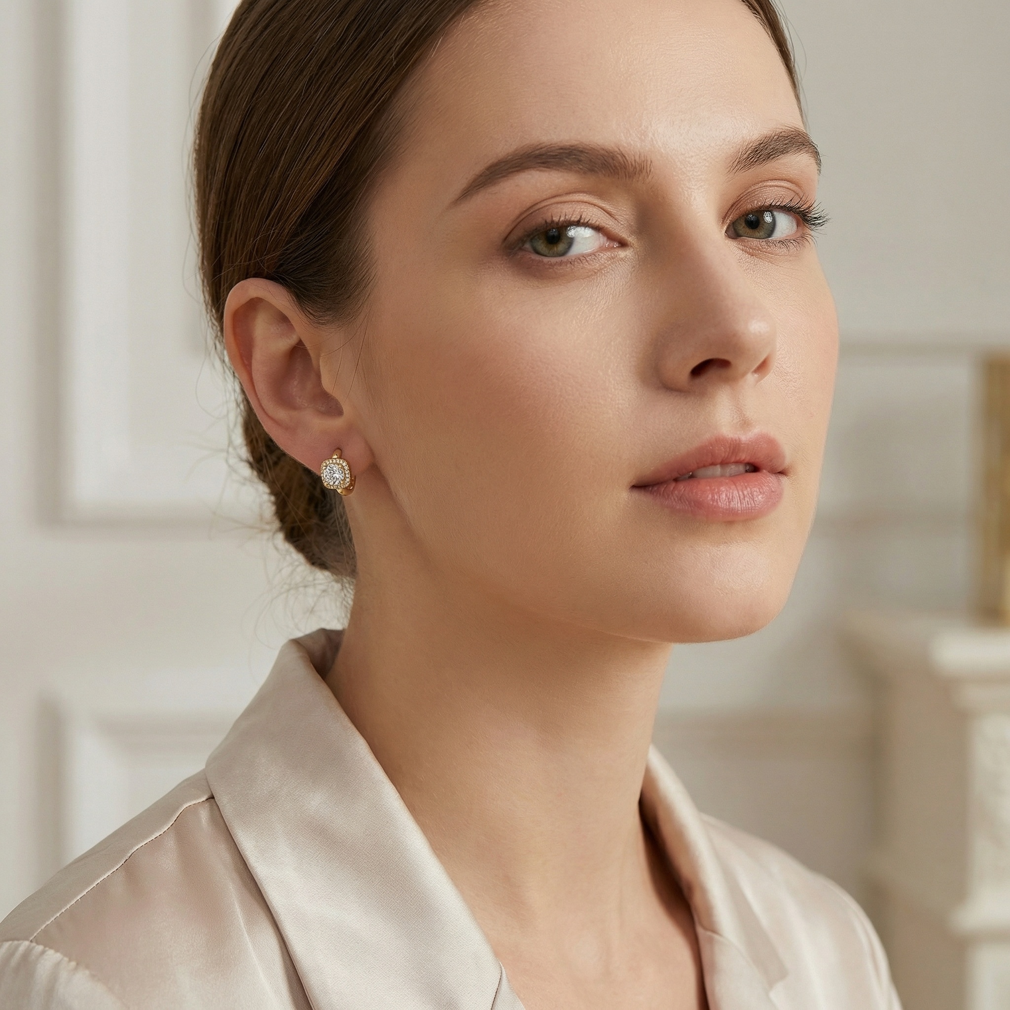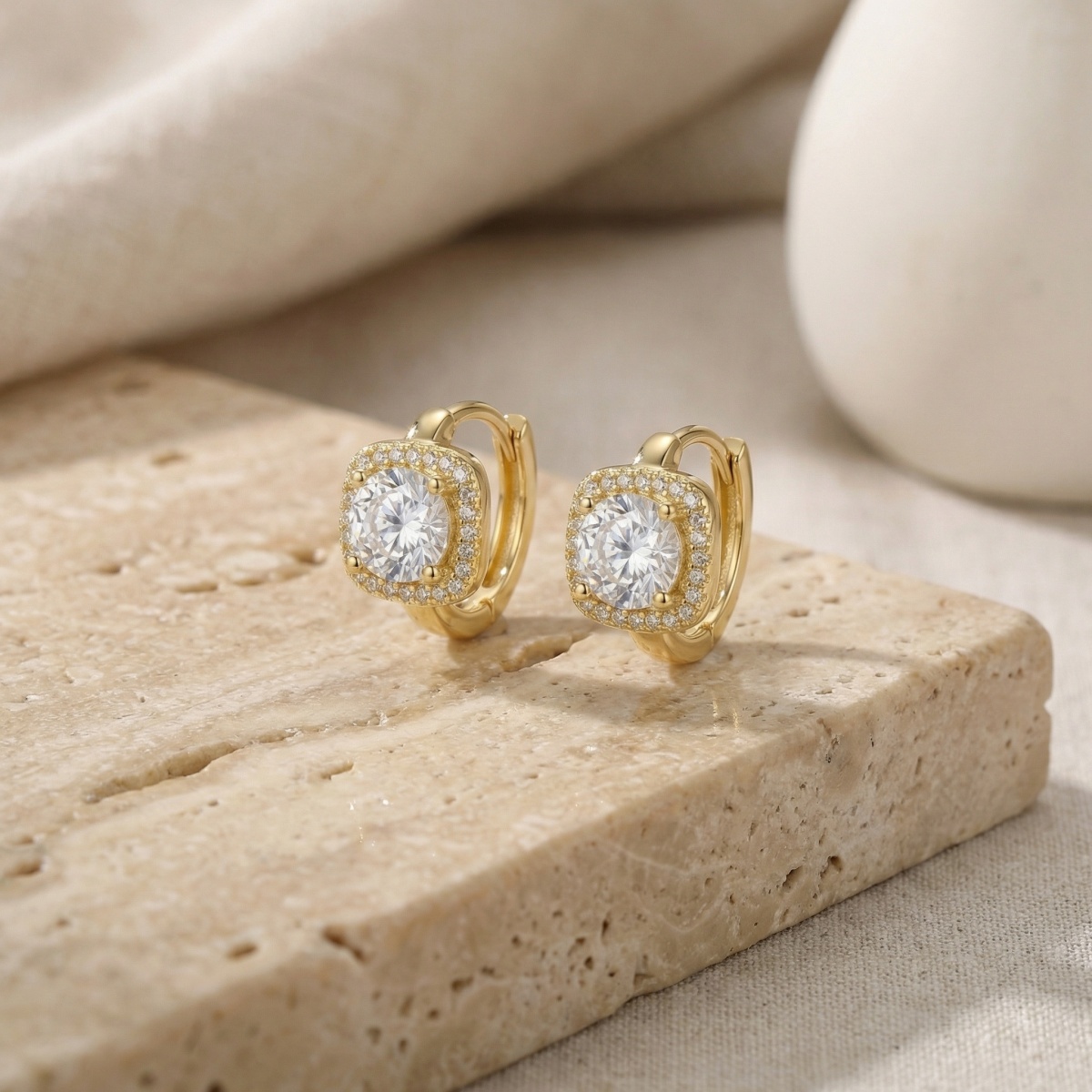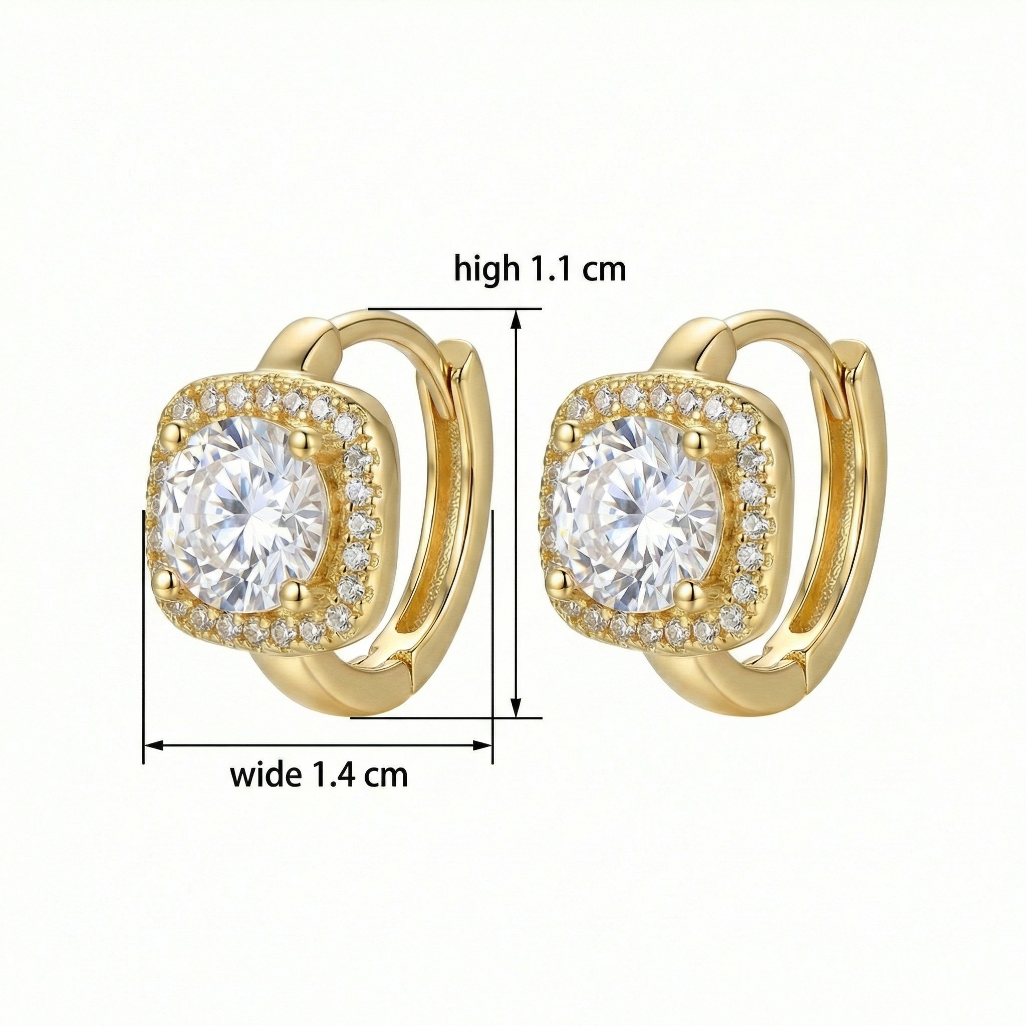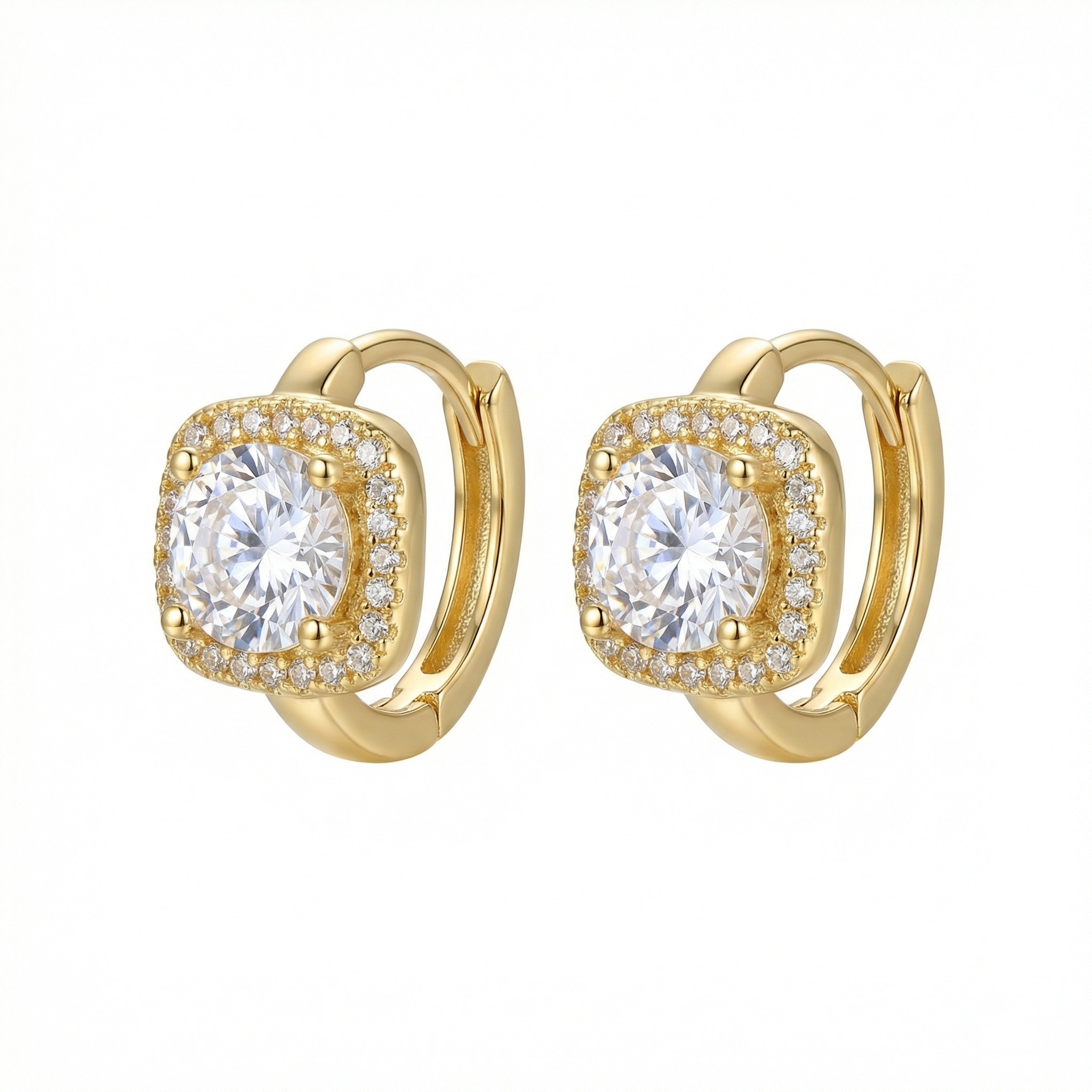 Elevate your jewelry collection with these exquisite huggie hoop earrings. Each piece showcases a brilliant round-cut center stone, meticulously cradled within a sophisticated square halo of shimmering pavé-set accents. The warm metallic finish adds a touch of luxury, making them perfect for both day-to-day wear and glamorous evening events. Designed with a secure clasp for comfort and ease, these earrings offer a seamless blend of classic charm and modern elegance. Whether you are treating yourself or searching for the perfect gift for a loved one, these radiant hoops are sure to impress. Their versatile design ensures they complement any outfit, providing a subtle yet striking glow. Crafted with attention to detail, these earrings reflect light from every angle, capturing the essence of refined beauty and enduring style. | Brand: jewelryodm