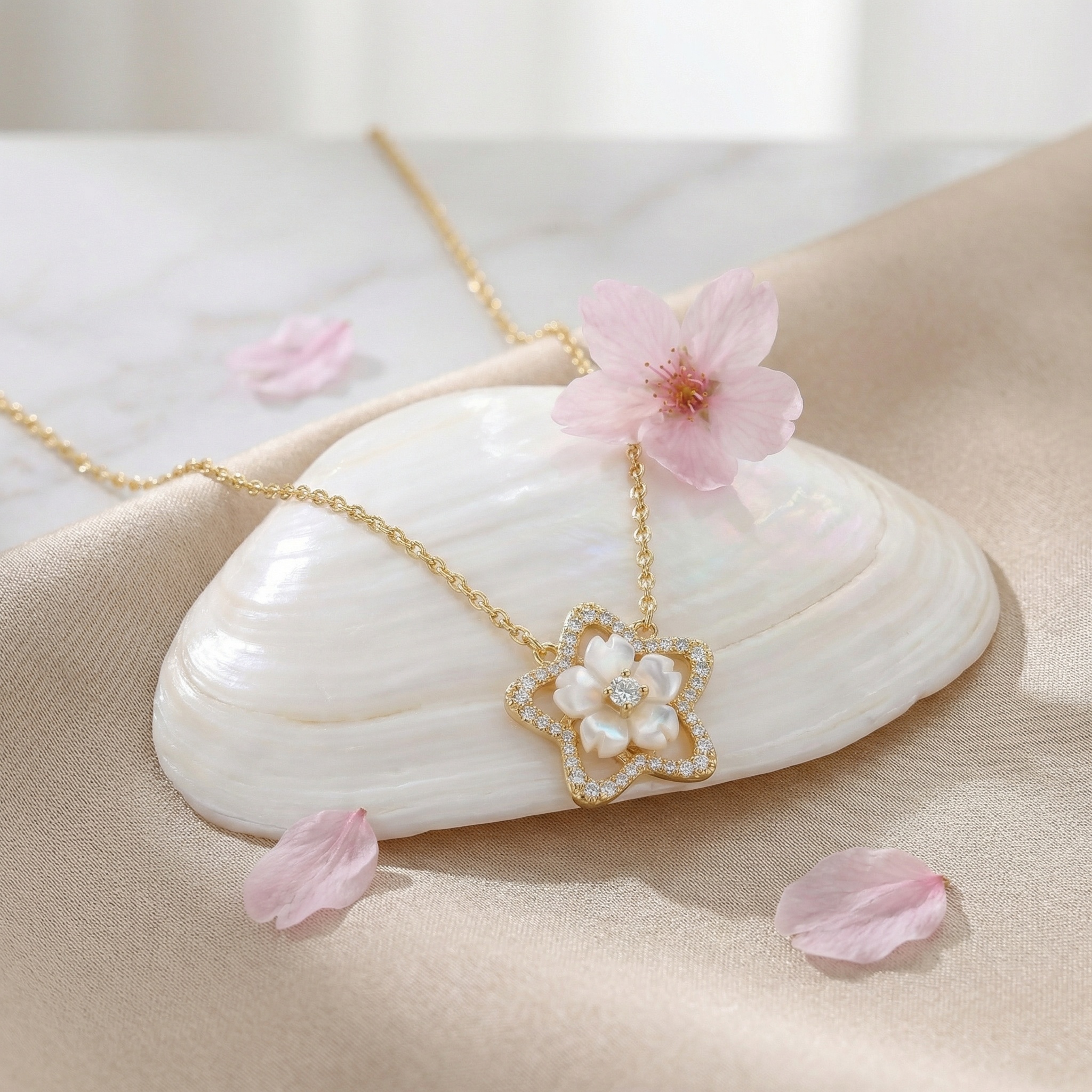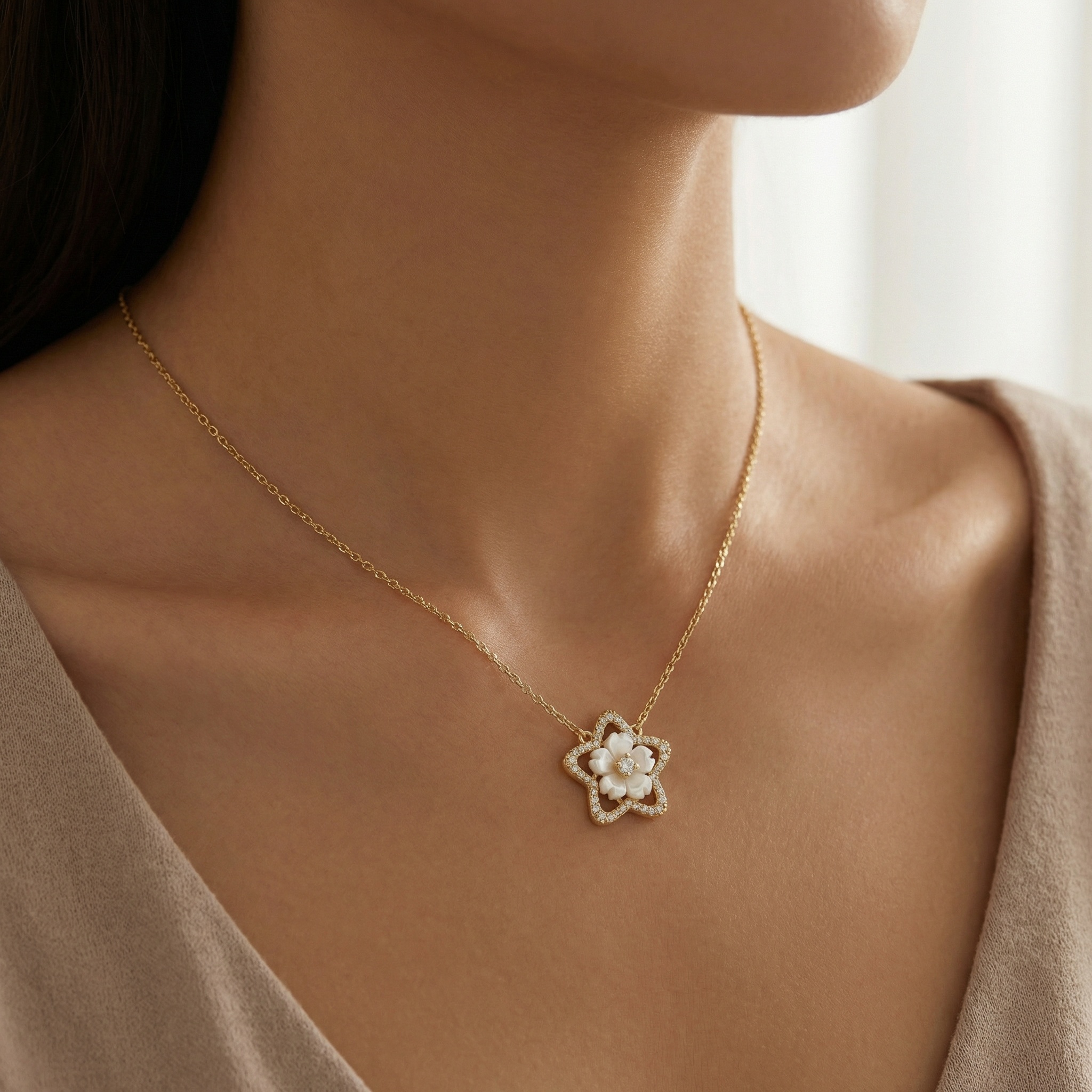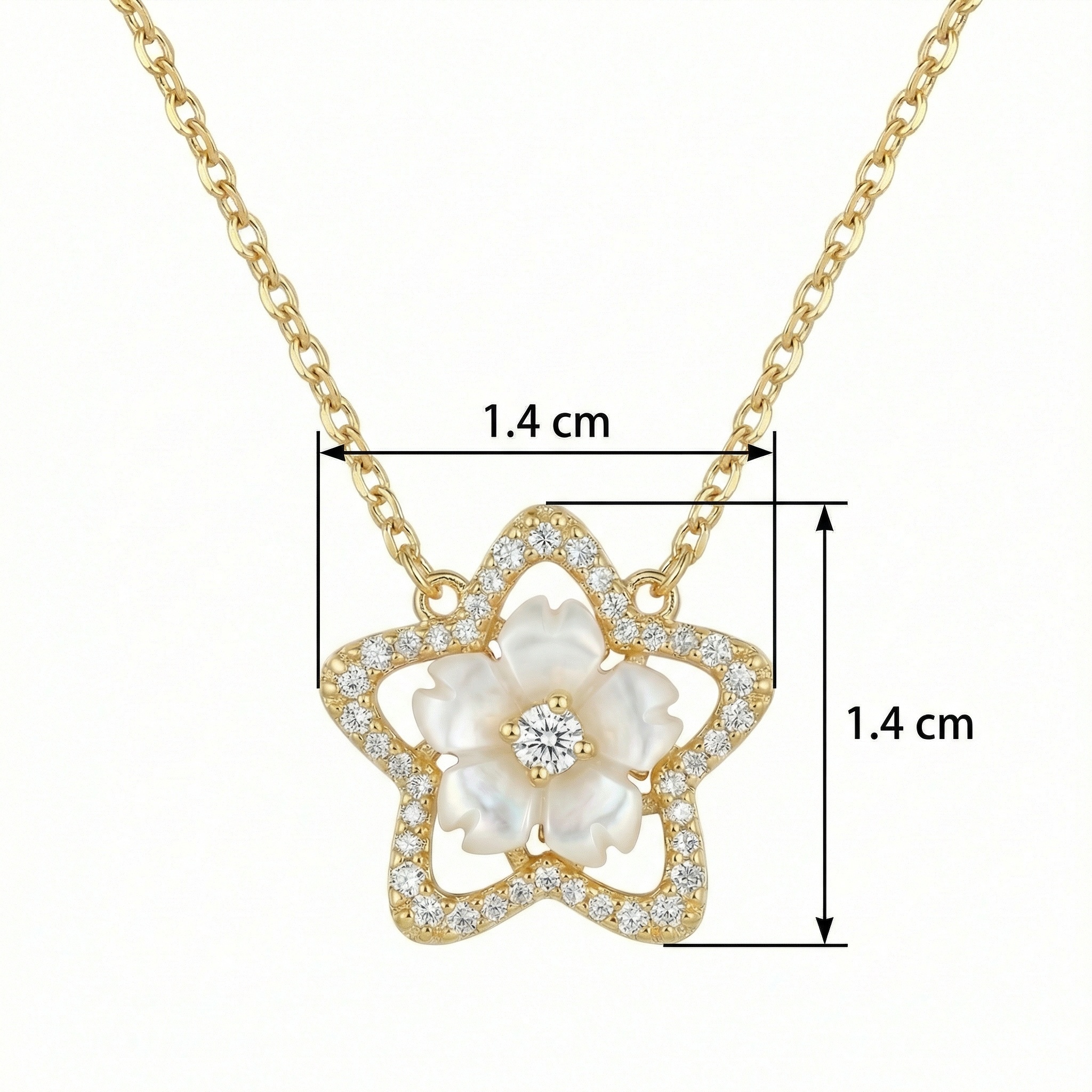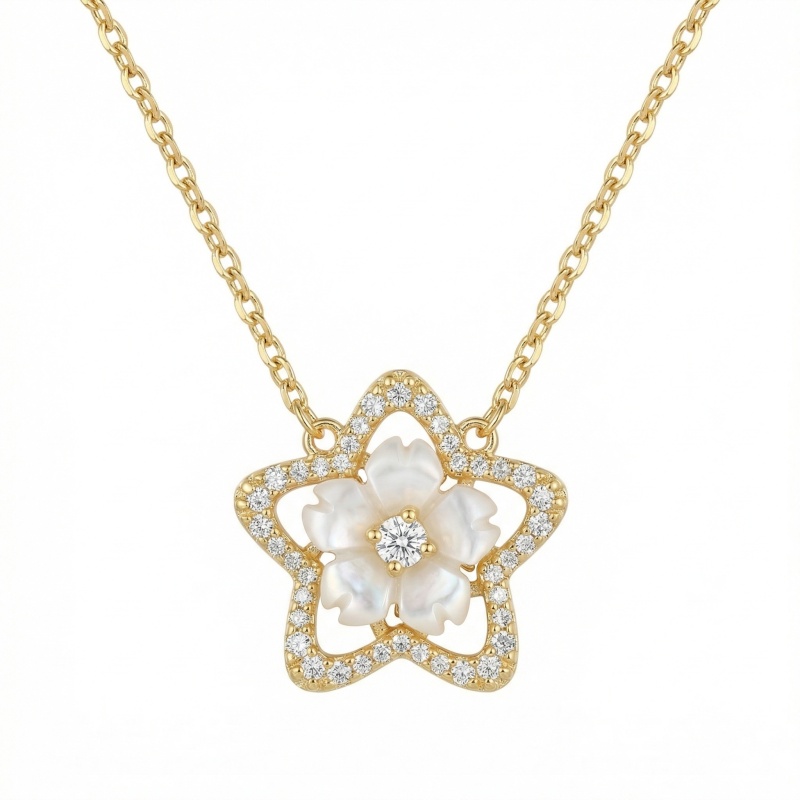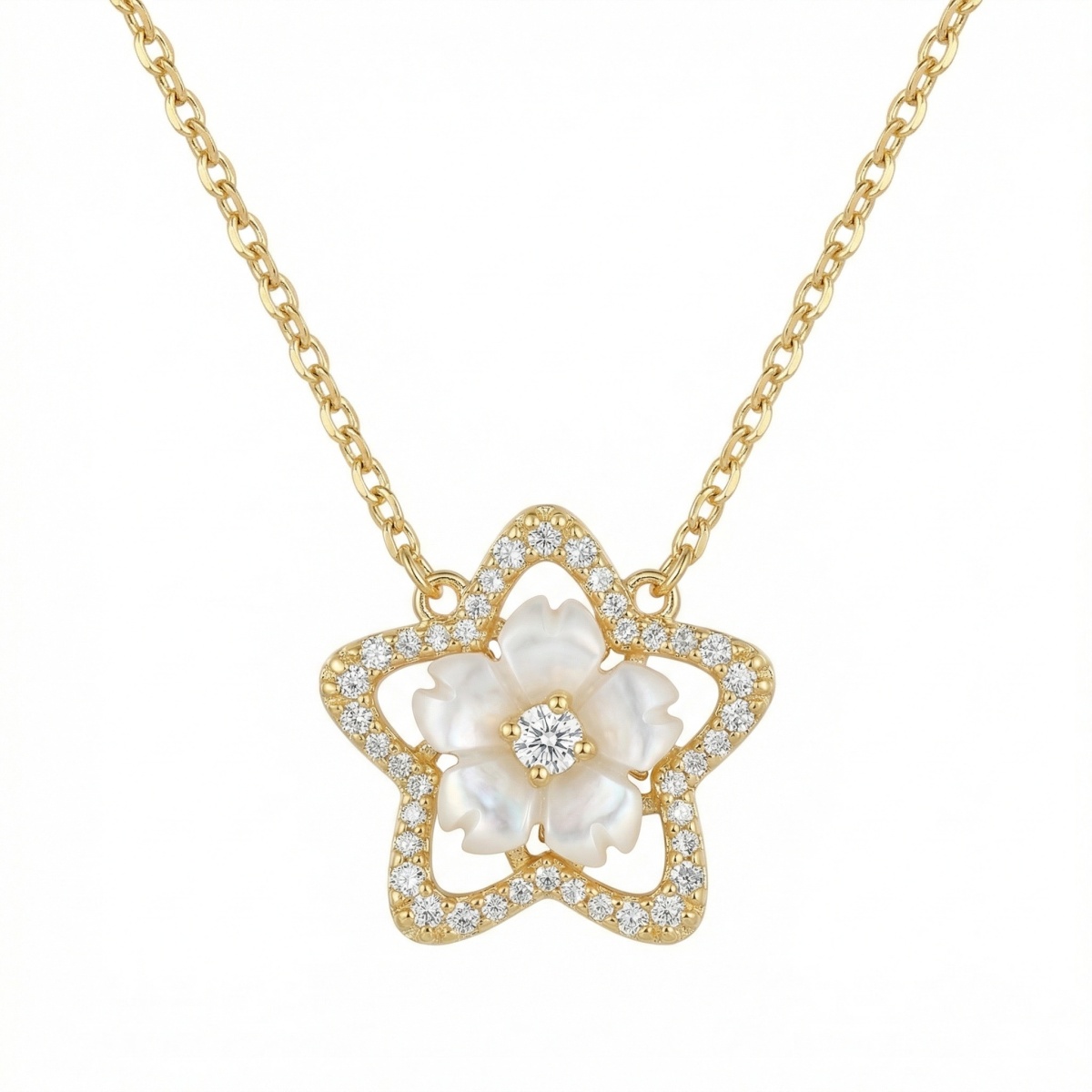 This exquisite necklace features a stunning star-shaped pendant that beautifully blends celestial and floral motifs. At the heart of the design lies a delicately carved mother-of-pearl flower, radiating a soft, iridescent glow. A brilliant round-cut stone sits at the center of the blossom, adding a touch of sparkle. The flower is encased within a polished metallic star frame, which is meticulously pavé-set with a shimmering array of round-cut accents. The warm metallic finish complements the pearlescent tones of the flower, creating a sophisticated and timeless look. Hanging from a delicate link chain, this piece is perfect for adding a touch of elegance to any outfit. Its intricate craftsmanship and unique design make it a versatile accessory for both daytime wear and special evening occasions. | Brand: jewelryodm