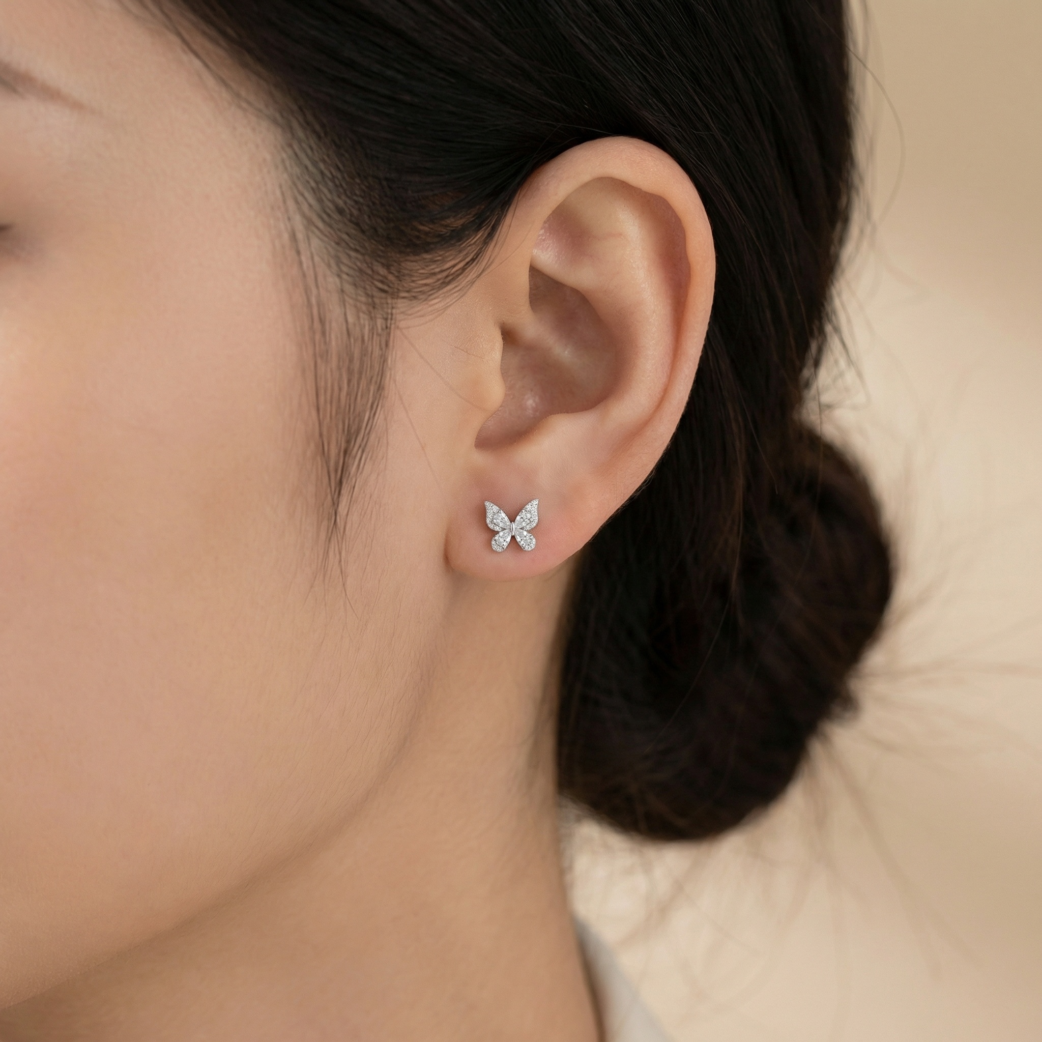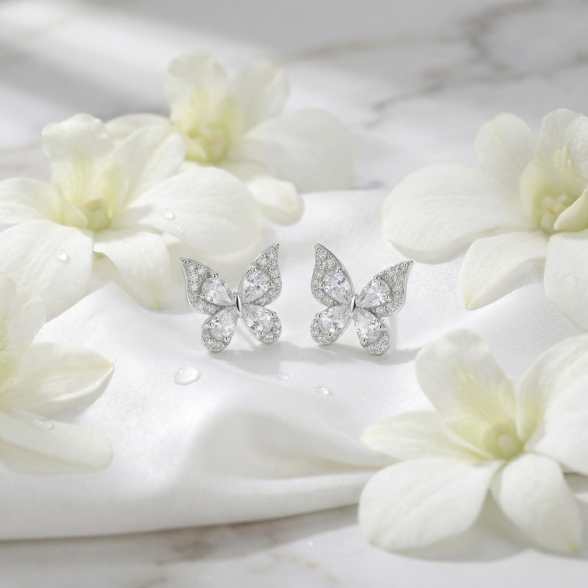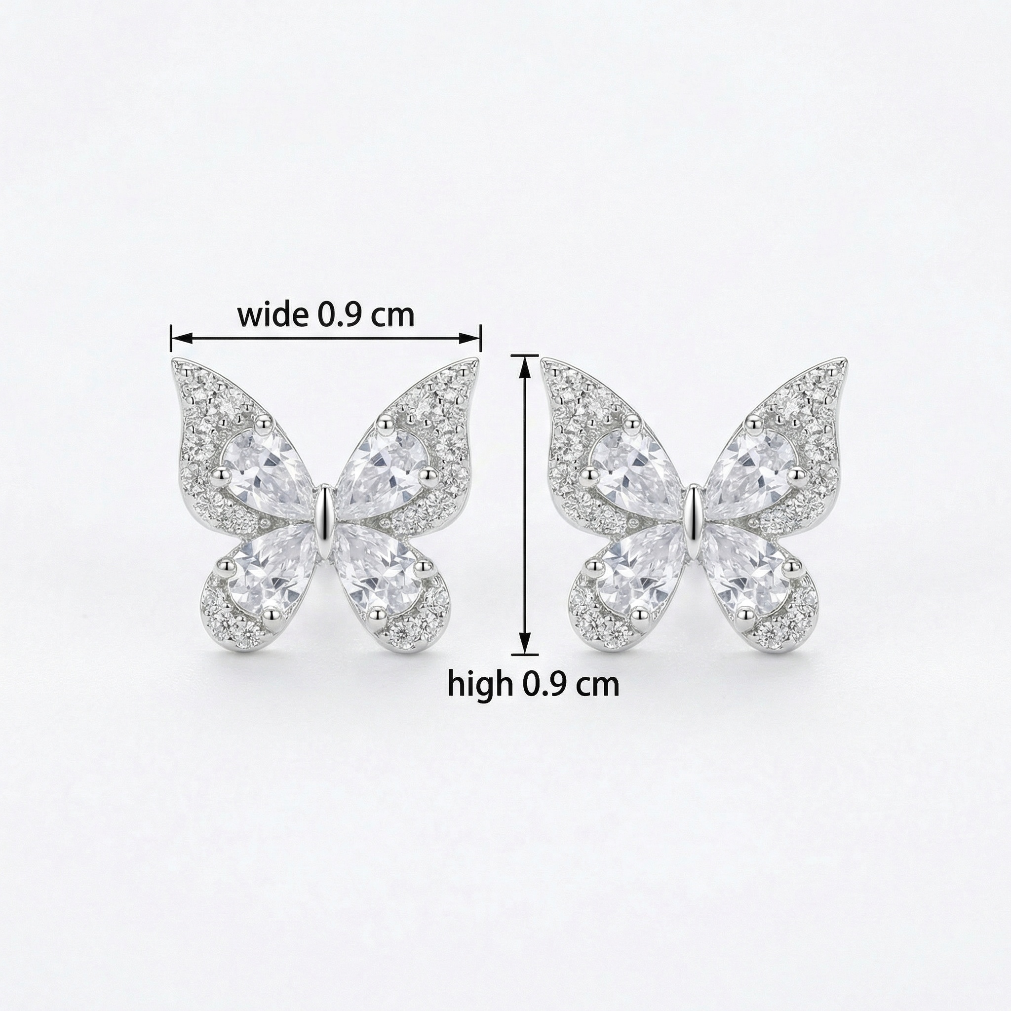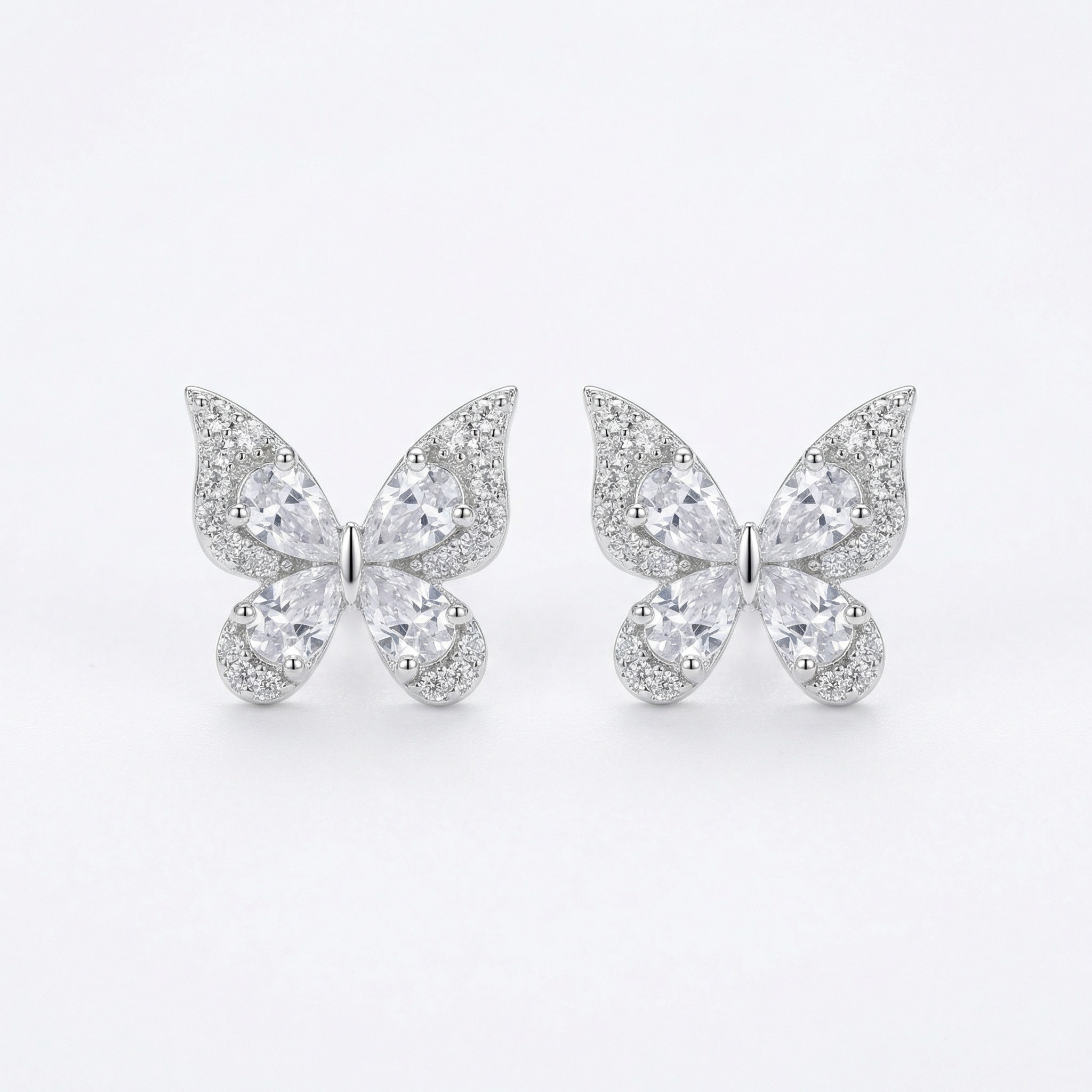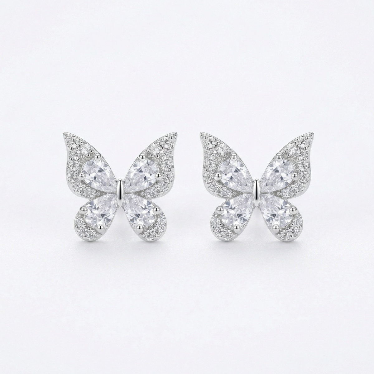 These exquisite butterfly stud earrings are a beautiful blend of nature-inspired design and timeless elegance. Crafted with high-quality silver-toned metal, each earring features a stunning butterfly silhouette. The inner wings are formed by four brilliant pear-shaped cubic zirconia stones, arranged to capture and reflect light from every angle. Complementing these central stones, the outer edges of the wings are meticulously pavé-set with shimmering round-cut crystals, adding a touch of sophisticated sparkle. These delicate yet eye-catching studs offer a whimsical charm, making them the perfect accessory for both everyday wear and special occasions. Lightweight and comfortable, they serve as a thoughtful gift for nature lovers or a glamorous addition to any jewelry collection. Their radiant finish and intricate craftsmanship ensure they will be a cherished piece for years to come. | Brand: jewelryodm