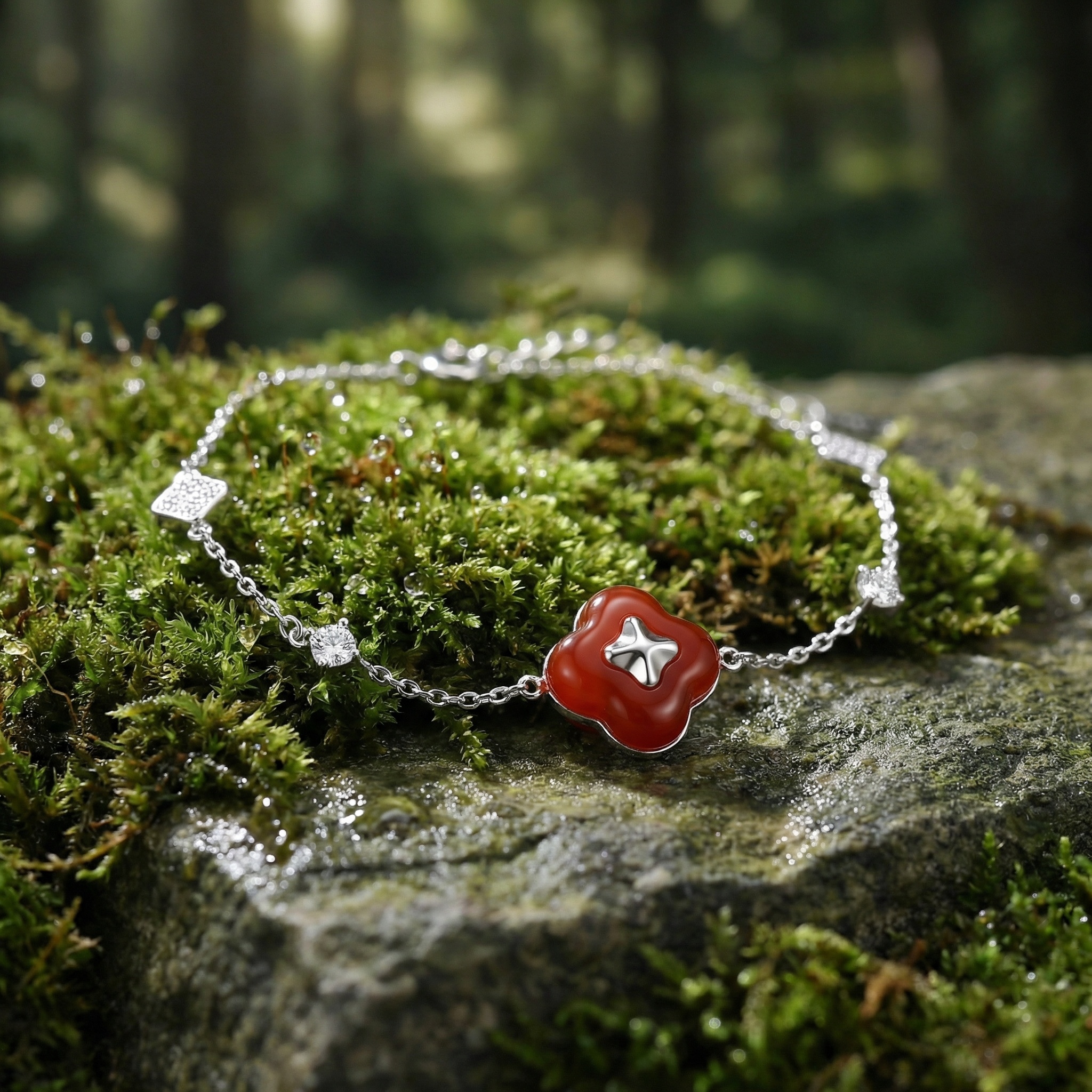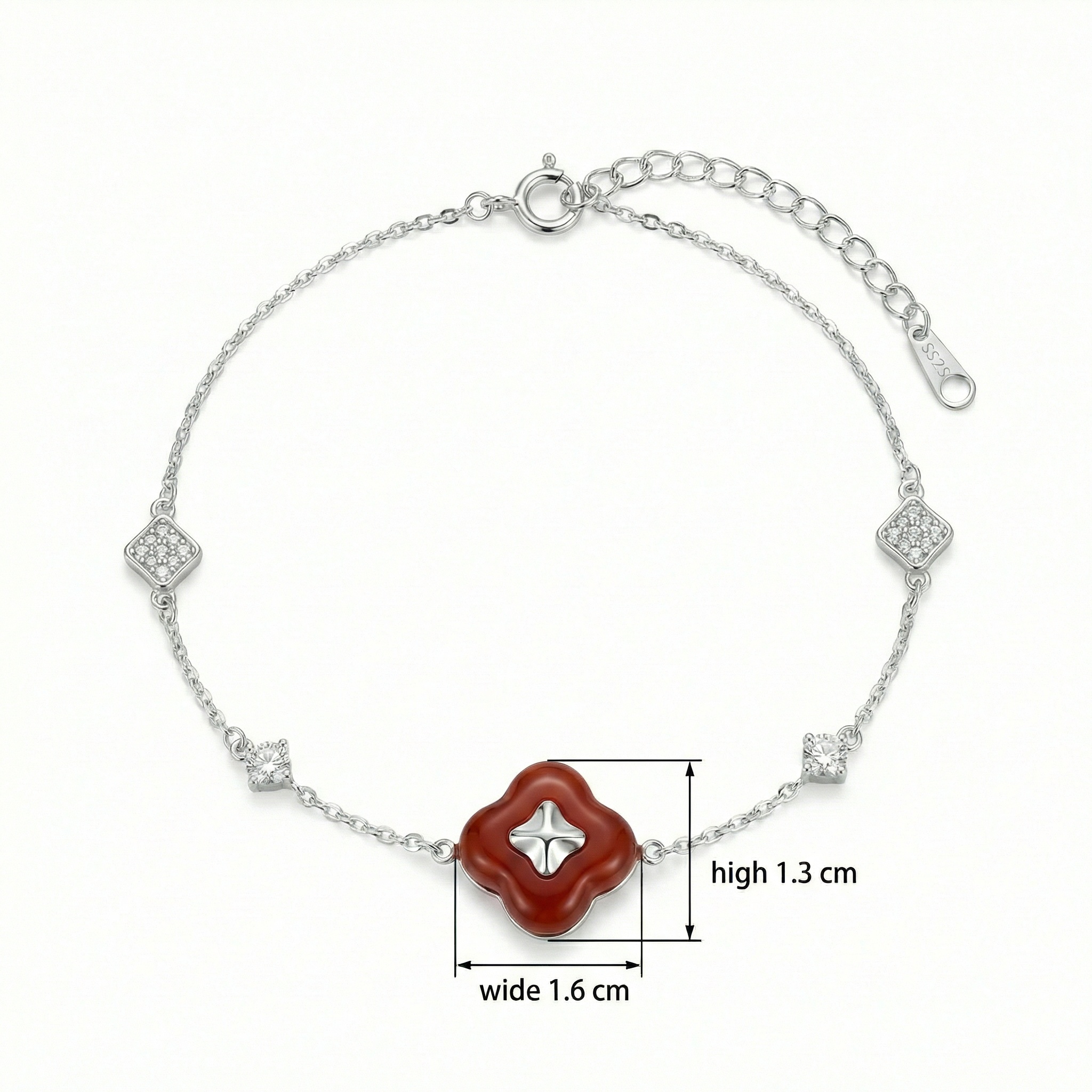 This exquisite S925 sterling silver bracelet features a striking red clover-shaped centerpiece, accented with a polished silver four-point star. The delicate link chain is further enhanced by two diamond-shaped charms encrusted with shimmering cubic zirconia and two brilliant-cut clear stones that catch the light beautifully. Designed for versatility and elegance, it includes an adjustable extender chain for a perfect fit and a secure spring-ring clasp. This sophisticated piece combines nature-inspired symbolism with a modern, sparkling aesthetic, making it an ideal accessory for both daily wear and special occasions. It serves as a perfect gift for those who appreciate timeless jewelry with a vibrant pop of color. | Brand: jewelryodm
