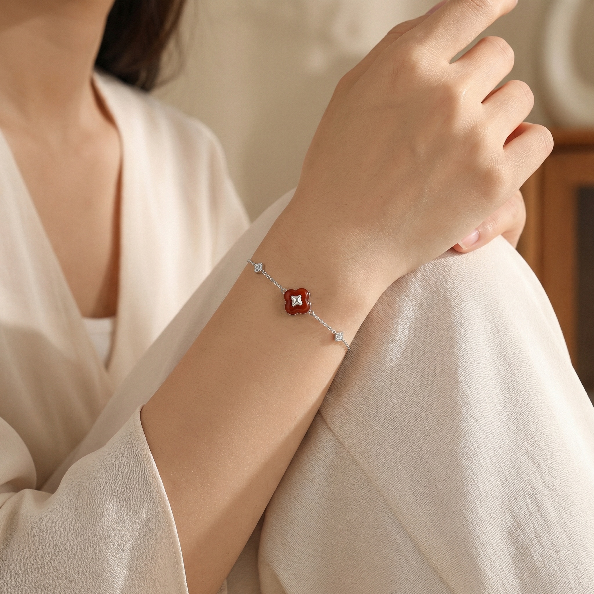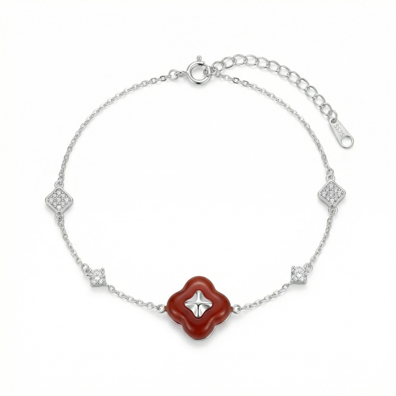 925 Sterling Silver Elegant Sterling Silver Clover Bracelet with Red Agate and Shimmering Zirconia Accents