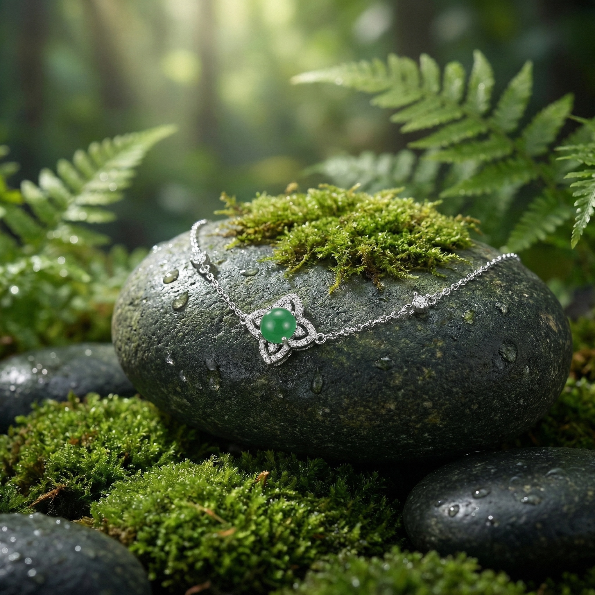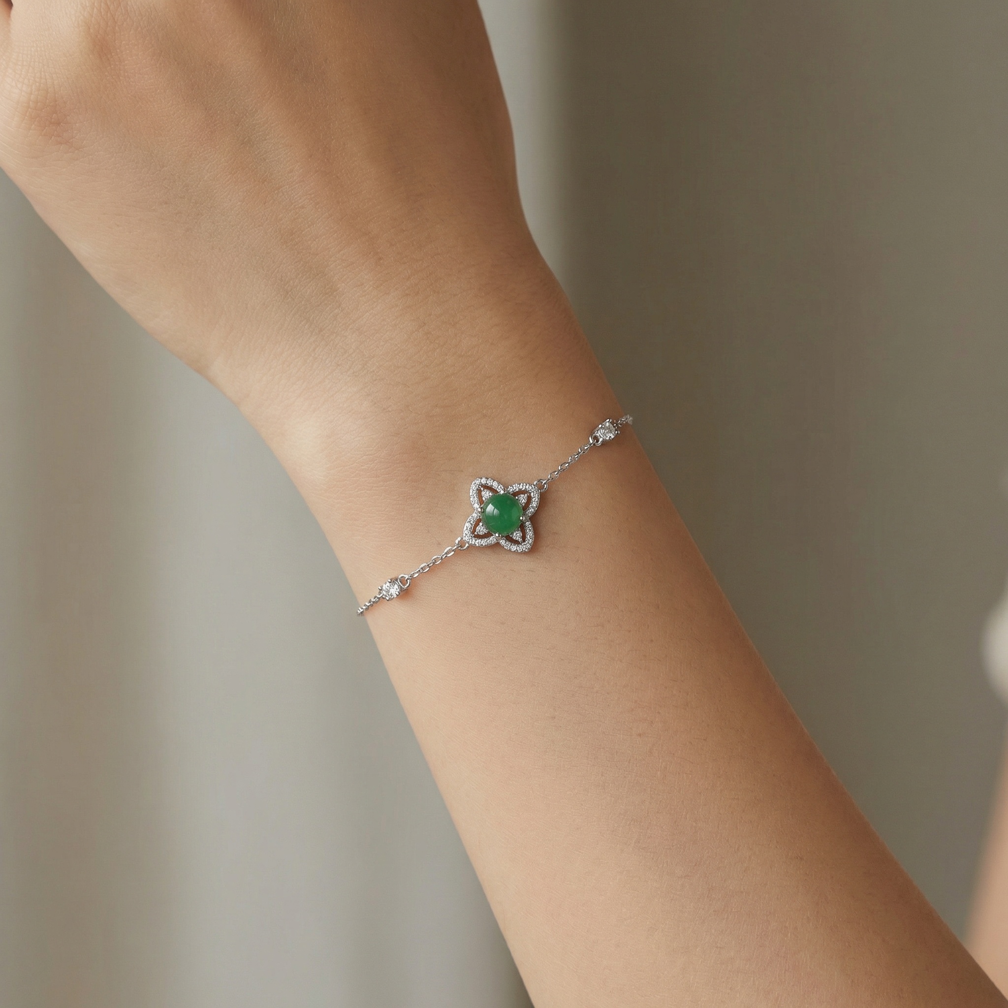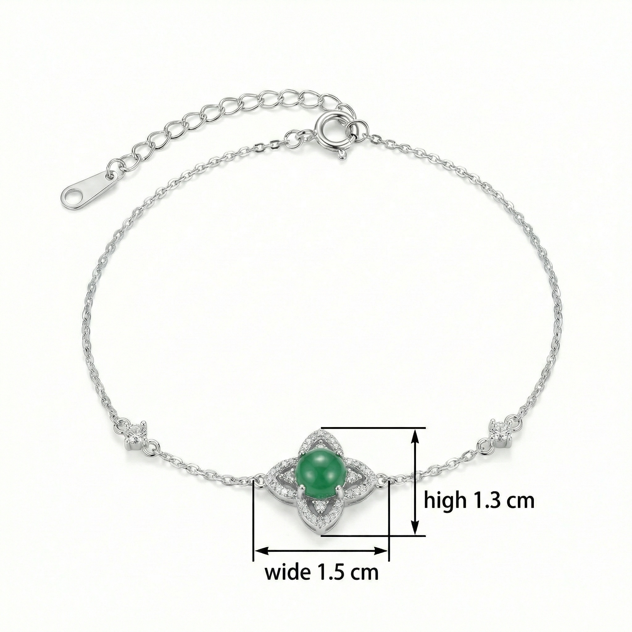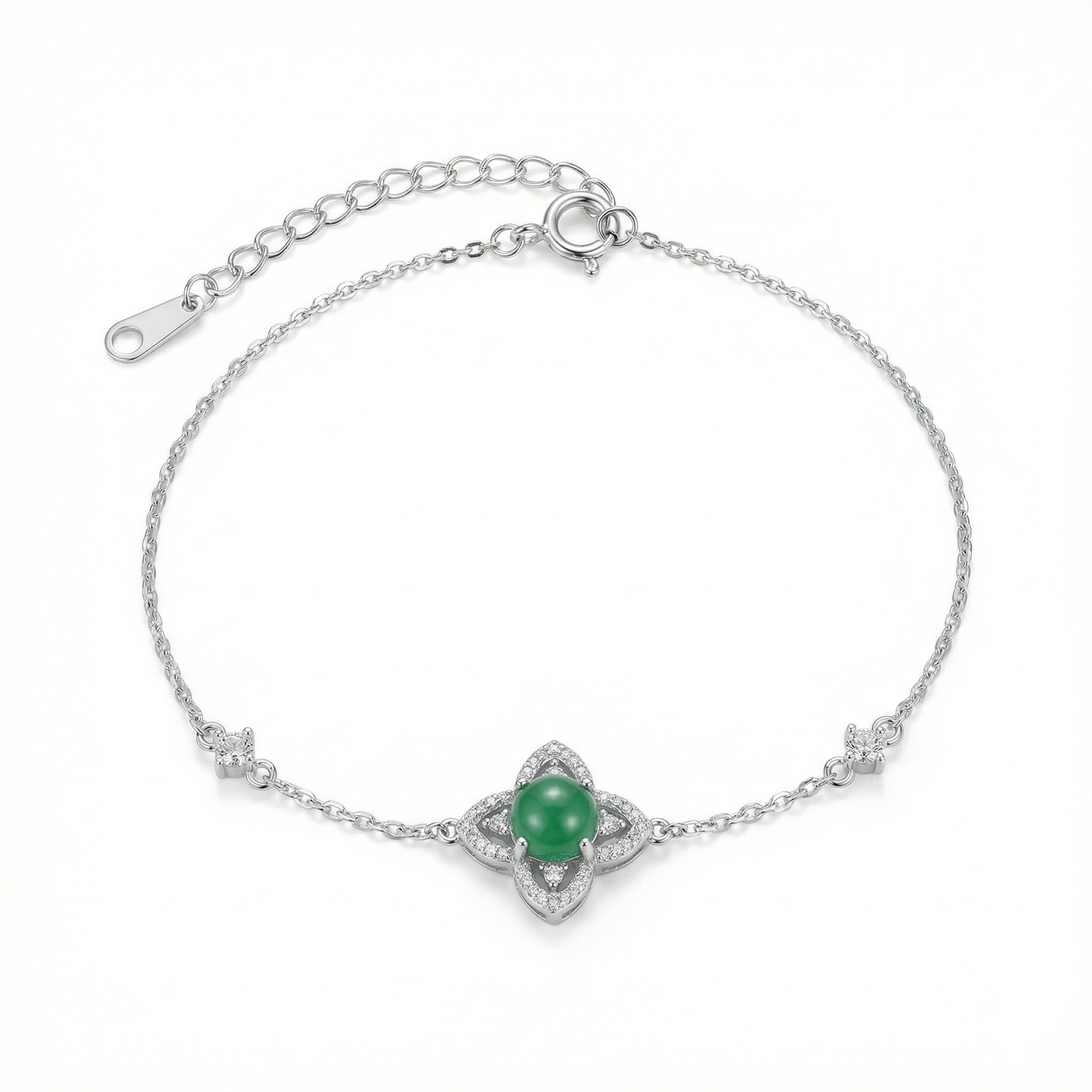 This exquisite bracelet features a delicate silver chain centered by a stunning floral-inspired charm. At the heart of the four-petal design sits a smooth, vibrant green cabochon gemstone, reminiscent of classic jade. The surrounding petals are meticulously embellished with shimmering pavé-set crystals, providing a brilliant contrast to the rich green center. Two additional small sparkling stations are placed along the chain to enhance its balanced and elegant aesthetic. Designed for both style and comfort, the bracelet includes an adjustable extender chain and a secure spring-ring clasp, allowing for a personalized fit. Whether worn as a daily accessory or for a special evening out, this piece offers a timeless blend of natural beauty and sophisticated craftsmanship, making it a perfect gift for any jewelry lover. | Brand: jewelryodm