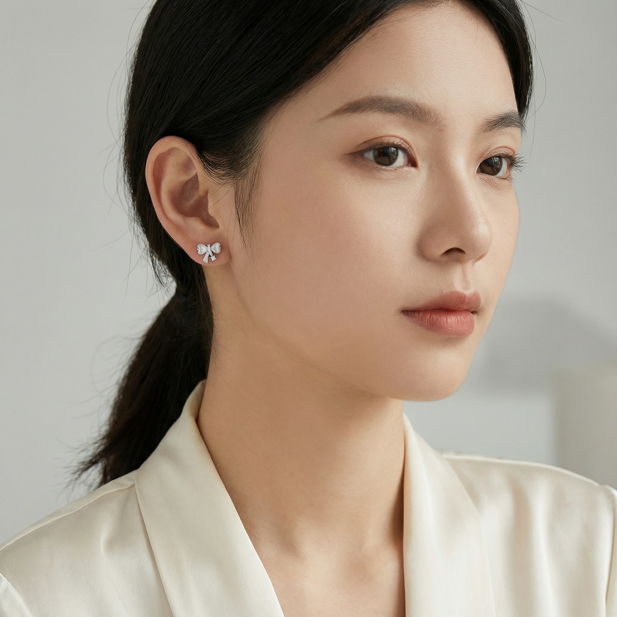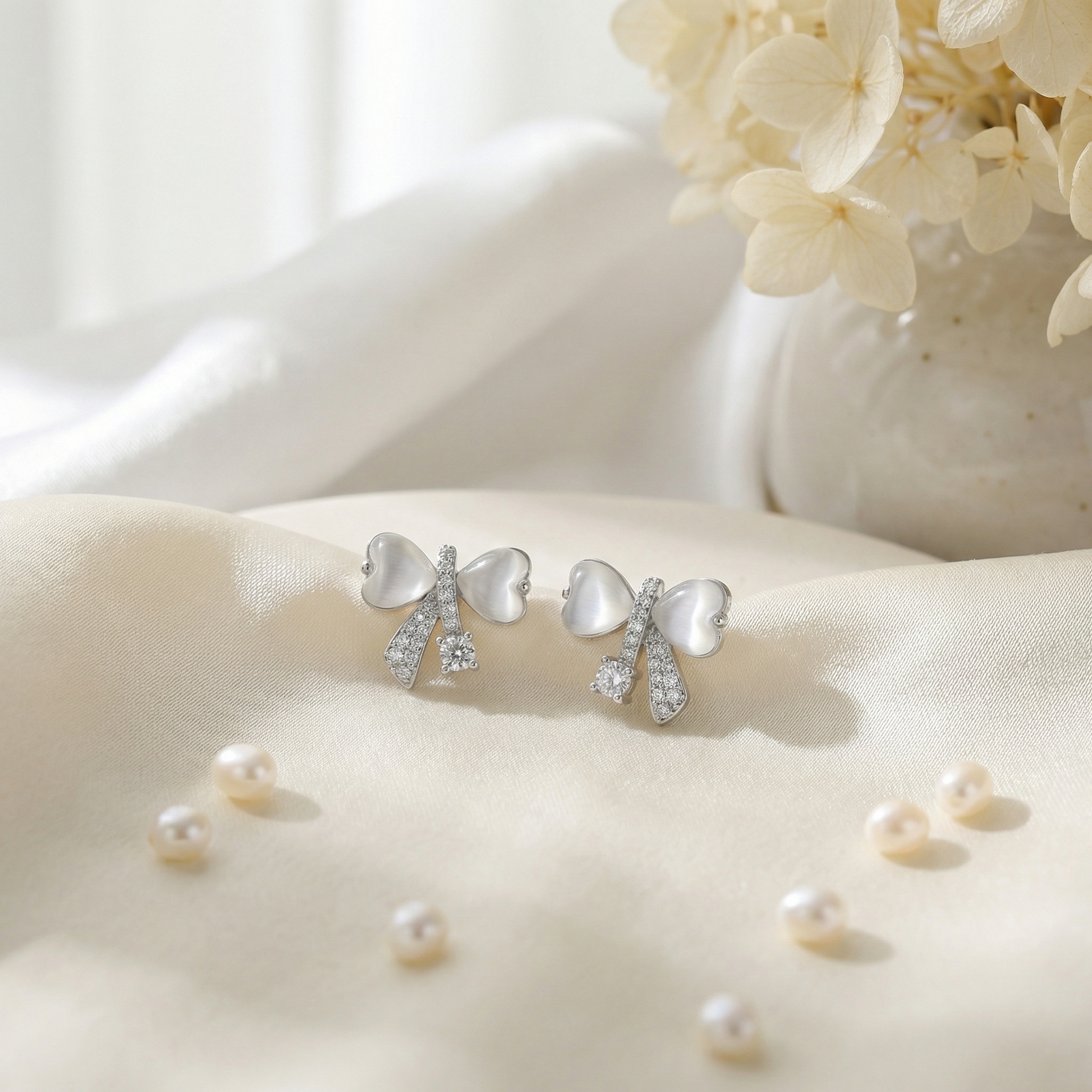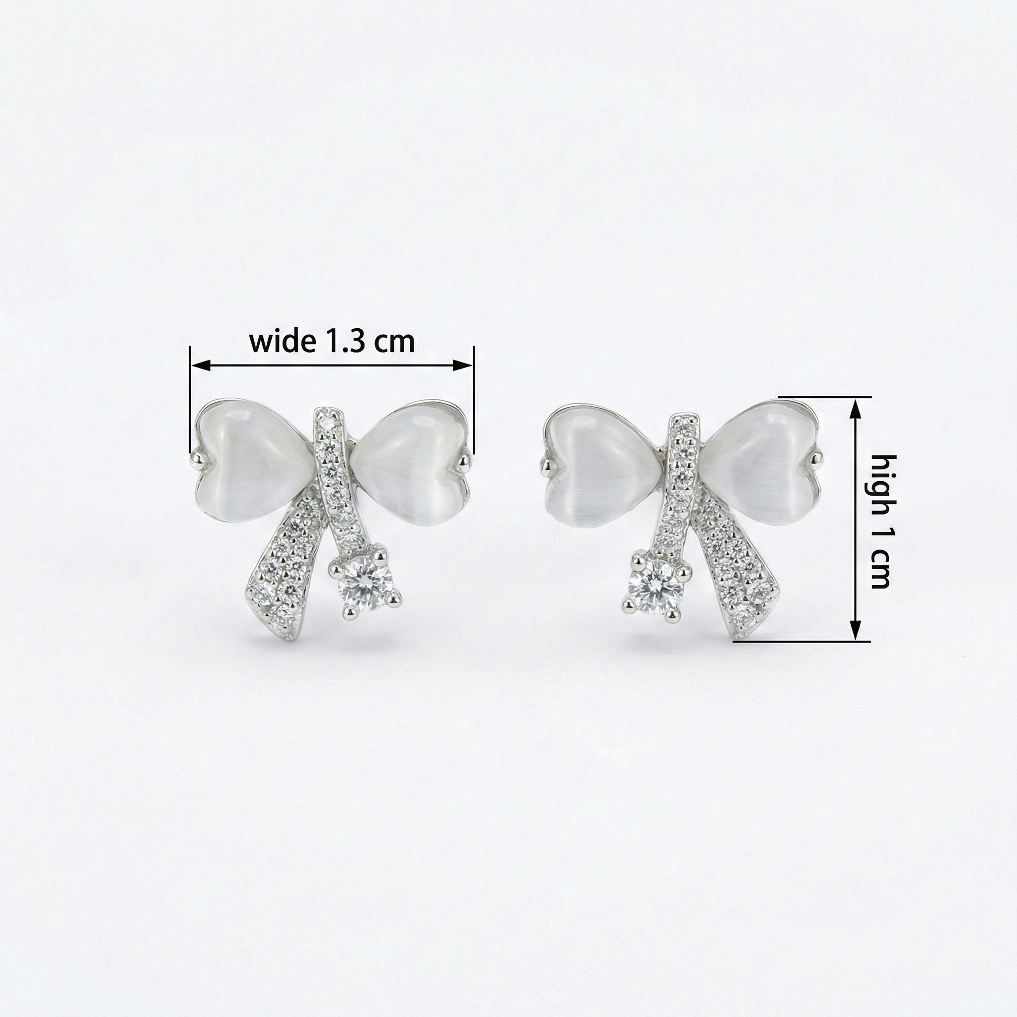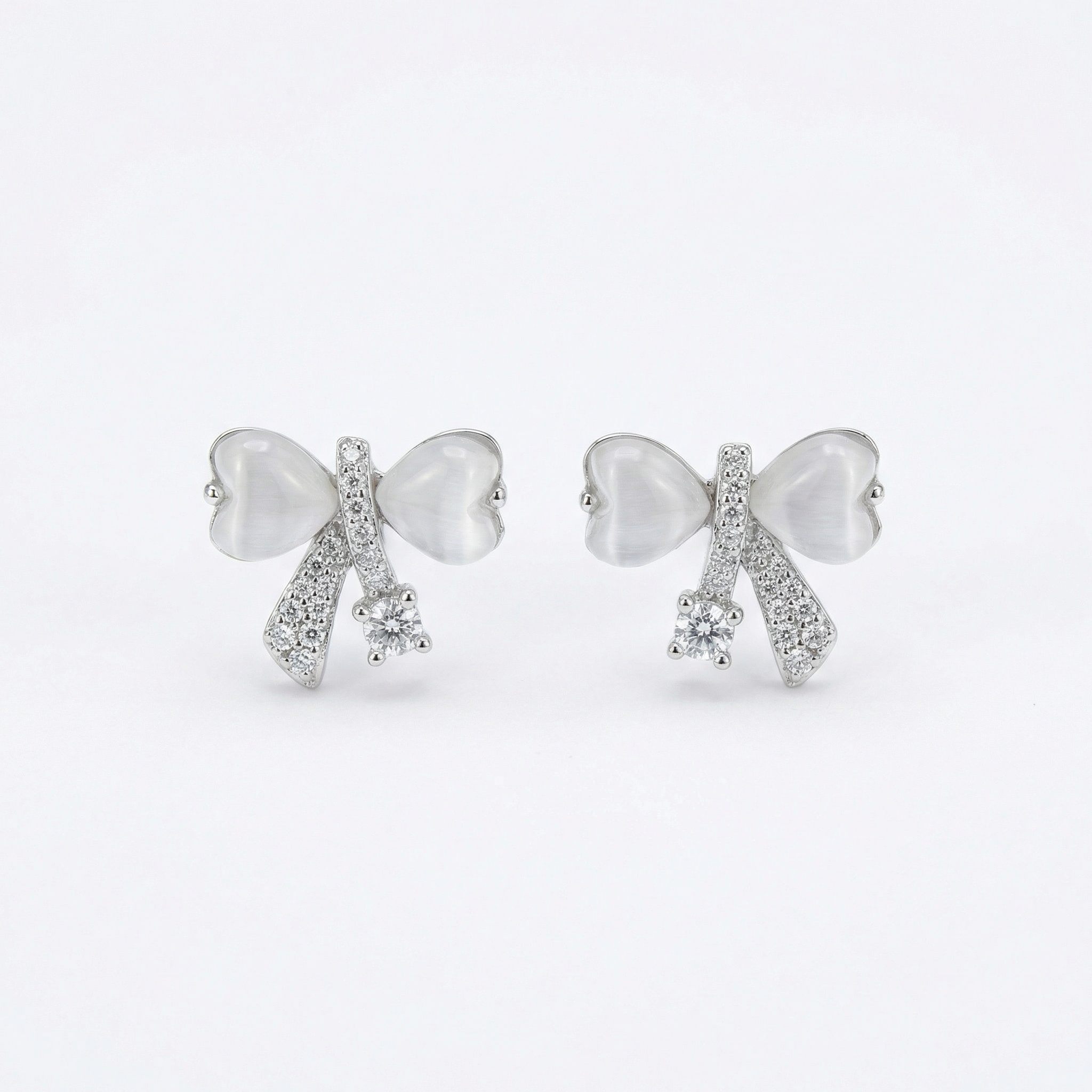 These charming stud earrings feature a delicate bow design, blending classic elegance with romantic whimsy. Each earring showcases two lustrous, heart-shaped white cat's eye stones that form the loops of the bow, offering a soft, pearlescent glow. The center knot and flowing ribbons are intricately adorned with shimmering pavé-set crystals for added brilliance. A single, larger round-cut cubic zirconia is set at the base, catching the light beautifully with every movement. Crafted with a polished silver-tone finish, these earrings are perfect for adding a feminine and sophisticated touch to any outfit. Whether for a special occasion or everyday wear, they make an enchanting accessory or a thoughtful gift for a loved one. | Brand: jewelryodm