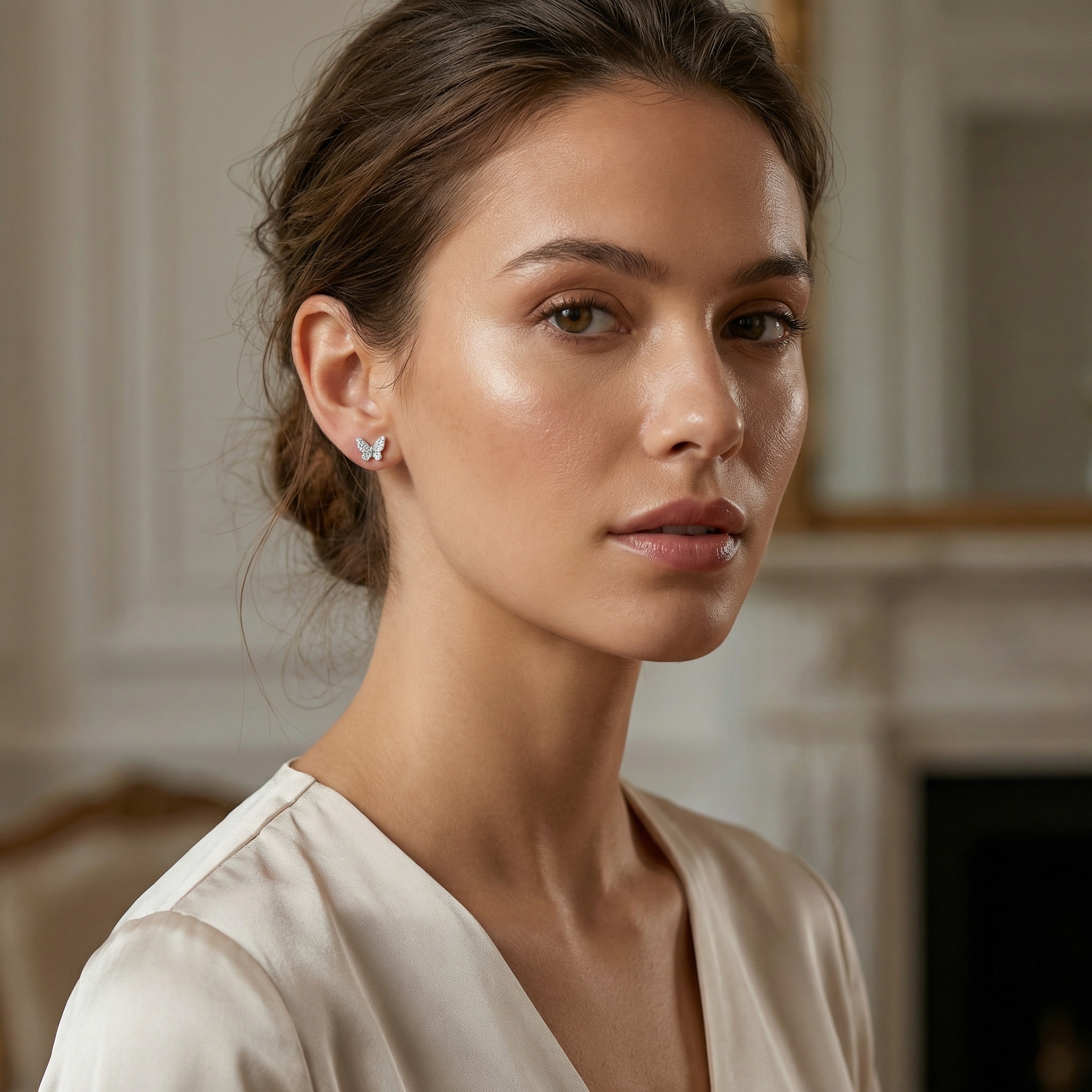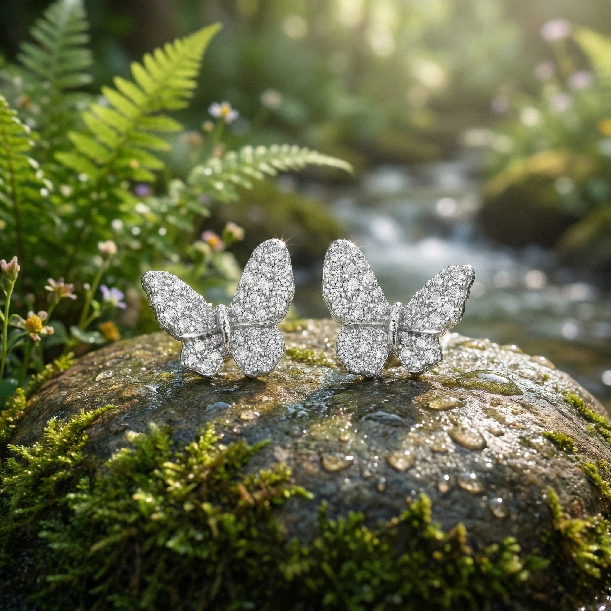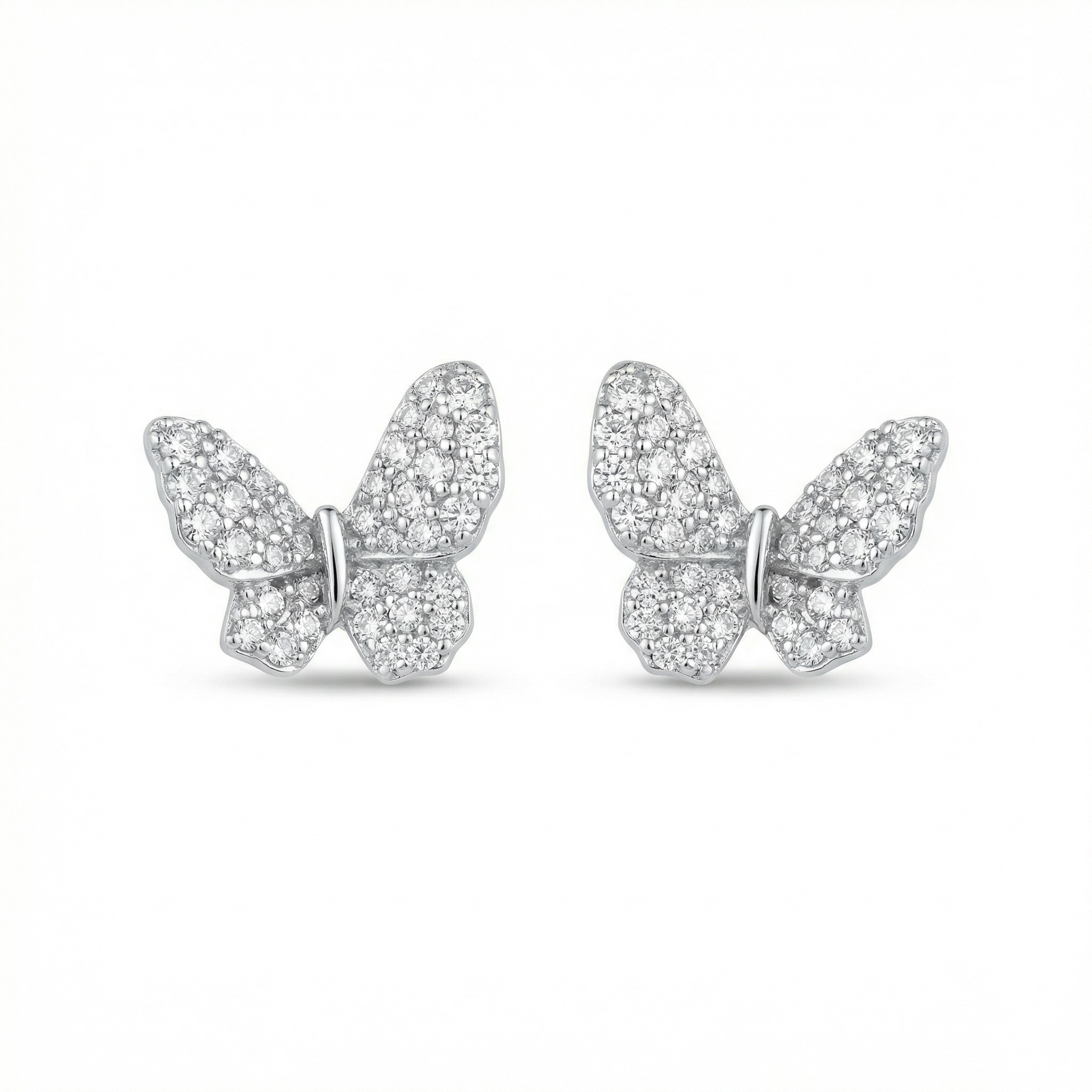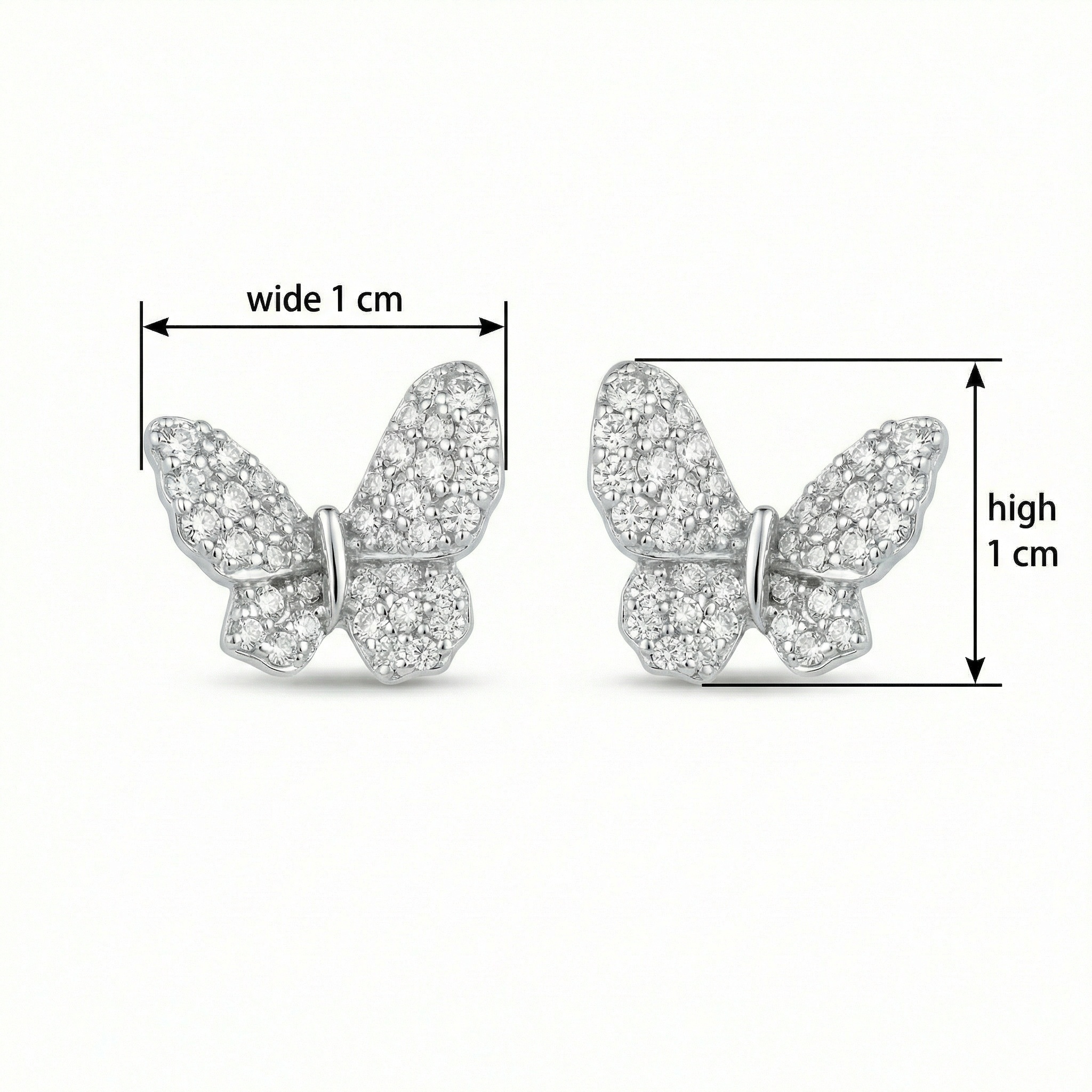These beautiful stud earrings feature a whimsical butterfly design, meticulously crafted from high-quality sterling silver. Each wing is adorned with a stunning array of sparkling pave-set stones that catch the light from every angle, creating a brilliant shimmer. The delicate silhouette and polished silver finish add a touch of timeless elegance and feminine charm to any outfit. Lightweight and comfortable for daily wear, these earrings are the perfect accessory for nature lovers or anyone looking to add a touch of grace and brilliance to their jewelry collection. They serve as an ideal gift for birthdays, anniversaries, or special celebrations. | Brand: jewelryodm