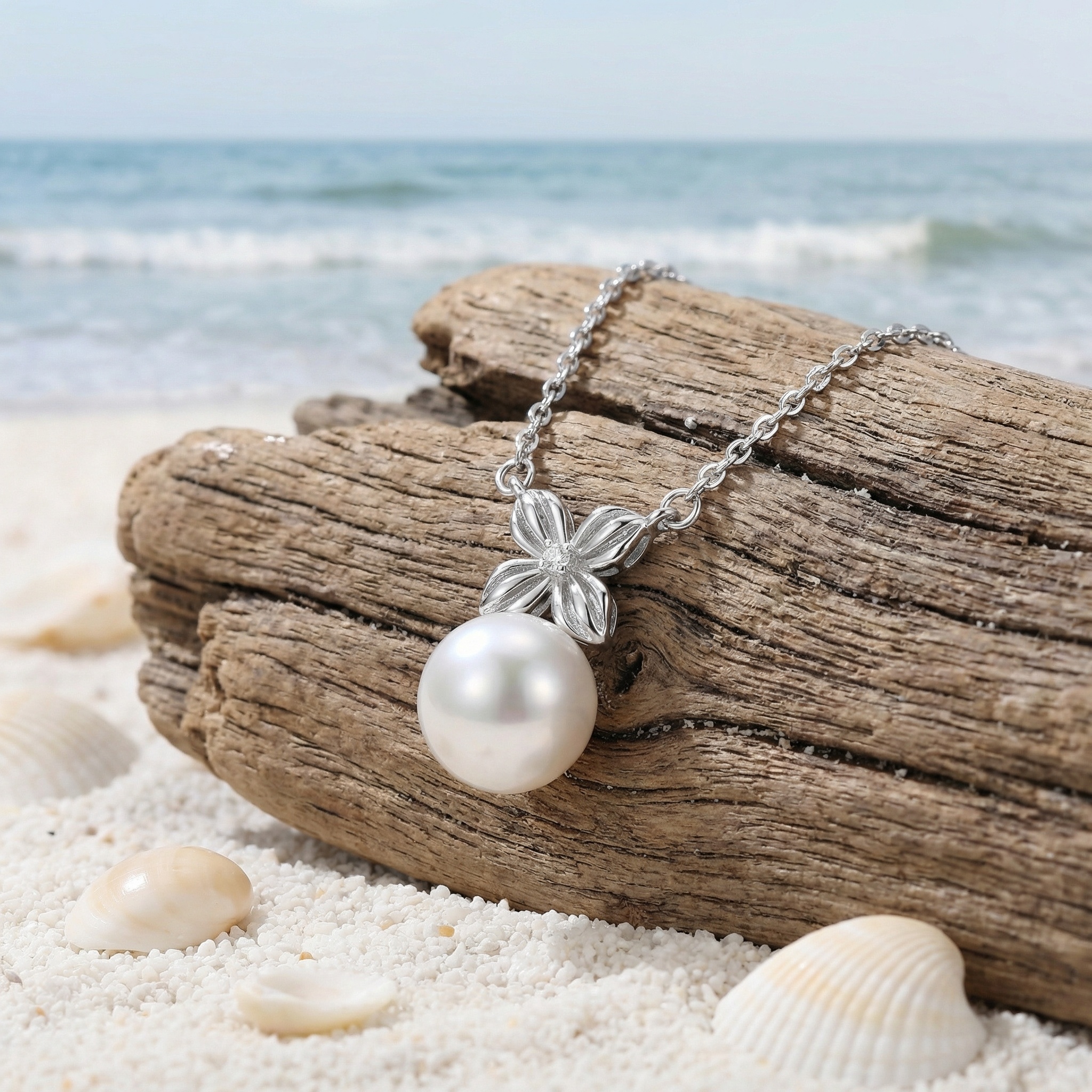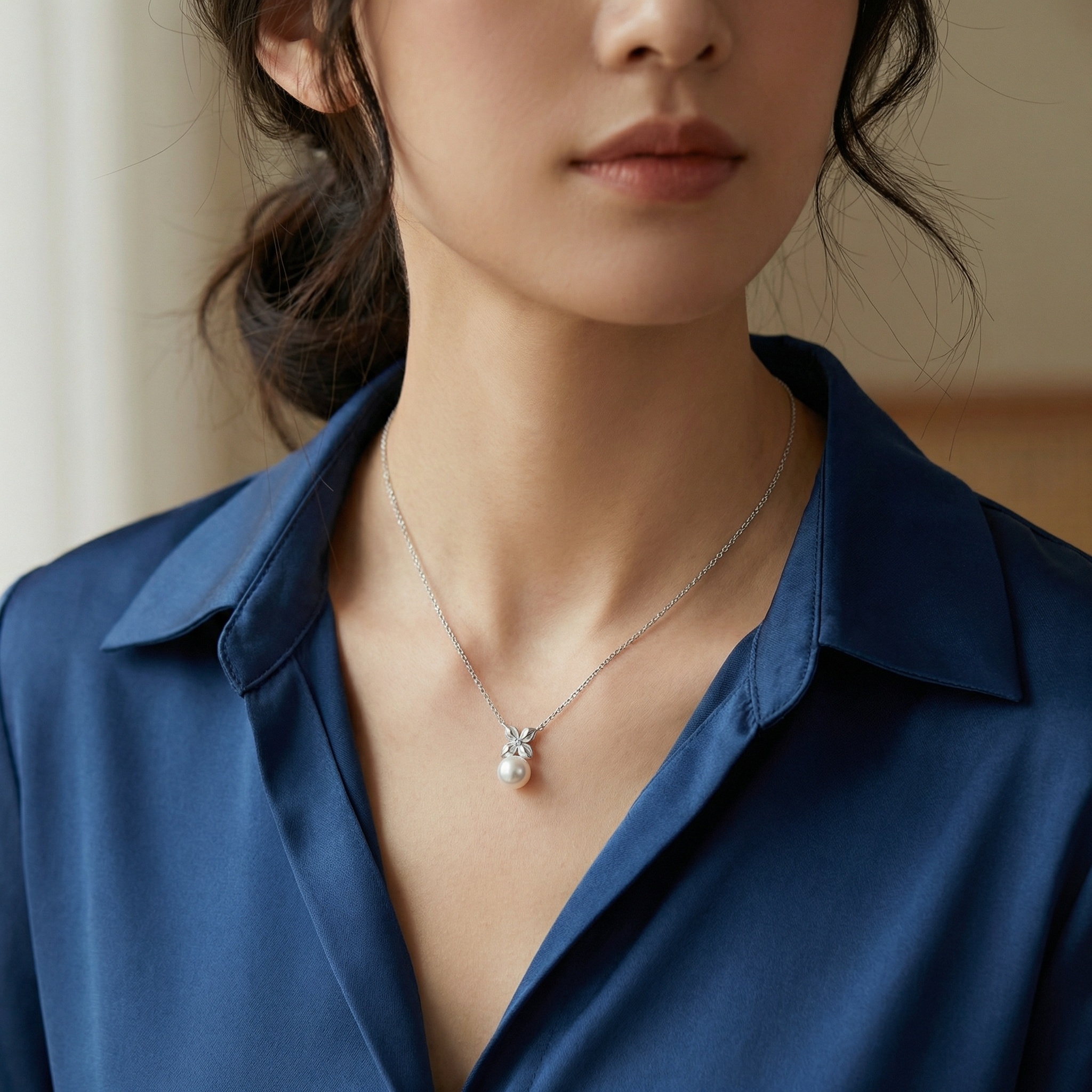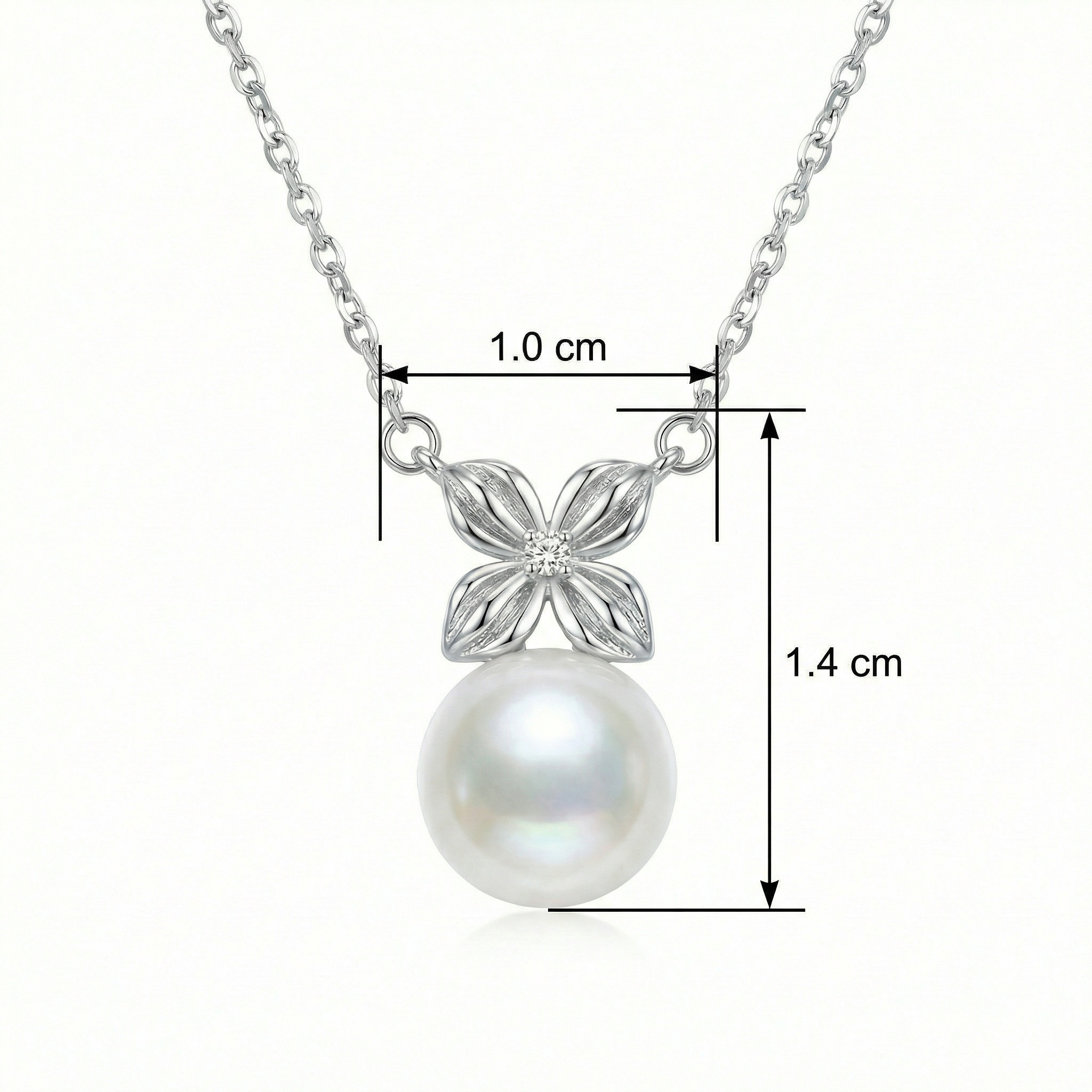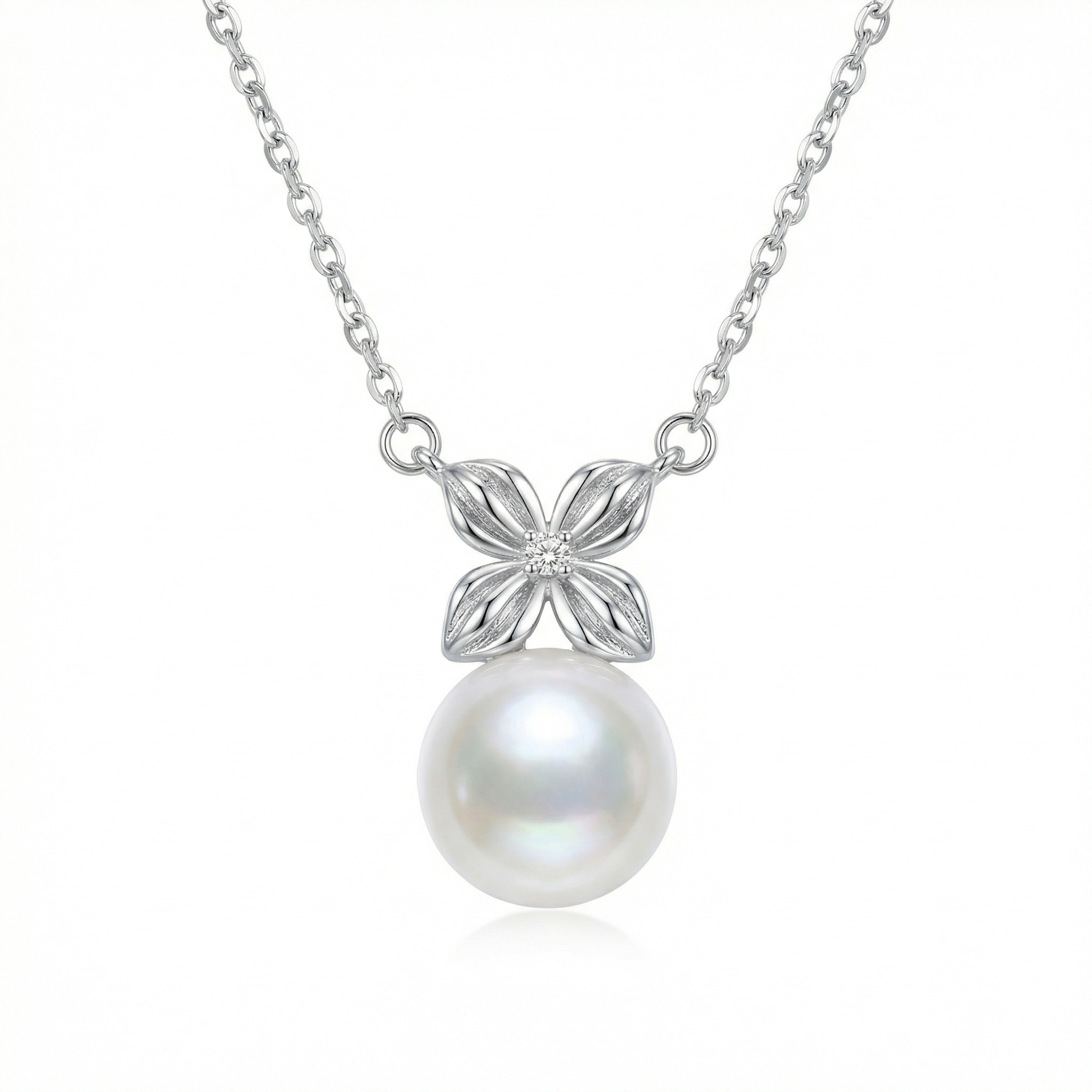 This exquisite necklace features a lustrous, high-quality round white pearl suspended from a delicate sterling silver pendant. Above the pearl sits a beautifully crafted four-petal flower motif, blending timeless elegance with feminine charm. The petals are intricately detailed with fine grooves and a polished finish, meeting at a shimmering round-cut gemstone centerpiece that adds a touch of sparkle. The pendant hangs gracefully from a classic fine silver cable chain, secured with subtle jump rings. This piece radiates sophistication and modern style, making it an ideal accessory for weddings, special occasions, or as a thoughtful gift. Its radiant luster and clean design ensure it complements both formal attire and everyday wear, adding a refined touch to any jewelry collection. | Brand: jewelryodm