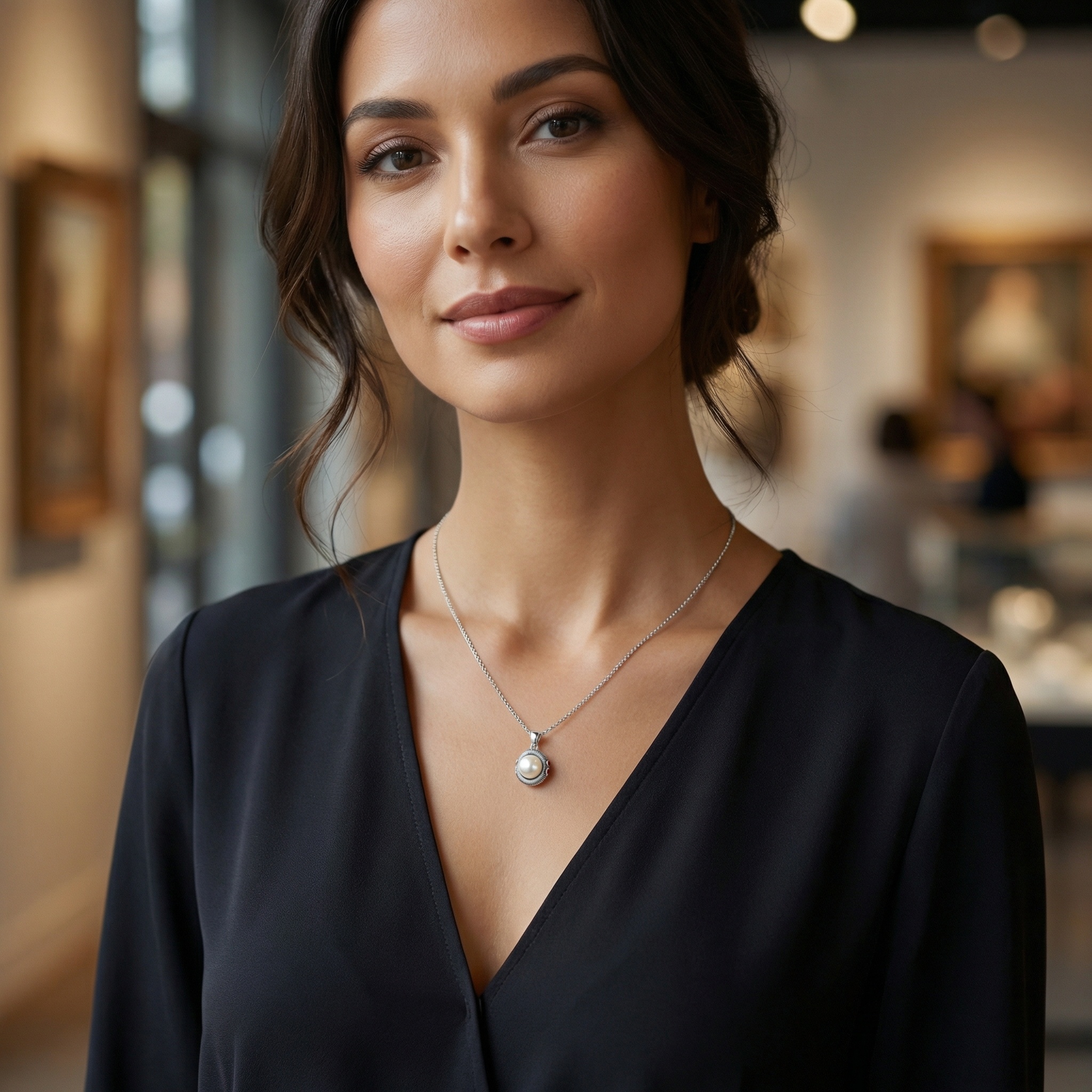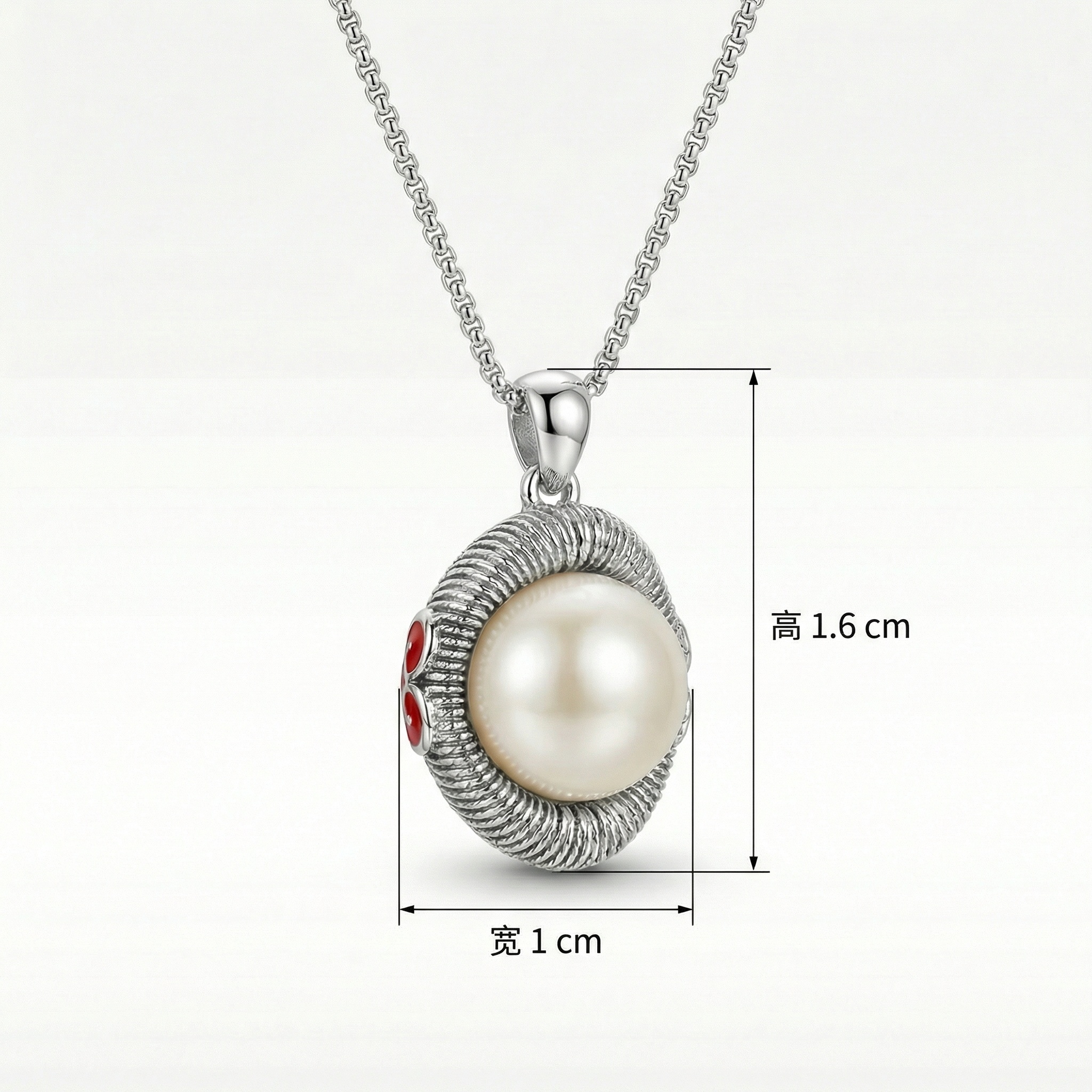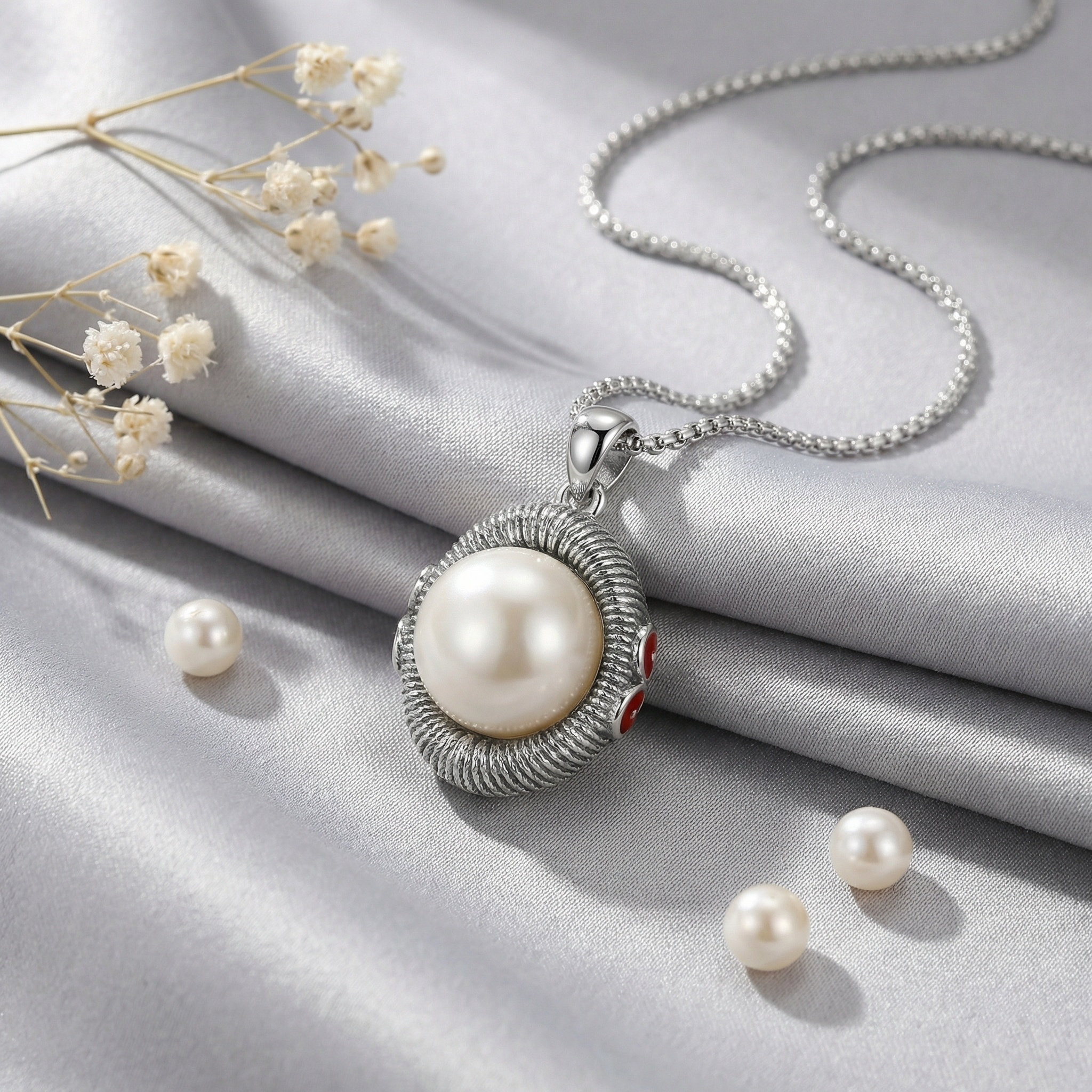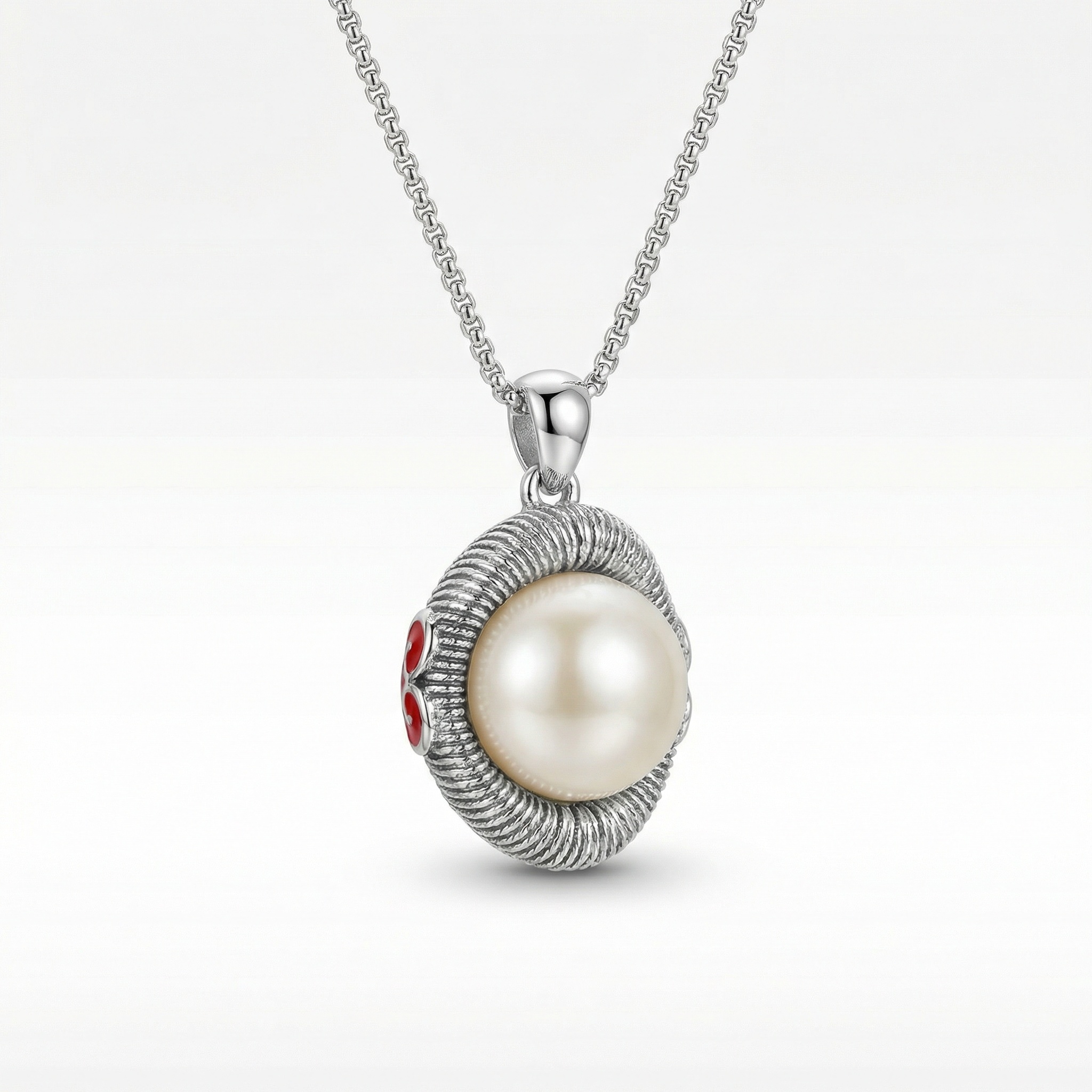 This exquisite necklace features a large, luminous cream-colored pearl set at the center of an intricately designed pendant. The pearl is framed by a thick, textured silver border with a unique ribbed pattern, giving it a handcrafted, vintage-inspired aesthetic. A subtle yet vibrant touch is added by small red enamel floral motifs on the side of the setting, providing a striking pop of color against the polished silver finish. The pendant hangs from a sleek, polished bail attached to a classic silver link chain. Its elegant combination of traditional pearl beauty and contemporary metalwork makes it a versatile accessory suitable for both formal occasions and sophisticated everyday wear. The high-contrast design ensures this piece stands out as a timeless and elegant statement. | Brand: jewelryodm