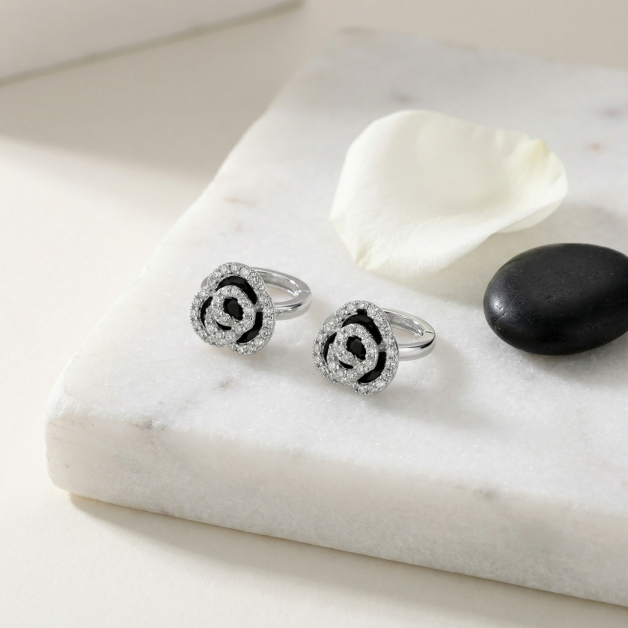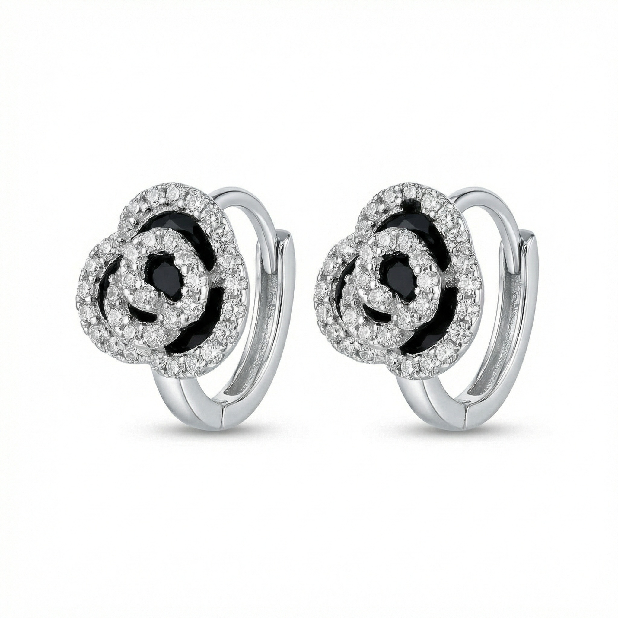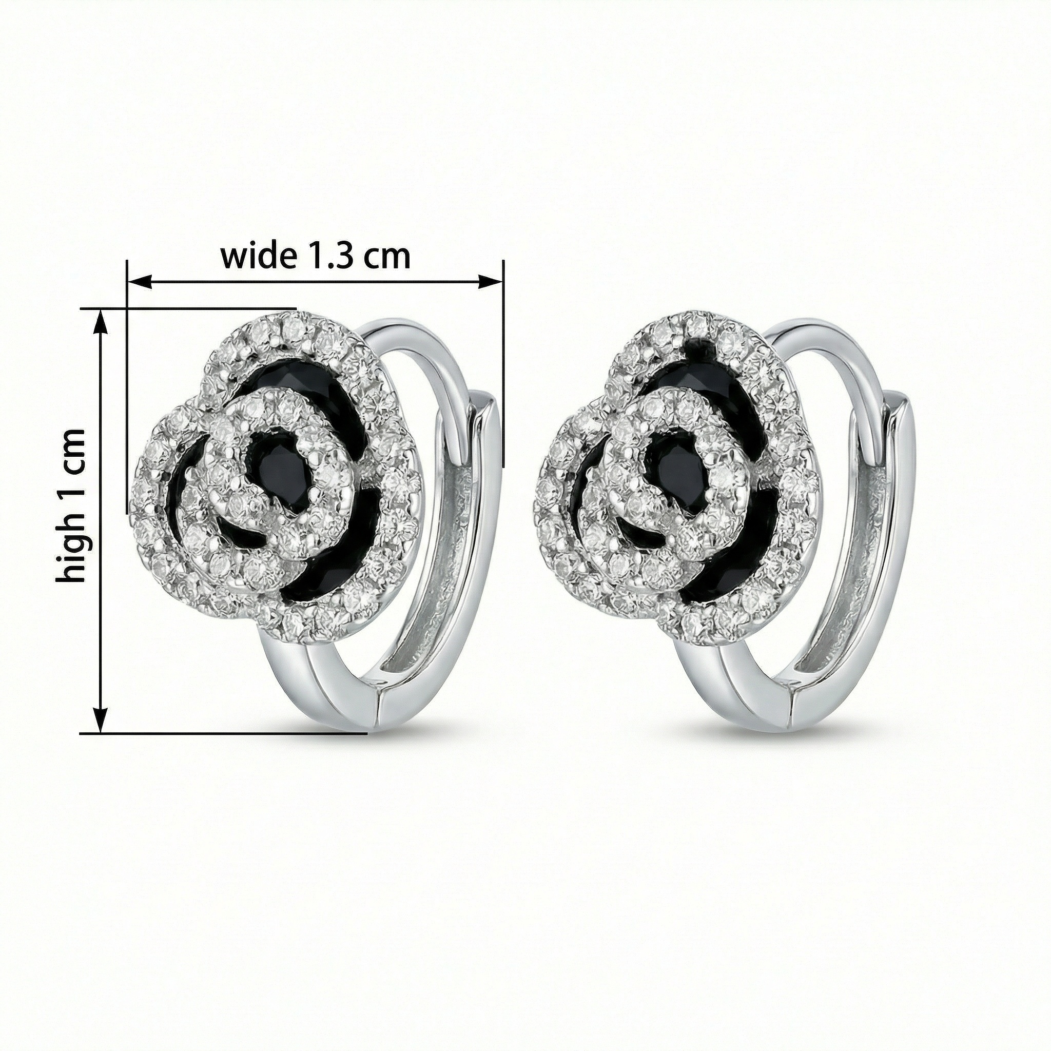 Elevate your jewelry collection with these exquisite silver rose flower huggie hoop earrings. Each earring features a beautifully crafted rose motif, meticulously set with shimmering white stones that sparkle from every angle. The design is elegantly contrasted with deep black stones, creating a sophisticated monochromatic look that mimics the natural beauty of a blooming flower. Crafted from high-quality sterling silver, these hoops offer a comfortable and secure fit with their huggie-style closure. These versatile earrings are perfect for adding a touch of feminine charm and timeless elegance to both daytime and evening ensembles. Whether you're treating yourself or looking for a special gift, these stunning floral hoops are a perfect choice for those who appreciate detailed craftsmanship and classic style. | Brand: jewelryodm