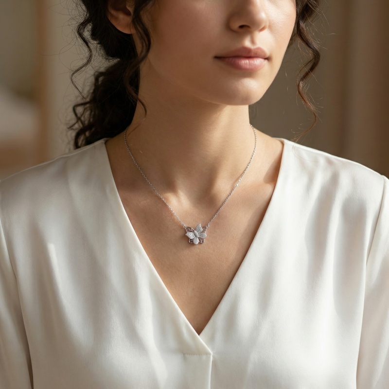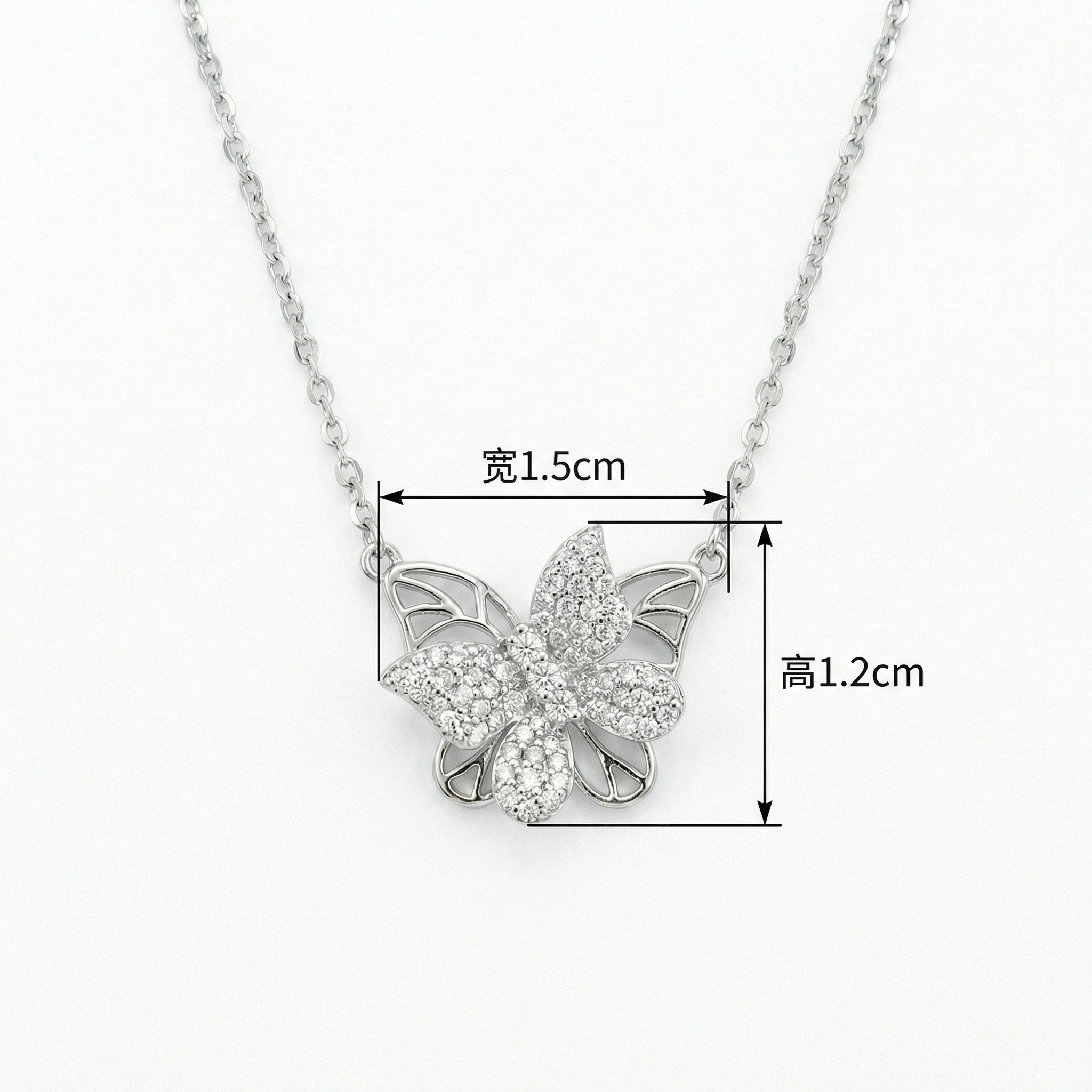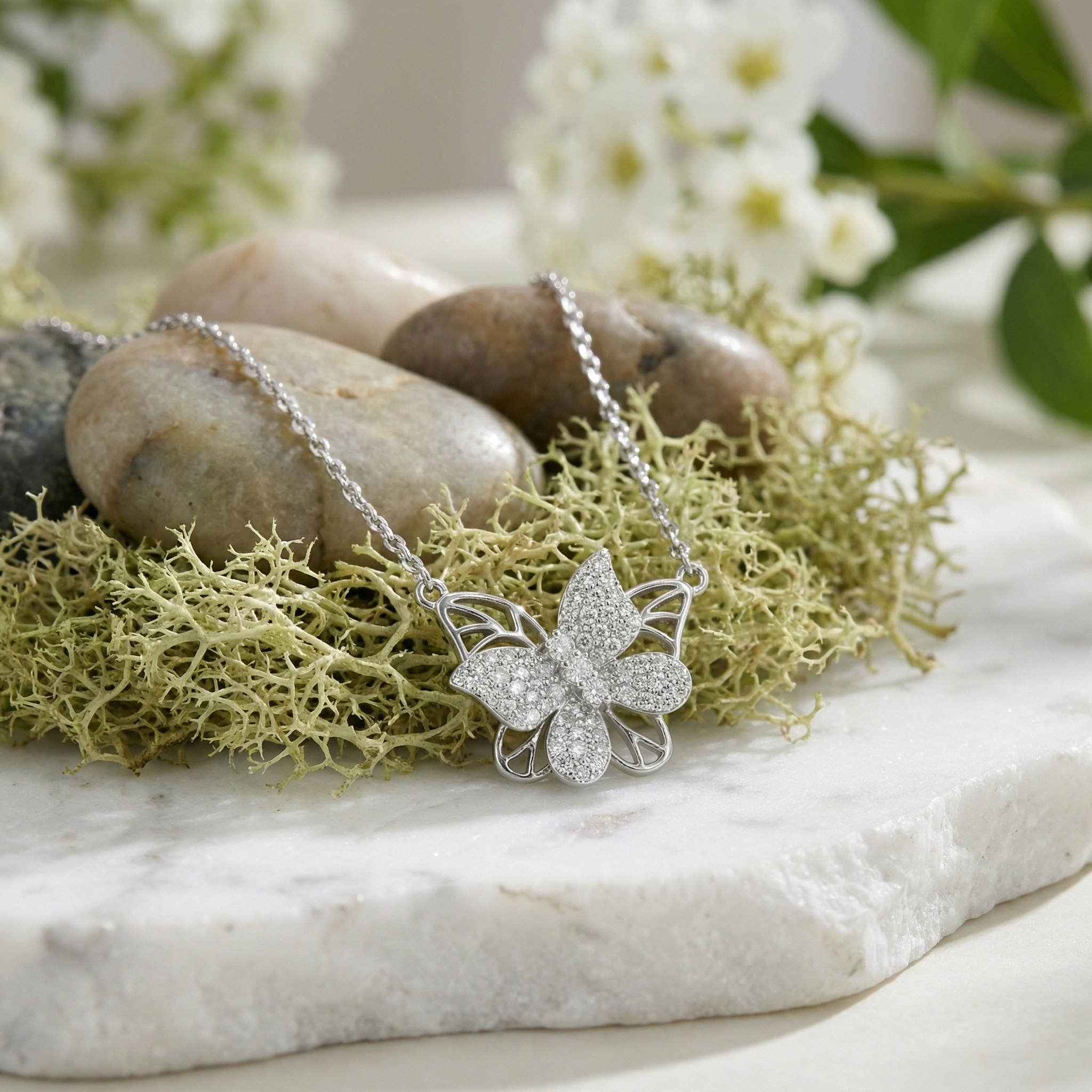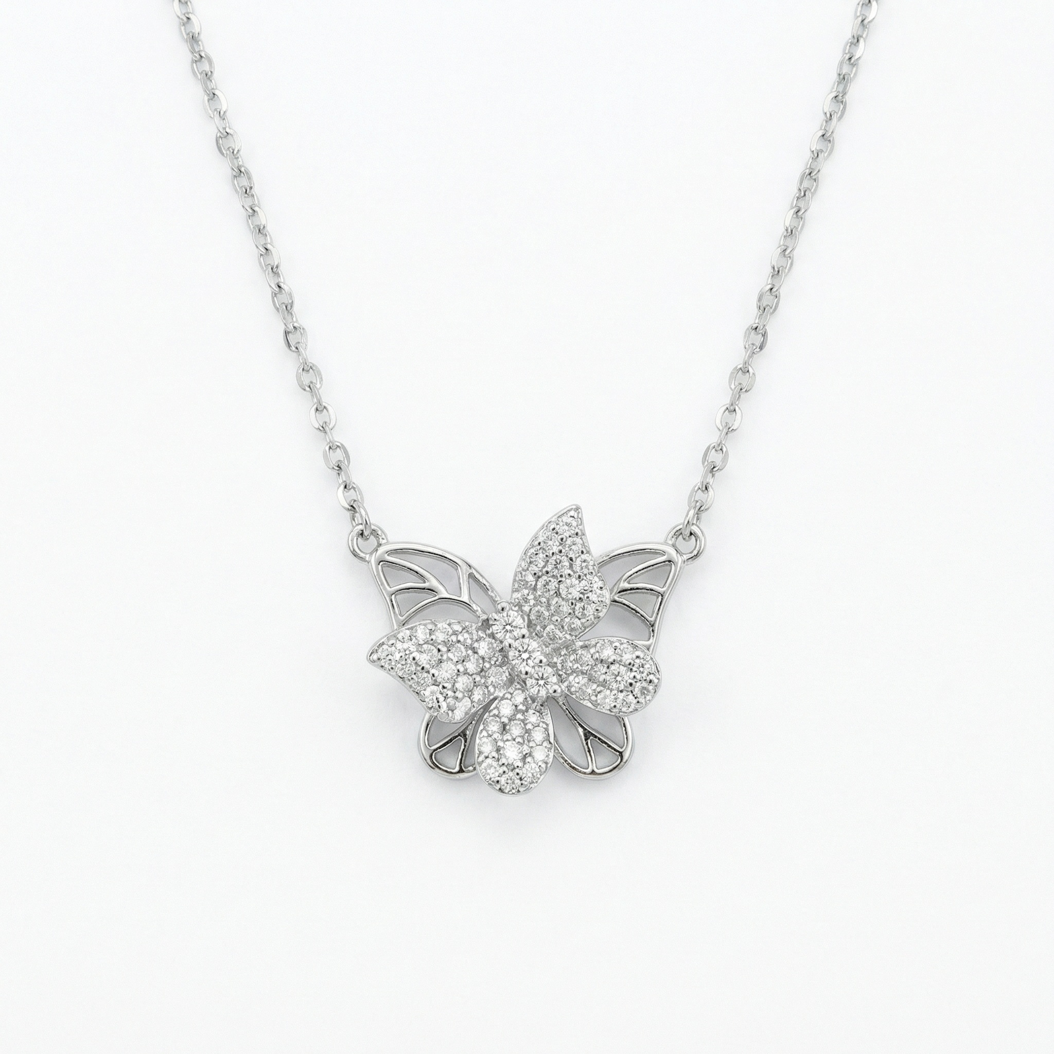This elegant necklace features a beautifully detailed butterfly pendant, symbolizing grace and transformation. The delicate wings are adorned with shimmering pave-set stones that capture and reflect light for a radiant finish. Crafted from high-quality silver-toned metal, the pendant combines intricate stone-setting with an open-work design on the outer wings for a sophisticated look. It hangs from a fine, polished link chain, making it a versatile accessory for both daily wear and special occasions. Perfect as a thoughtful gift or a charming addition to any jewelry collection, this piece offers a timeless blend of nature-inspired beauty and modern elegance. | Brand: jewelryodm