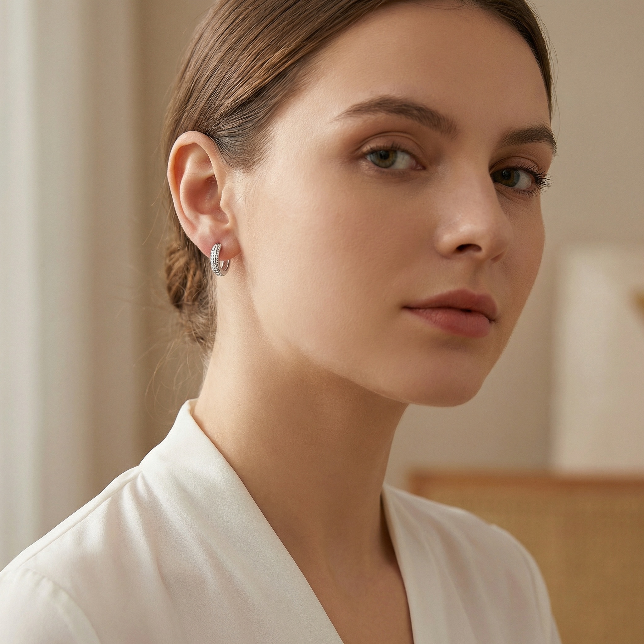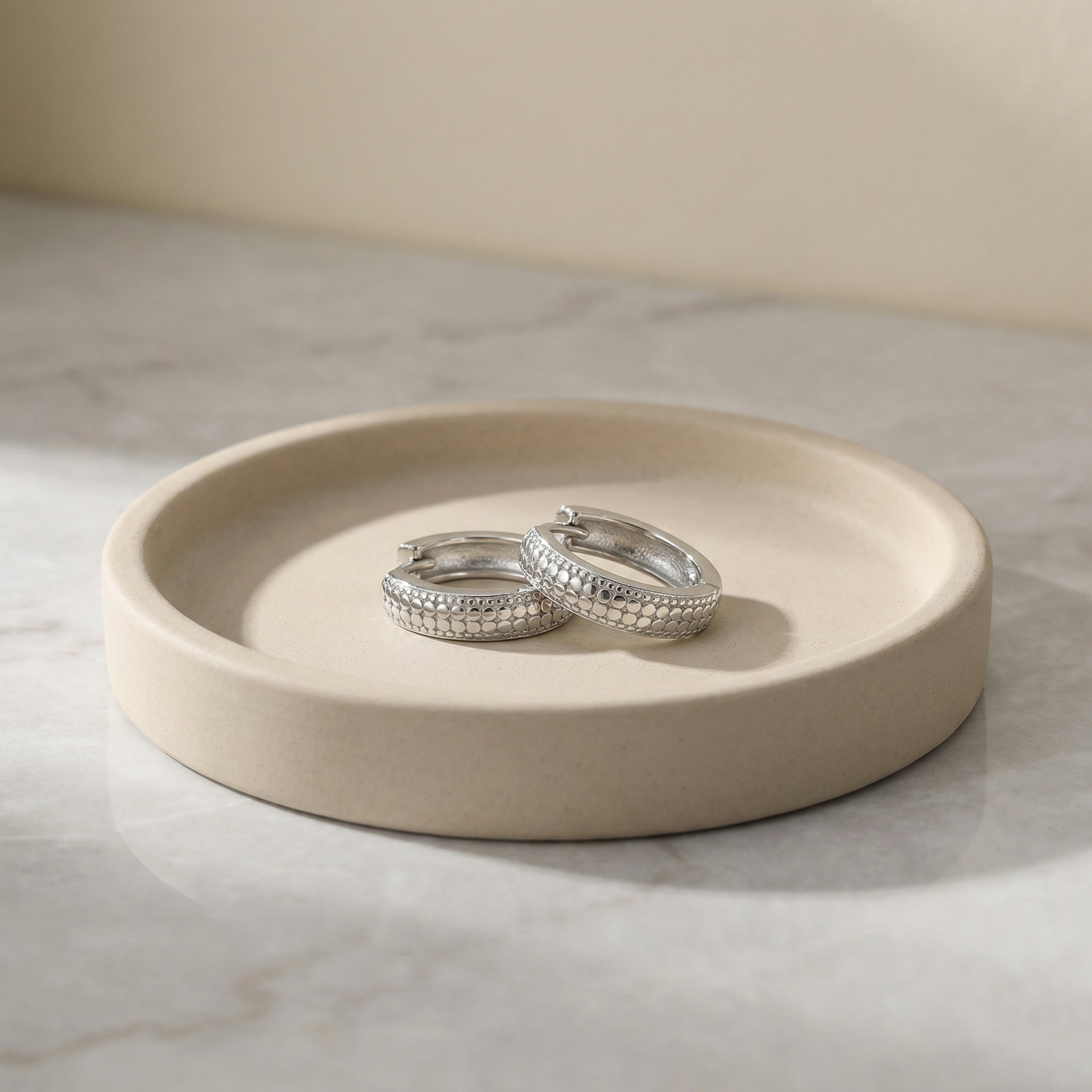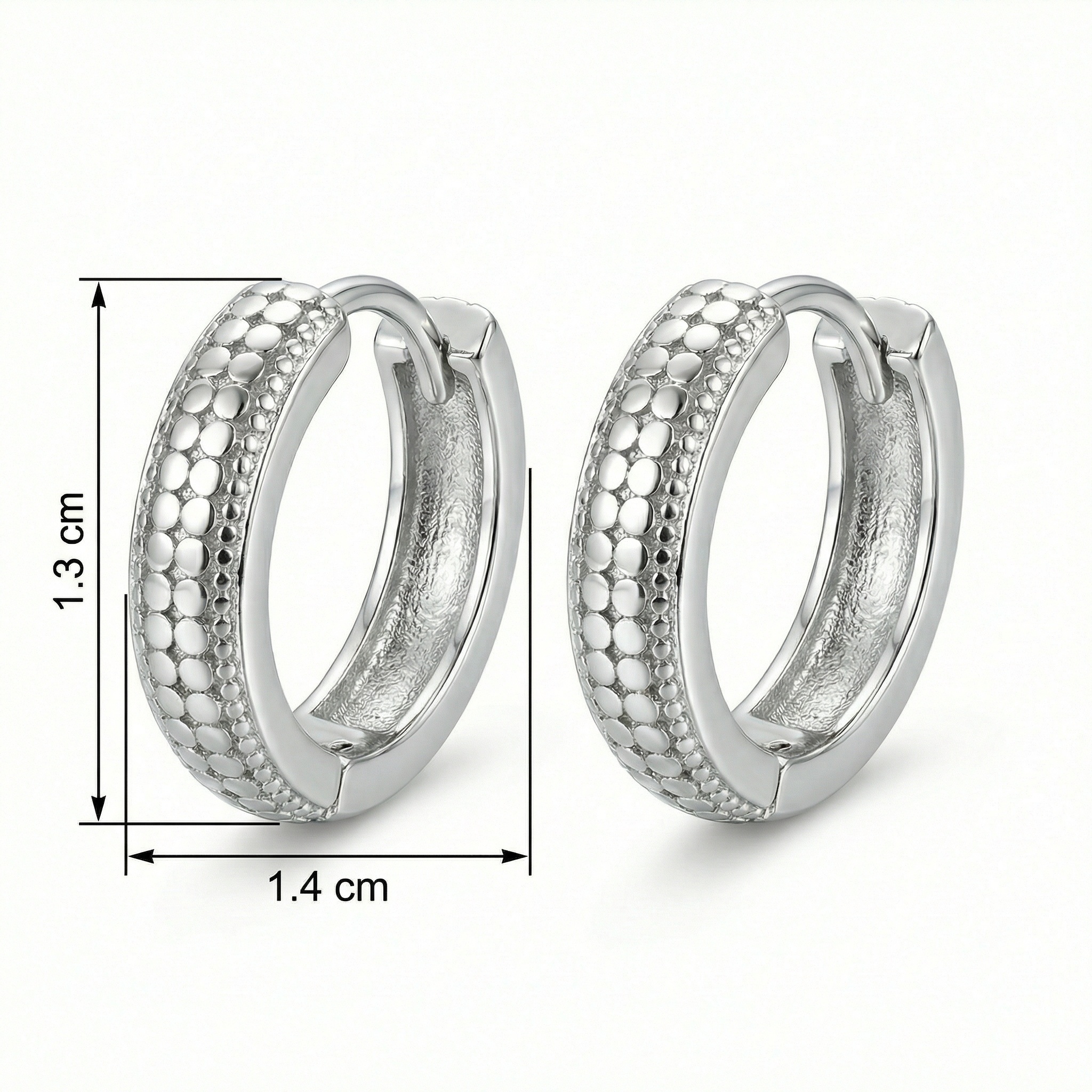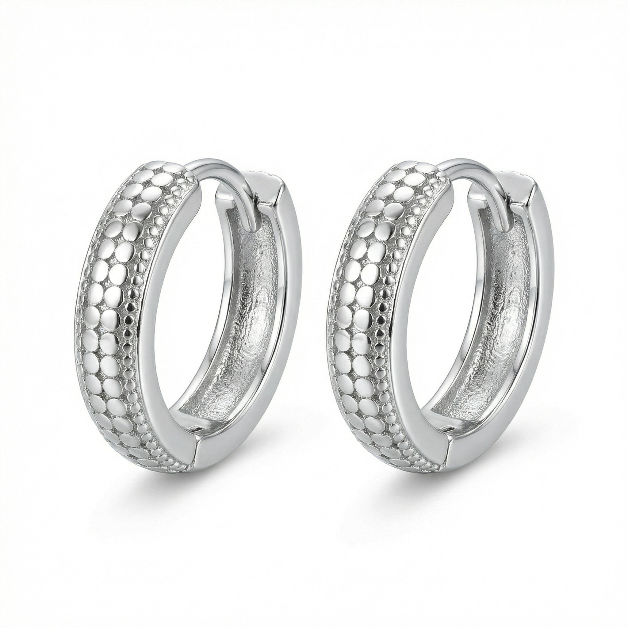 These stunning silver huggie hoop earrings offer a perfect blend of modern style and timeless elegance. Crafted with a high-polish finish, the earrings feature a unique textured design consisting of three rows of shimmering, raised dots that catch the light from every angle. The compact huggie style ensures a comfortable, snug fit against the earlobe, making them ideal for everyday wear or special occasions. Equipped with a secure hinged clasp, these earrings are easy to put on and take off while providing a seamless, sophisticated look. Their minimalist yet detailed appearance makes them a versatile accessory that complements any outfit, from casual daytime attire to formal evening wear. Whether you are treating yourself or searching for the perfect gift for a loved one, these textured hoop earrings are a stylish and durable addition to any contemporary jewelry collection. | Brand: jewelryodm