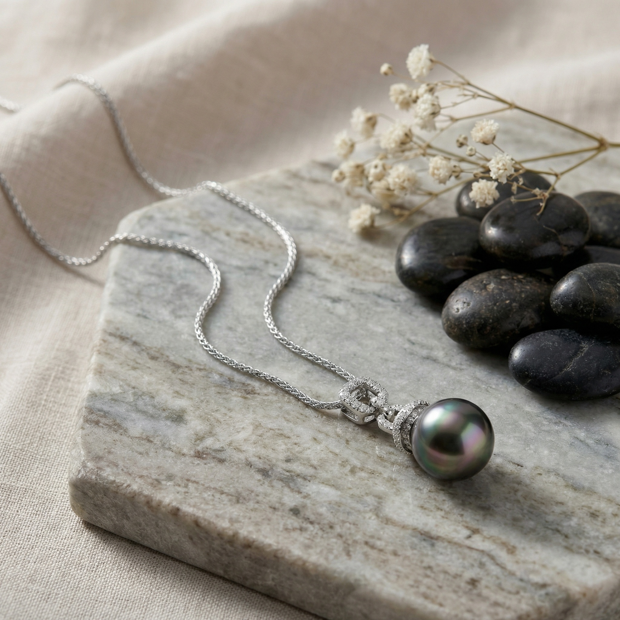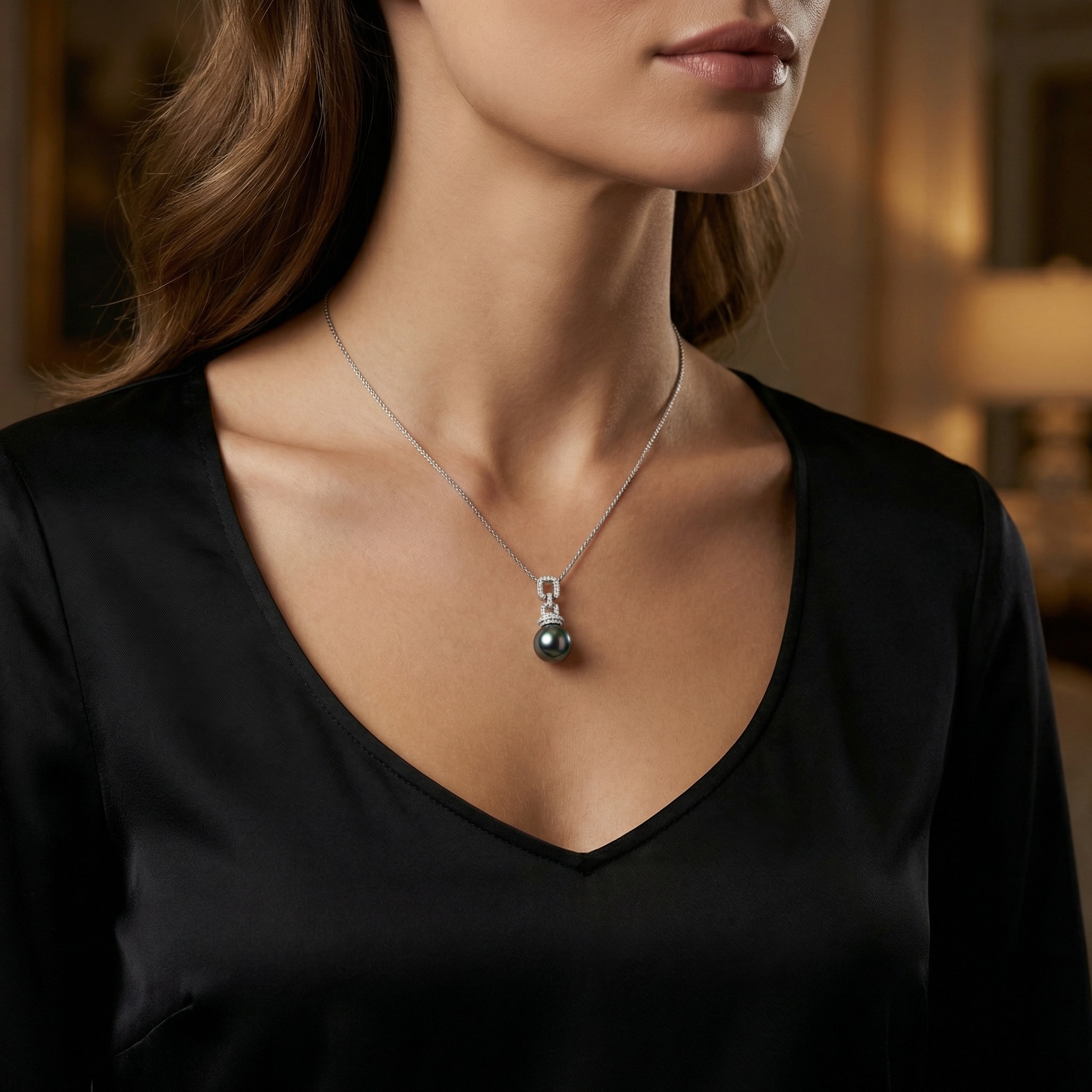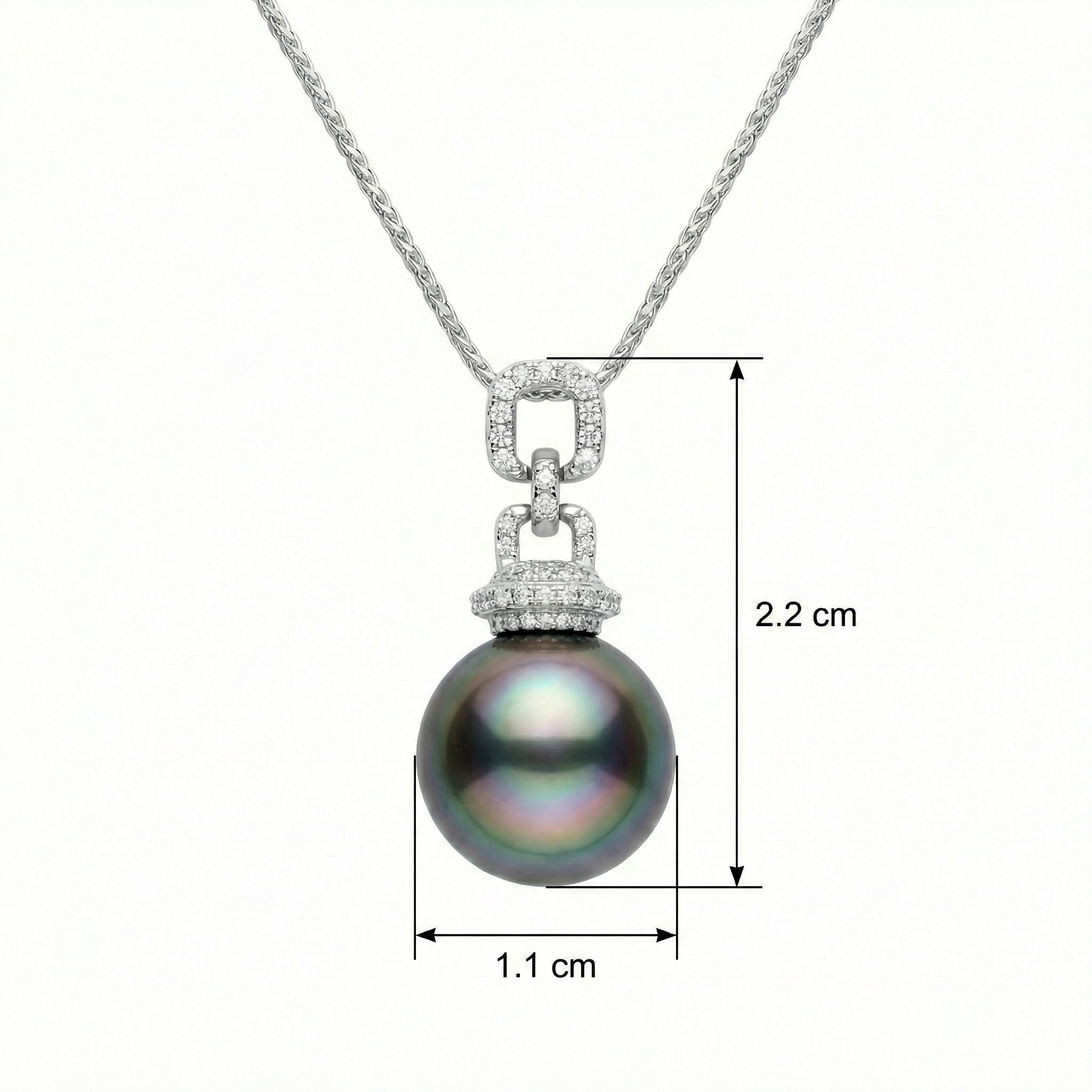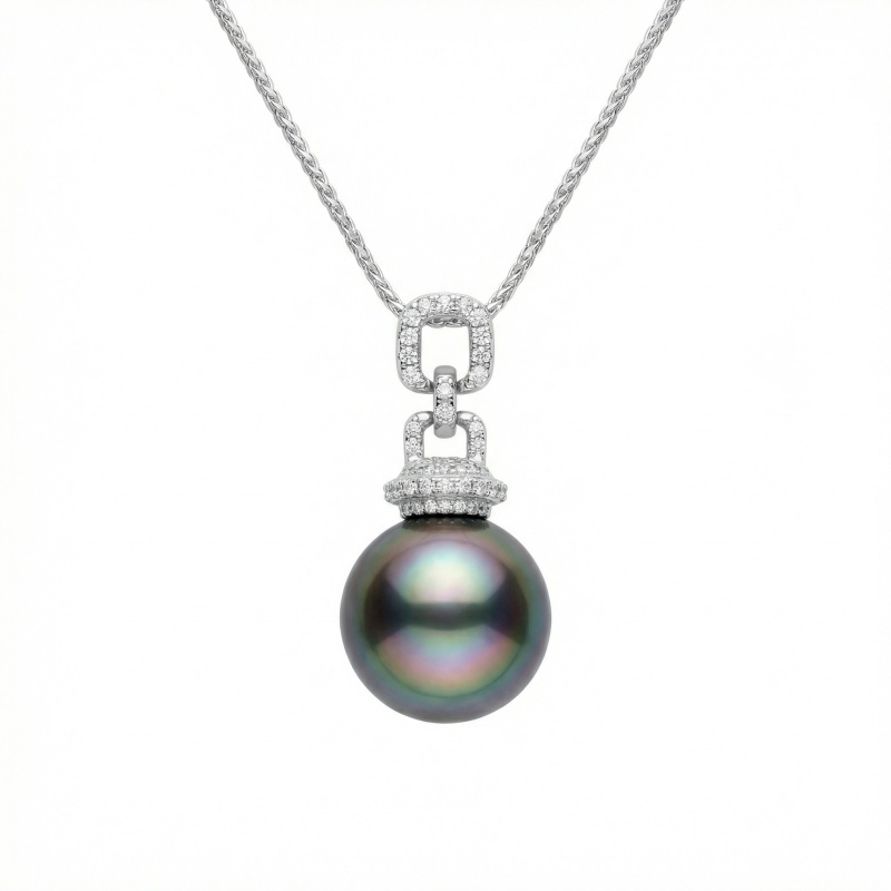 This exquisite necklace features a stunning Tahitian black pearl, renowned for its deep, iridescent hues and mirror-like luster. The pearl is gracefully suspended from a contemporary bale crafted with interlocking links, each meticulously hand-set with shimmering round diamonds. The cool-toned white setting perfectly complements the pearl’s dark overtones, highlighting its natural beauty and elegance. Hanging from a delicate yet durable chain, this piece is designed for those who appreciate timeless luxury with a modern touch. Whether worn for a formal event or to elevate a professional ensemble, this sophisticated pendant captures light from every angle, making it a captivating centerpiece. A perfect statement piece, this jewelry embodies grace and sophistication, offering a unique blend of organic beauty and brilliant craftsmanship. | Brand: jewelryodm