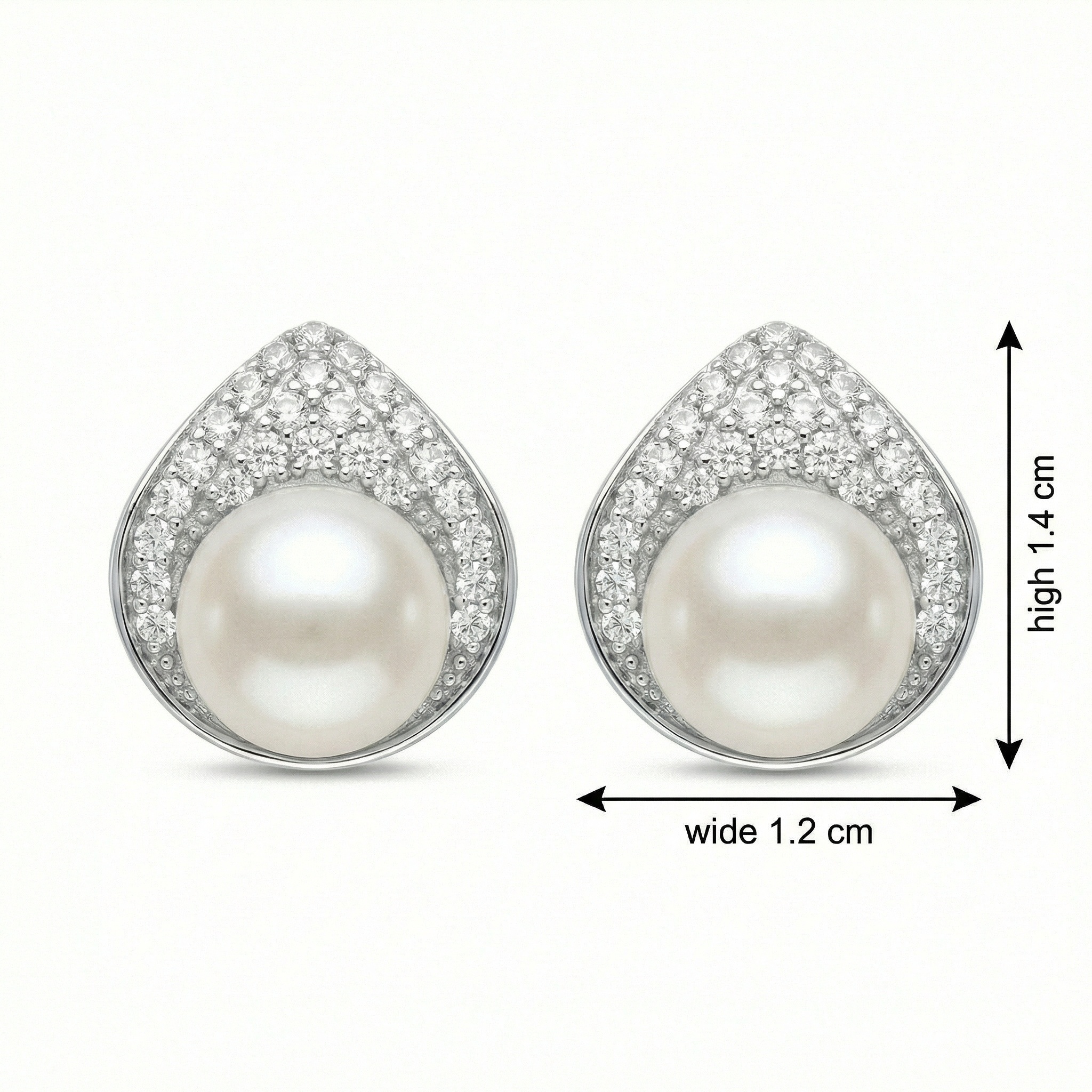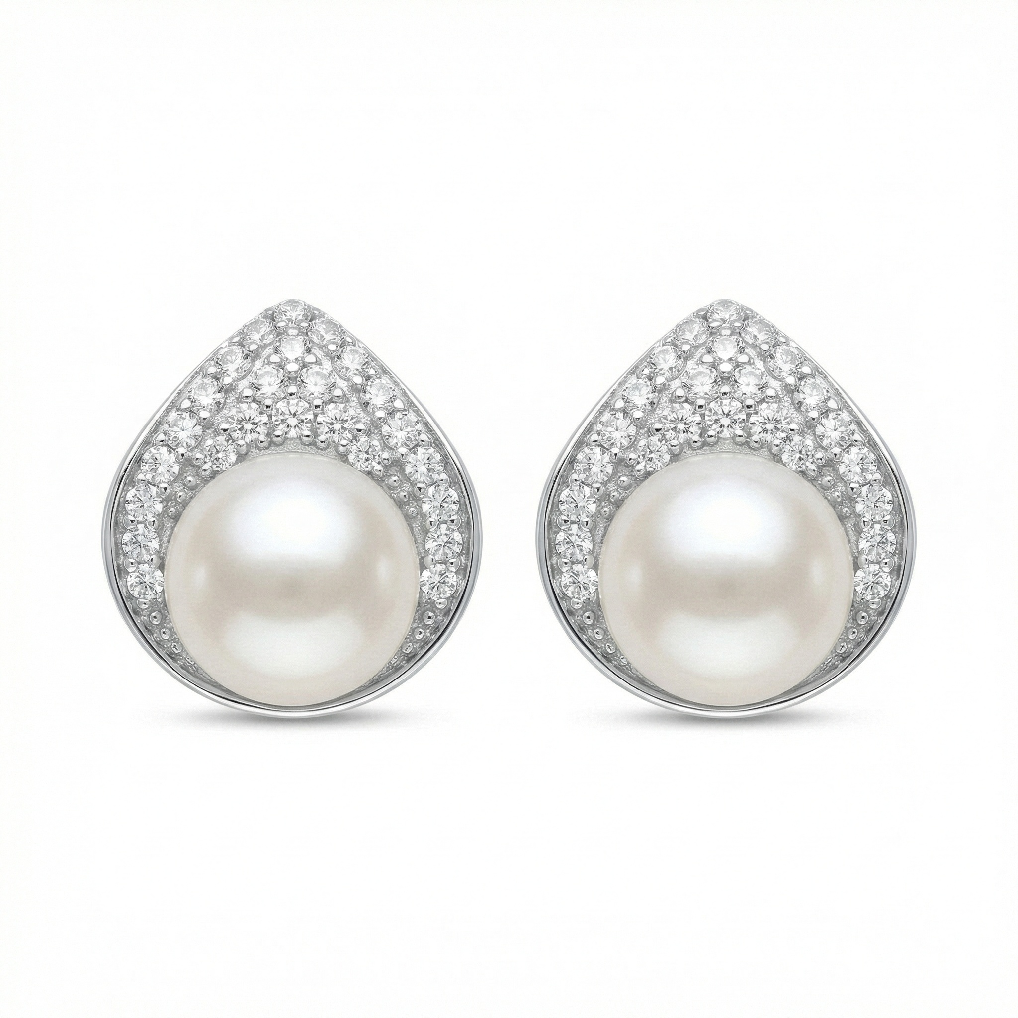 These exquisite stud earrings feature a timeless design that blends classic elegance with modern brilliance. At the heart of each earring sits a lustrous white pearl, renowned for its smooth surface and soft glow. The pearl is cradled within a sophisticated teardrop-shaped frame crafted from polished silver-toned metal. This halo is meticulously embellished with a shimmering pavé of brilliant-cut diamonds that catch the light from every angle, adding a touch of luxury and sparkle. The combination of the organic beauty of the pearl and the precision of the diamond accents creates a stunning visual contrast. Ideal for weddings, formal events, or simply adding a touch of refinement to your daily ensemble, these earrings are a versatile addition to any jewelry collection. They offer a secure and comfortable fit, making them a perfect gift for a loved one. | Brand: jewelryodm