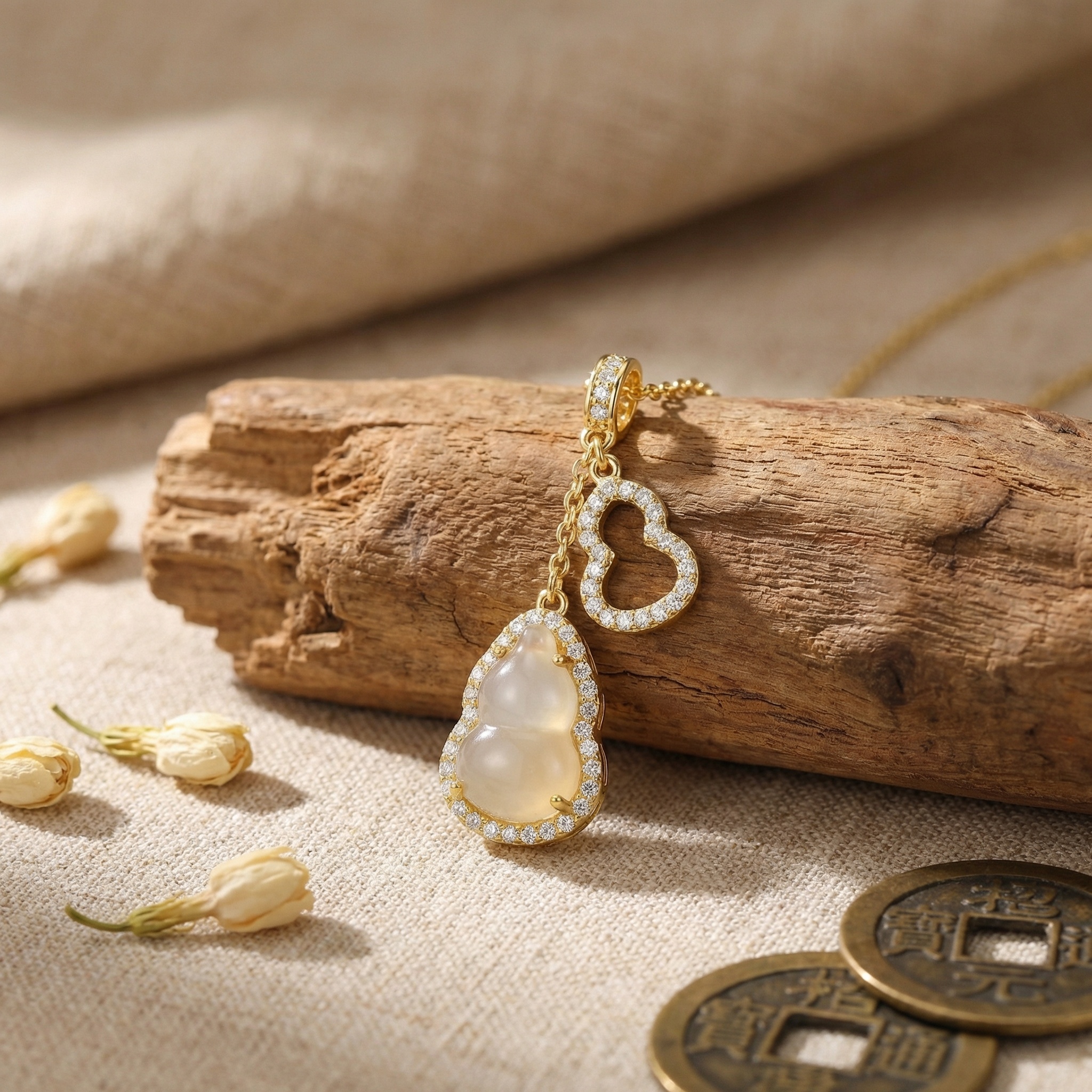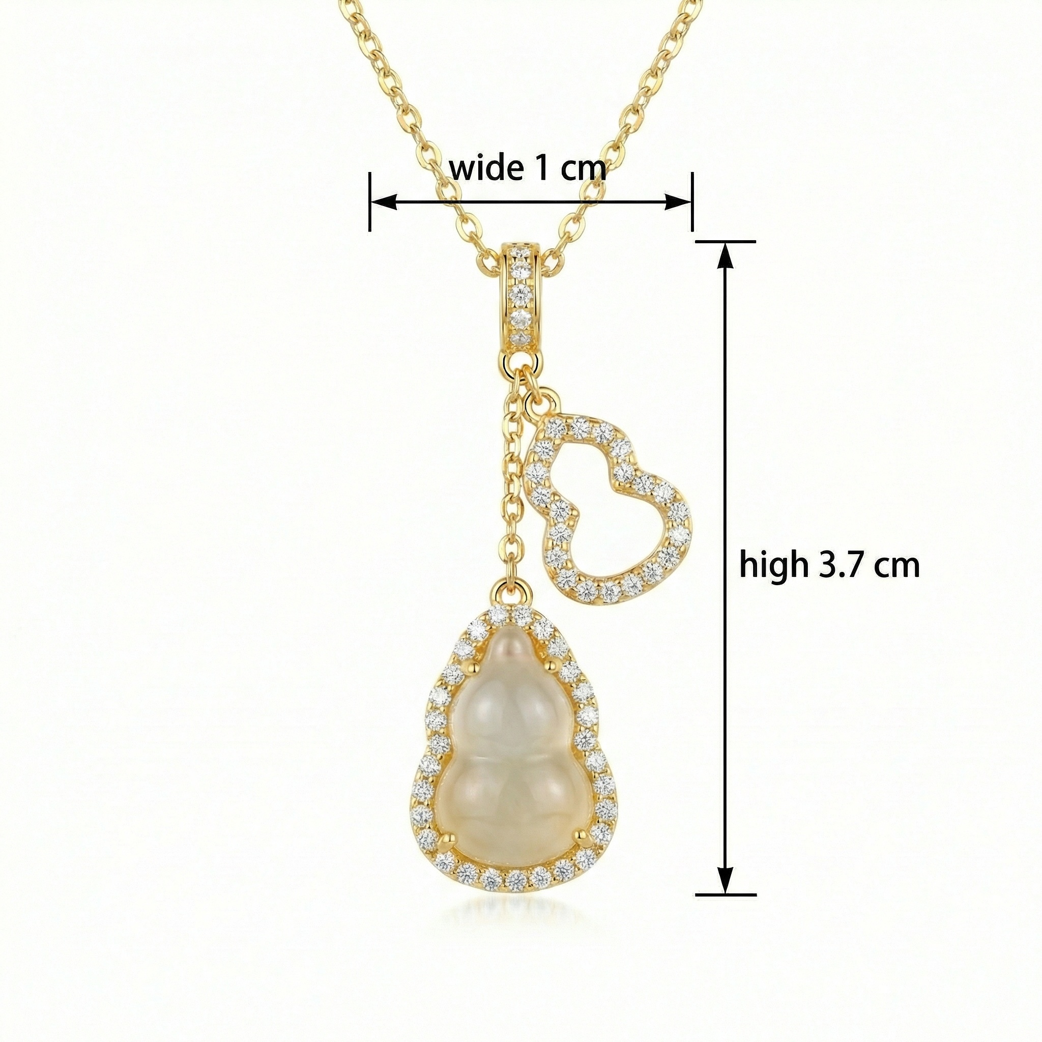 This exquisite necklace features a captivating double-pendant design inspired by the traditional bottle gourd, a symbol of longevity and prosperity. The primary focal point is a larger pendant showcasing a smooth, translucent milky gemstone carved into an elegant hulu shape. This central stone is framed by a shimmering halo of meticulously set round brilliant stones that catch the light from every angle. Dangling gracefully alongside is a smaller, openwork gourd charm, fully adorned with matching pavé stones for added brilliance. Both charms are suspended from a delicate yellow-toned chain, creating a harmonious and sophisticated look. This piece combines timeless cultural symbolism with a modern, luxurious aesthetic, making it a perfect accessory for both special occasions and everyday elegance. The radiant finish and sparkling accents ensure a touch of glamour for any ensemble. | Brand: jewelryodm