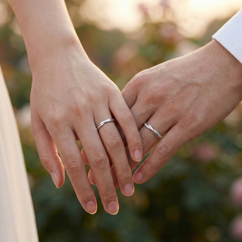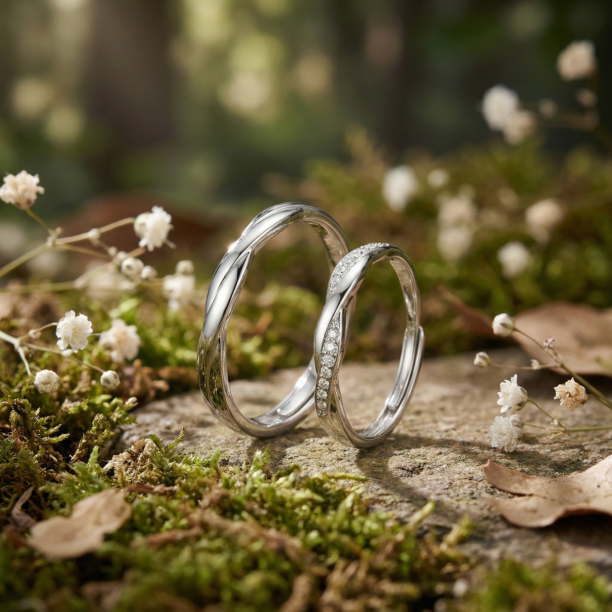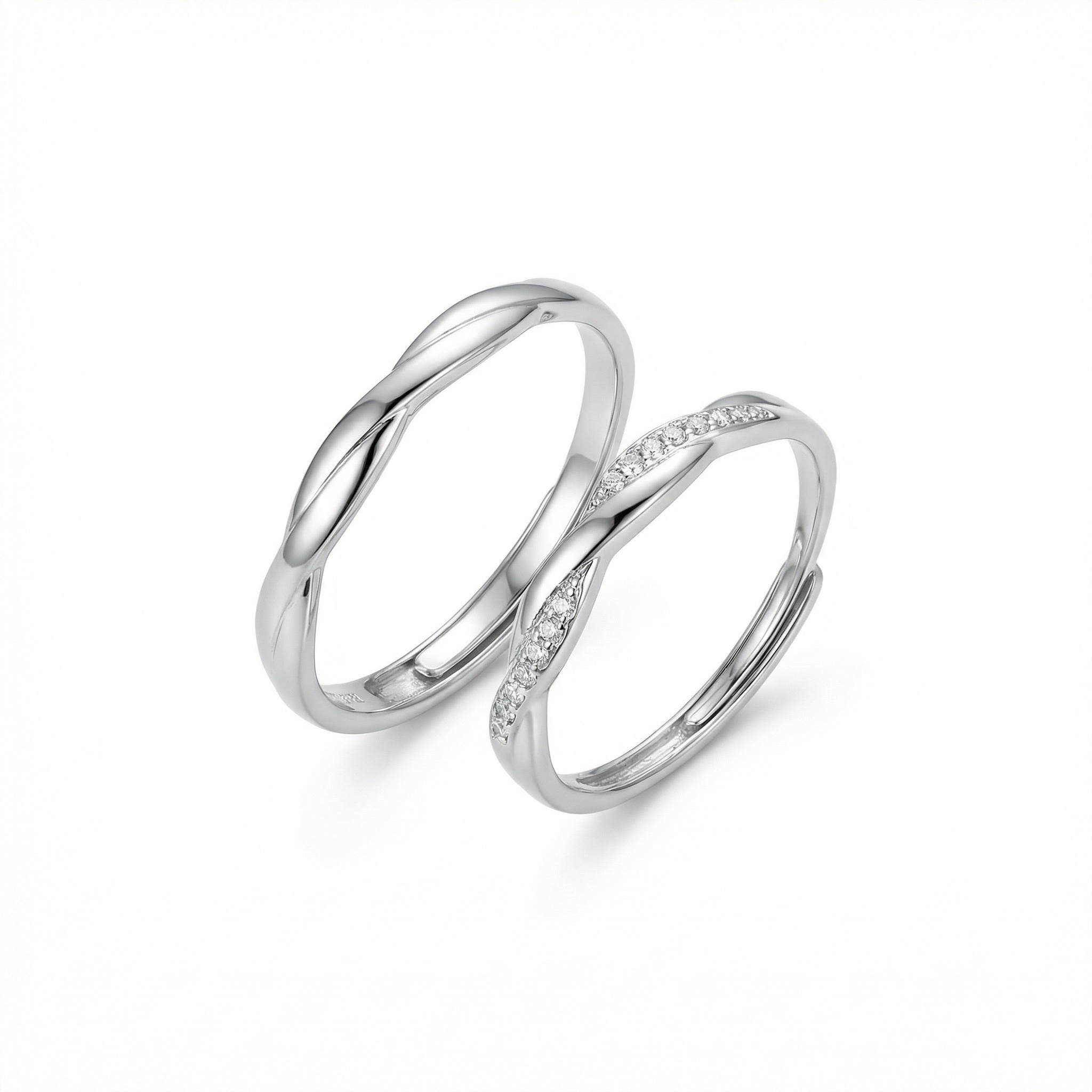 This sophisticated pair of couple's rings features a contemporary twisted design, symbolizing two lives beautifully entwined. Crafted from high-quality sterling silver with a polished finish, the set includes a minimalist plain band and a matching ring adorned with a shimmering row of petite diamonds along its curve. The adjustable open-back design ensures a comfortable and versatile fit. These rings are perfect for weddings, anniversaries, or as a meaningful promise of eternal love. Their timeless elegance makes them a perfect daily accessory and a luxurious statement of commitment. | Brand: jewelryodm
