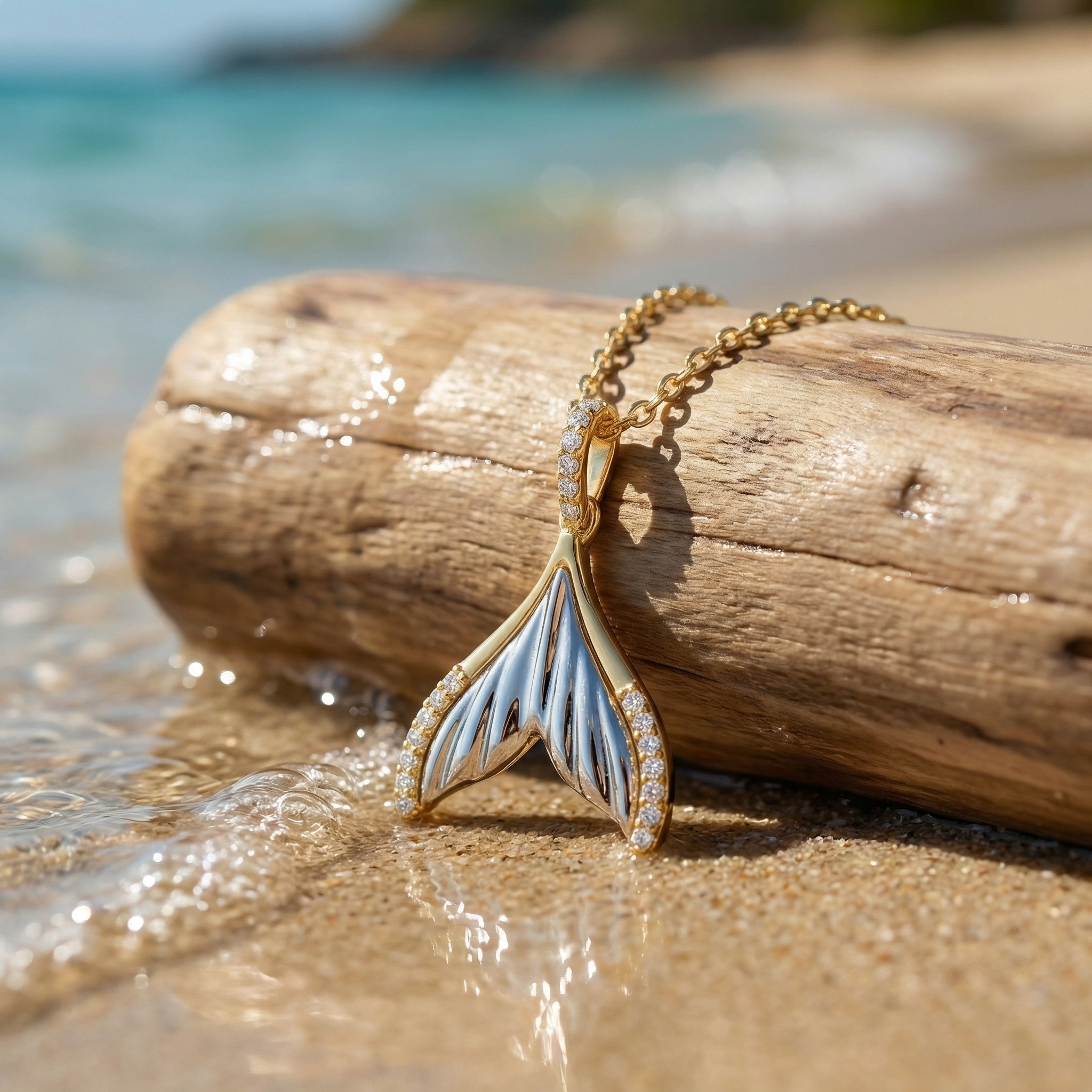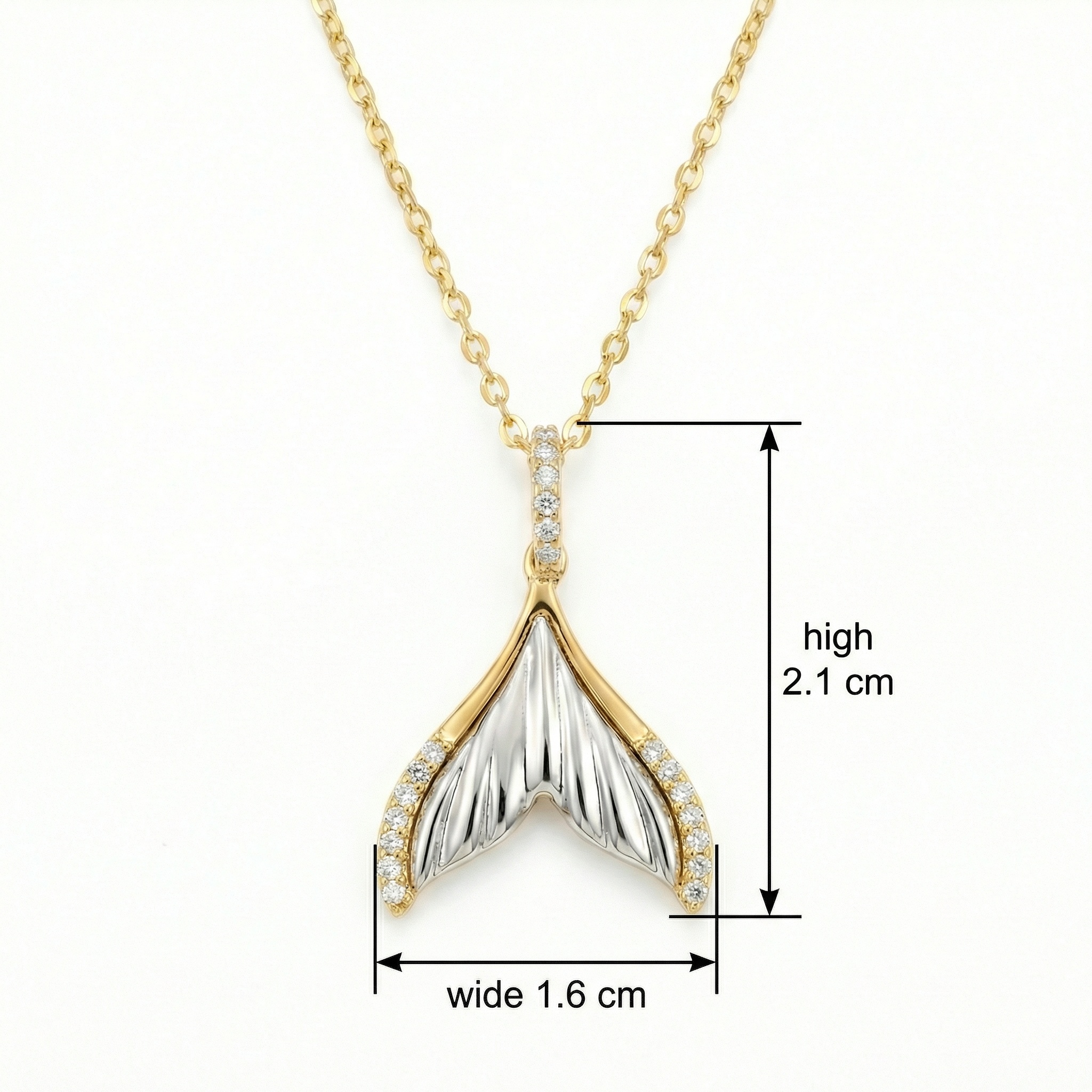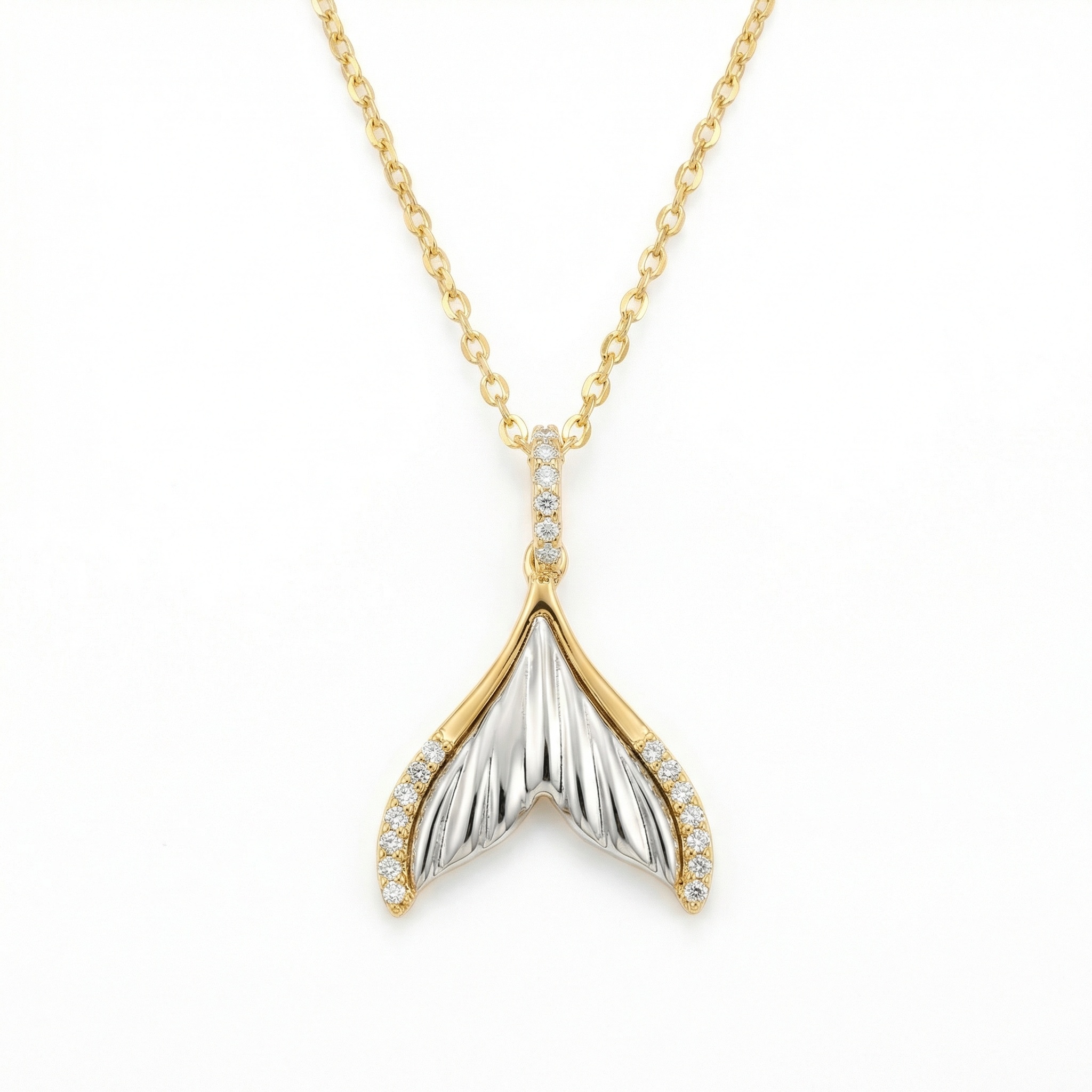 Embrace the spirit of the sea with this stunning whale tail pendant necklace. The design showcases a beautiful contrast, featuring a radiant silver-toned textured center nestled within a warm, polished metallic border. Exquisite clear stones line the outer curves and the elegant bail, providing a brilliant sparkle that catches the light from every angle. Inspired by the grace of marine giants, the pendant's fine detailing represents strength and freedom. Hanging gracefully from a delicate link chain, this accessory is ideal for adding a touch of nautical sophistication to your style. Its timeless aesthetic makes it a thoughtful gift for someone special or a charming treat for yourself, symbolizing a deep connection to the wonders of the ocean. | Brand: jewelryodm
