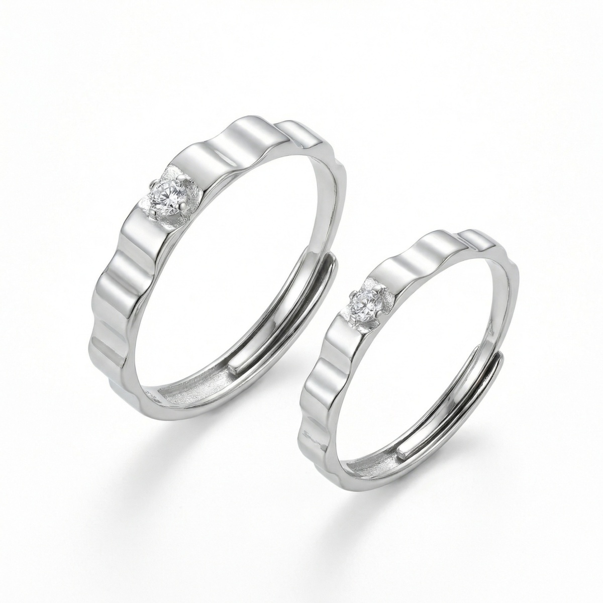 This exquisite pair of matching couple rings showcases a modern wavy texture, offering a fluid and contemporary aesthetic. Crafted with a sleek silver-tone finish, each band is centered with a single brilliant-cut cubic zirconia for a touch of timeless sparkle. The unique rippled surface adds a tactile and visual depth, distinguishing these from traditional smooth bands. Featuring a practical adjustable open-back design, these rings provide a versatile and comfortable fit for various finger sizes. Perfect for anniversaries, engagements, or as meaningful promise rings, this set symbolizes unity and style. Their minimalist yet sophisticated appearance makes them suitable for everyday wear or special celebrations, serving as a beautiful testament to a shared bond. | Brand: jewelryodm