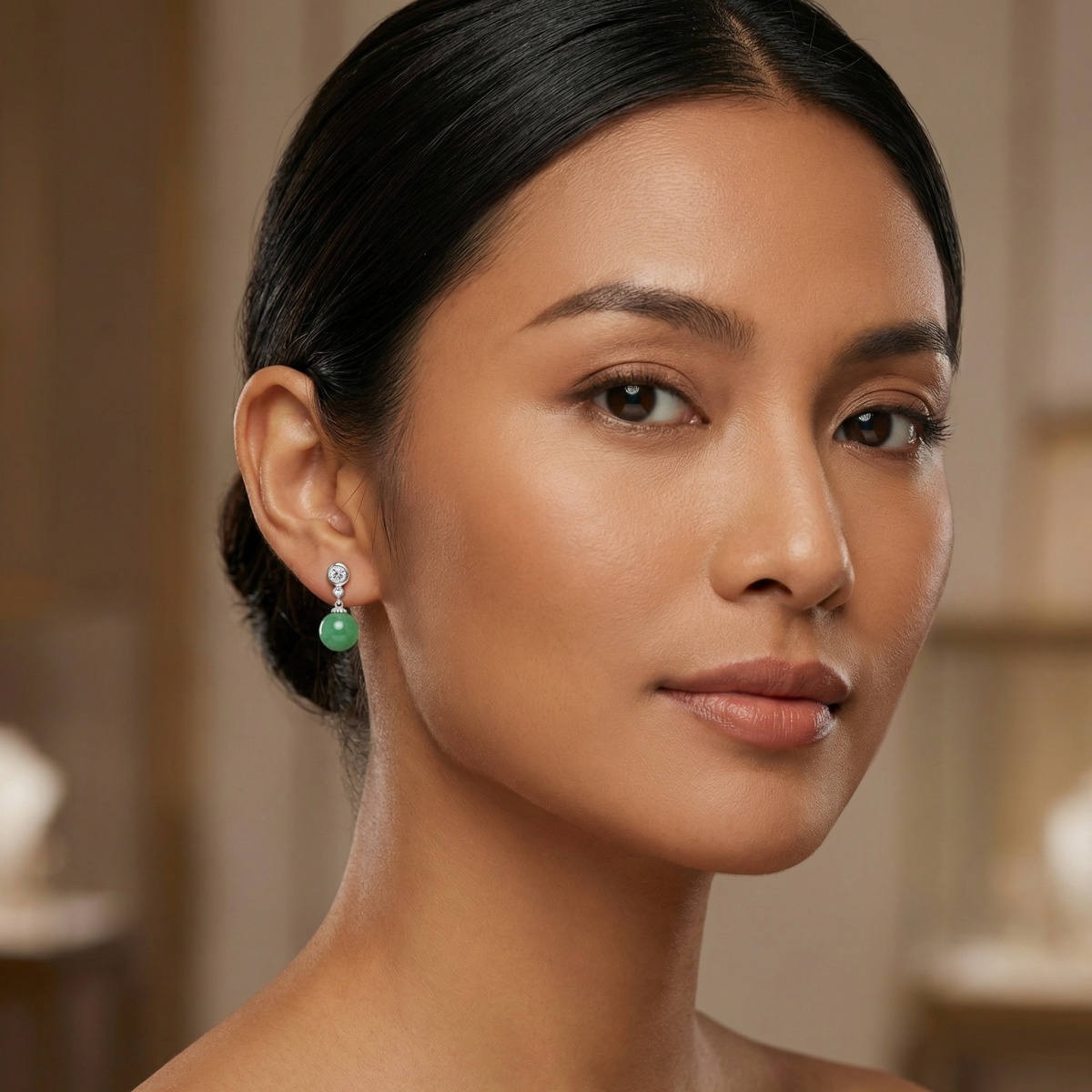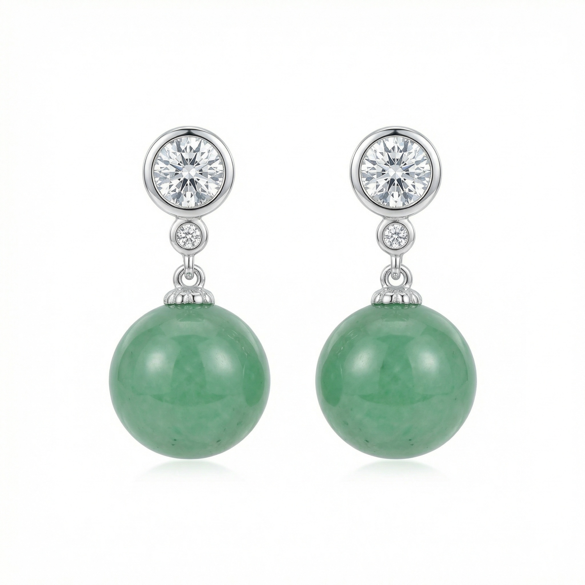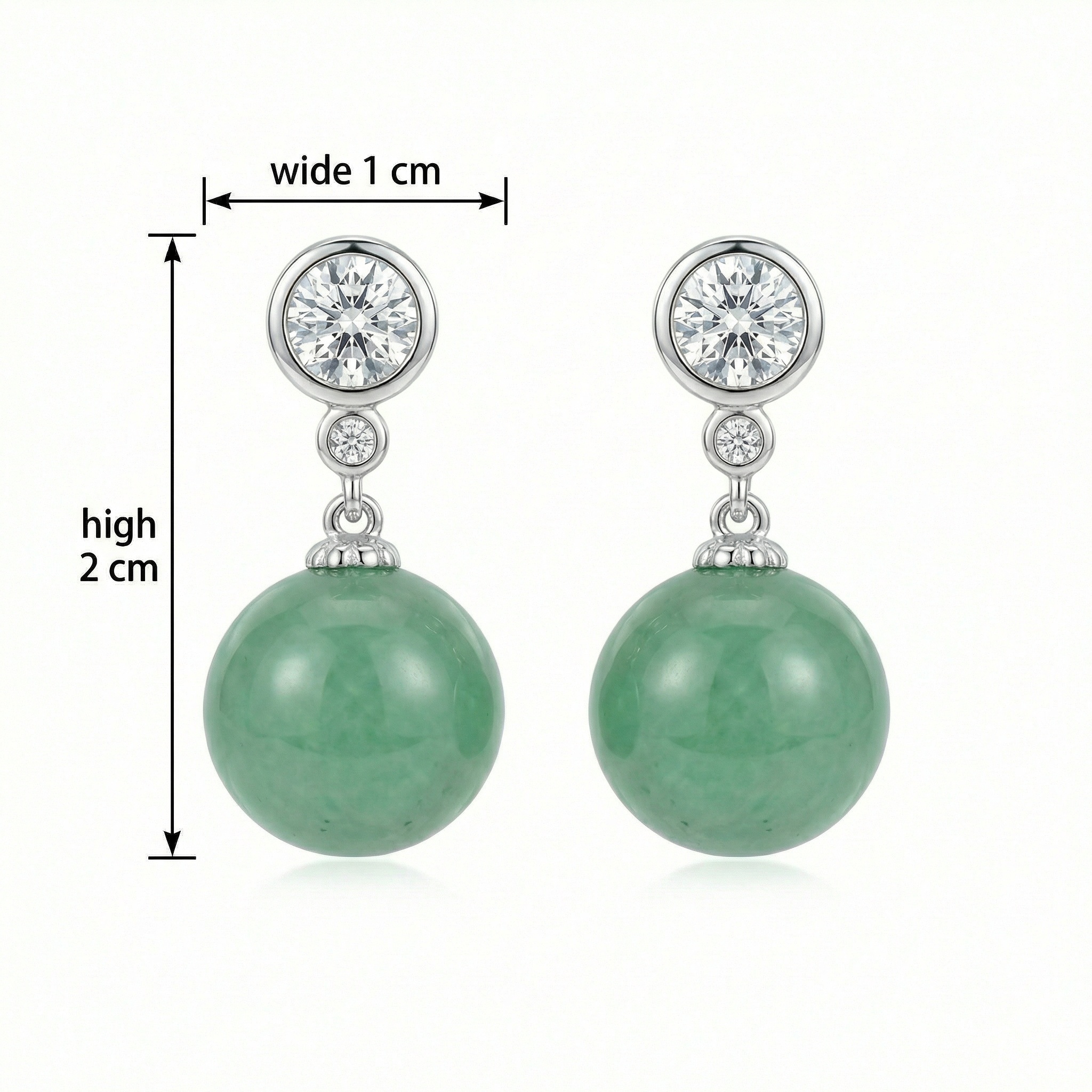 These exquisite drop earrings showcase a harmonious blend of classic elegance and natural beauty. Each earring features a brilliant, round-cut white gemstone securely held in a polished bezel setting at the top, followed by a smaller matching stone that adds a delicate touch of sparkle. Suspended gracefully from the base is a vibrant green jade-like sphere, boasting a smooth, lustrous finish that captures the light. The combination of shimmering white stones and the deep, earthy tones of the green spheres creates a sophisticated contrast. Crafted with a sleek silver-toned metal, these earrings offer a timeless silhouette suitable for both formal events and everyday luxury. Their balanced design and captivating color palette make them a perfect accessory for those who appreciate refined jewelry with a touch of organic charm. | Brand: jewelryodm