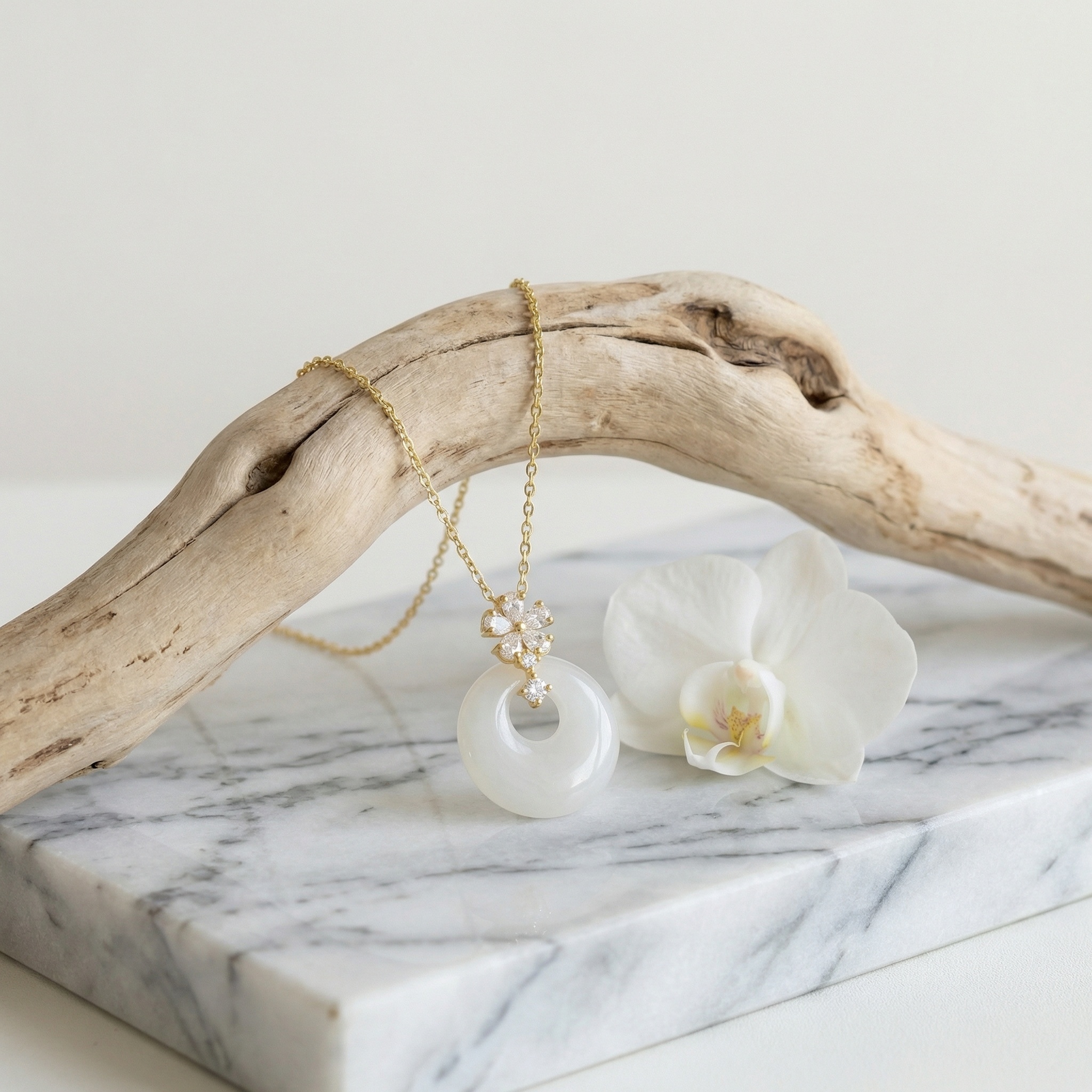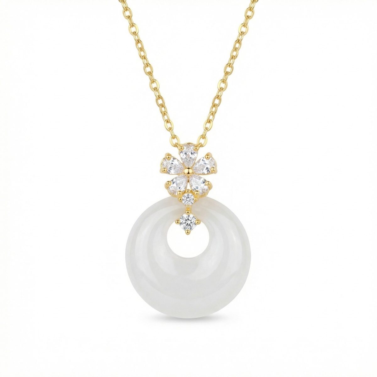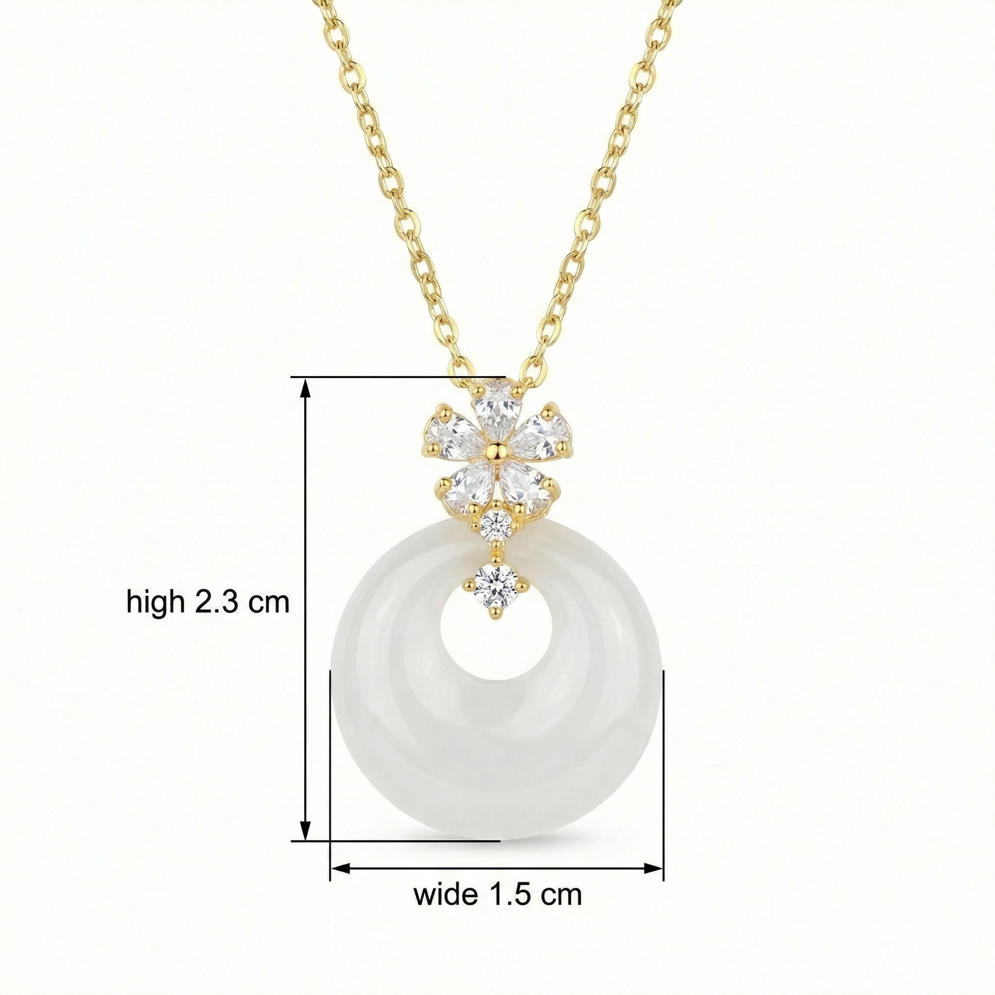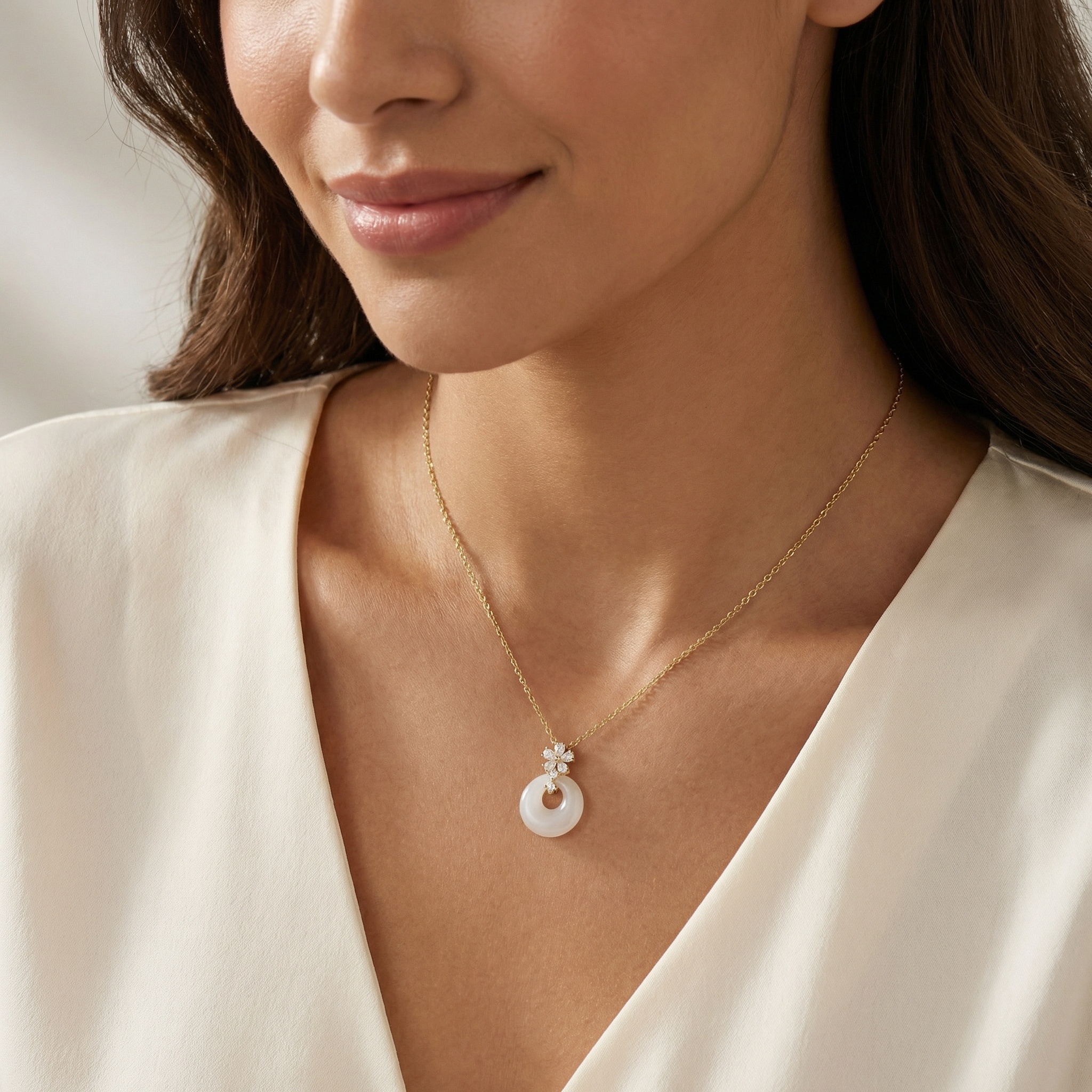 This exquisite necklace features a smooth, milky white circular pendant crafted from fine gemstone. Adorning the top is a meticulously designed floral accent, shimmering with clear, petal-shaped stones that capture and reflect light beautifully. Two additional brilliant-cut gems descend gracefully, connecting the floral centerpiece to the lustrous white ring. The entire pendant is suspended from a delicate, polished chain that complements the warm, metallic tones of the setting. Perfect for both everyday elegance and special occasions, this piece combines traditional symbolism with modern sophistication. The contrasting textures of the polished white stone and the sparkling floral elements create a timeless aesthetic. Ideal for those who appreciate refined jewelry, this necklace adds a touch of grace and luminosity to any ensemble, making it a versatile addition to any collection. | Brand: jewelryodm