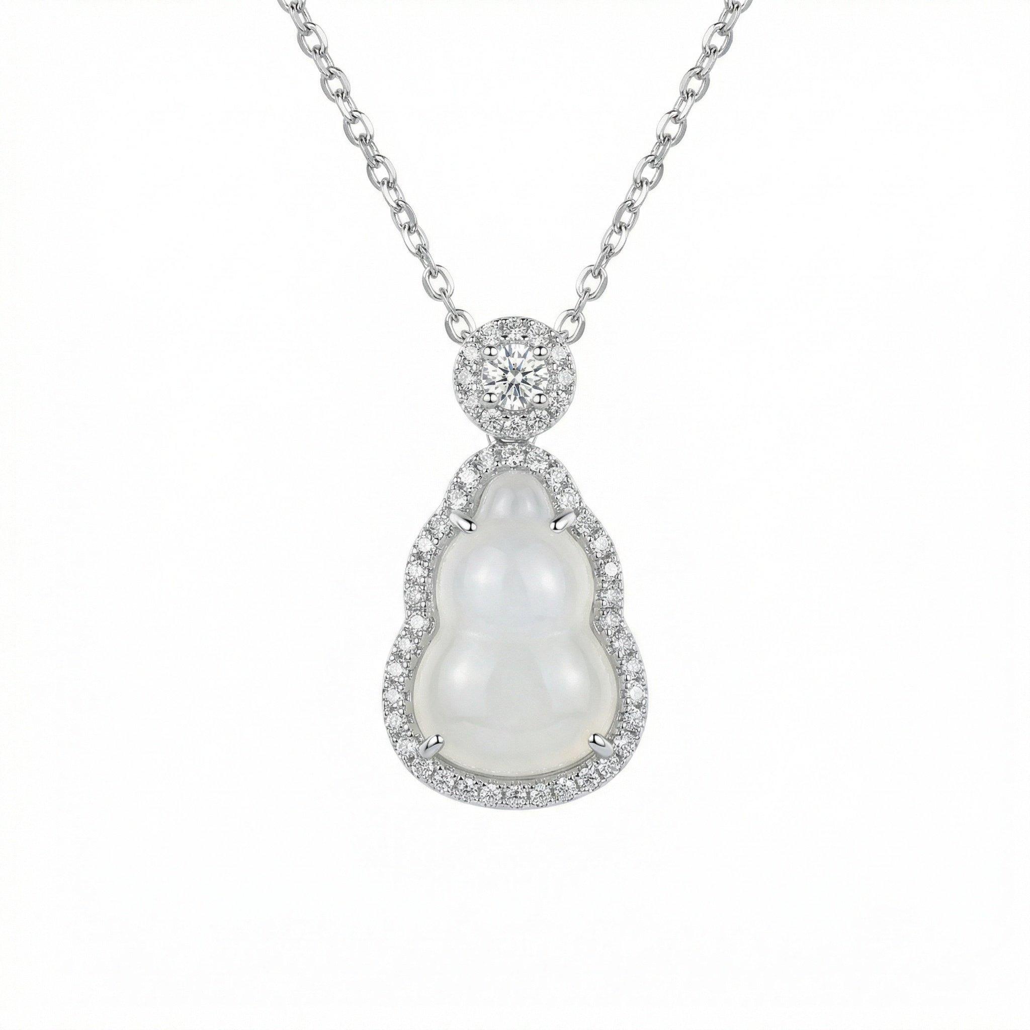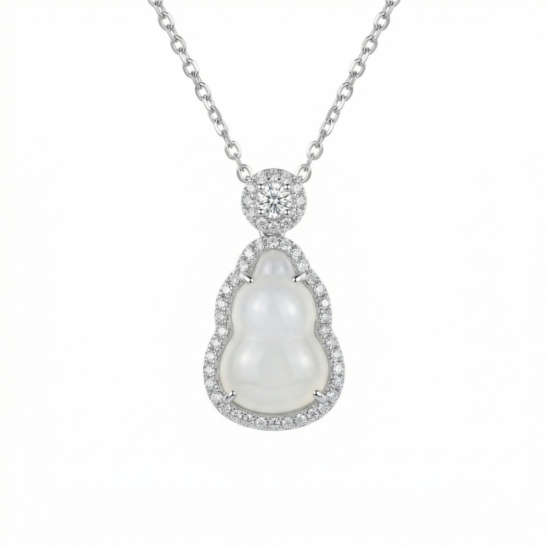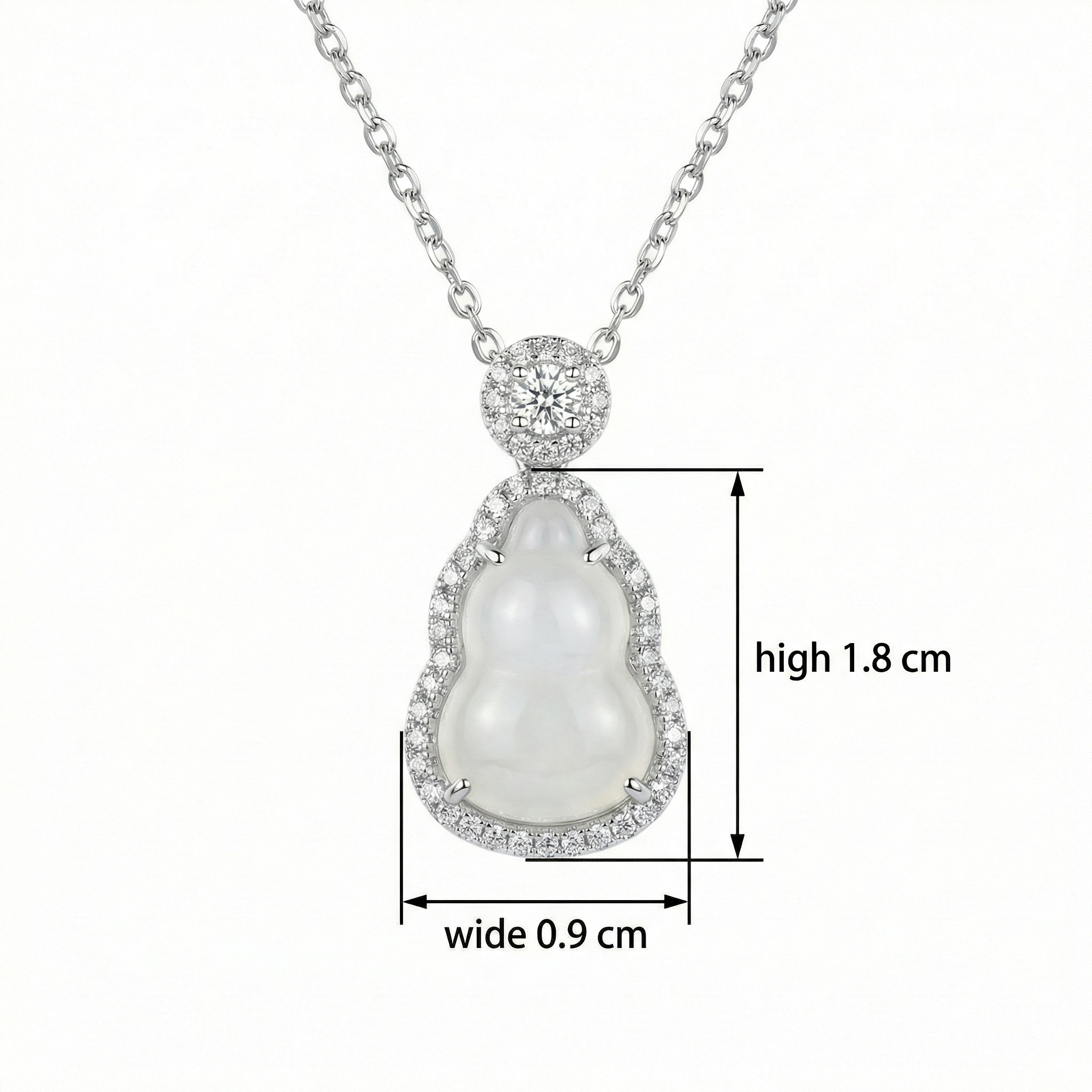 【Delivery Includes】 1 x 925 Silver Gourd Necklace with Diamond and Jade 1 x Exquisite Gift Box 1 x Cleaning Cloth 【Care Instructions】 1. Avoid contact with harsh chemicals such as perfumes, lotion, or hair products. 2. Store your necklace in the provided box when not in use to prevent scratches. 3. Clean gently with the provided cloth to maintain brilliance and shine. 4. Remove before bathing, swimming, or sleeping to prolong the necklace's life. 5. Handle with care—avoid dropping or striking against hard surfaces. | Brand: jewelryodm