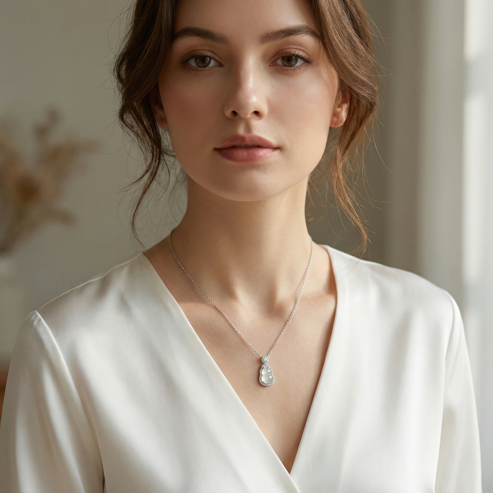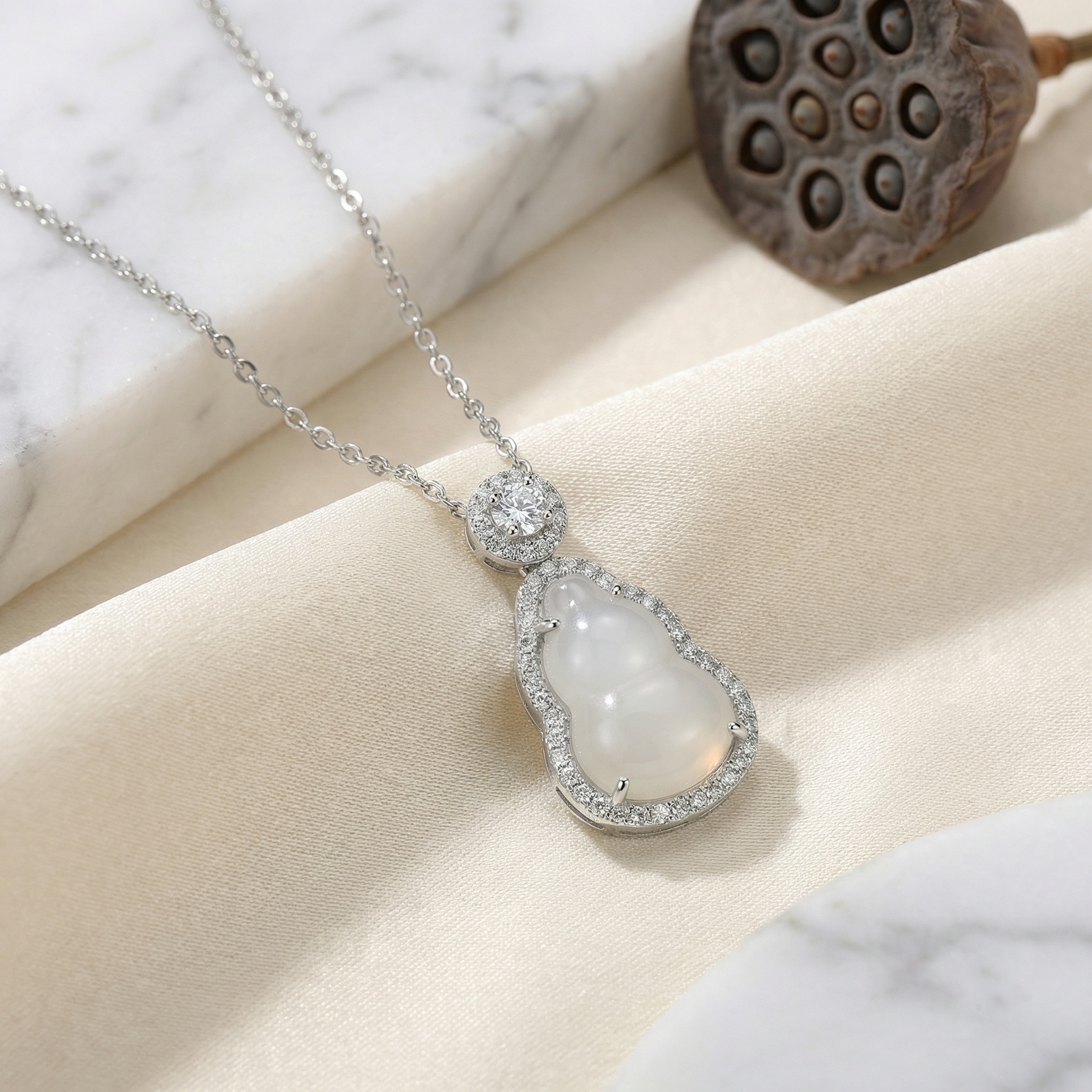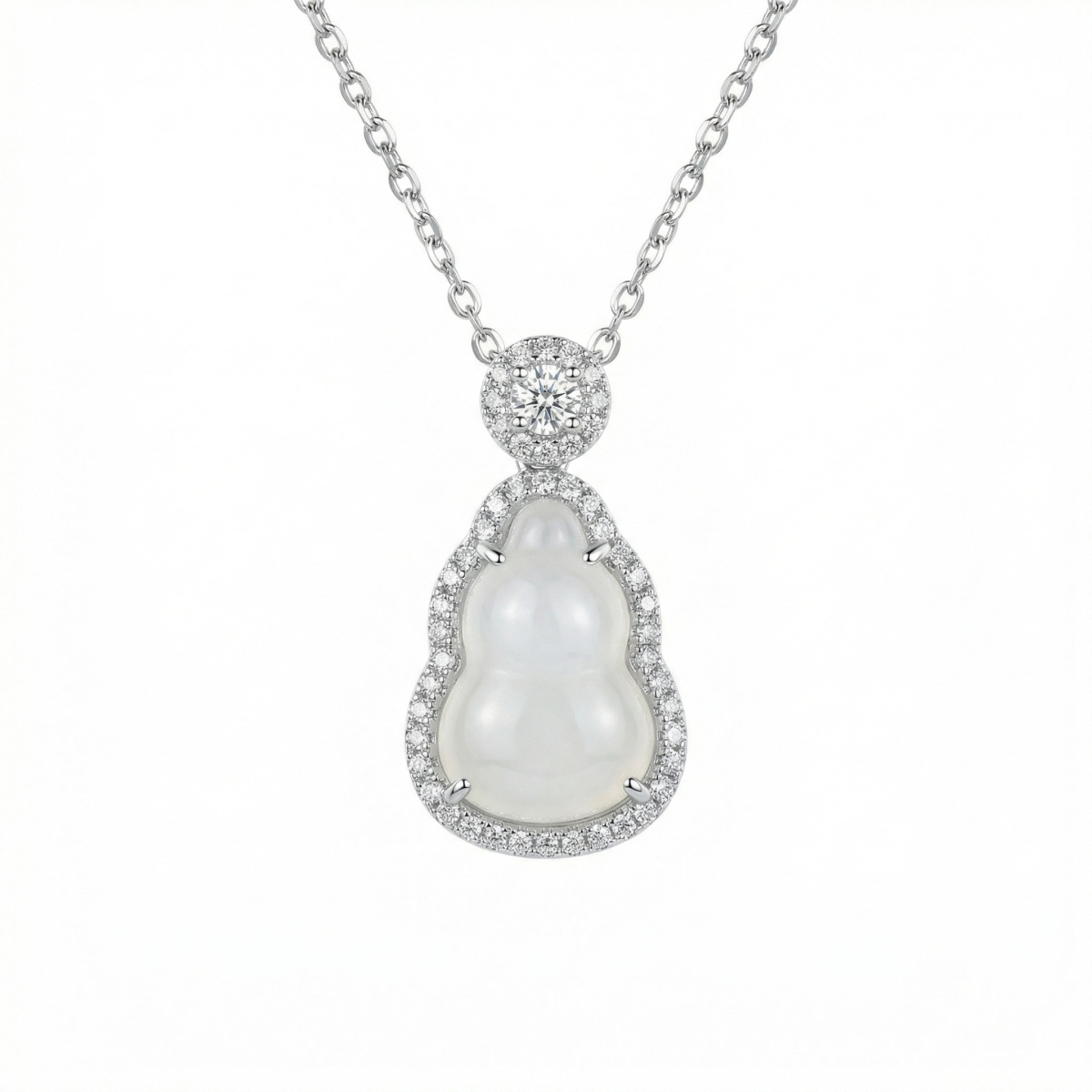 【Delivery Includes】 1 x 925 Silver Gourd Necklace with Diamond and Jade 1 x Exquisite Gift Box 1 x Cleaning Cloth 【Care Instructions】 1. Avoid contact with harsh chemicals such as perfumes, lotion, or hair products. 2. Store your necklace in the provided box when not in use to prevent scratches. 3. Clean gently with the provided cloth to maintain brilliance and shine. 4. Remove before bathing, swimming, or sleeping to prolong the necklace's life. 5. Handle with care—avoid dropping or striking against hard surfaces. | Brand: jewelryodm