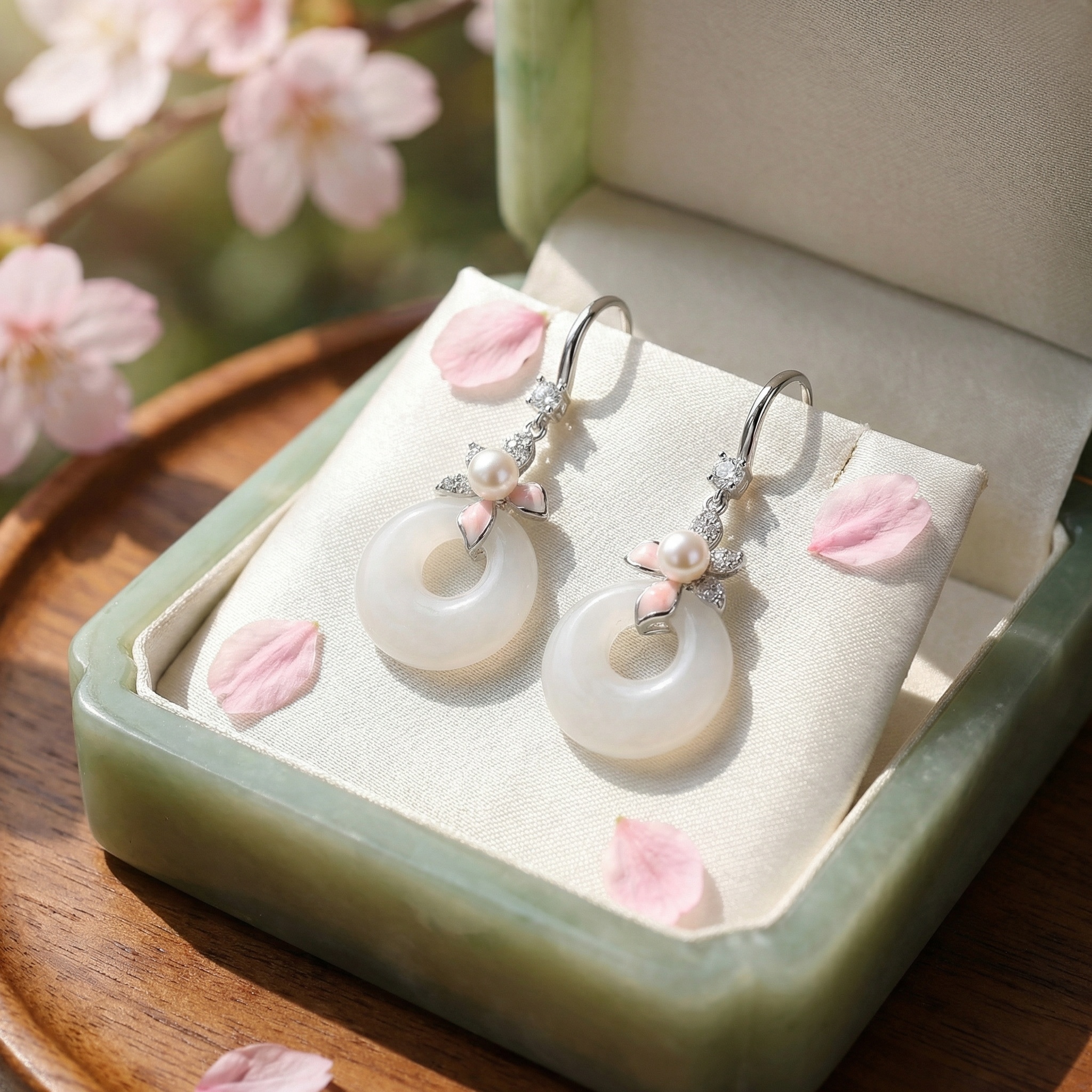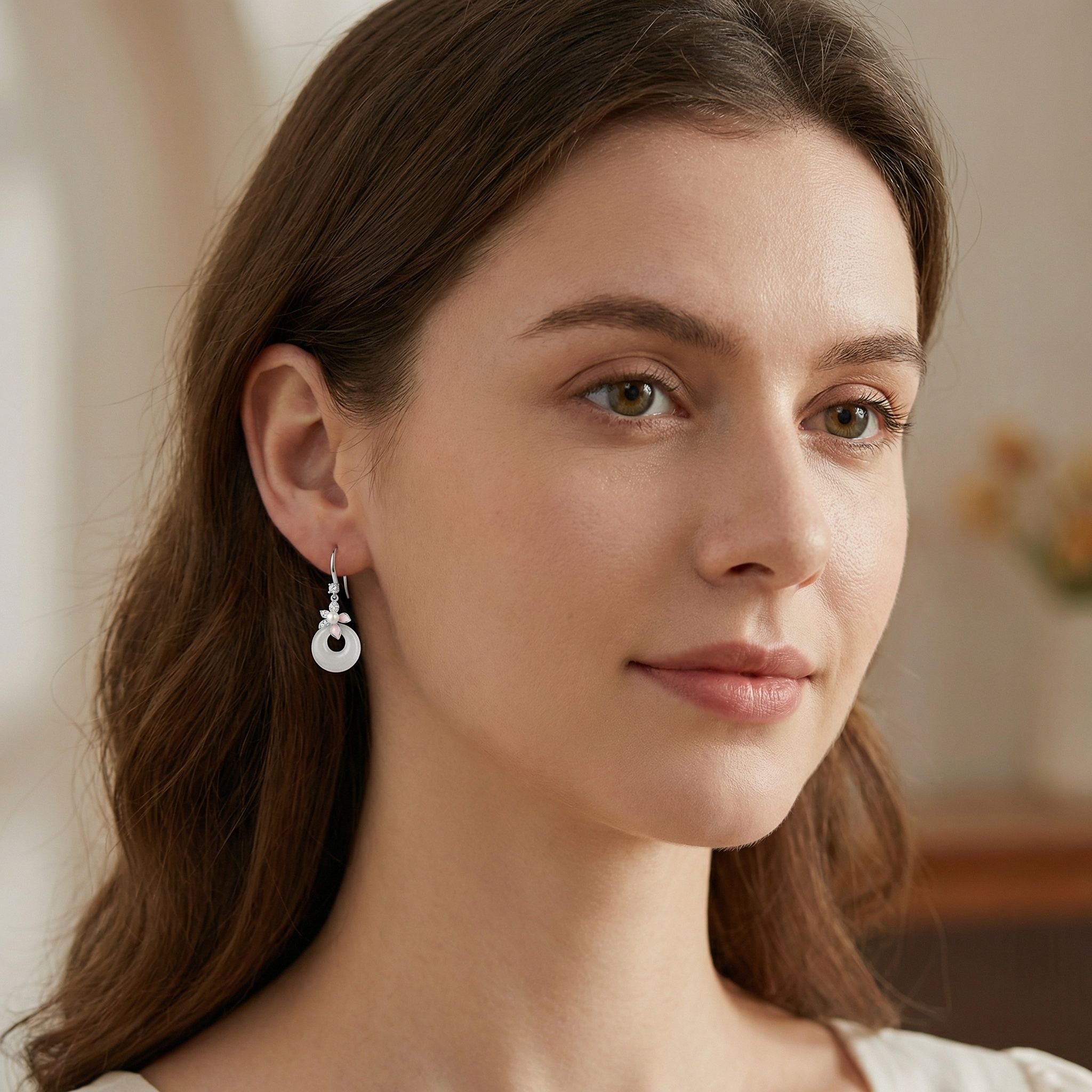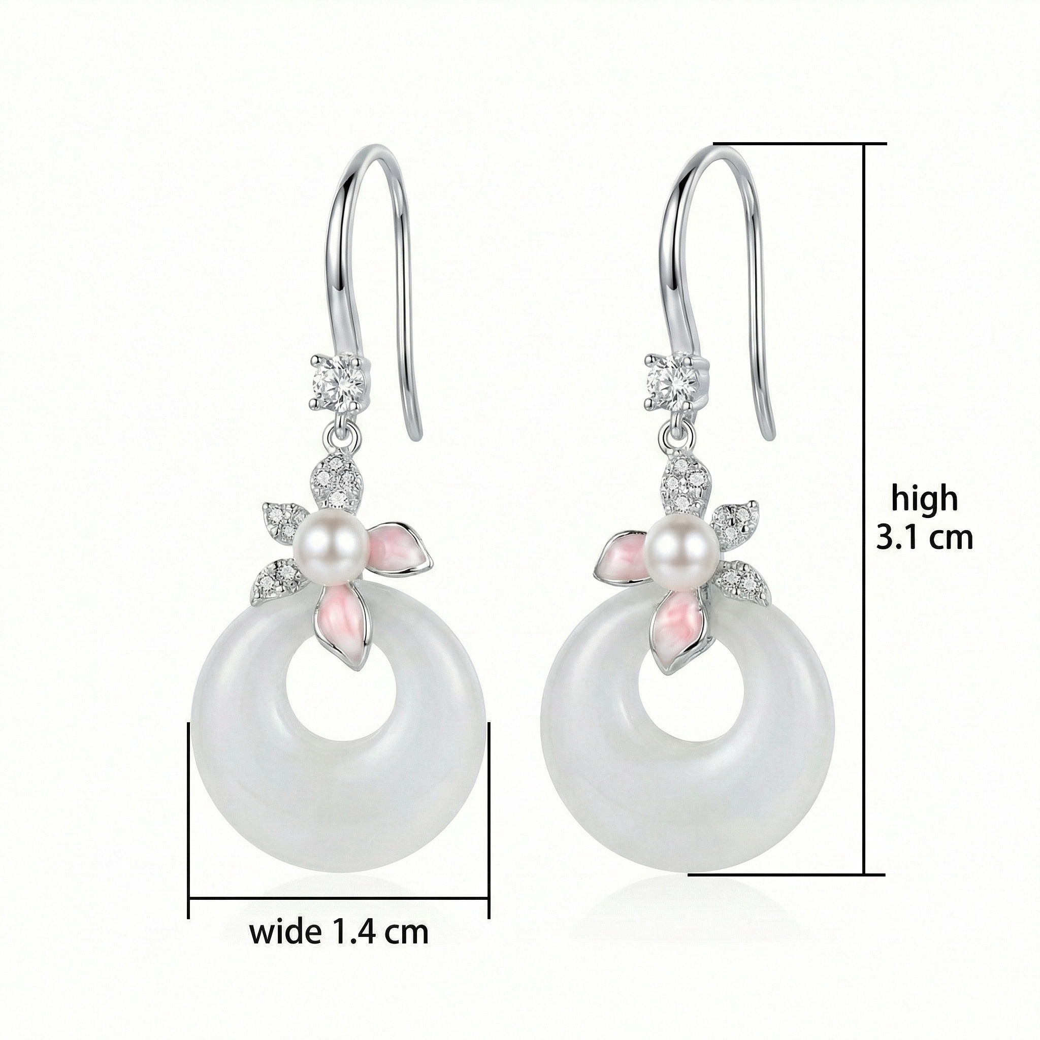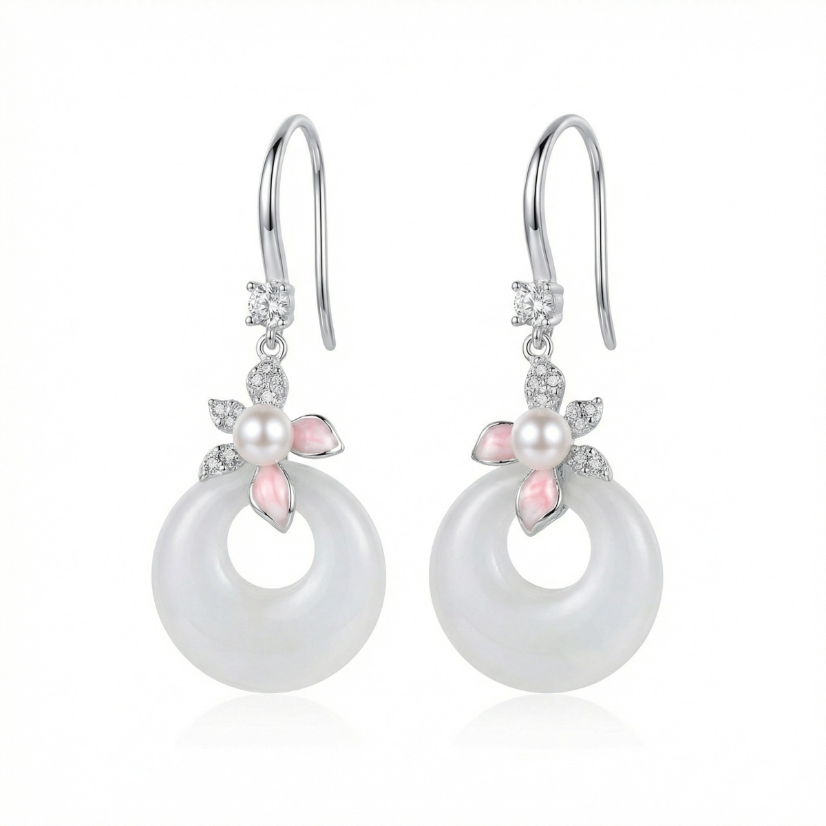 These exquisite drop earrings feature a timeless blend of traditional elegance and modern craftsmanship. Each earring showcases a translucent white jade donut disk, suspended from a delicate floral arrangement. At the heart of the flower sits a lustrous white pearl, framed by soft pink enamel petals and shimmering cubic zirconia accents. The polished silver hooks are topped with a brilliant round-cut stone for added sparkle. These earrings capture a feminine and graceful aesthetic, making them a perfect accessory for both special occasions and refined daily wear. Their ethereal beauty and serene white and pink palette evoke a sense of peace and sophistication. | Brand: jewelryodm