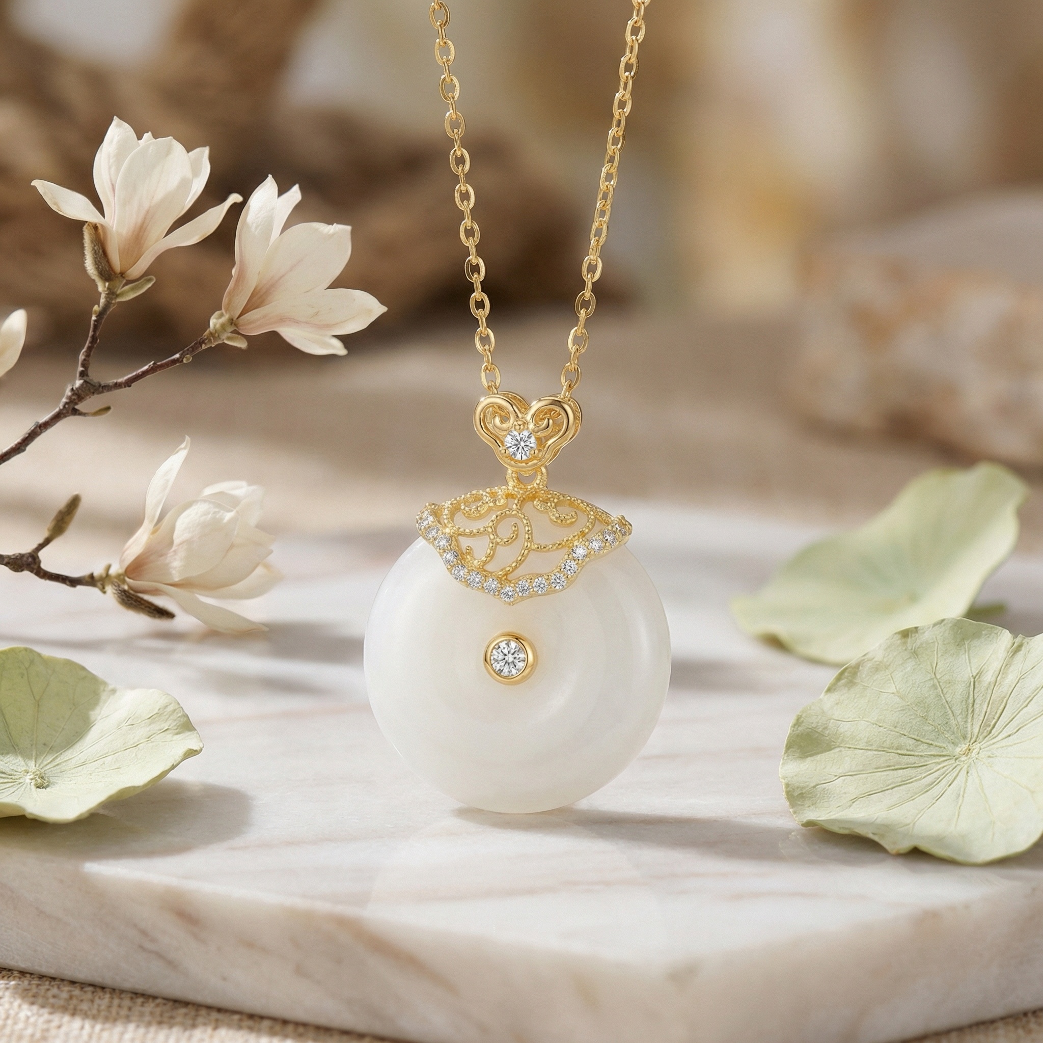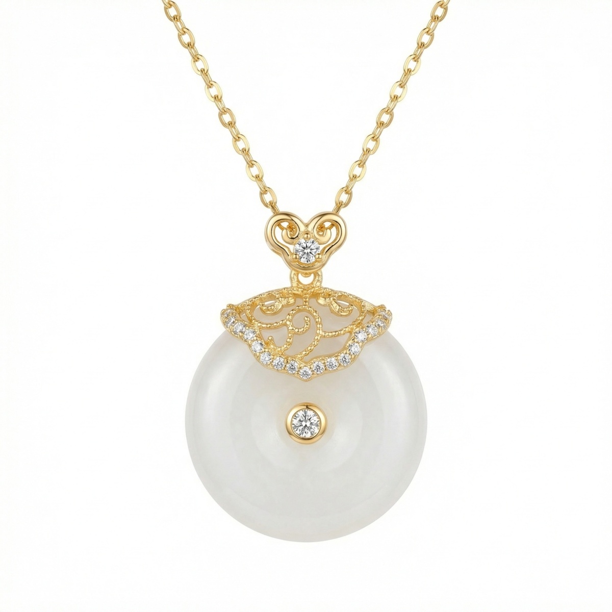 This exquisite necklace features a luminous circular white jade pendant, symbolizing peace and harmony. The top of the pendant is adorned with an intricate gold filigree cap, meticulously detailed with swirling patterns and pavé-set shimmering stones. A single sparkling diamond is elegantly bezel-set in the center of the jade, adding a touch of brilliance to its soft, milky glow. The pendant hangs from a dainty gold link chain, creating a perfect balance between traditional oriental elegance and modern luxury. Its timeless design and fine craftsmanship make it a sophisticated accessory for any special occasion or a meaningful gift. | Brand: jewelryodm