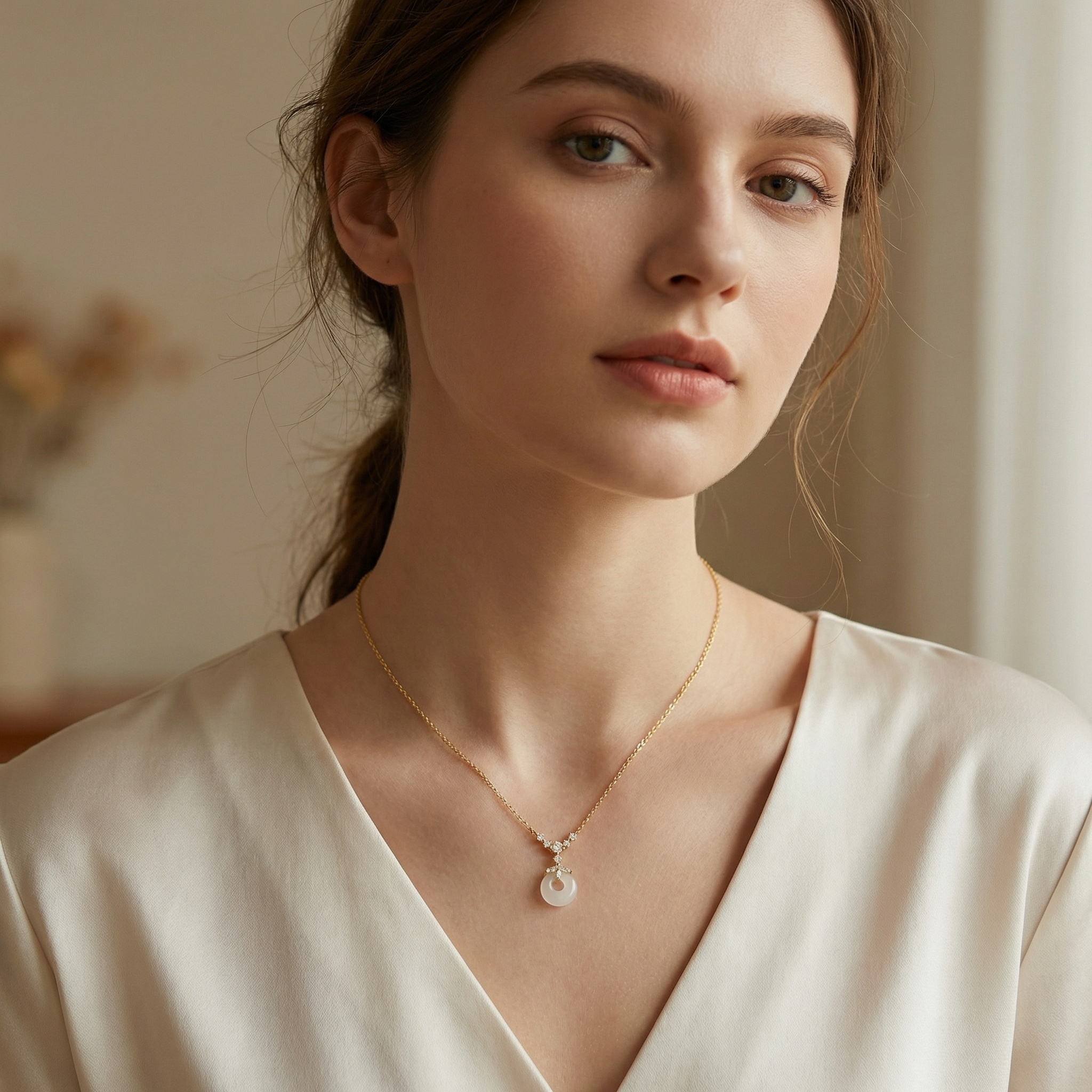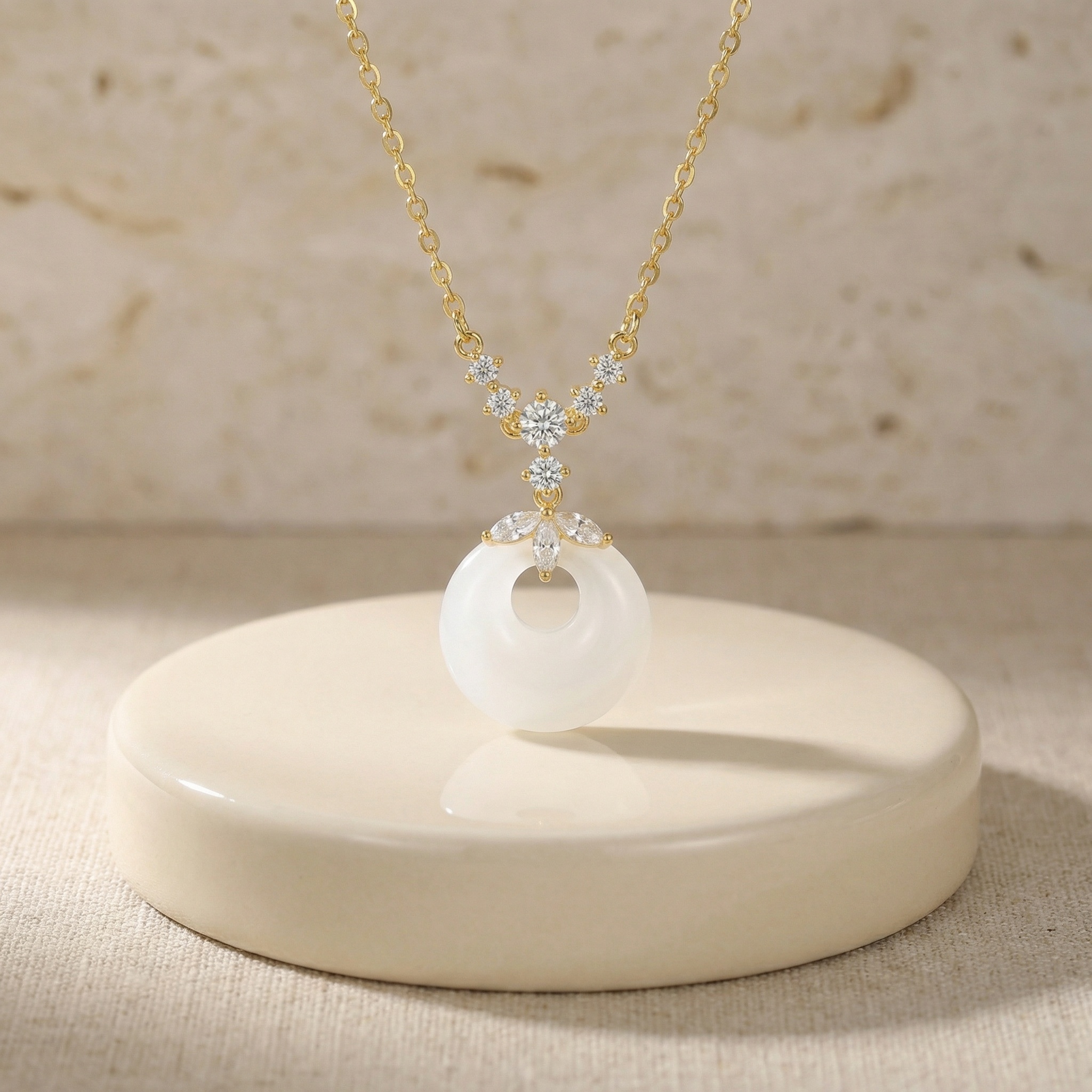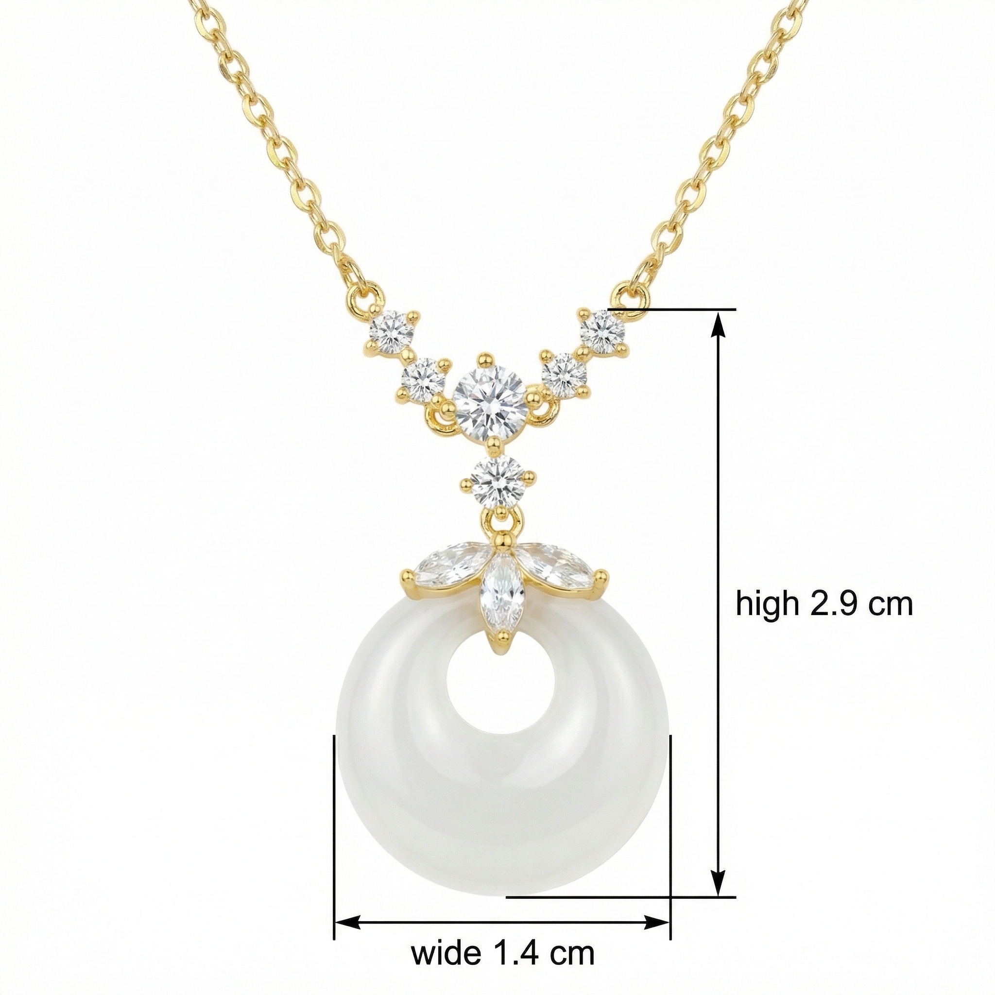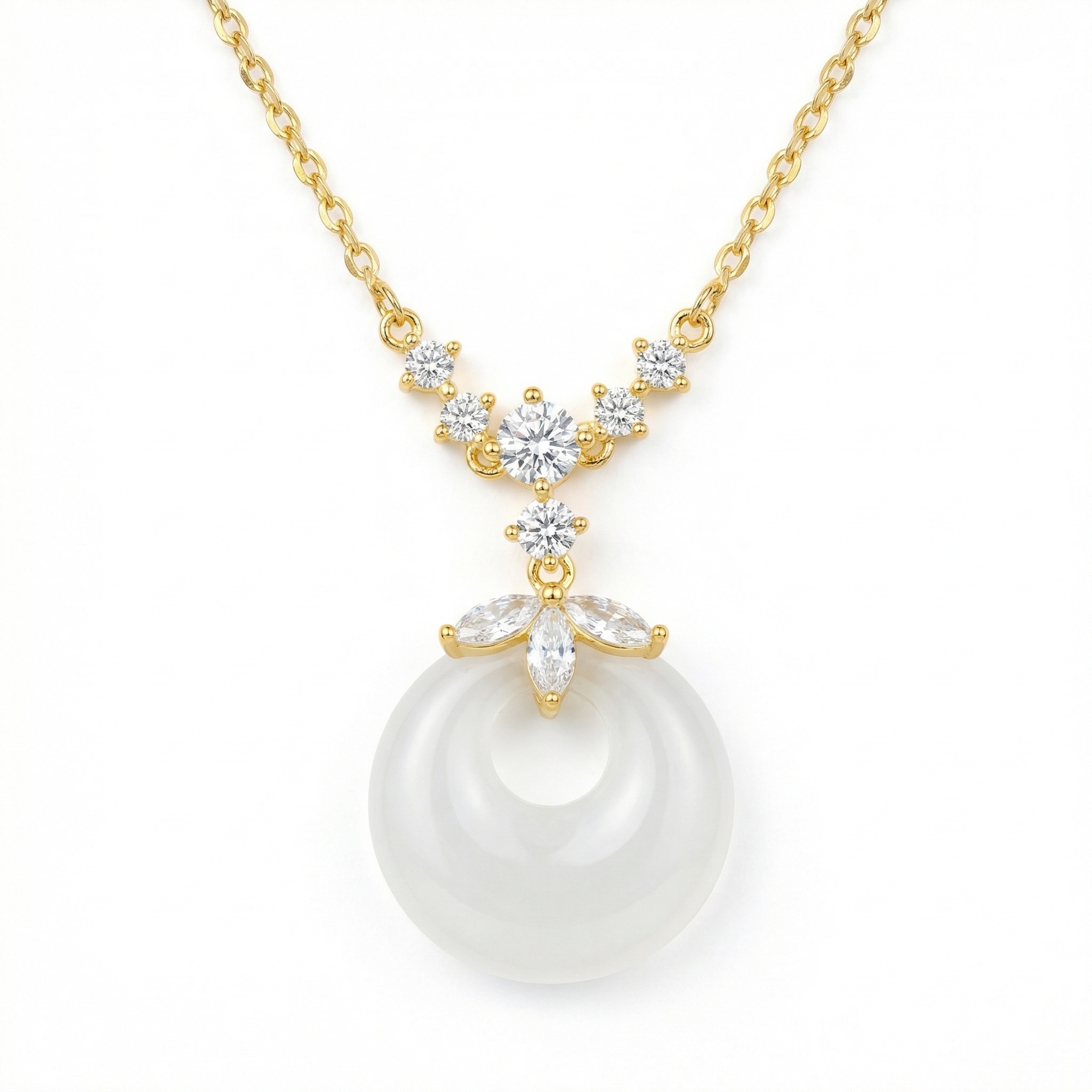This exquisite necklace features a luminous white nephrite jade pendant, masterfully carved into a traditional "Ping An Kou" or safety buckle shape, symbolizing peace and protection. The pendant is suspended from a sophisticated bail embellished with a cluster of shimmering clear gemstones arranged in a delicate floral motif. The warm metallic tones of the setting beautifully complement the milky translucency of the jade, creating a harmonious and timeless piece. Suspended from a dainty chain, this jewelry item blends classic Eastern heritage with modern Western elegance. Perfect for any occasion, it adds a touch of refined grace to your ensemble. The brilliant-cut stones catch the light from every angle, making the necklace a radiant centerpiece for your jewelry collection. | Brand: jewelryodm