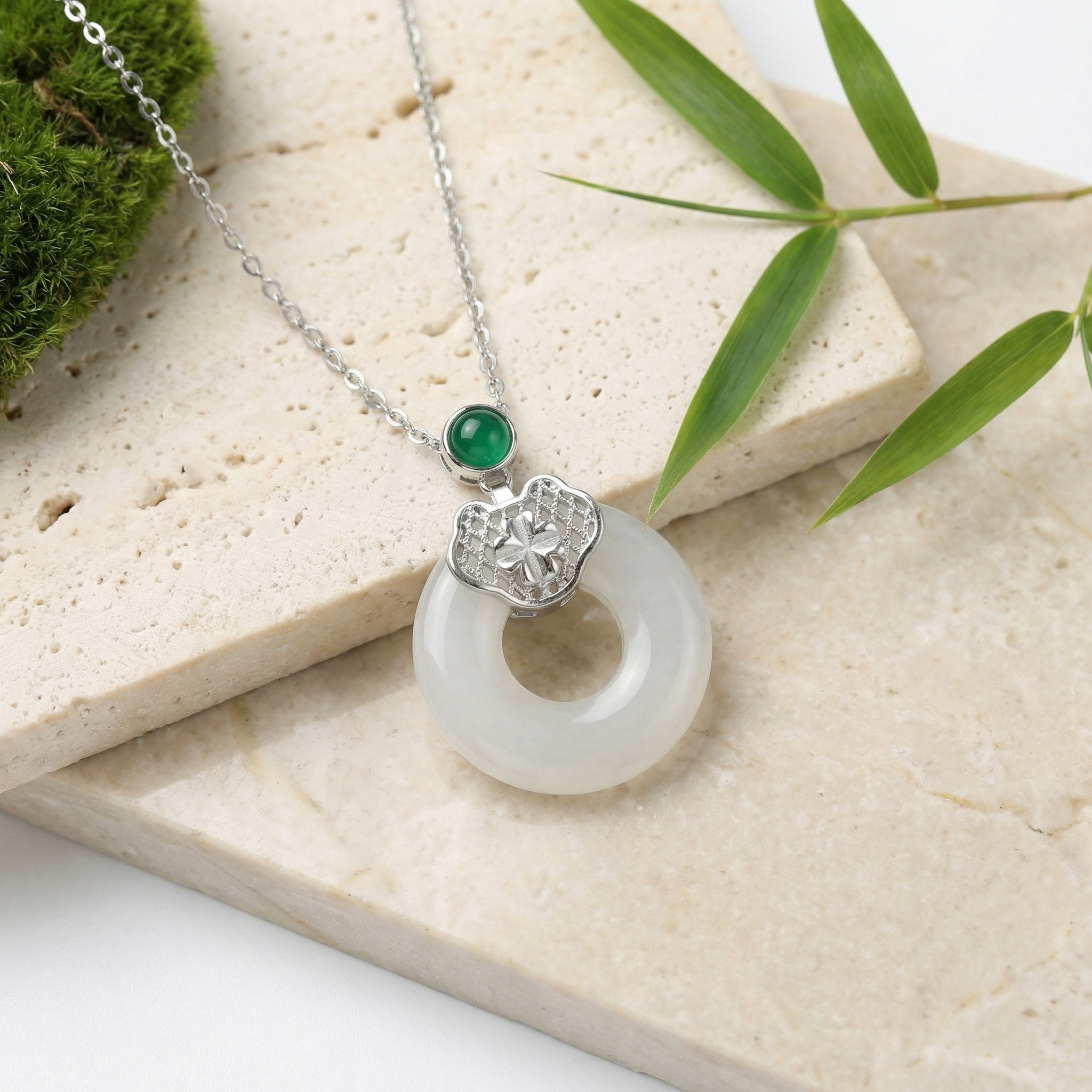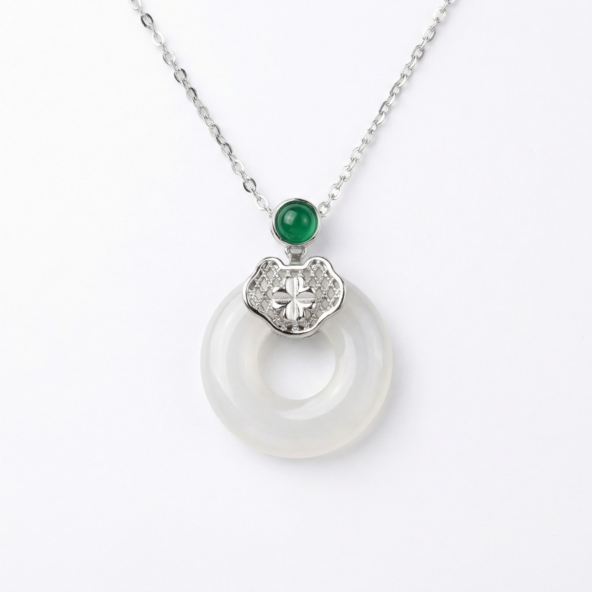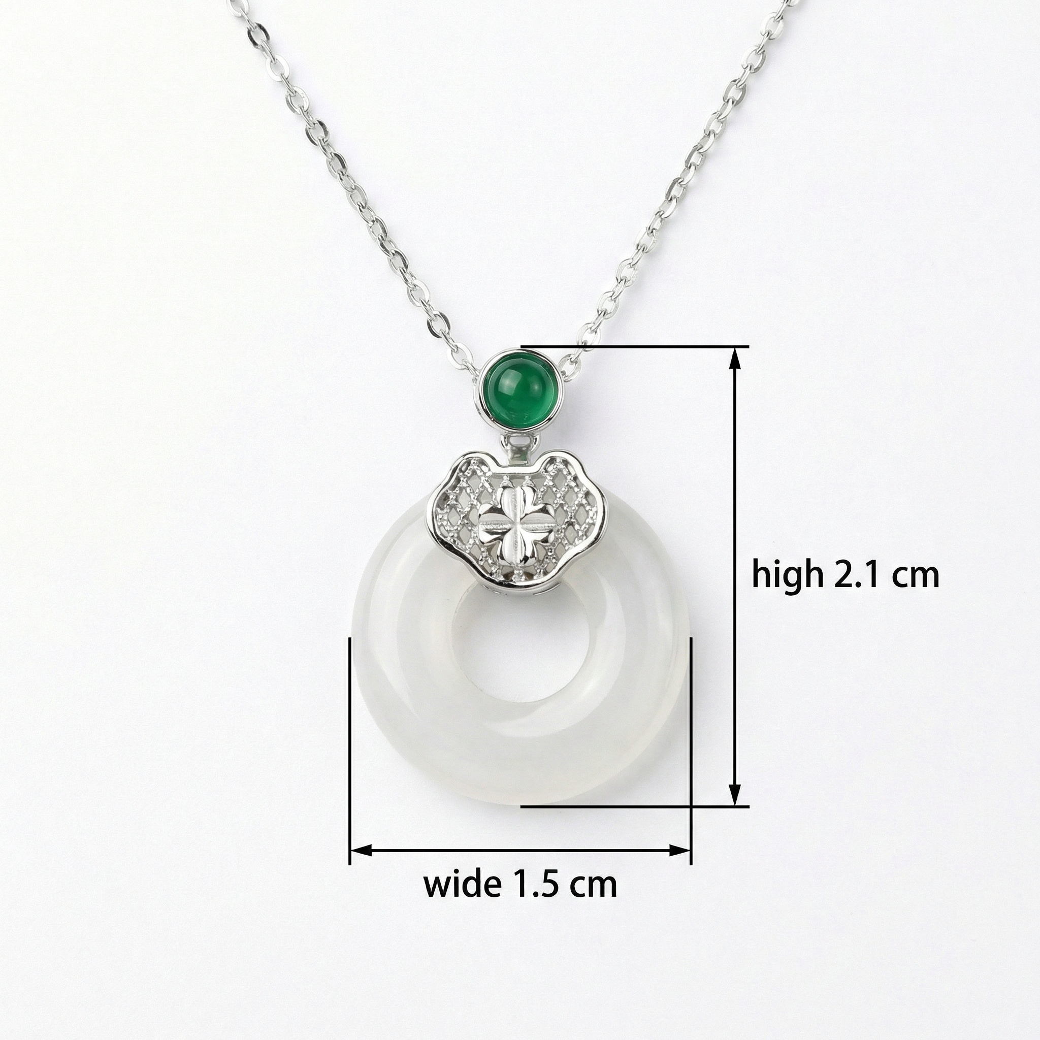 【Delivery Includes】 1 x Jade and Emerald Circle Clover Necklace 1 x Gift Box 1 x Jewelry Cleaning Cloth 【Care Instructions】 1. Store your necklace in the provided gift box or pouch when not in use, away from sunlight and moisture. 2. Clean gently with a soft dry cloth to maintain its shine and avoid exposure to harsh chemicals, perfumes, or water. 3. Take off jewelry during workouts, showers, and before going to bed to prolong its brilliance. | Brand: jewelryodm