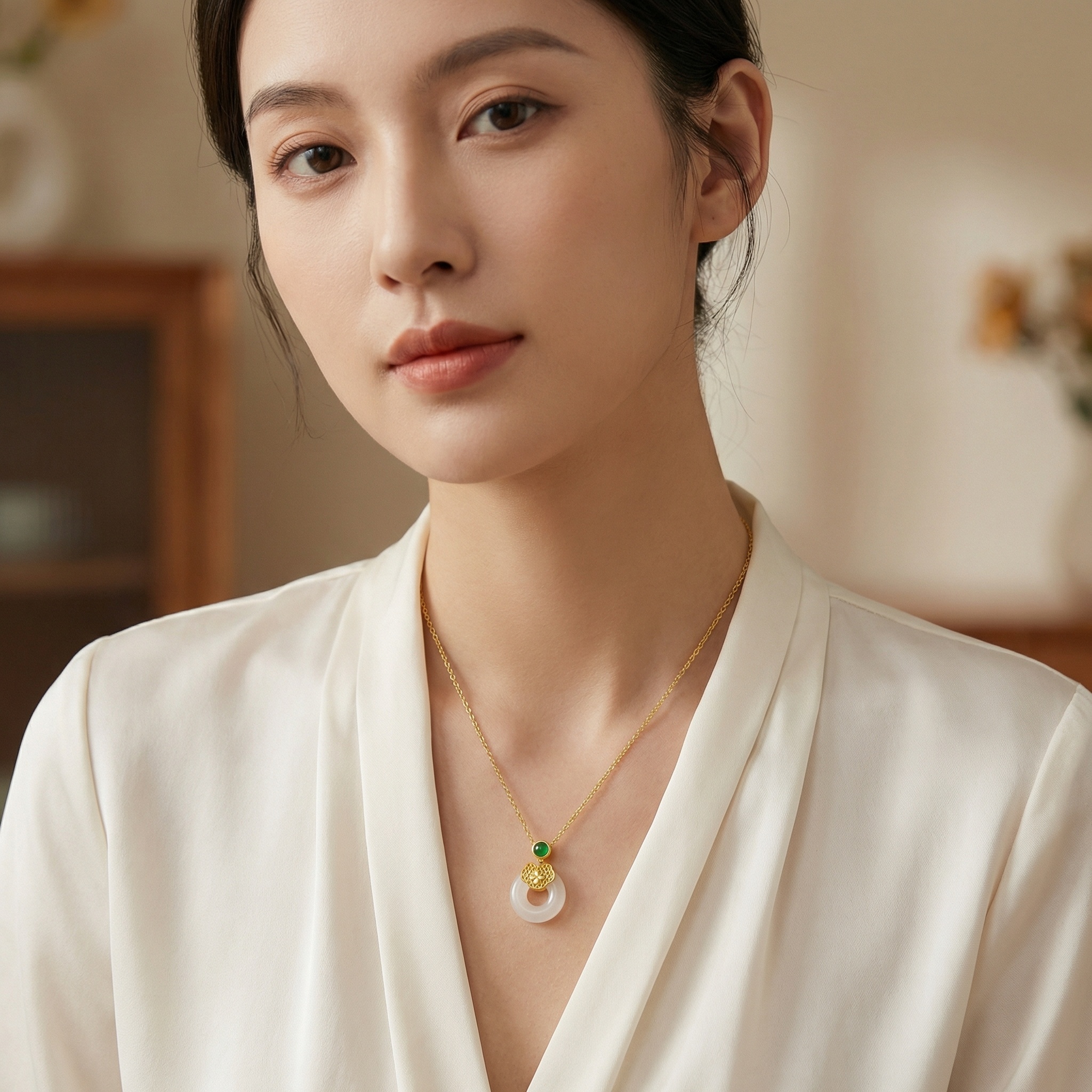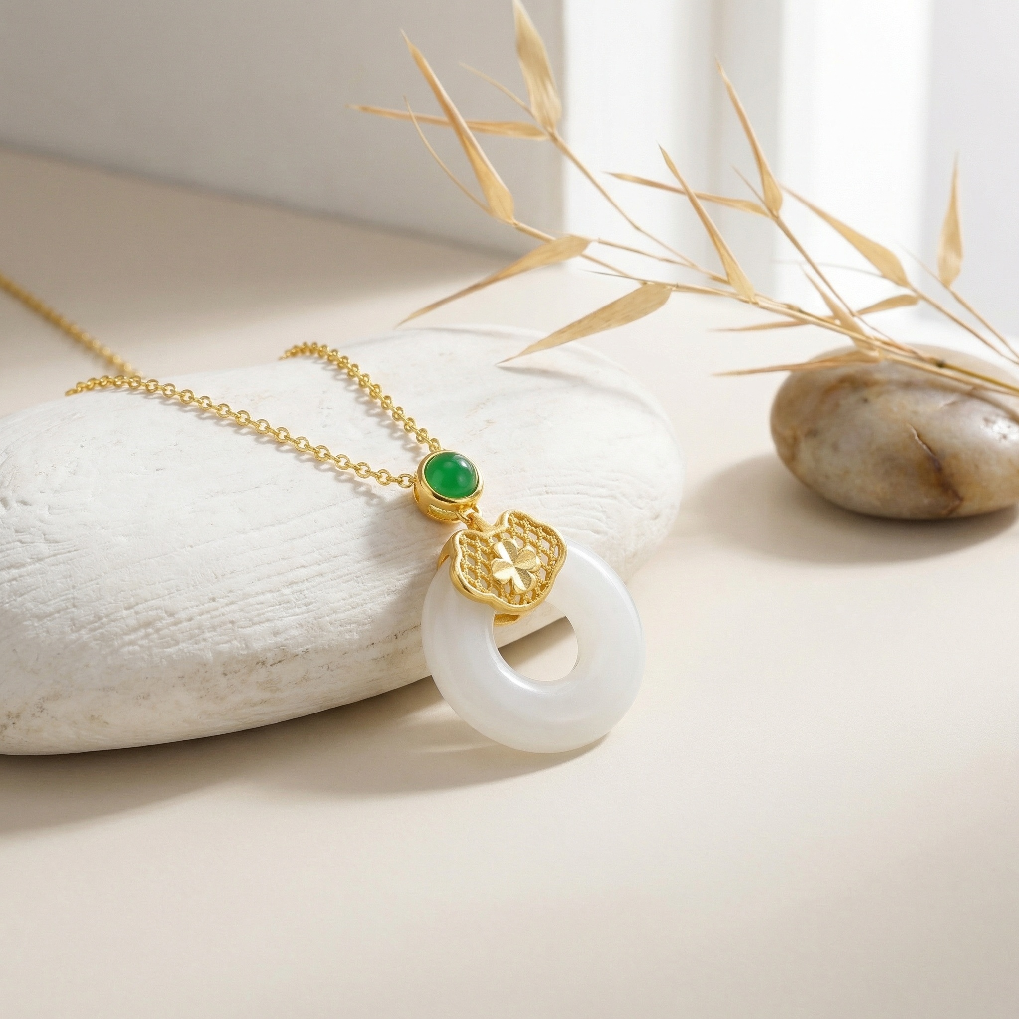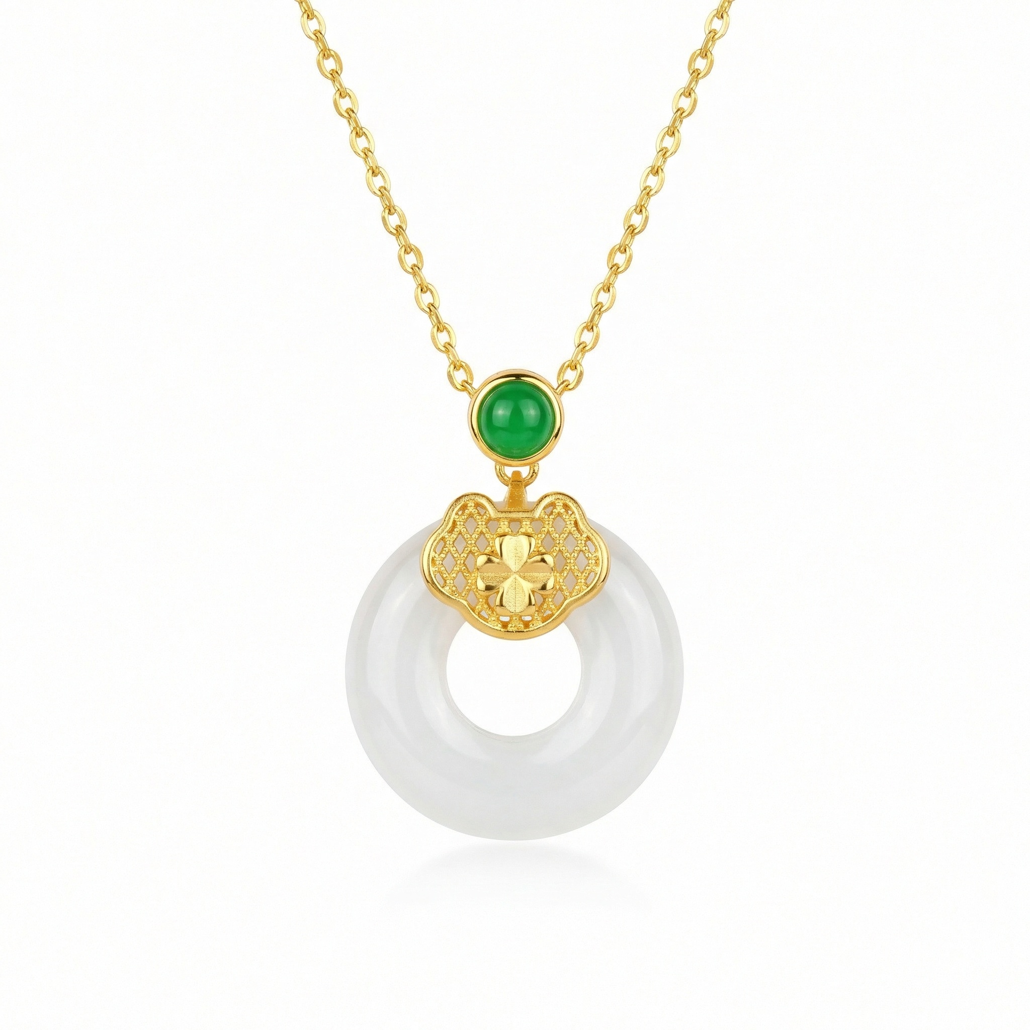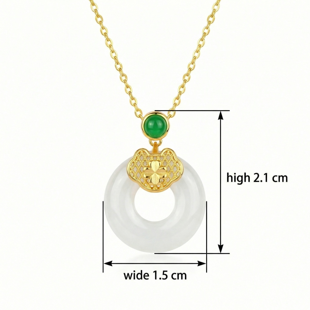925 Sterling Silver Elegant White Jade Donut Pendant Necklace with Green Gemstone and Lucky Clover Accents